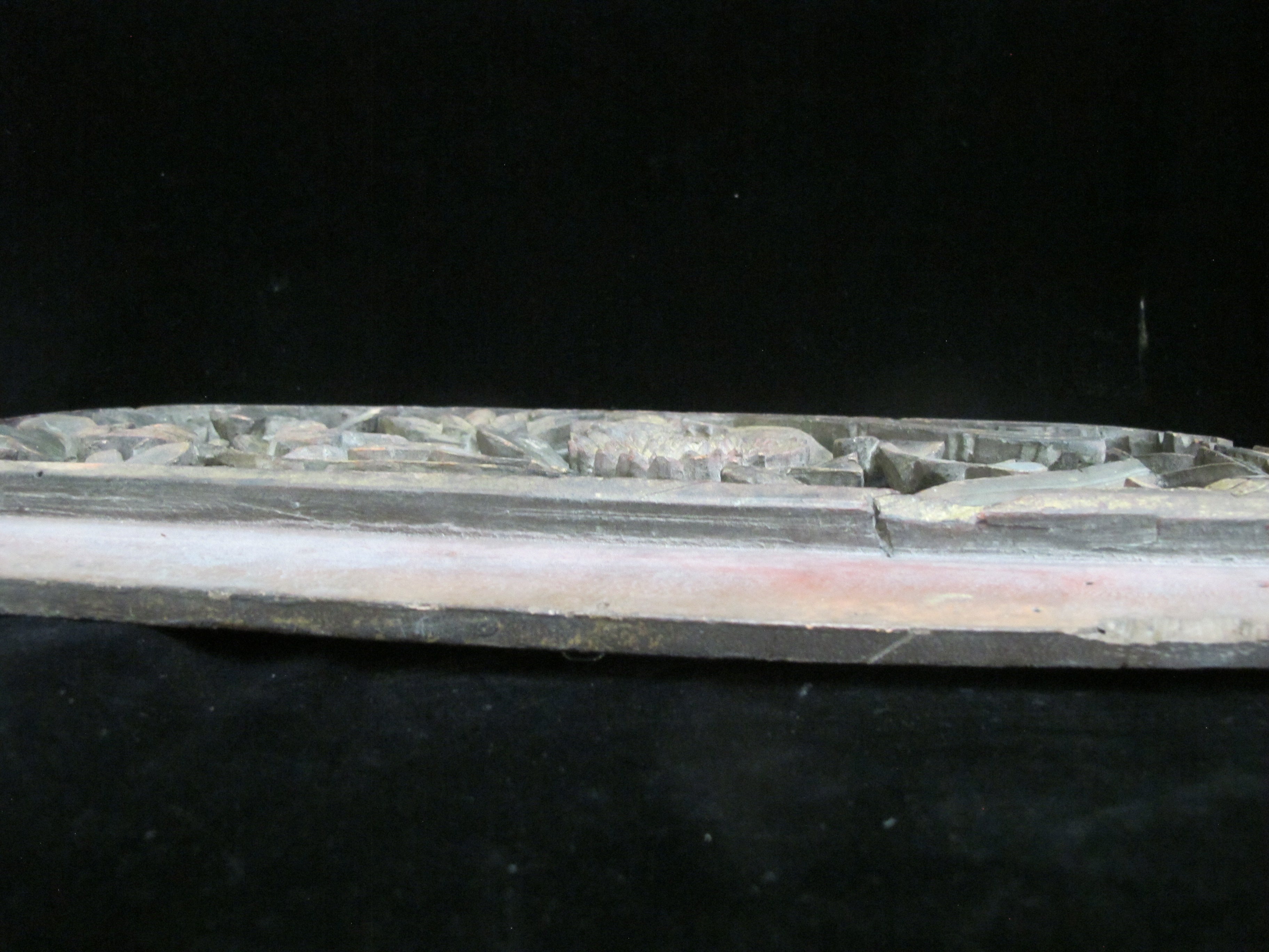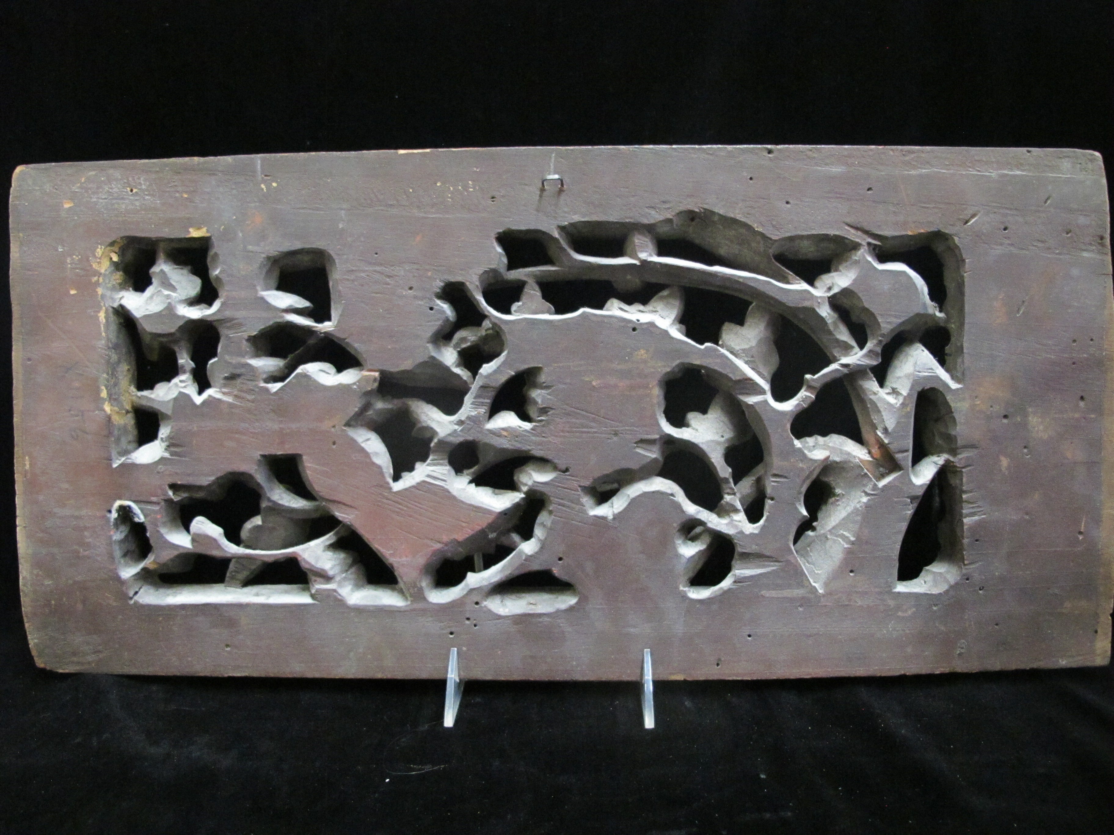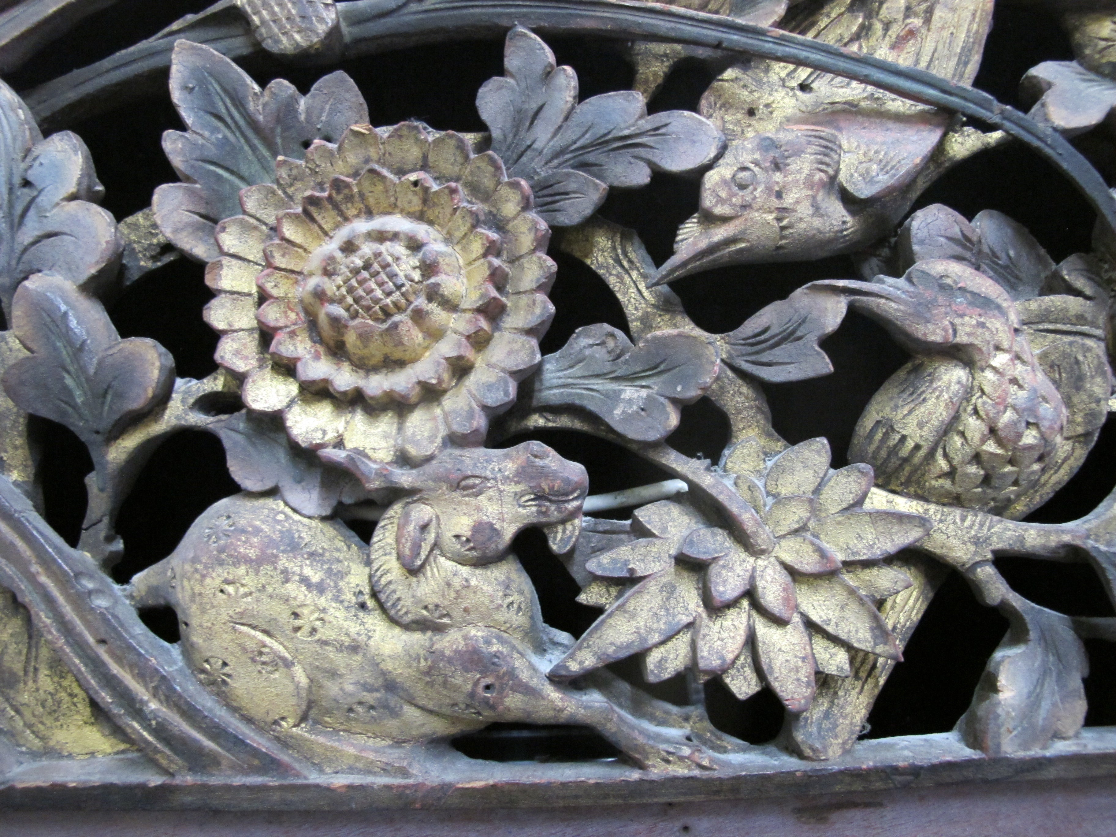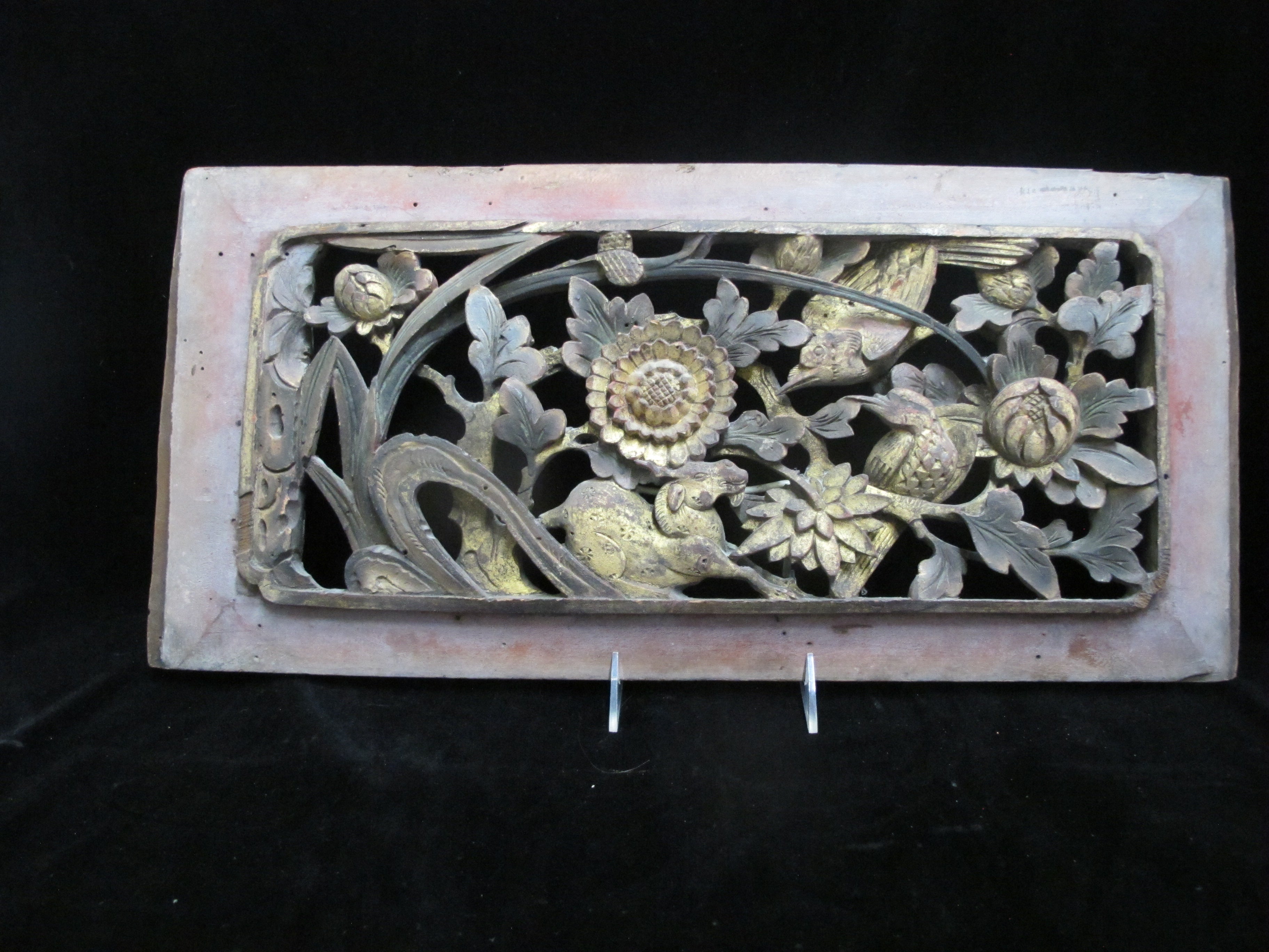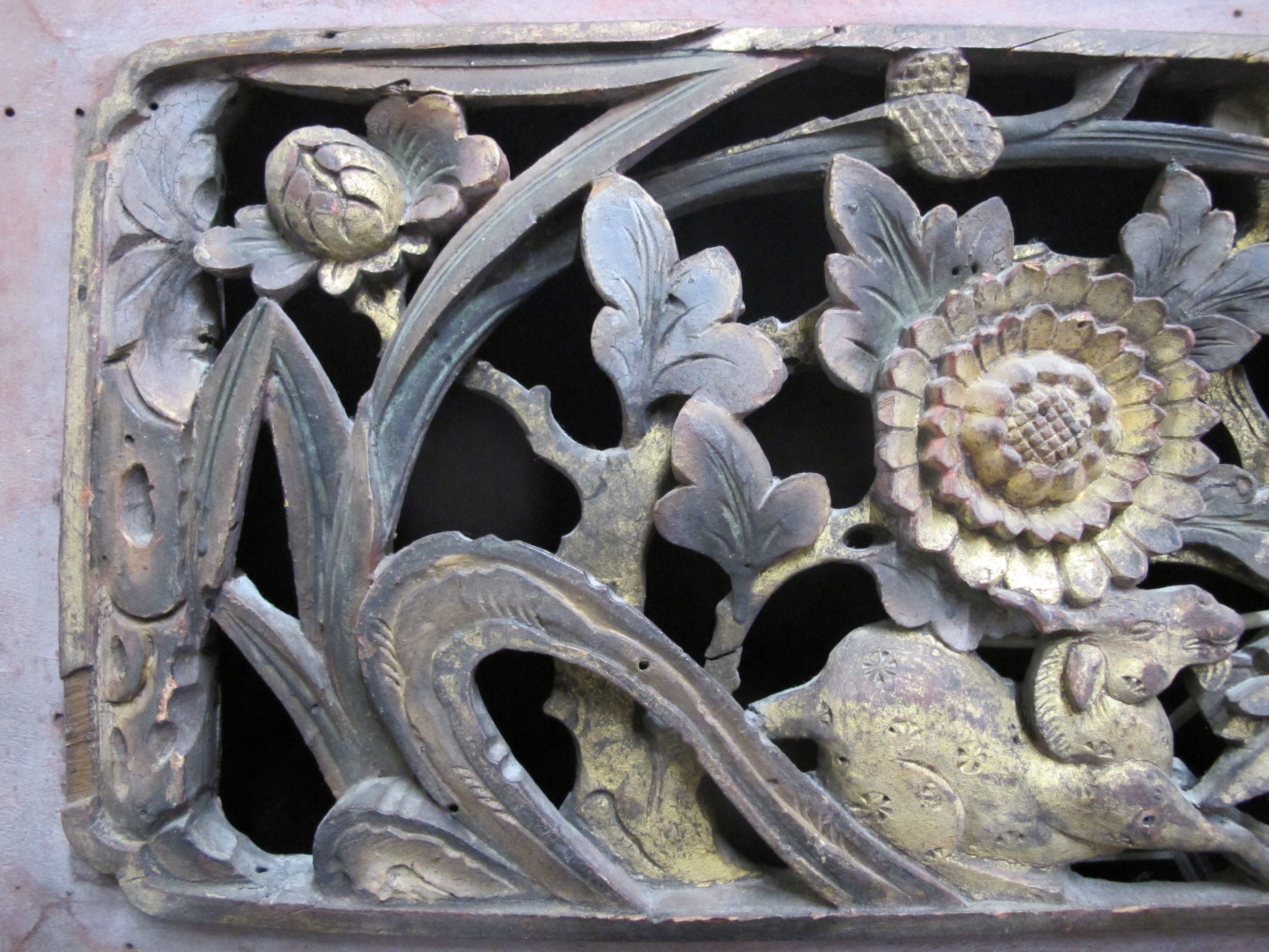 Chinese gilt and red pierced 3d wood carving of 2 birds and a goat amongst flowers. Measures 21 1/2" x 10" x 1". Good condition, it's fairly faded and has wear, but no major cracks or repairs that I can see.