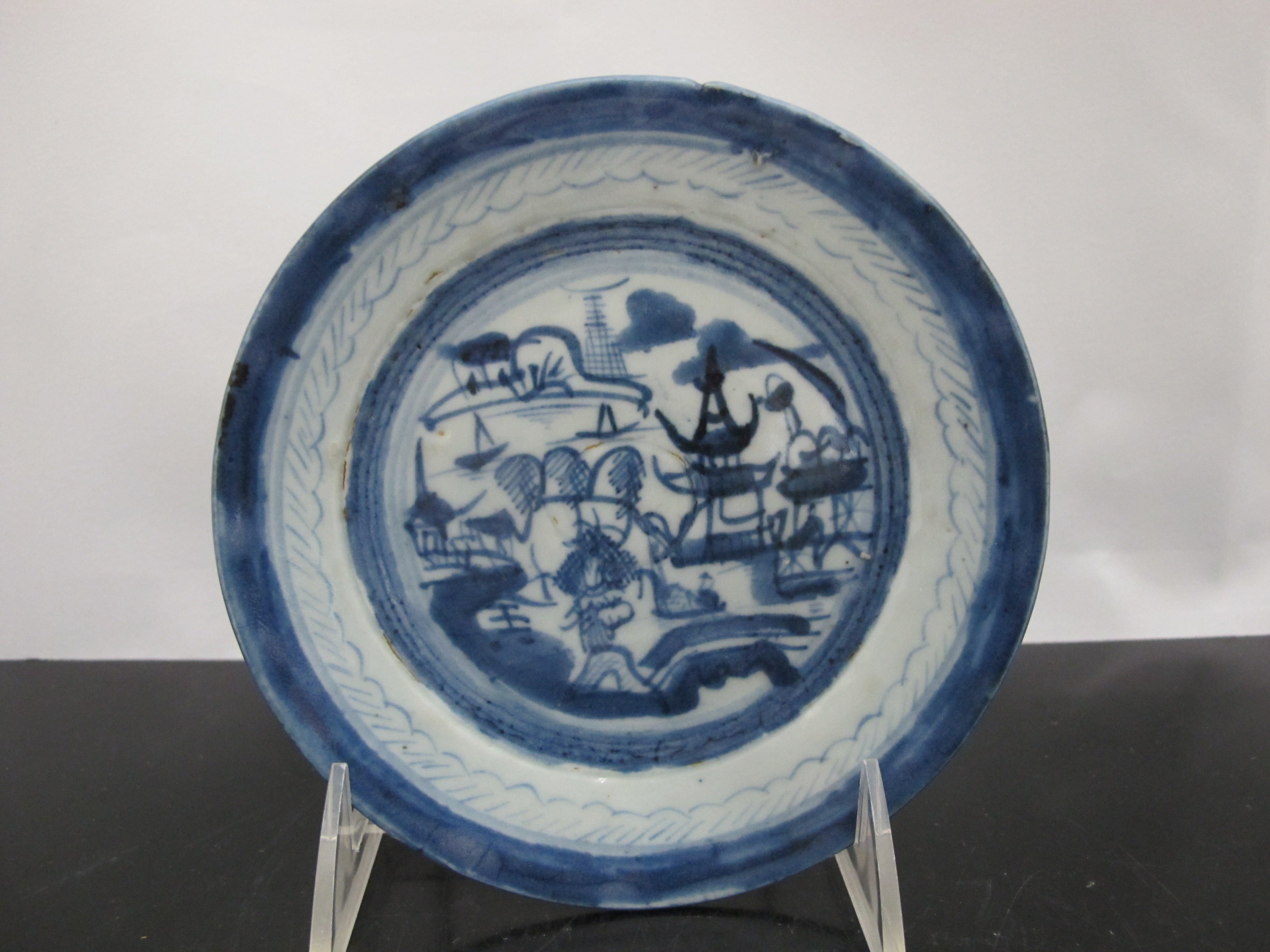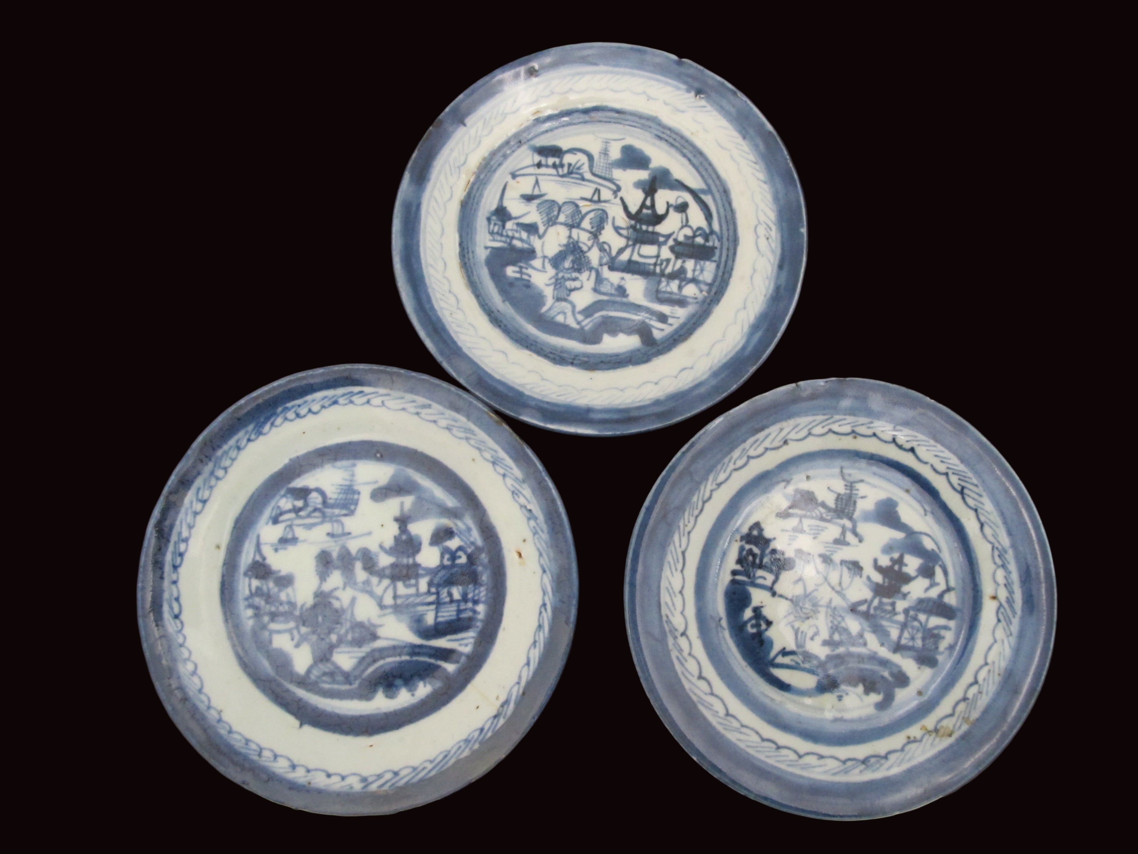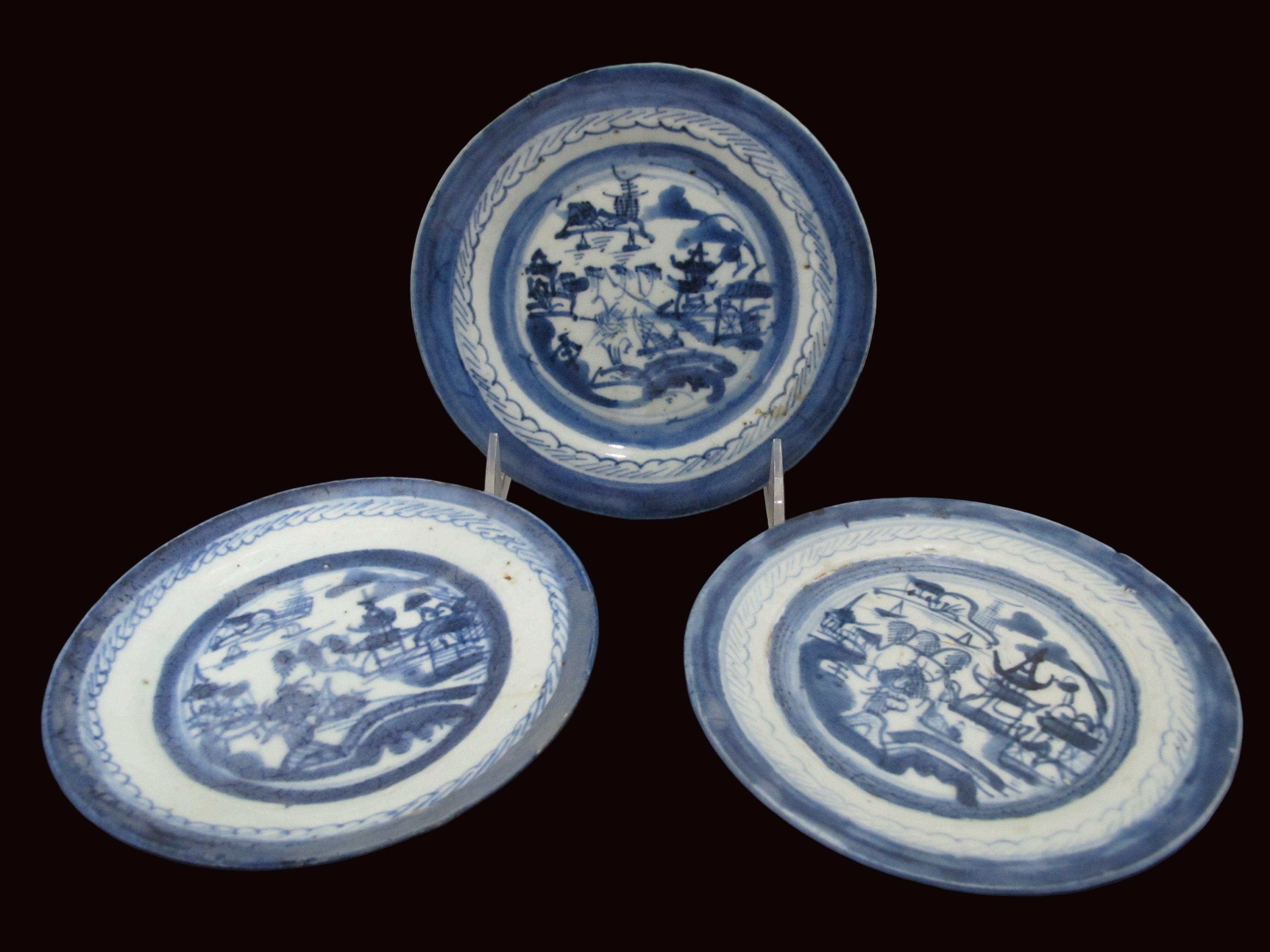Chinese Export Canton blue small porcelain plates or saucers. Set of 3 small plates showing blue and white village scene hand painted under glaze. Each measures 5 7/8". Good condition for age, hairline showing in one plate, please review photographs.