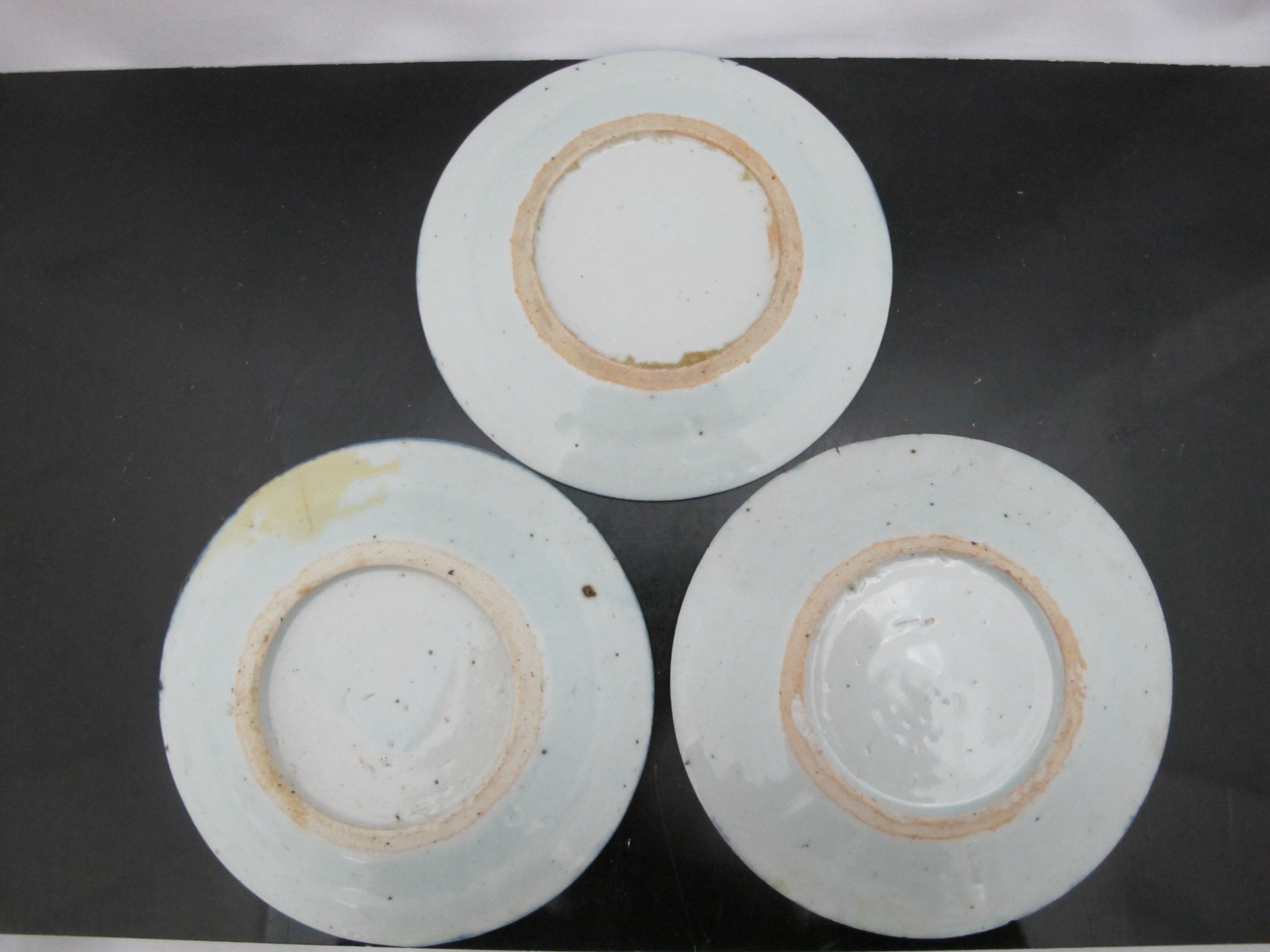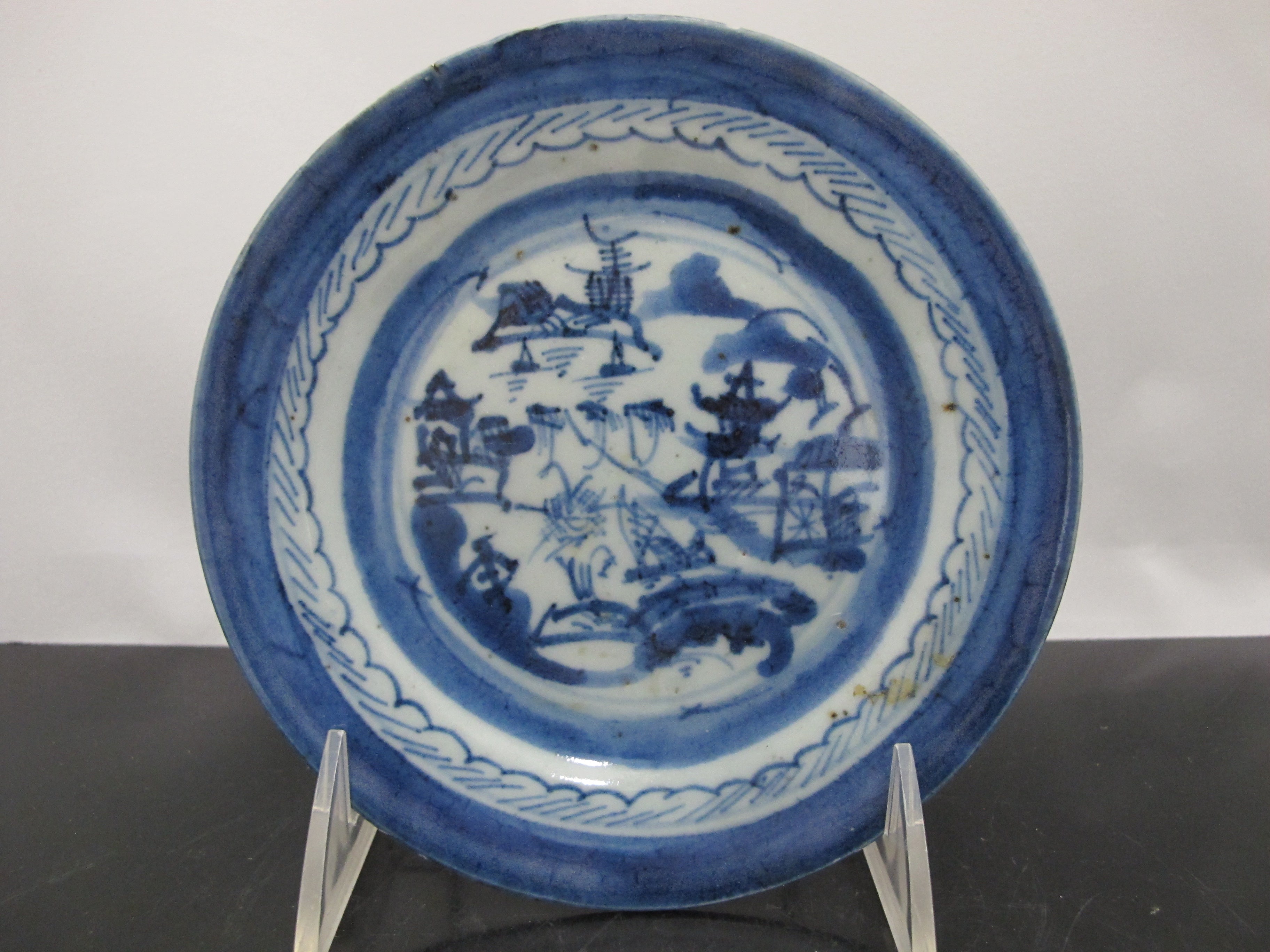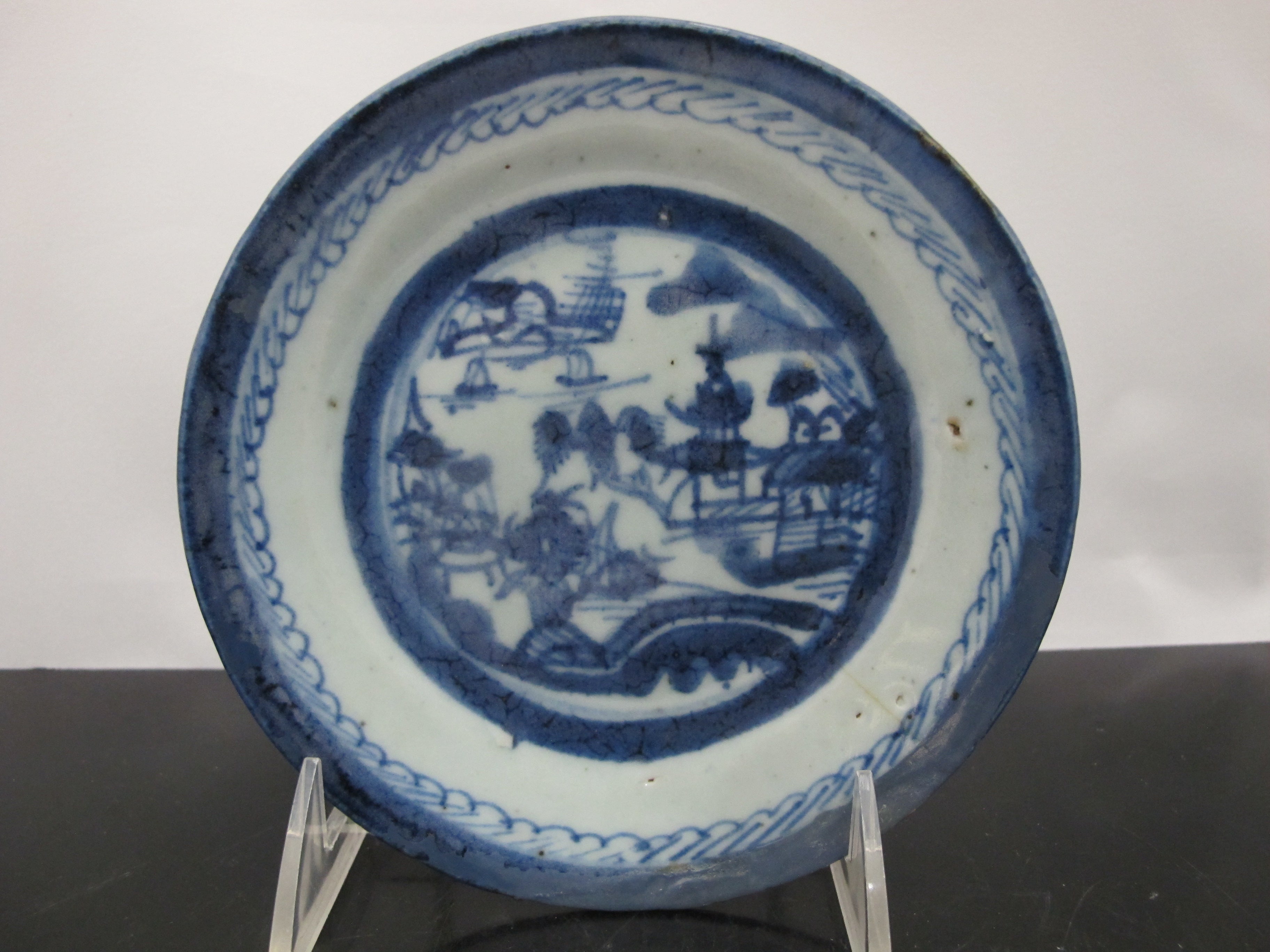 Chinese Export Canton blue small porcelain plates or saucers. Set of 3 small plates showing blue and white village scene hand painted under glaze. Each measures 5 7/8". Good condition for age, hairline showing in one plate, please review photographs.