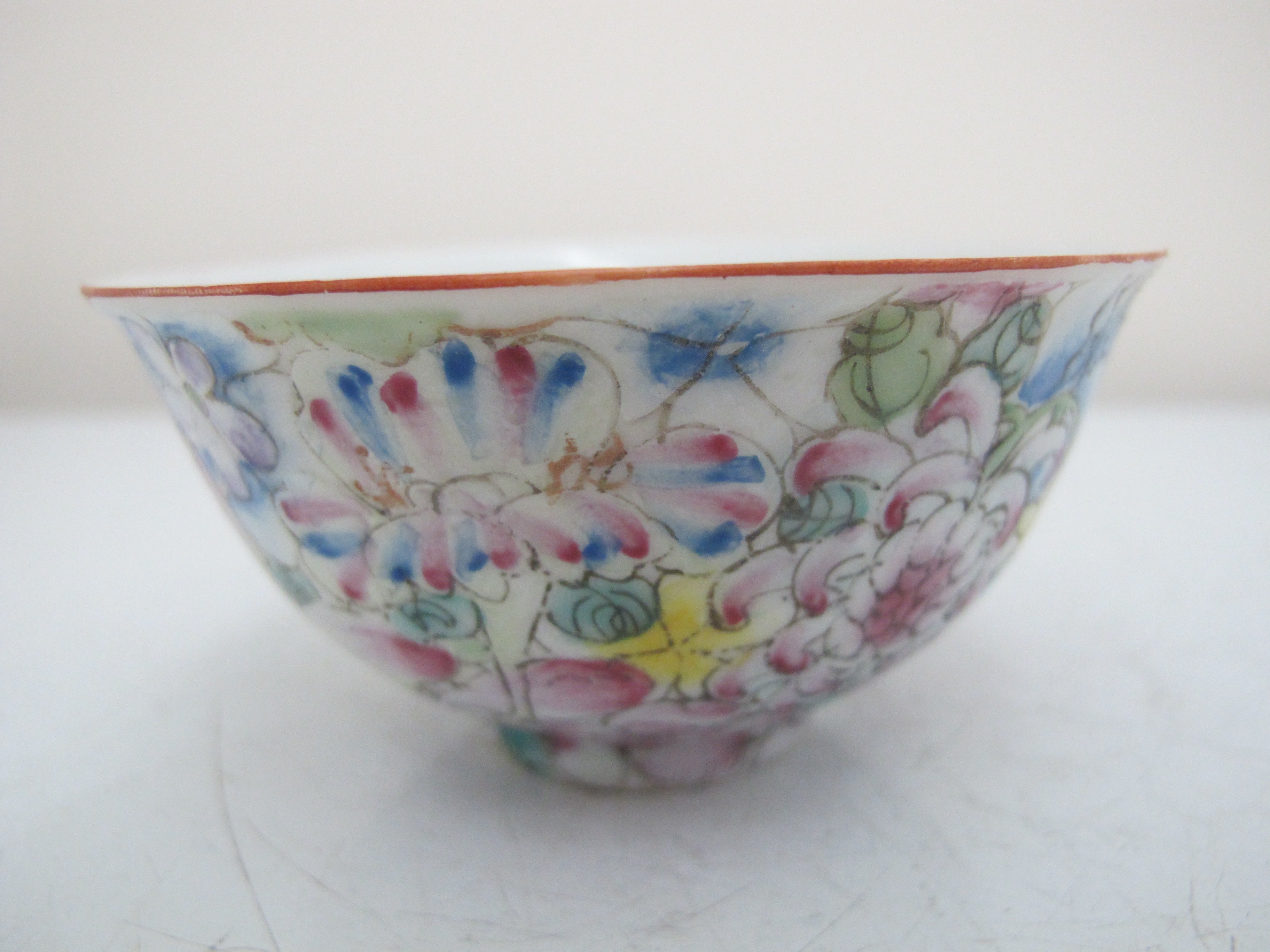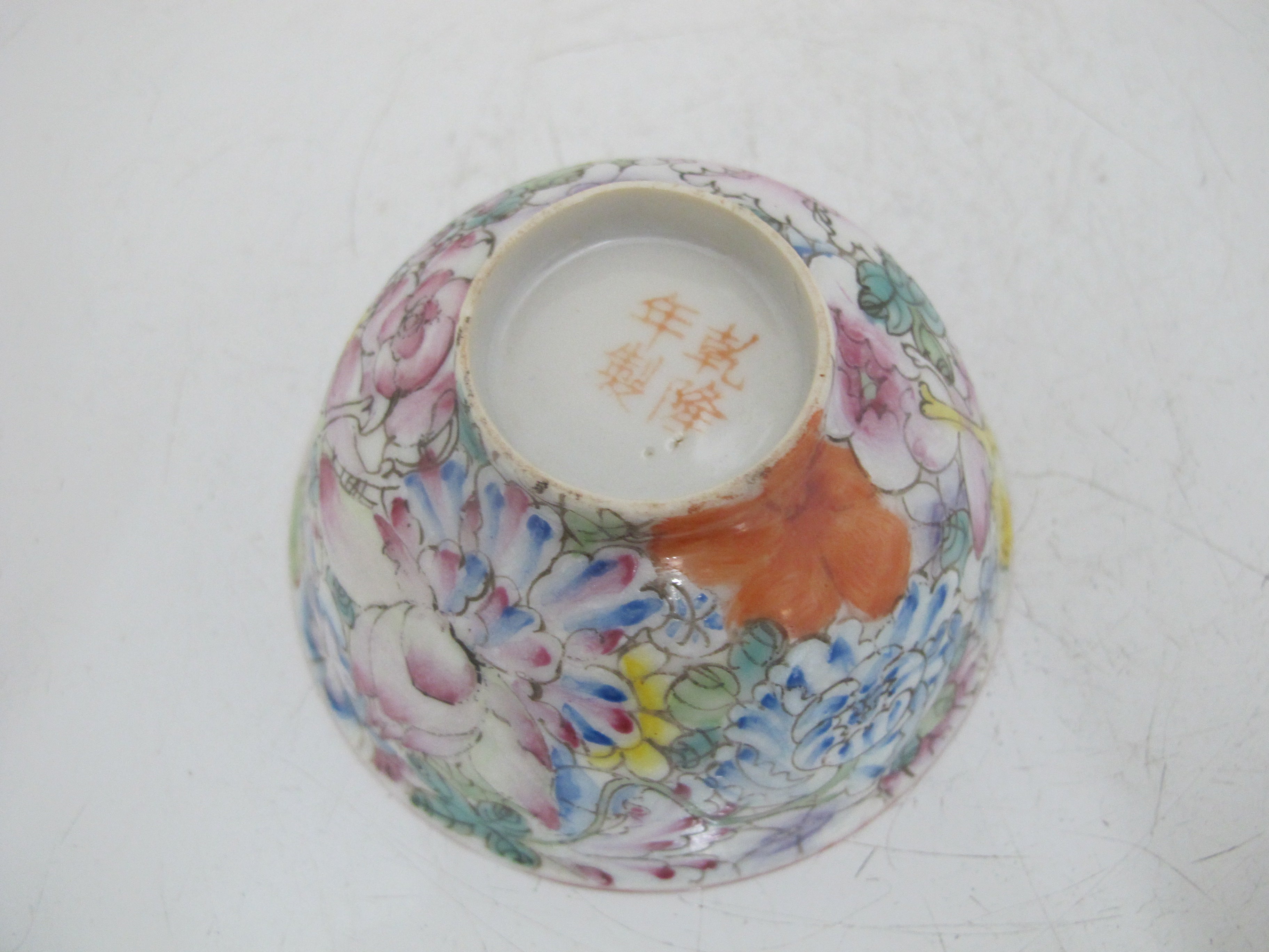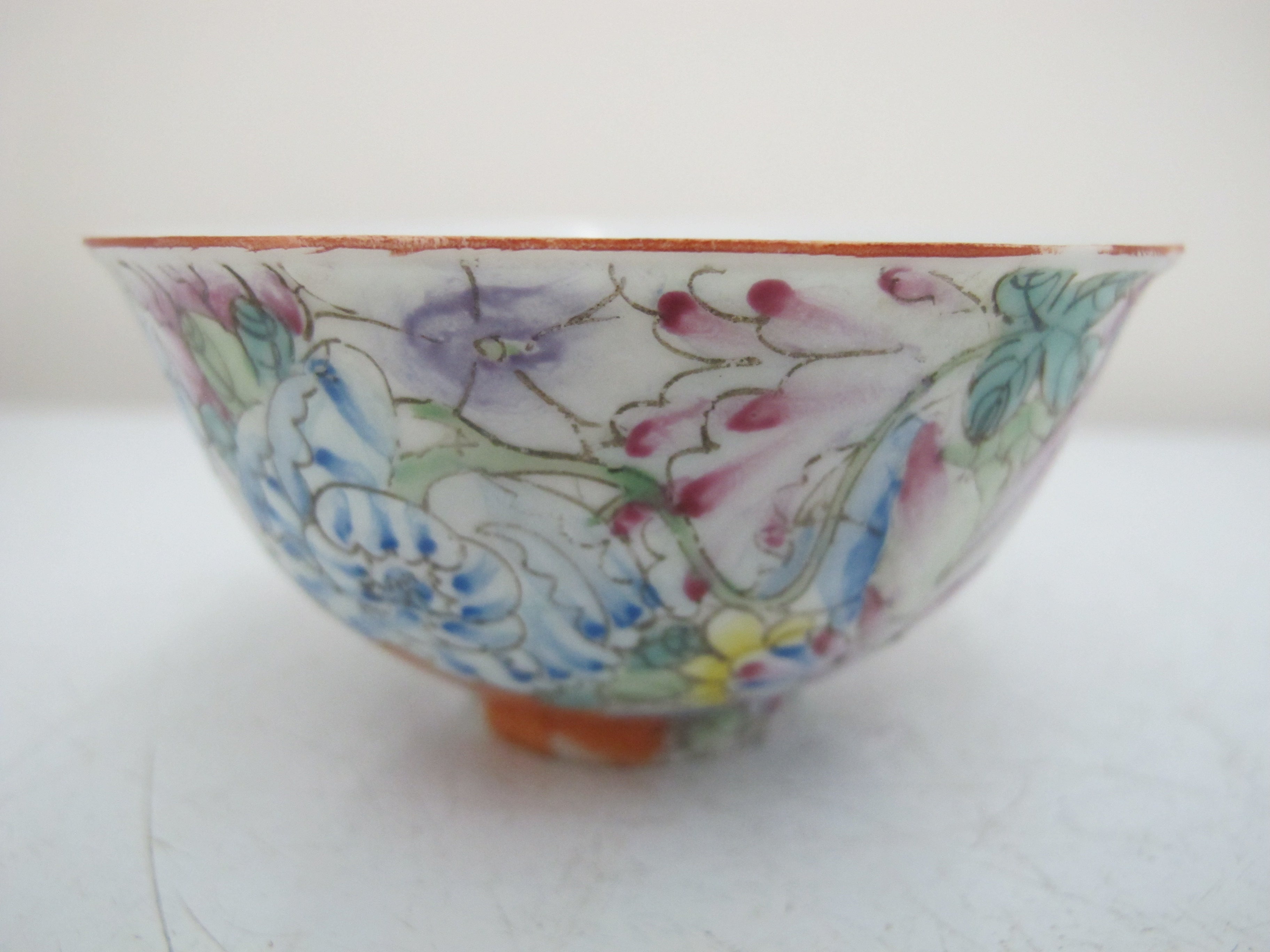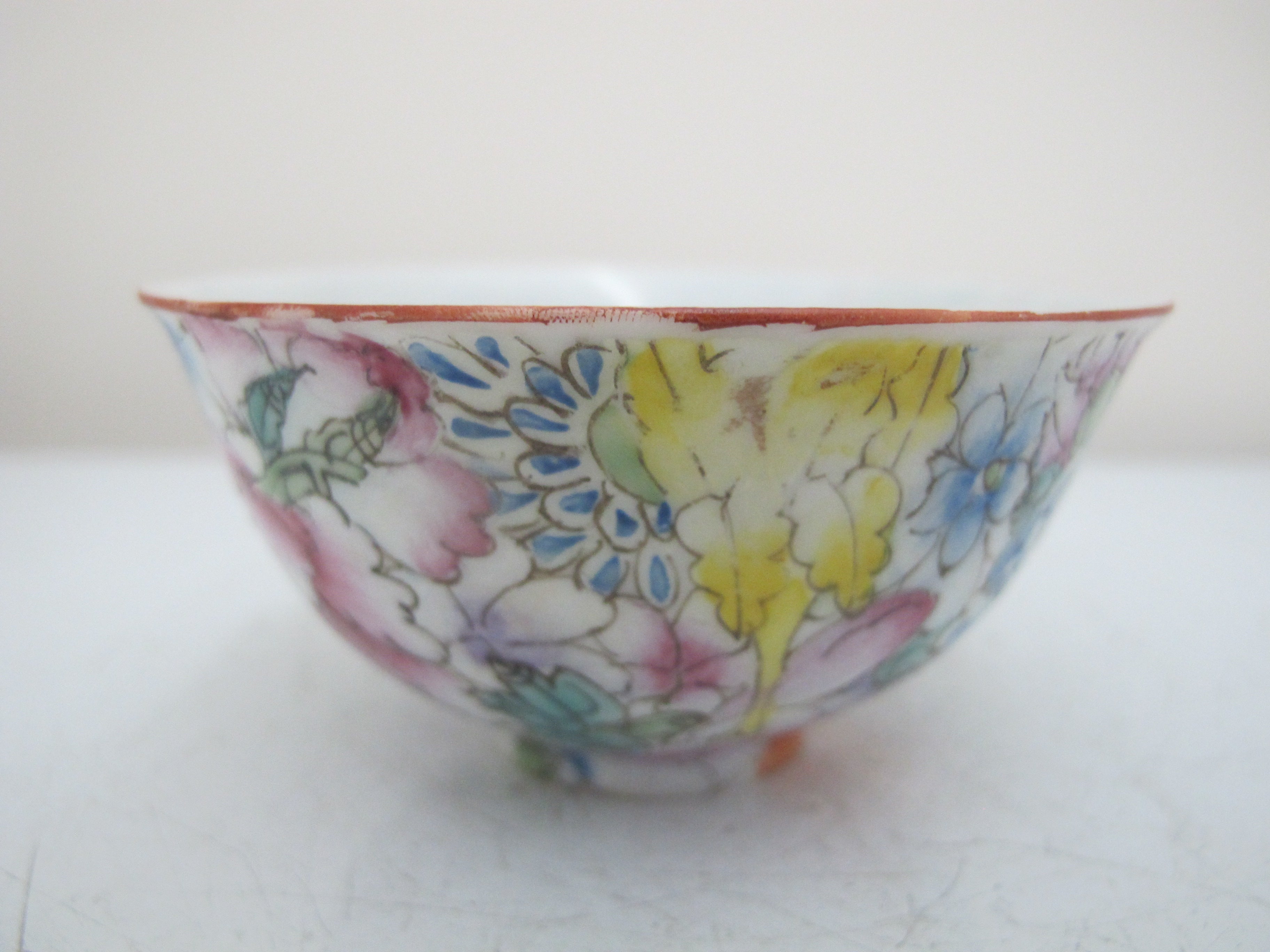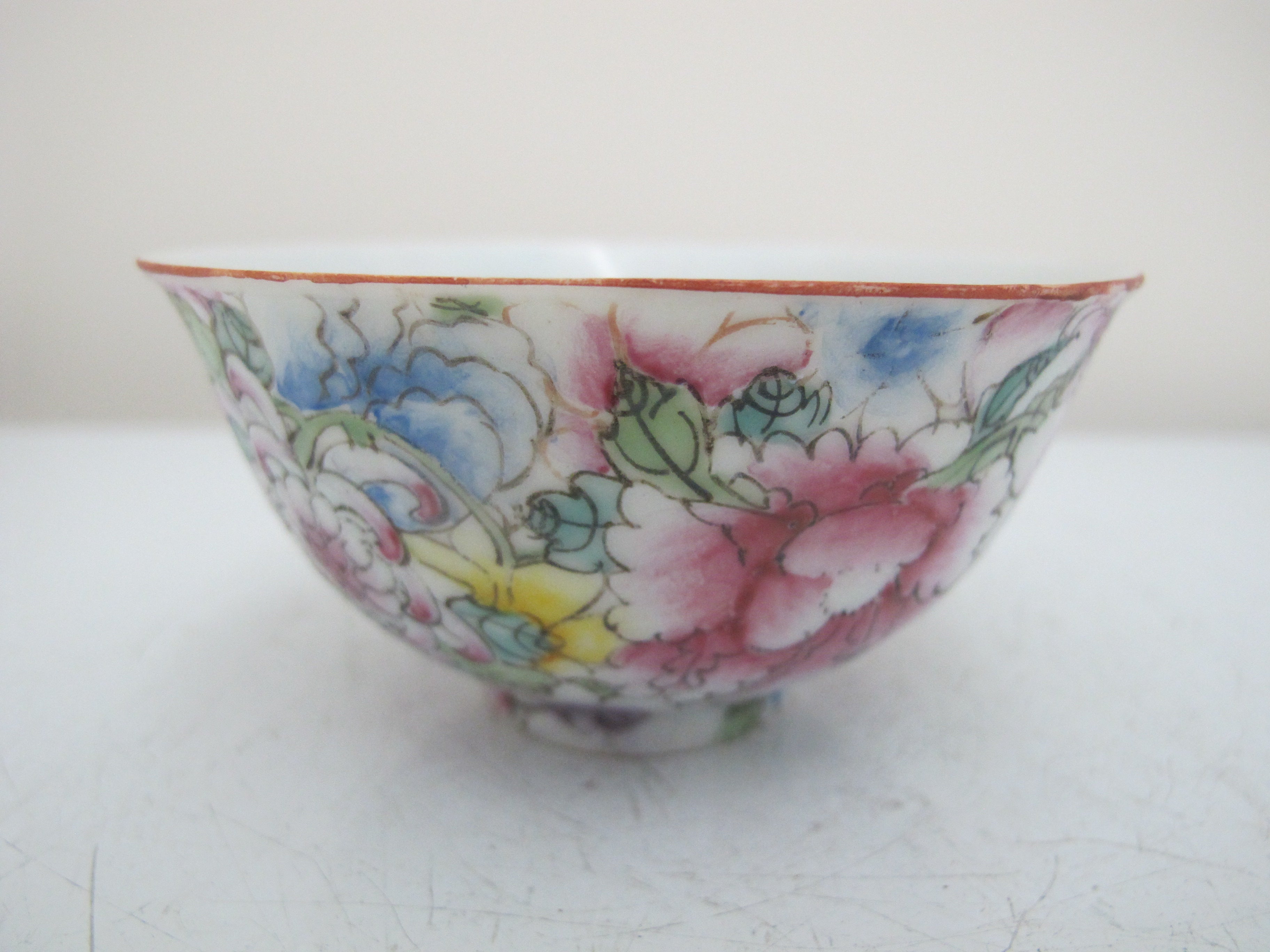 Sweet small Chinese porcelain bowl. Footed bowl with deep sides rising to a gently flared rim. Hand painted exterior shows a dense profusion of flowers in delicate pink, yellow, blue, and green tones. Measures 3 3/4" x 2" tall. Excellent condition, light wear to glaze, no chips, cracks, or repairs. Signed with characters at base.