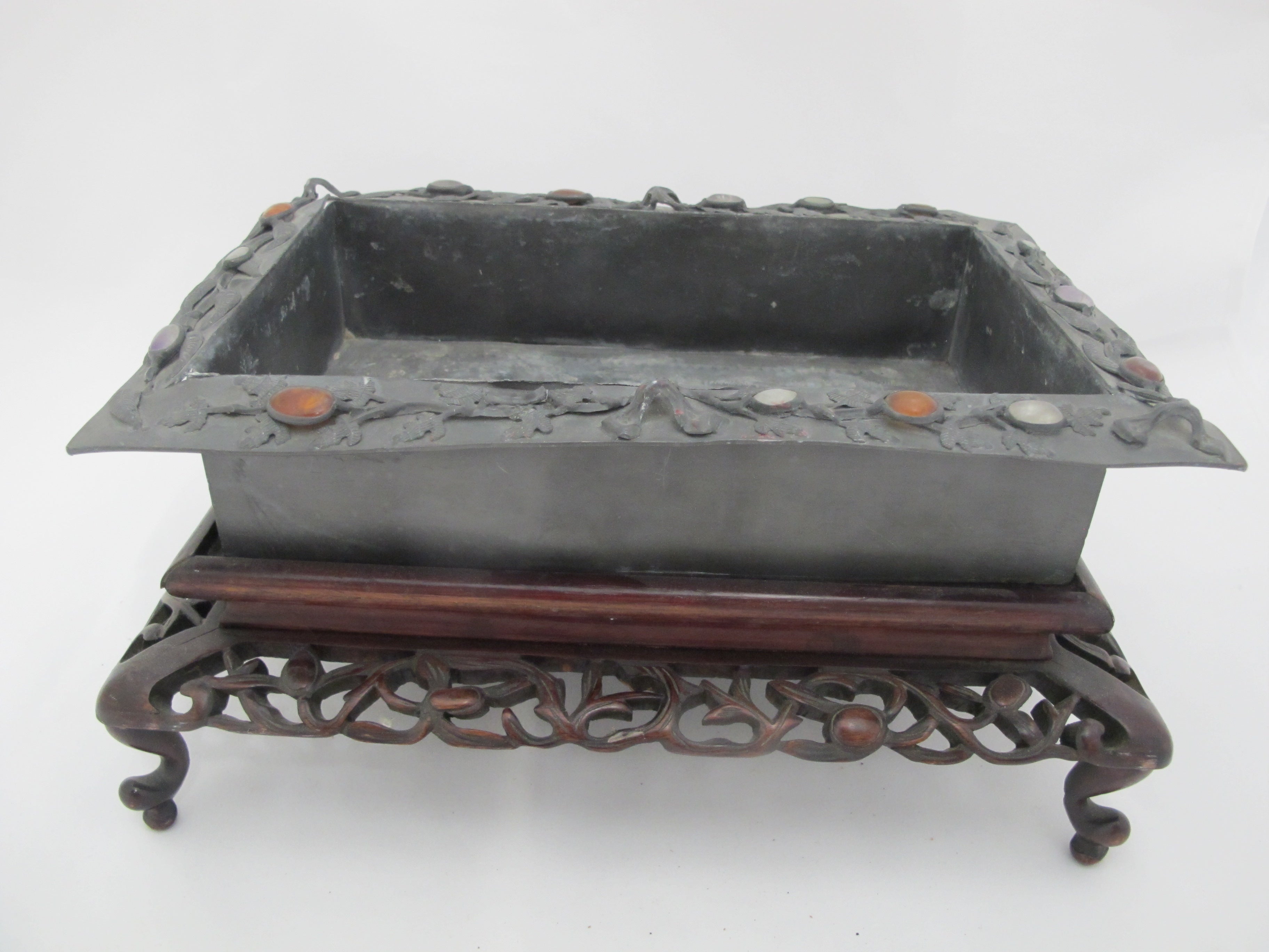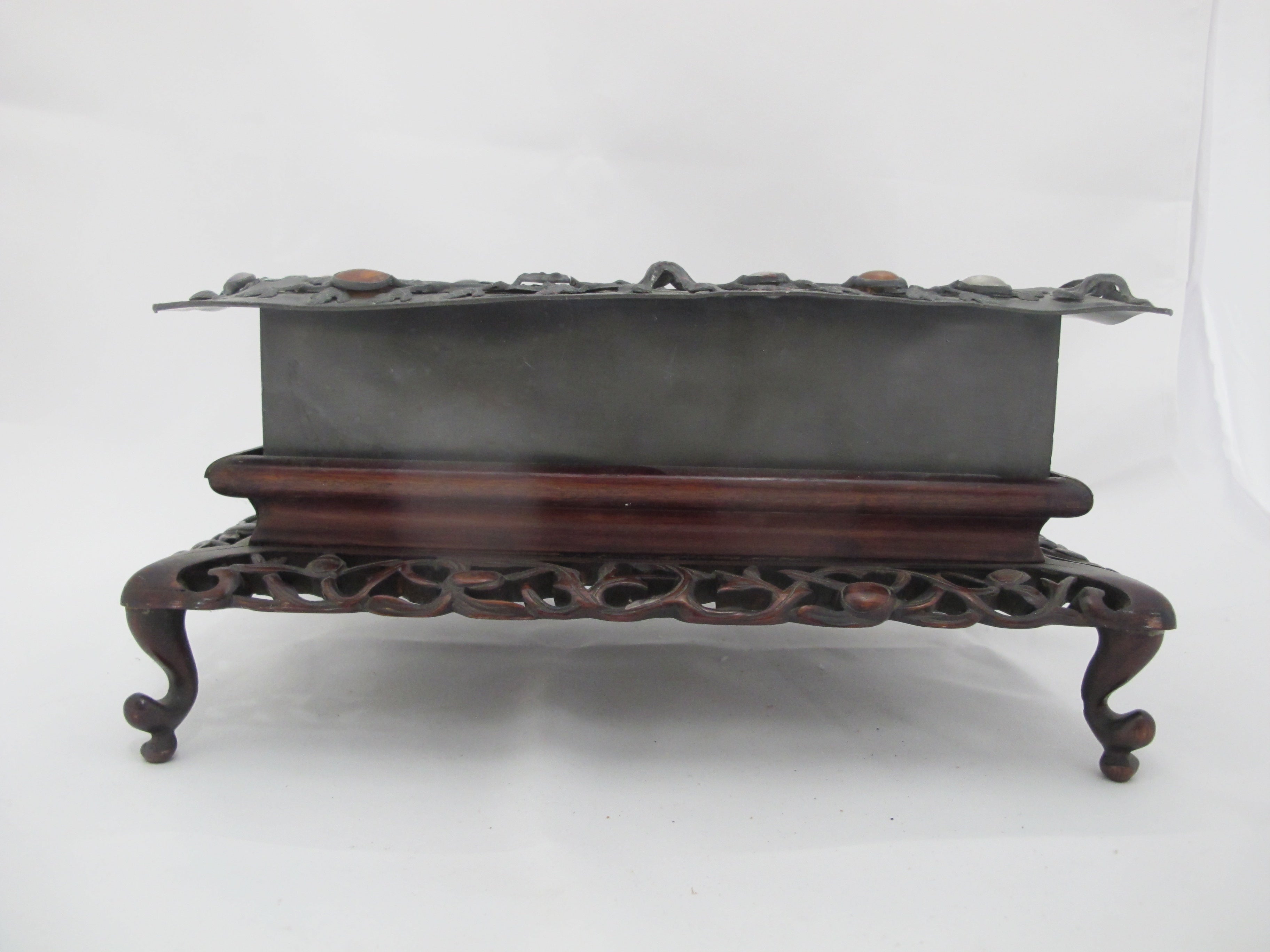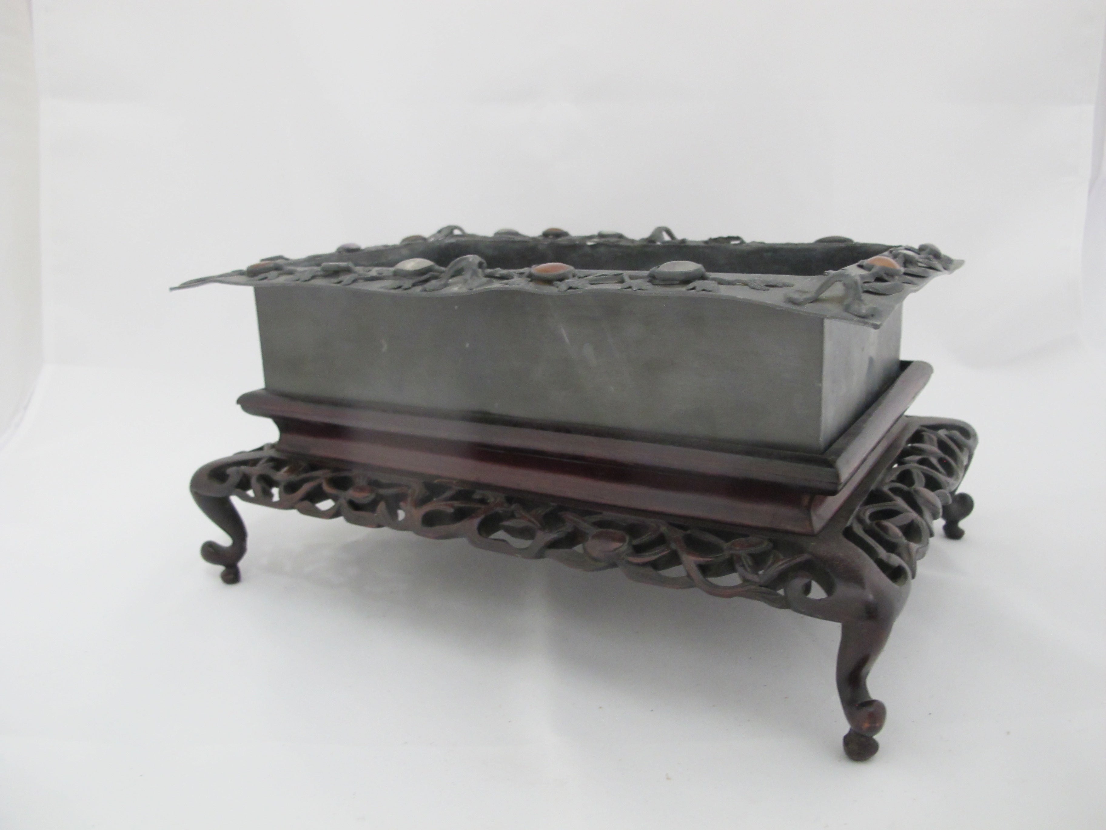 CHINESE Inlaid Jade & Carnelian Pewter Decorative Tray Box on Carved Wood Stand