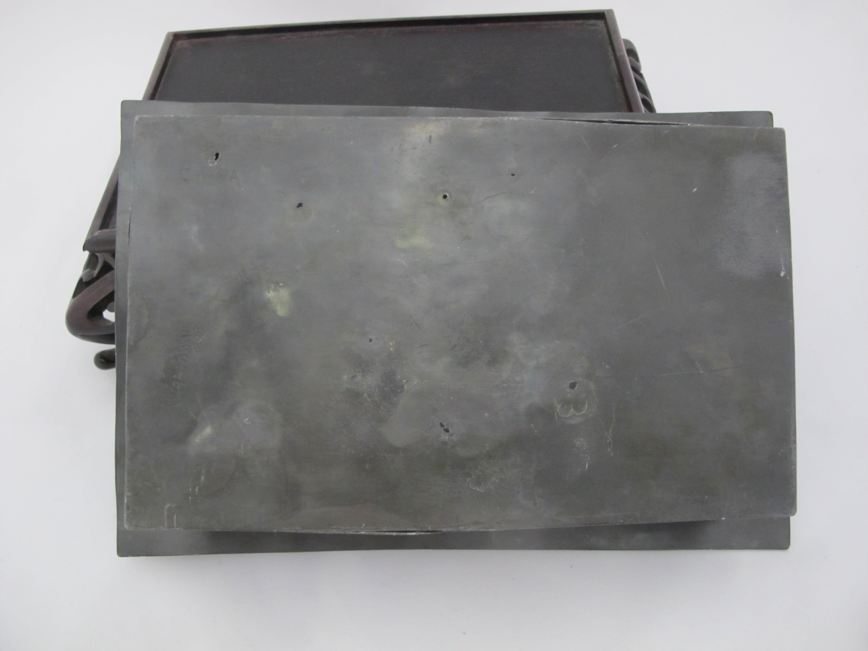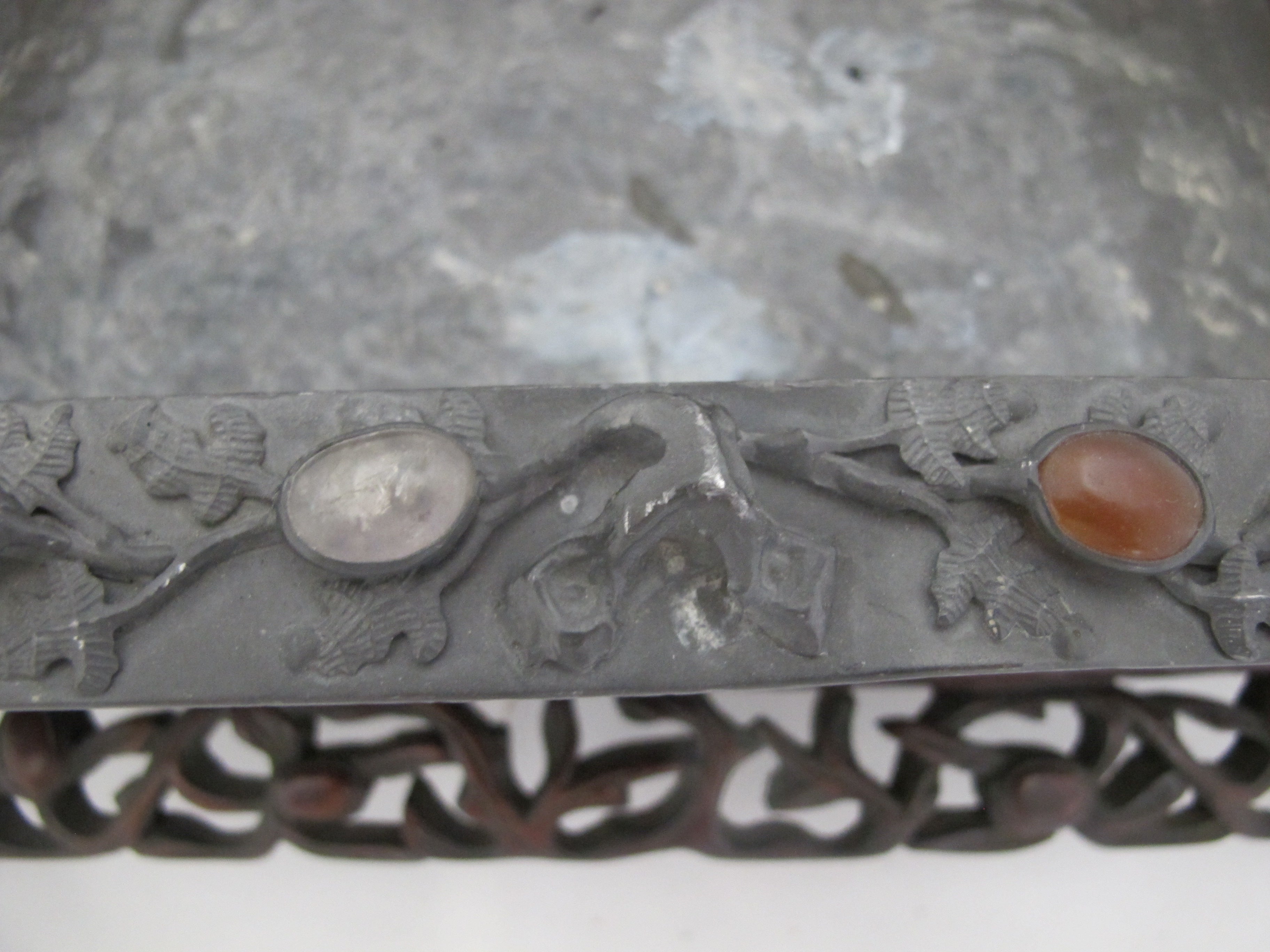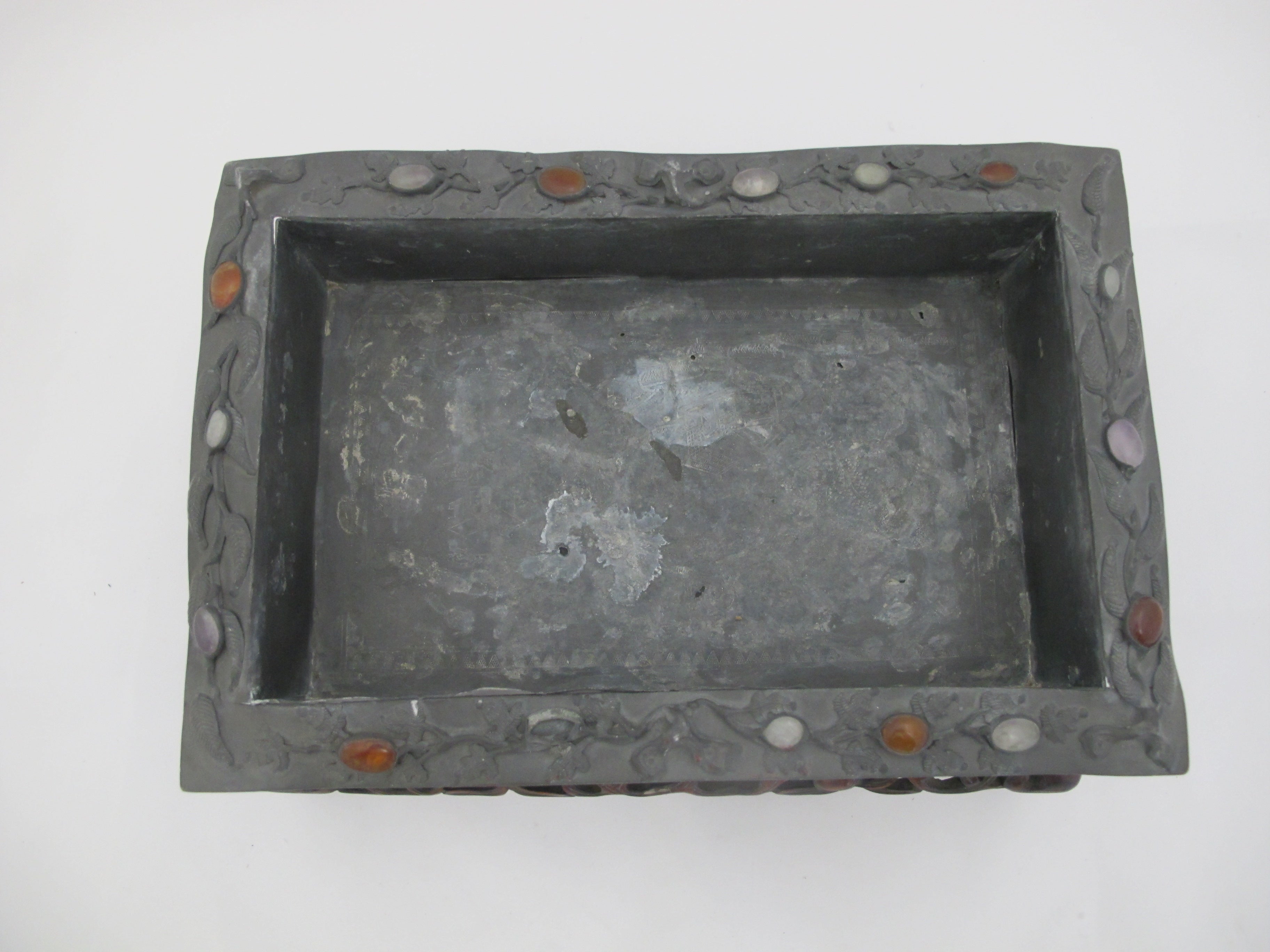 CHINESE Inlaid Jade & Carnelian Pewter Decorative Tray Box on Carved Wood Stand