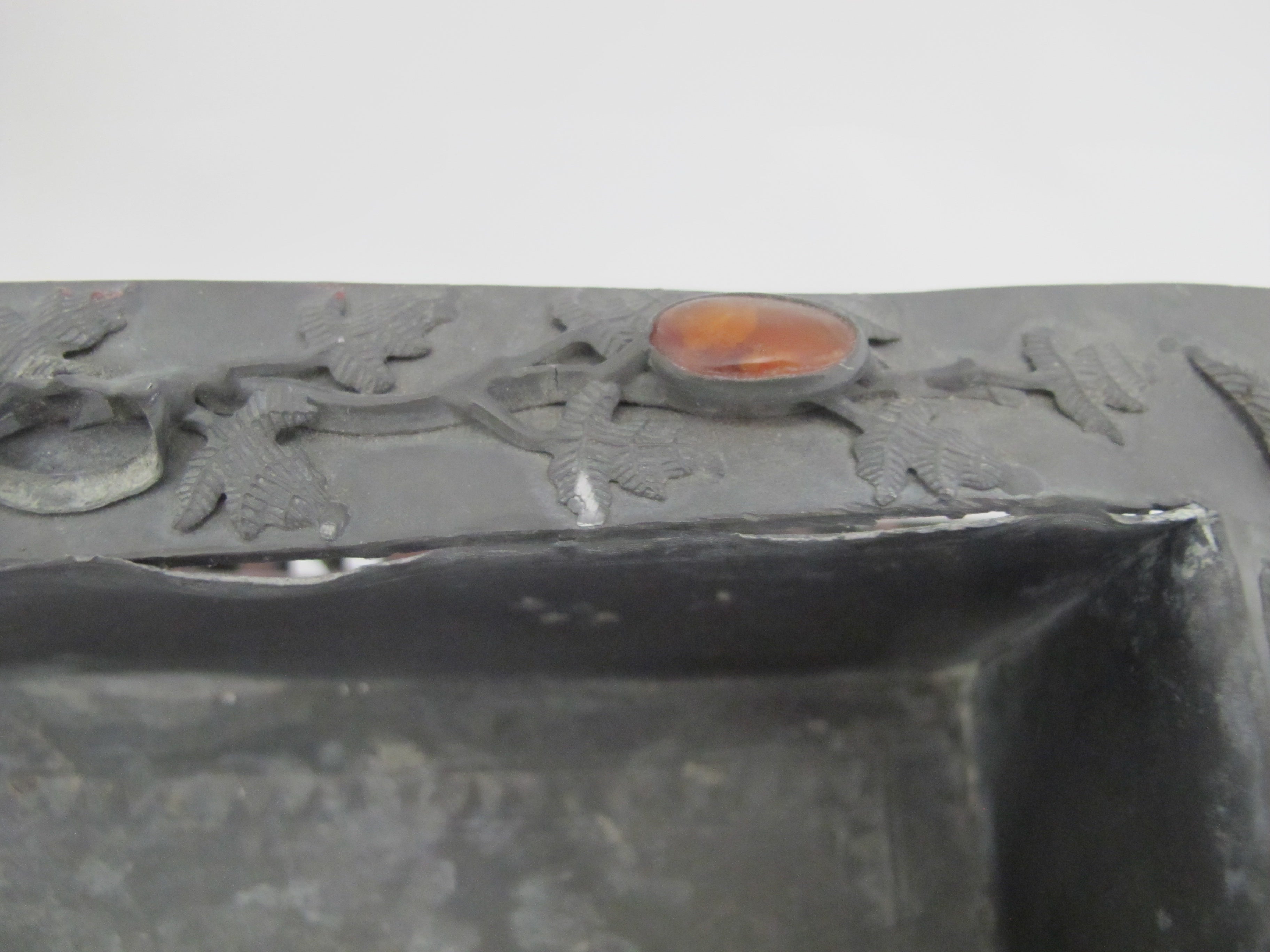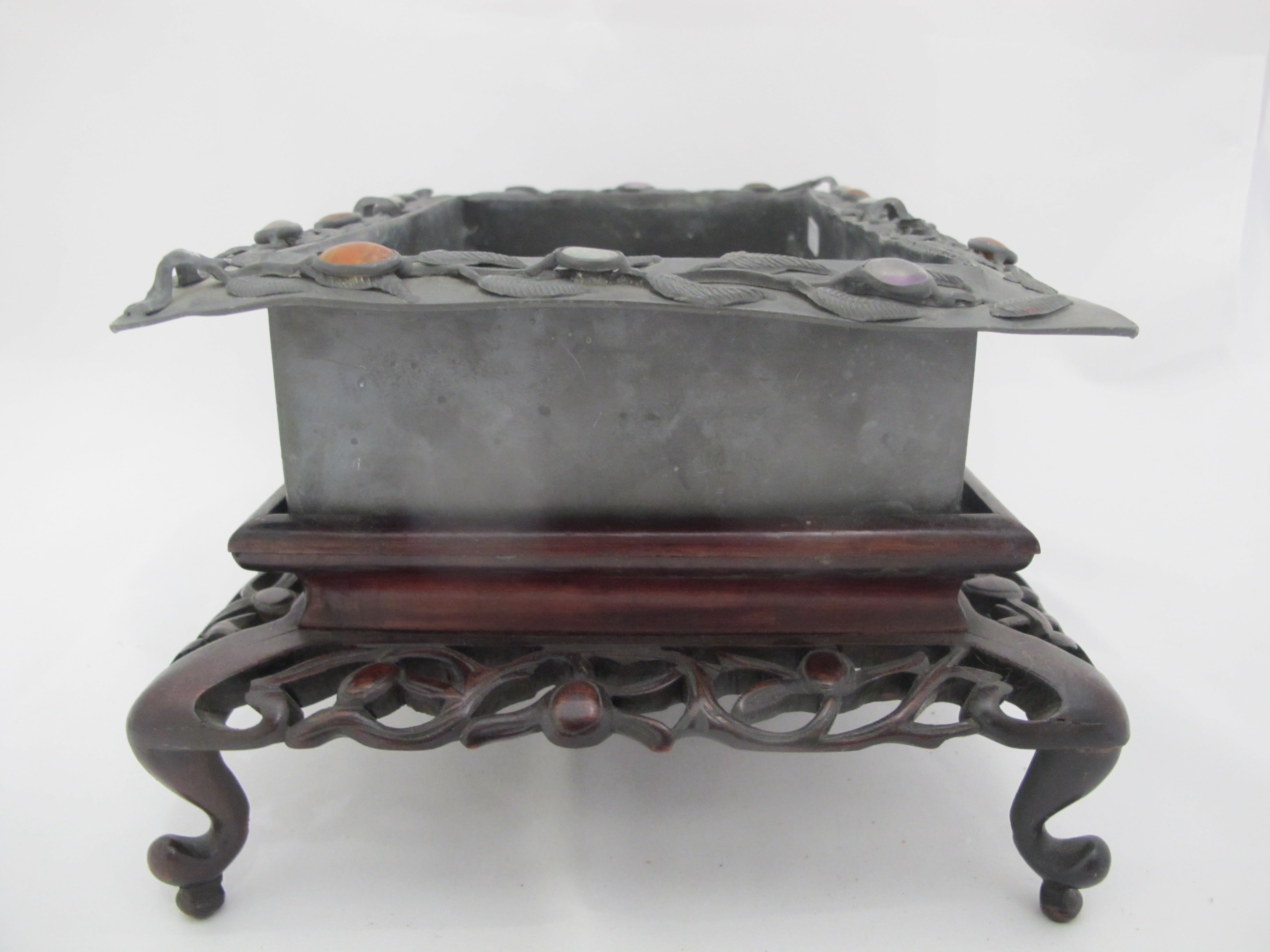 Antique Chinese pewter box on carved wood stand. Ornate raised leaves and flowers with inlaid jade and carnelian at rim. Etched scene at interior of box.