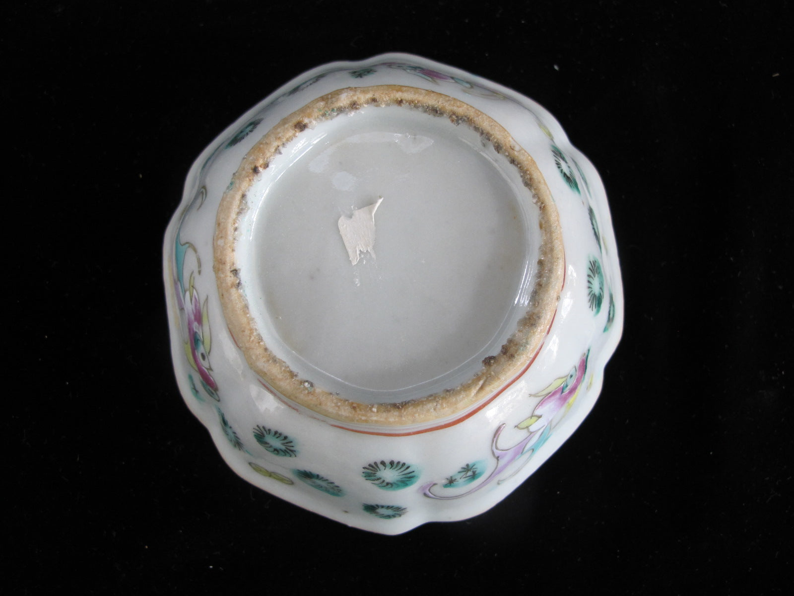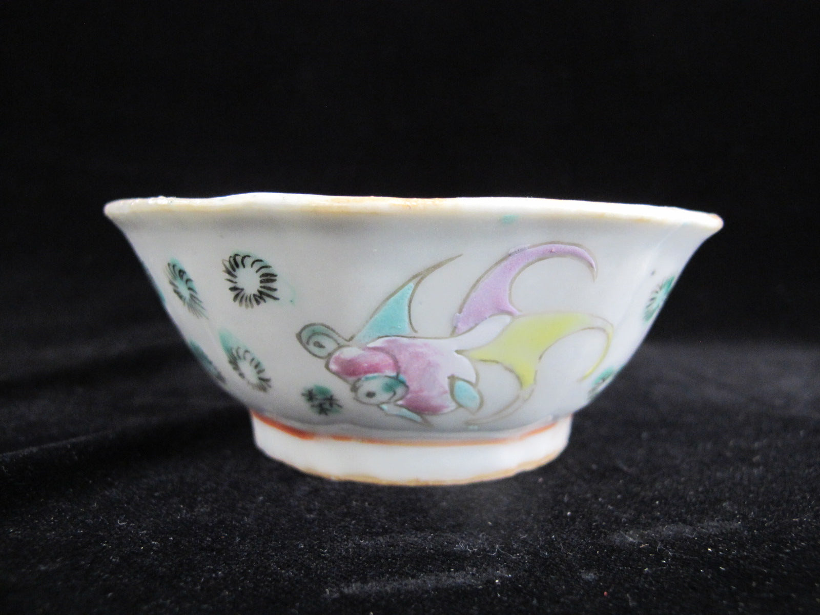 Very sweet vintage Chinese Nyonya porcelain rice bowl with lobed rim. White backdrop showing colorful enamel hand painted fish and flower motif. Inner bowl is a bright turquoise blue. Measures 4 3/4" wide x 2" tall. Excellent condition, showing typical wear for old age. Minor wear to glaze, some rough edges, but no major cracks, or repairs.
