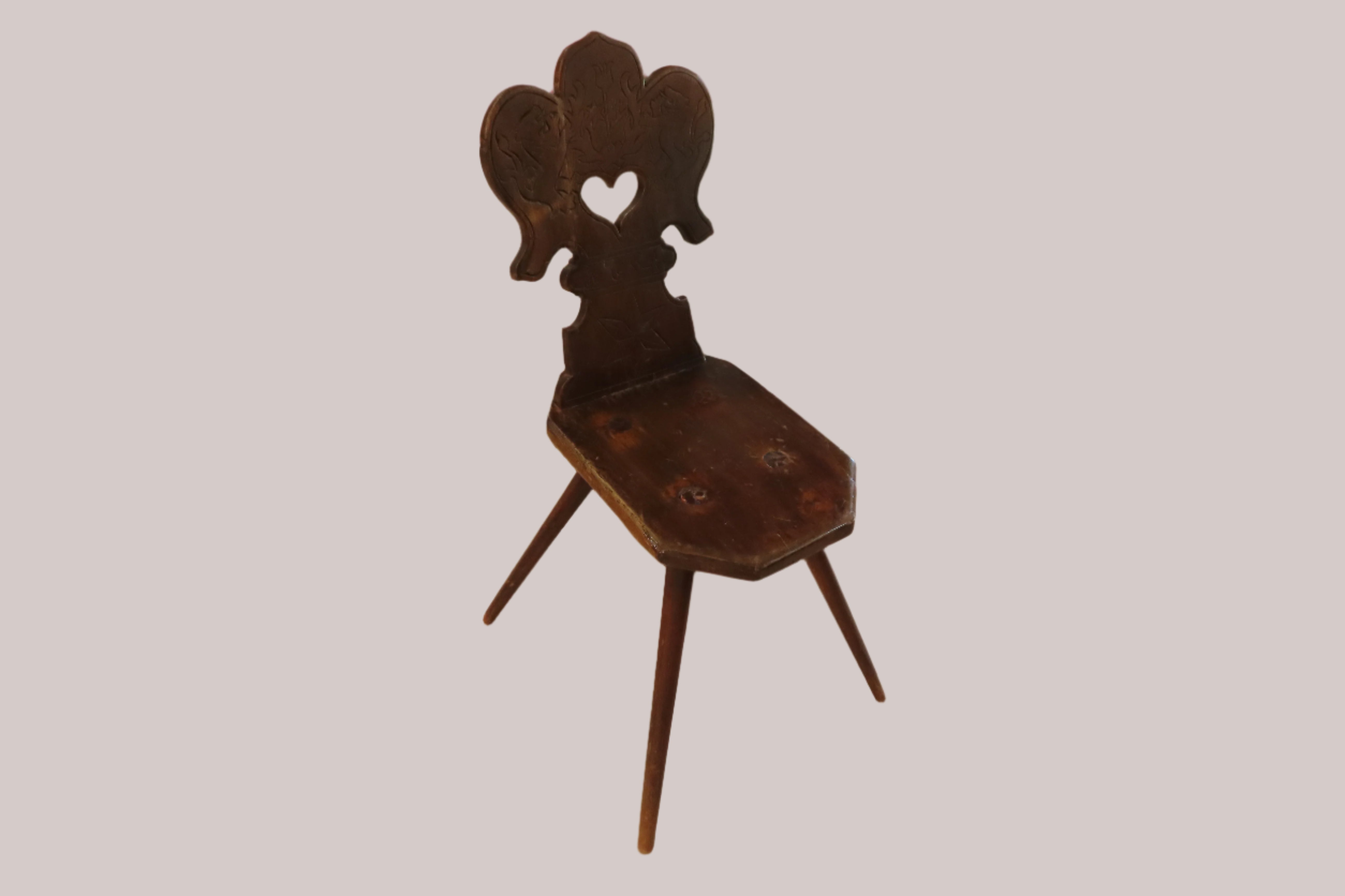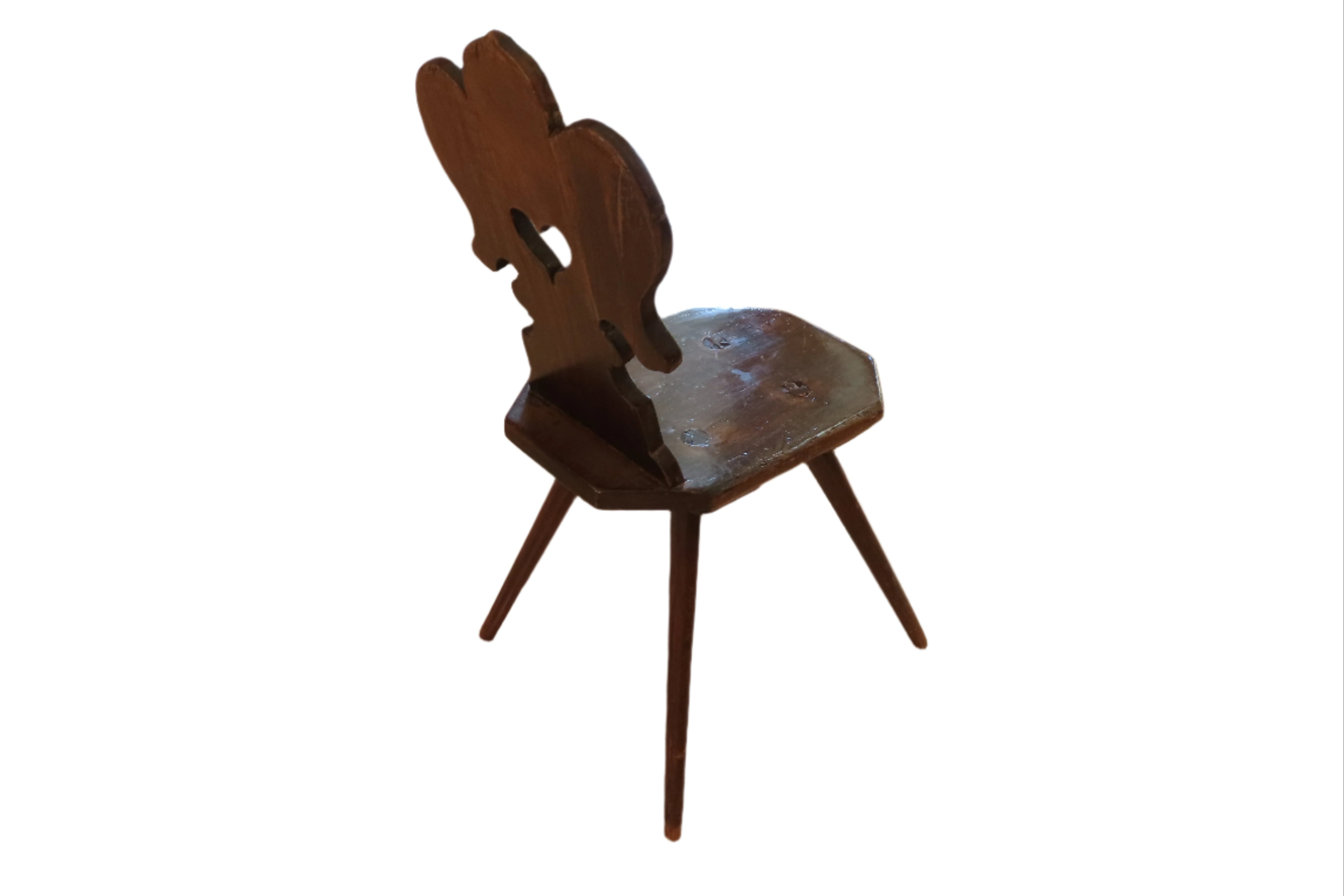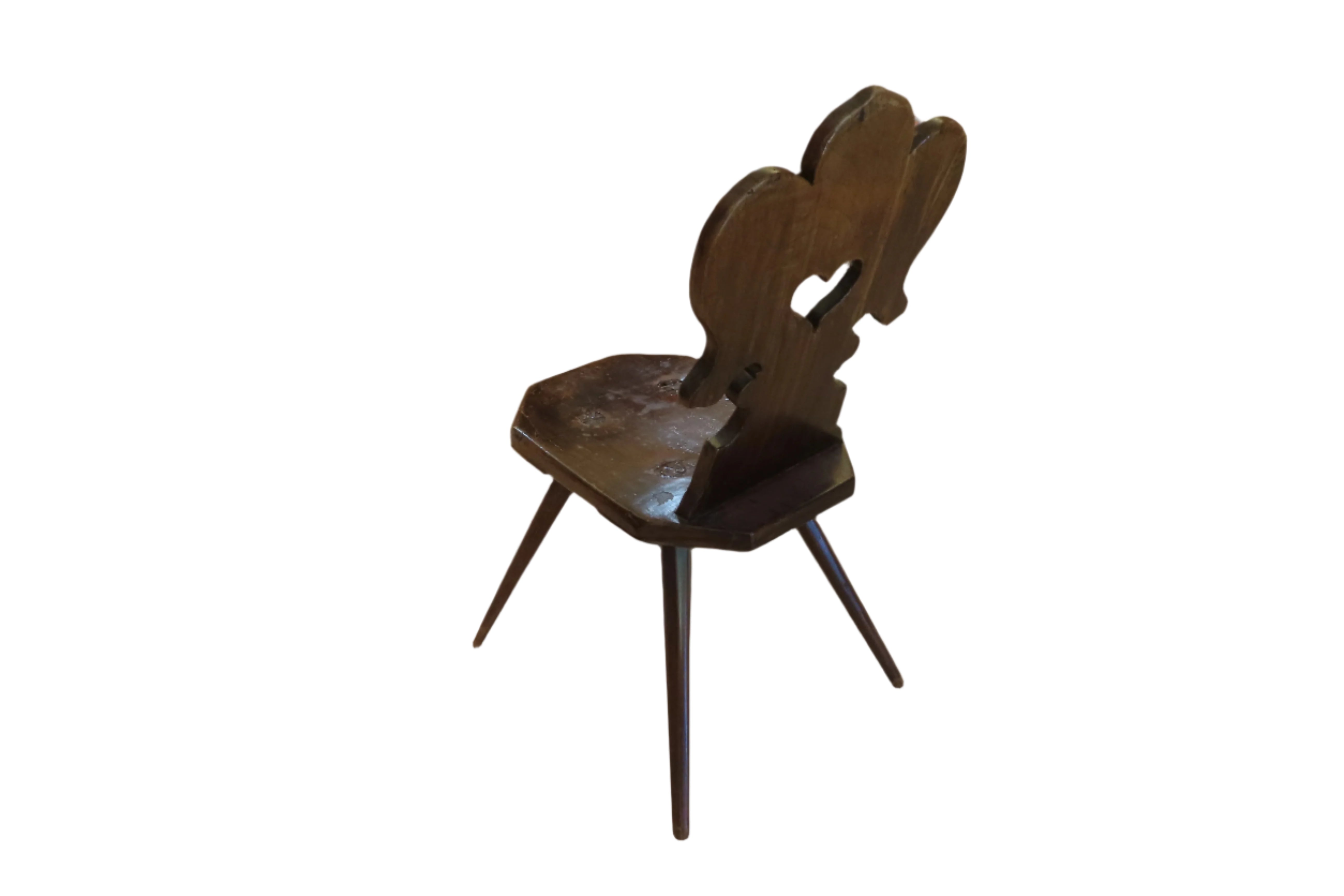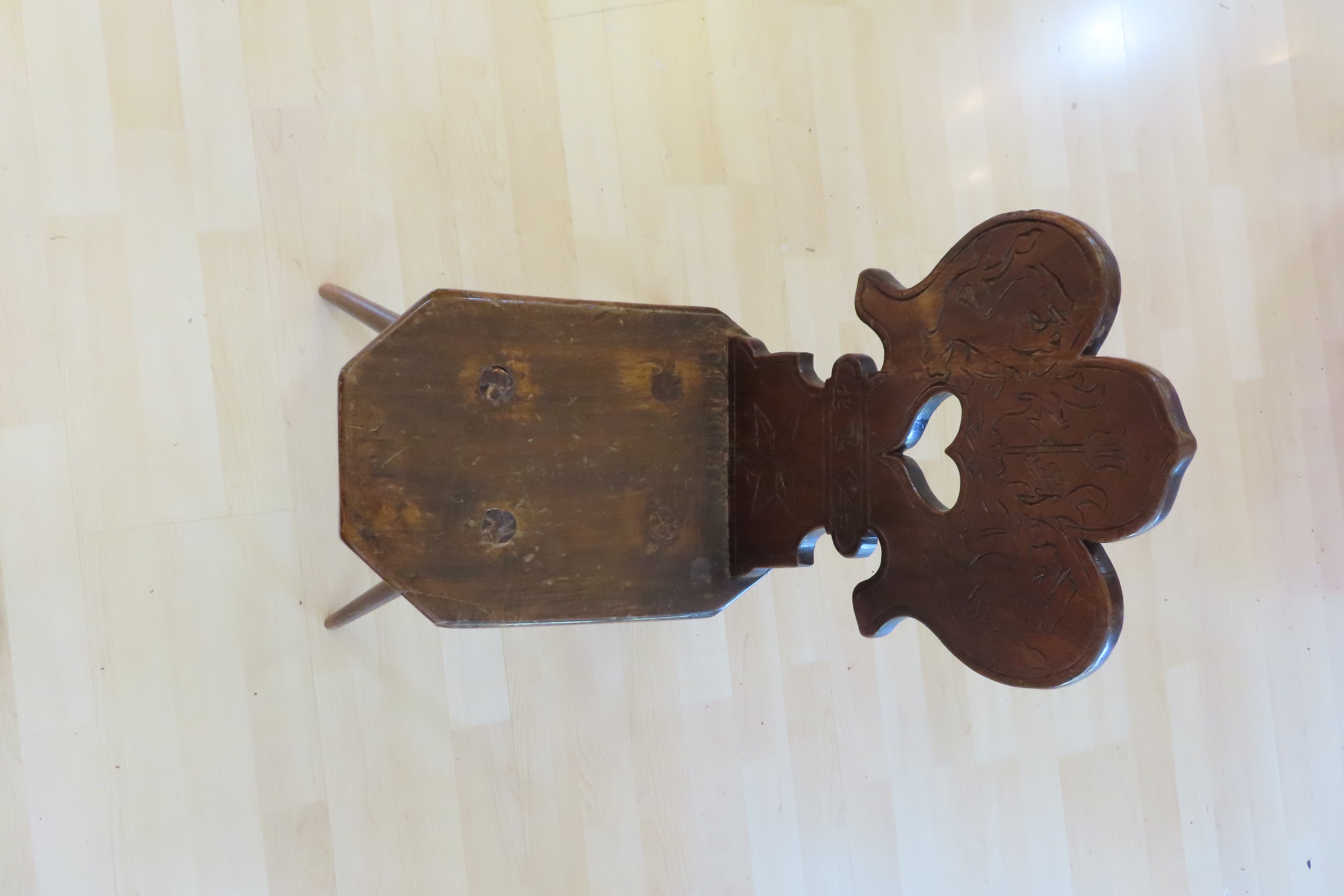 Stunning hand crafted and hand carved primitive 17th century style Bavarian chair. Constructed from hard wood. The back of the chair is carved to depict lions on either side of a family crest. There's also d754 carved under the cutout of the heart.