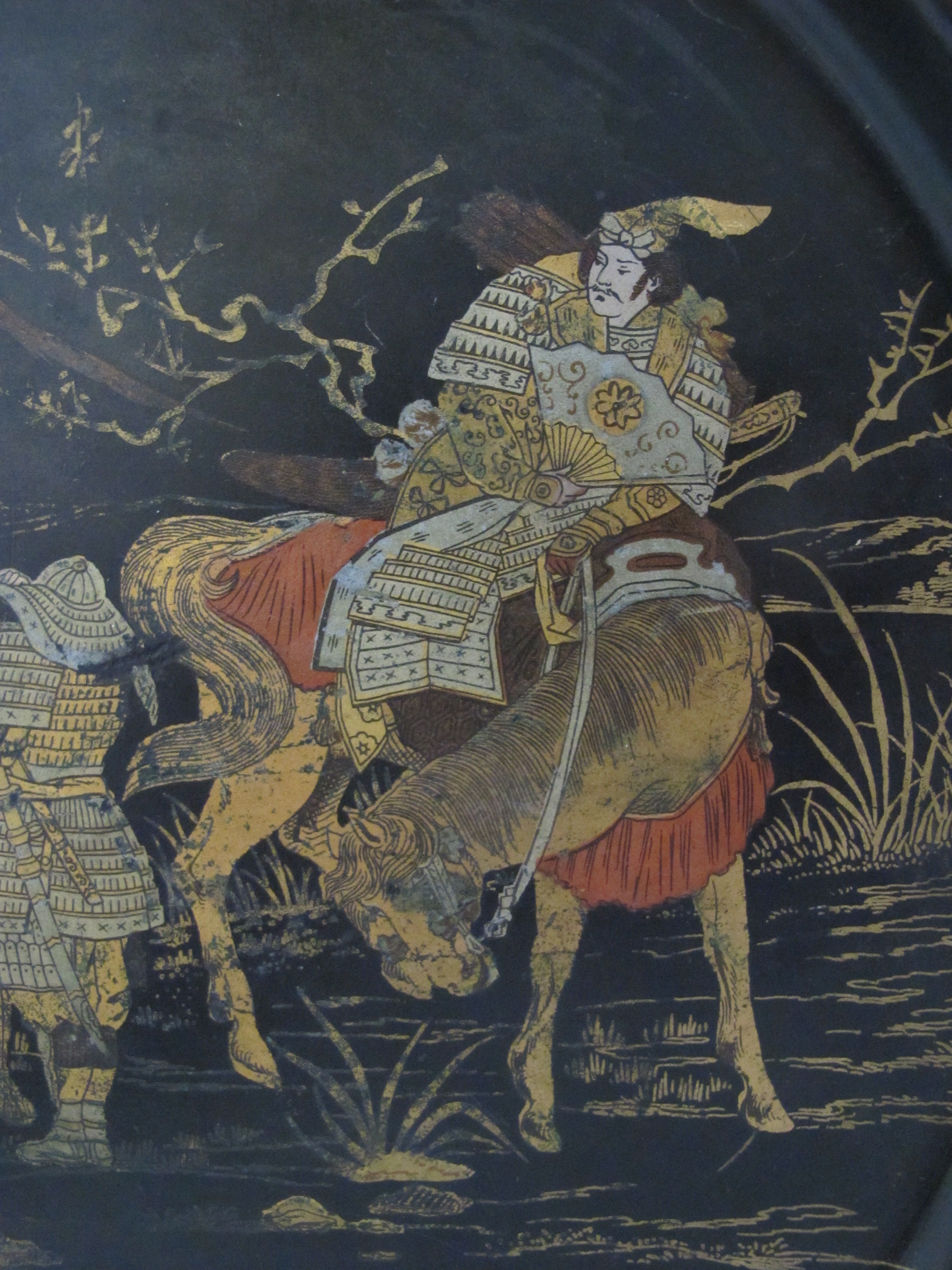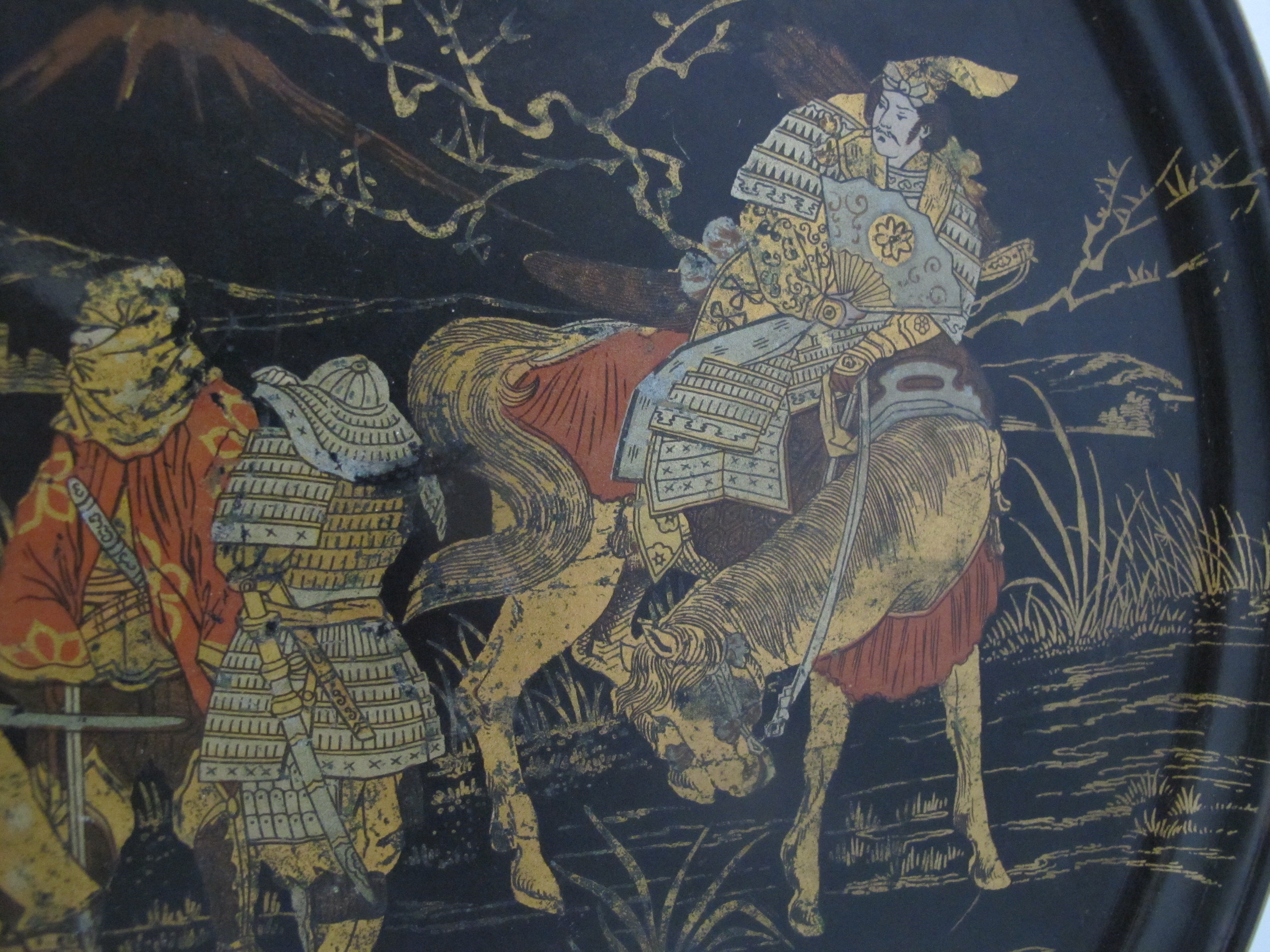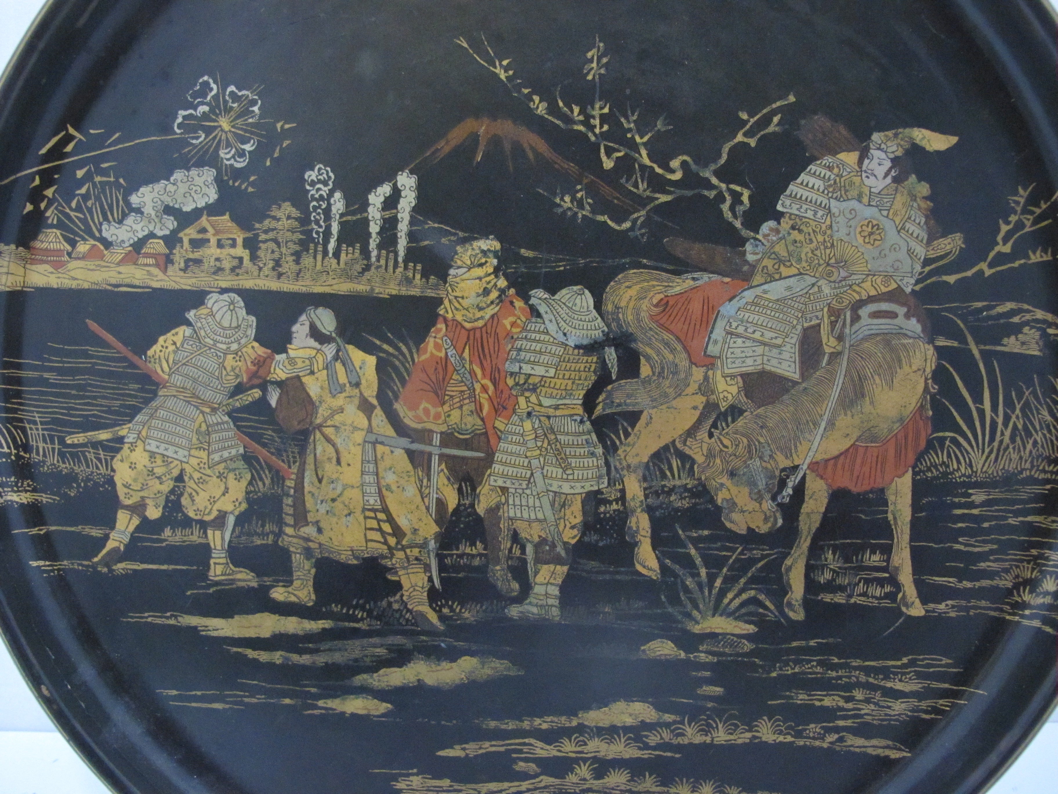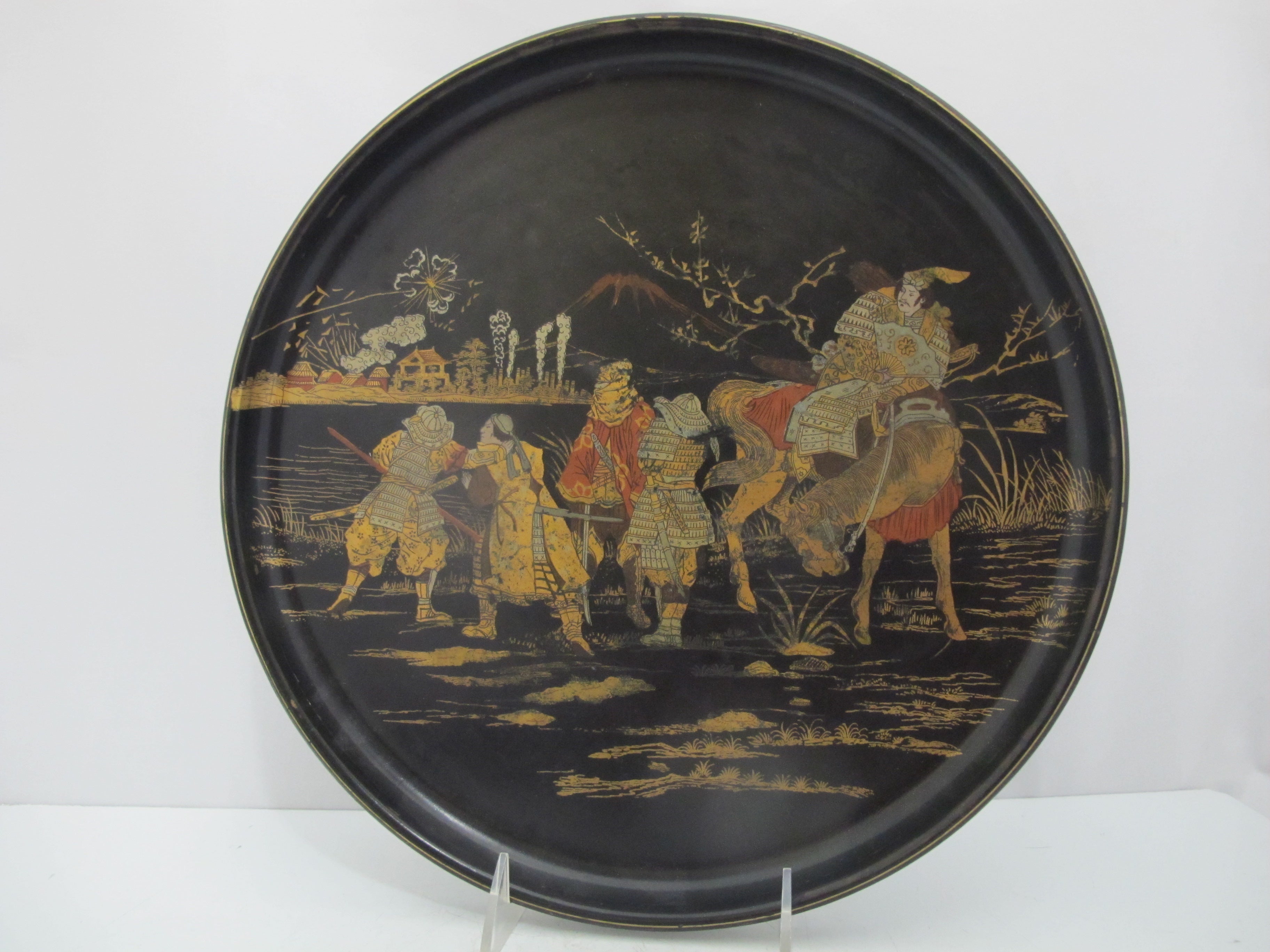 JAPANESE Meiji Papier-Mache Gilt Hand Painted WARRIOR Scene Round LACQUER Tray