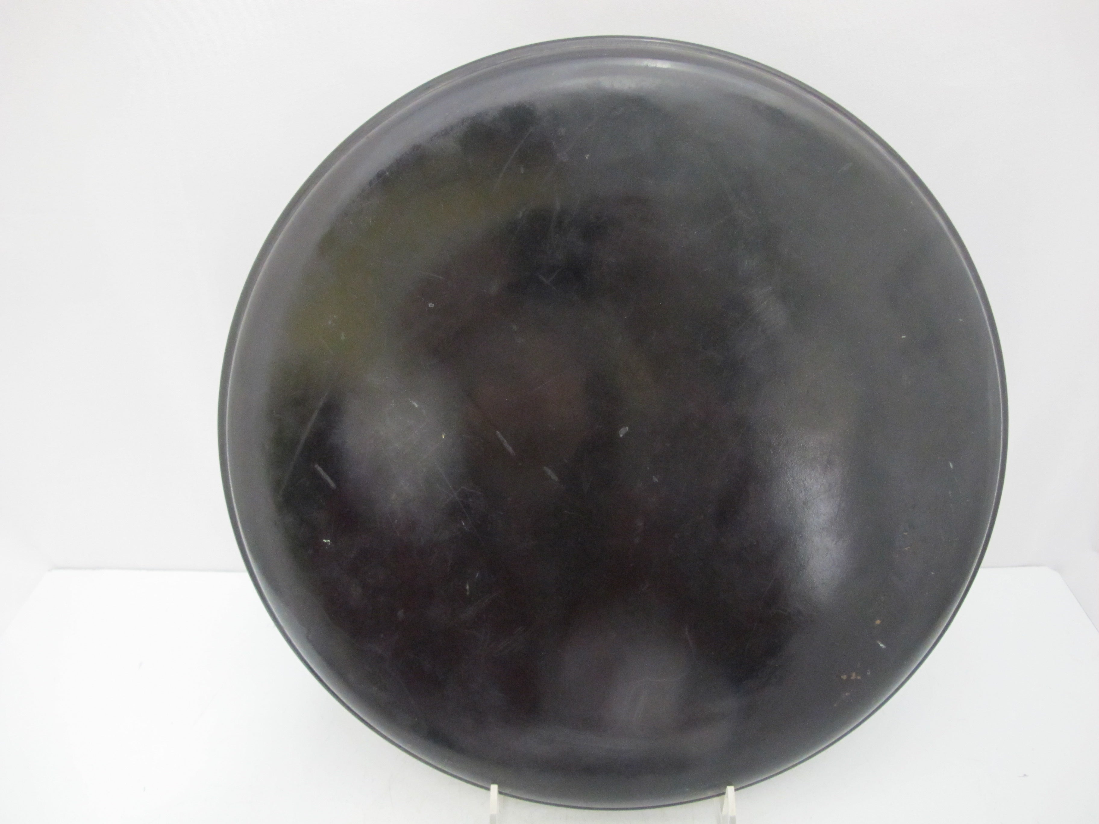 Antique, Meiji era (late 19th century to early 20th century) Japanese papier mache round laquer tray. Ornate hand painted detail in gold and red showing a scene of warriors looking up to the sky at an explosion. Measures 12" x 7/8" tall.