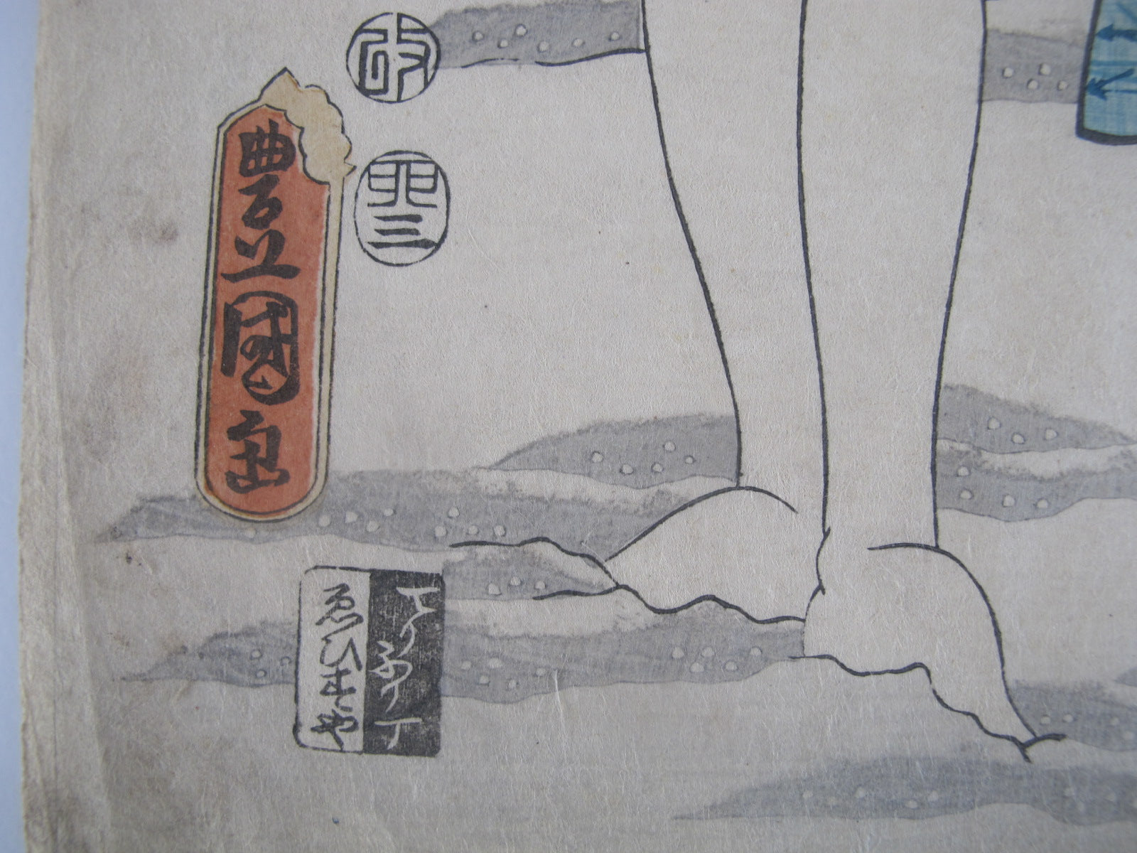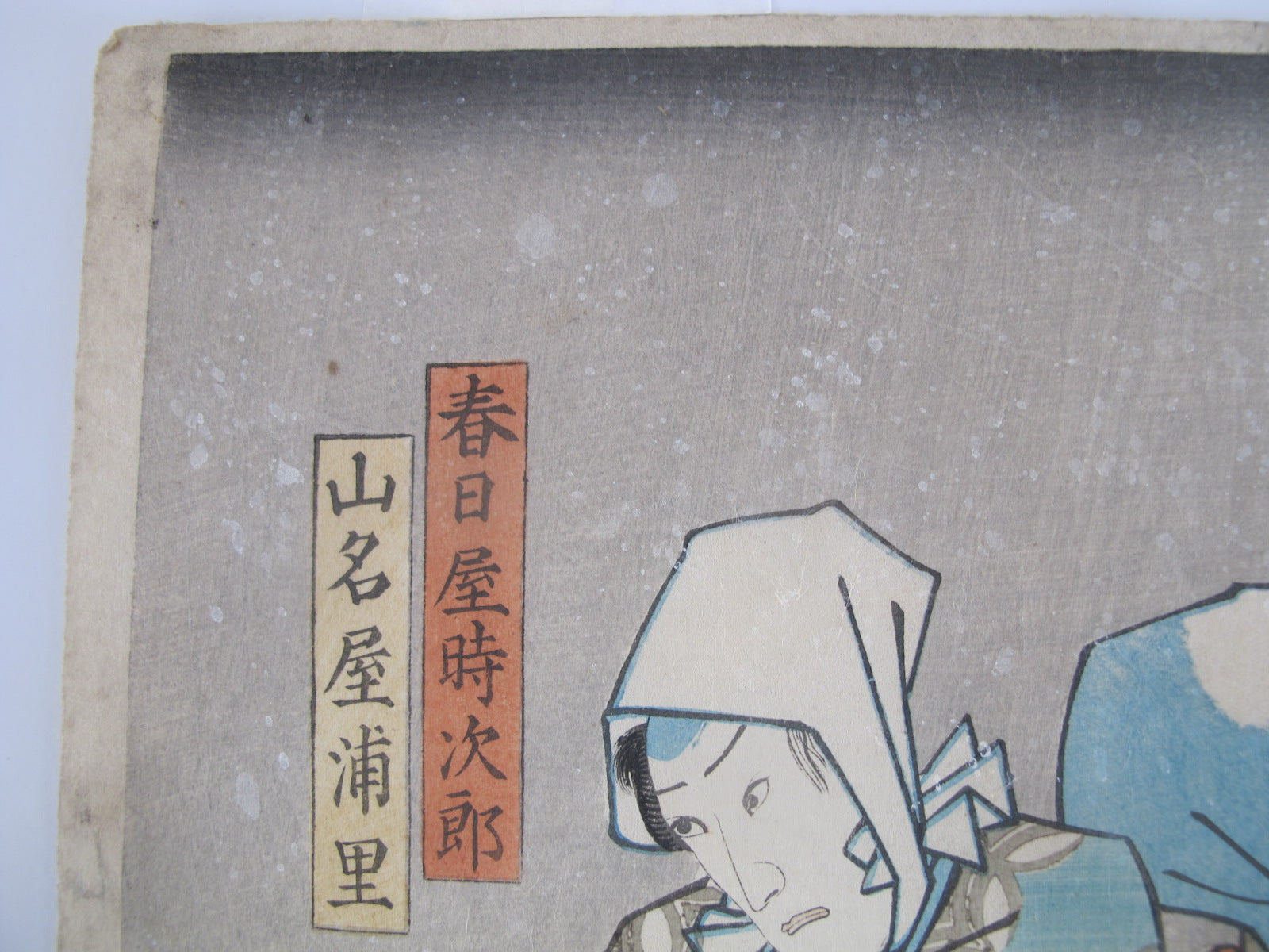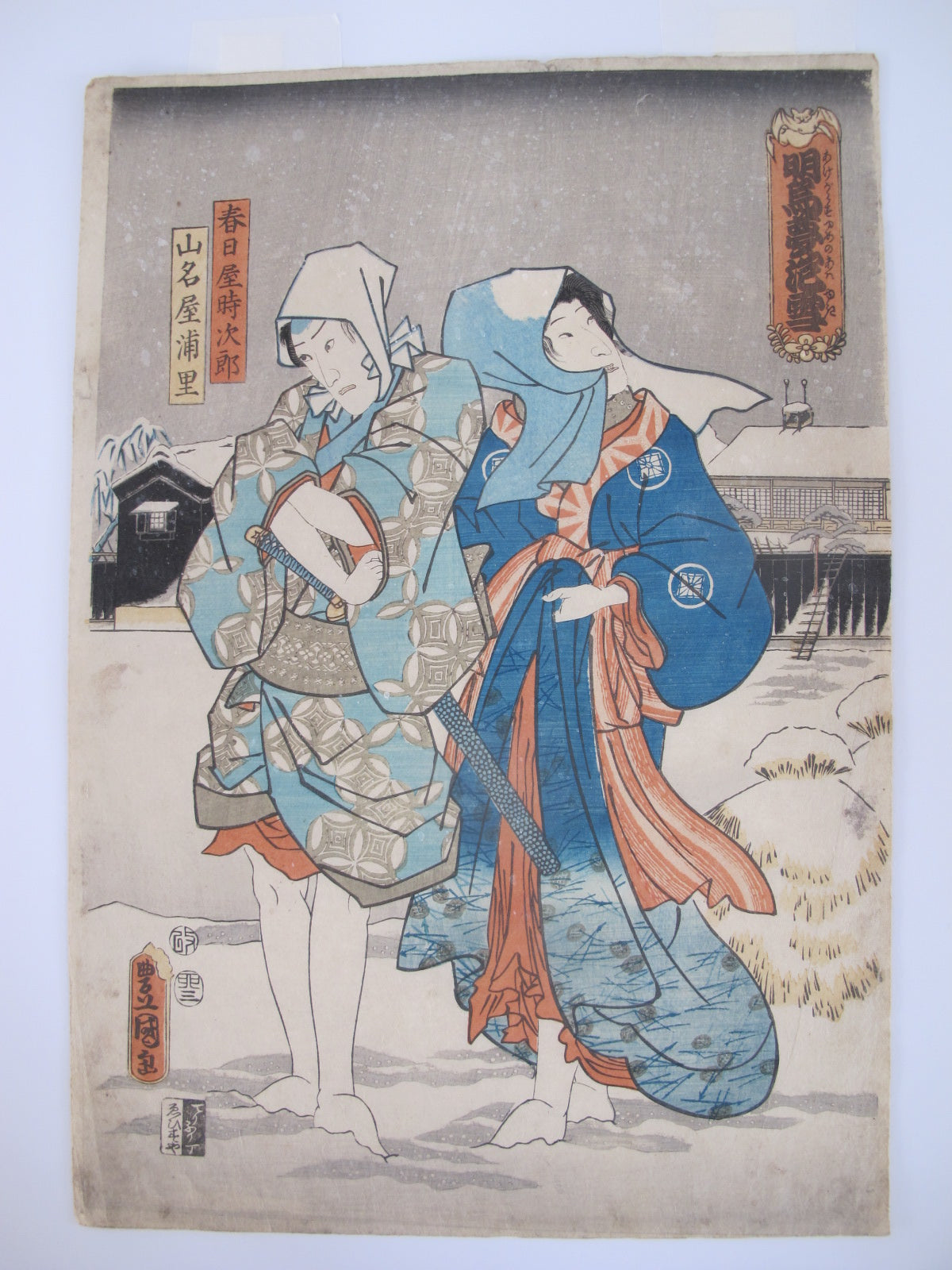 Utagawa Kunisada (Toyokuni III) antique woodblock print, Kasuga-ya Tokijiro and Yamana-ya Urazato, Two Lovers Fleeing the Snow. From the Kabuki play Urazato Tokijiro, The characters Kasuga-ya Tokijiro and Yamana-ya Urazato from the kabuki play known commonly as “Urazato Tokijiro”. The beautiful courtesan and her sweetheart Tokijiro are fleeing during a snowstorm.