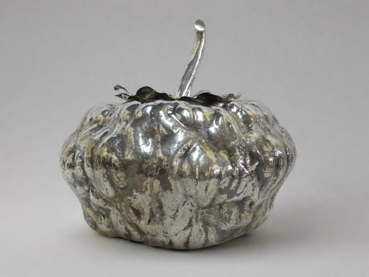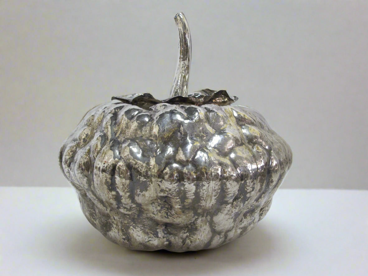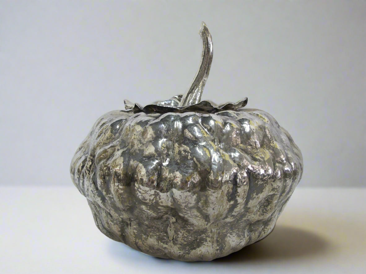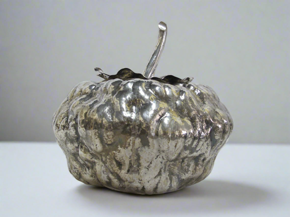 Monumental Gianmaria Buccellati pure sterling silver "Pumpkin" centerpiece box with lid. Very rare, hand made in silver. Pumpkin stalk lid opens to large container.