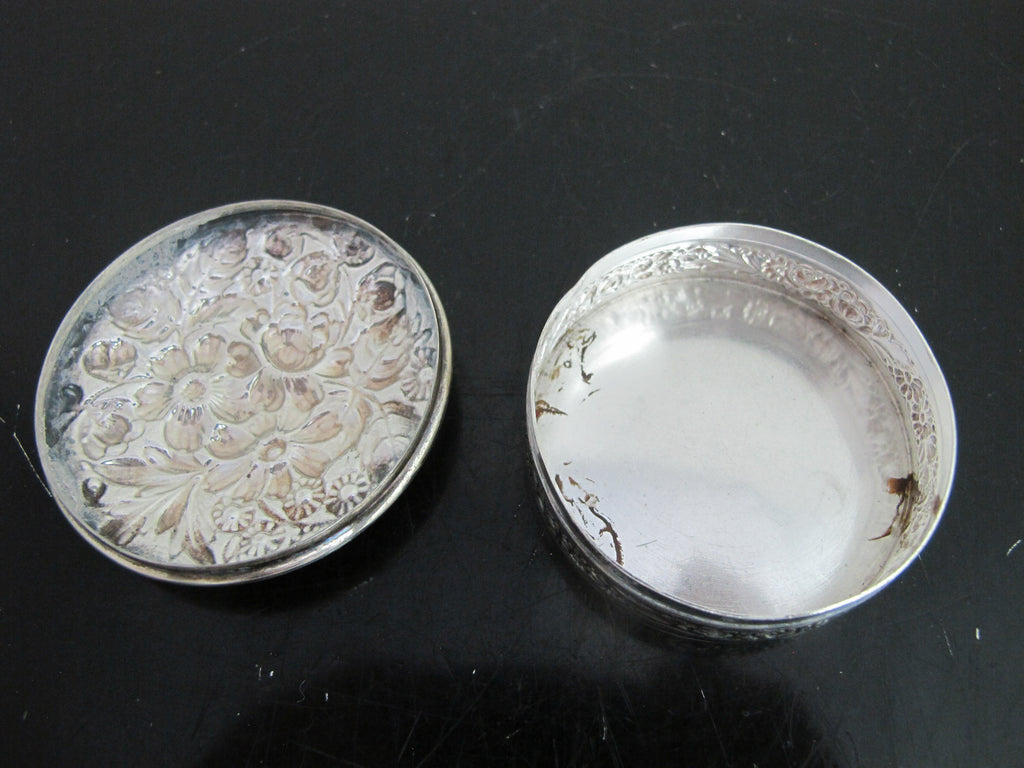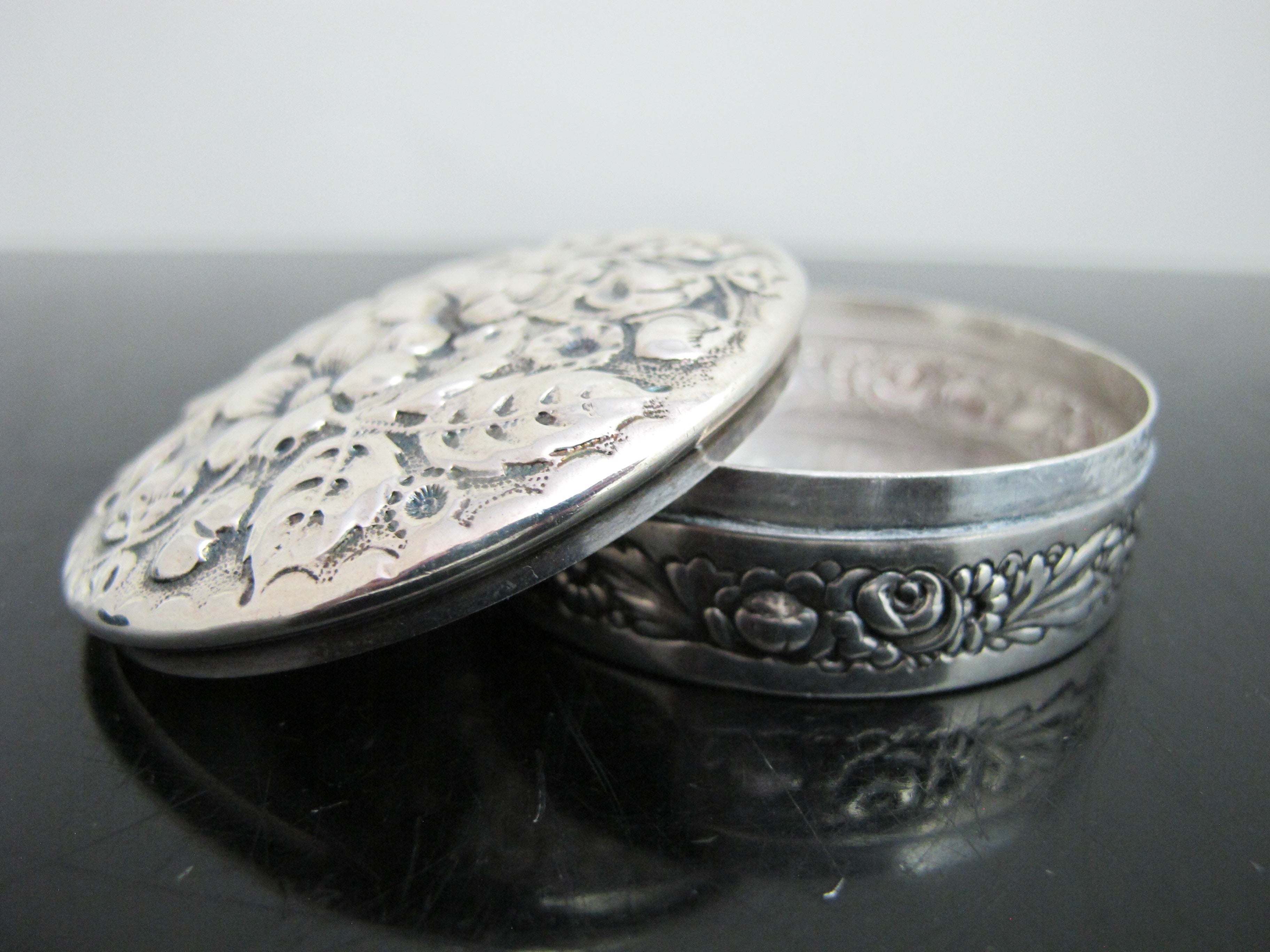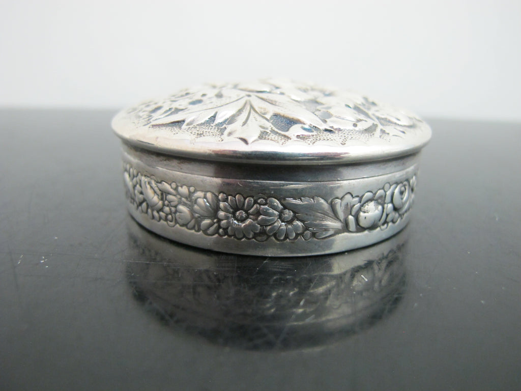 Antique Gorham sterling silver trinket or snuff box. Ornate Repousse floral design in round form with lid. Weighs 36.4 grams. Measures 2 1/4" x 1/2"tall. Excellent condition, hallmarks at base.