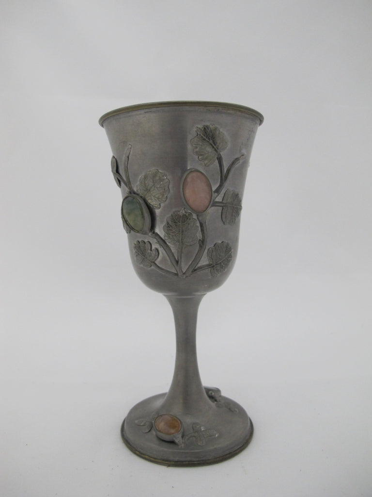 Antique CHINESE Pewter Wine Cup GOBLET with Raised CABOCHON Flowers & Leaves