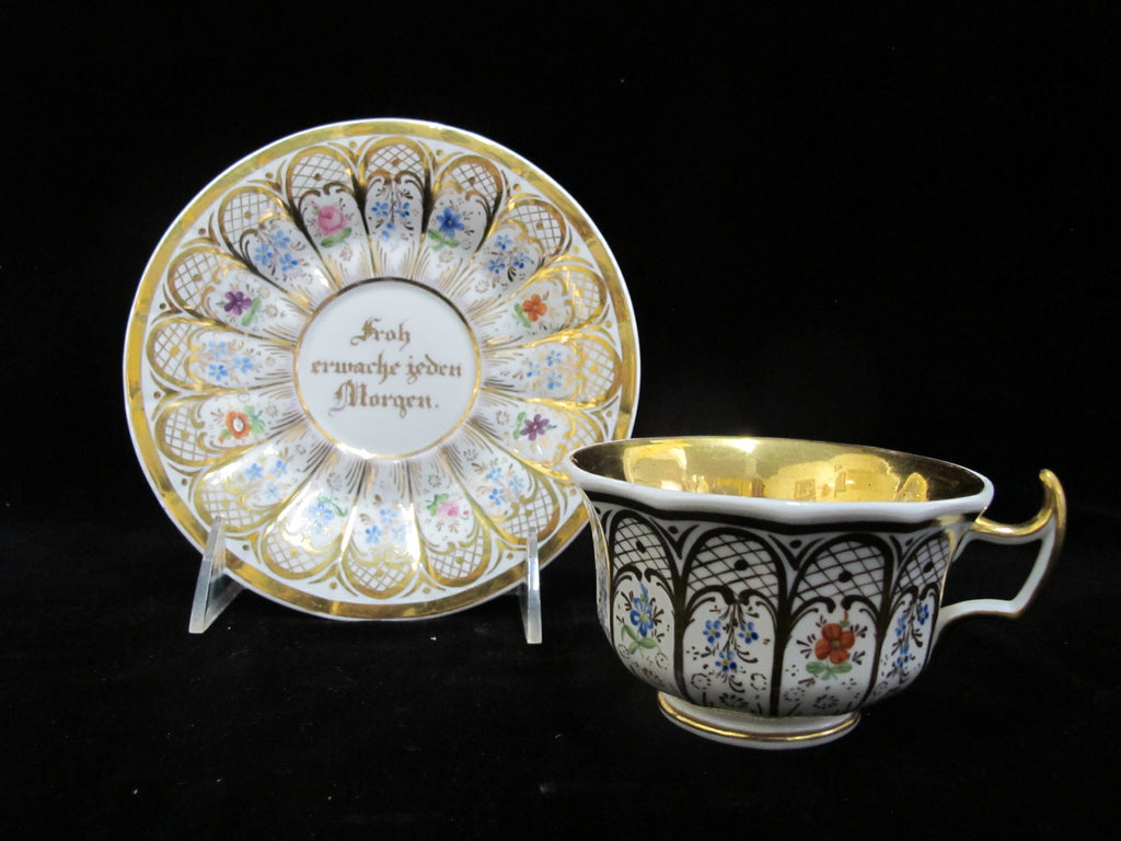 KPM Hand Painted FLOWER & Gilt WAKE UP HAPPY Every Morning Porcelain Cup & Saucer