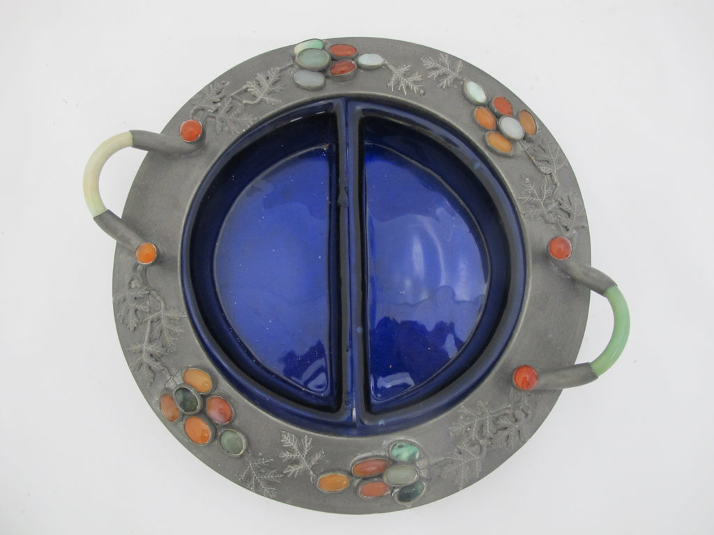 CHINESE Jade & Carnelian Inlaid Flowers PEWTER Bowl with Cobalt Glass Inserts