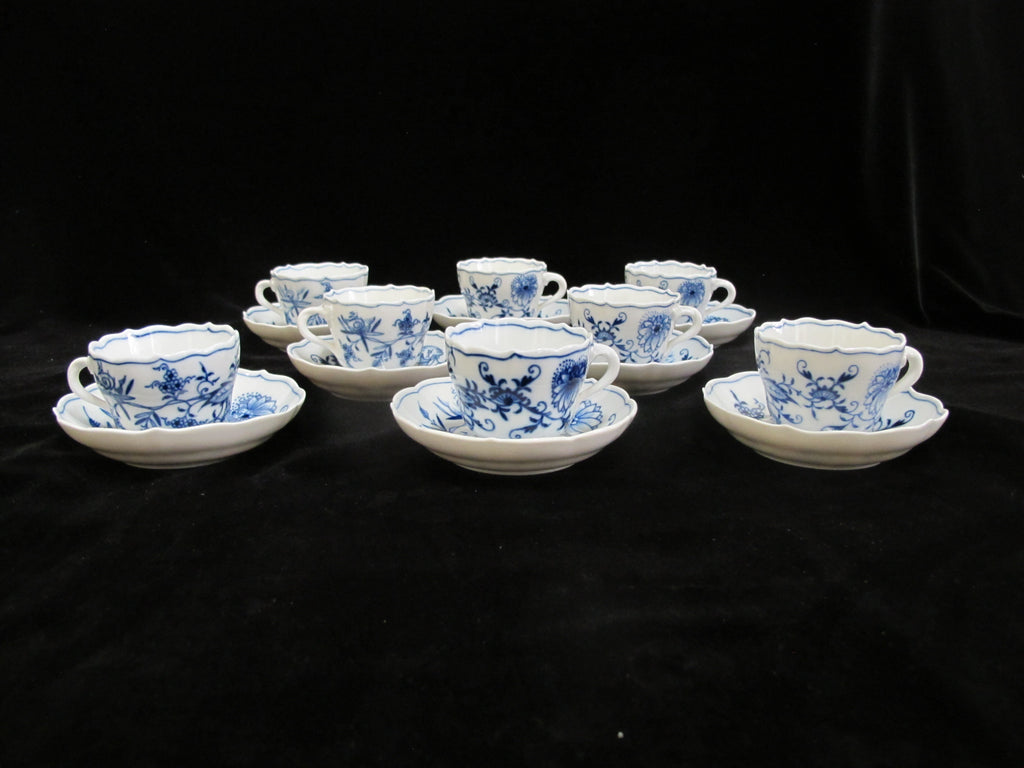 MEISSEN Blue Onion Porcelain Scallop Rim DEMITASSE Coffee Cup & Saucer Set of 8