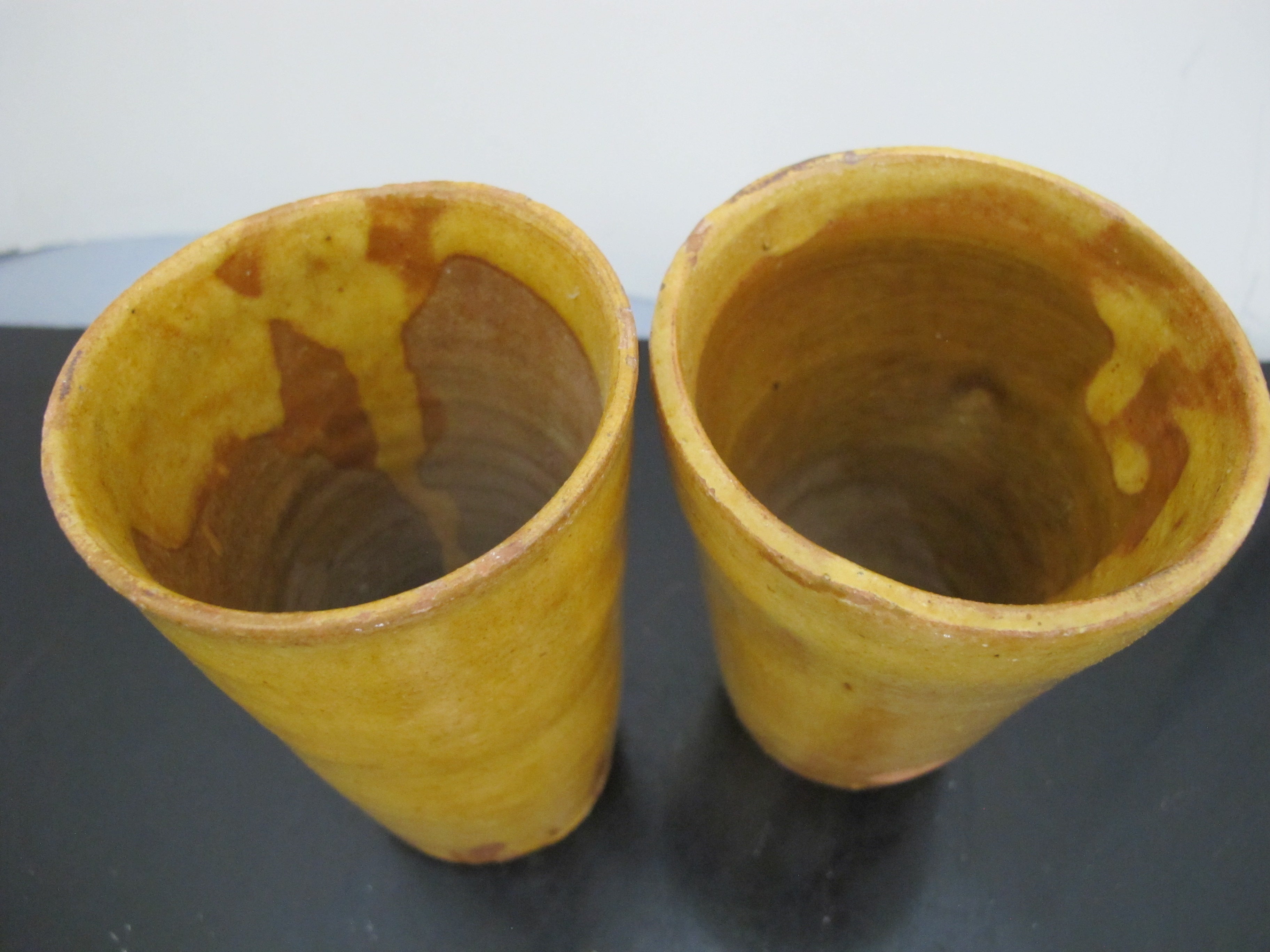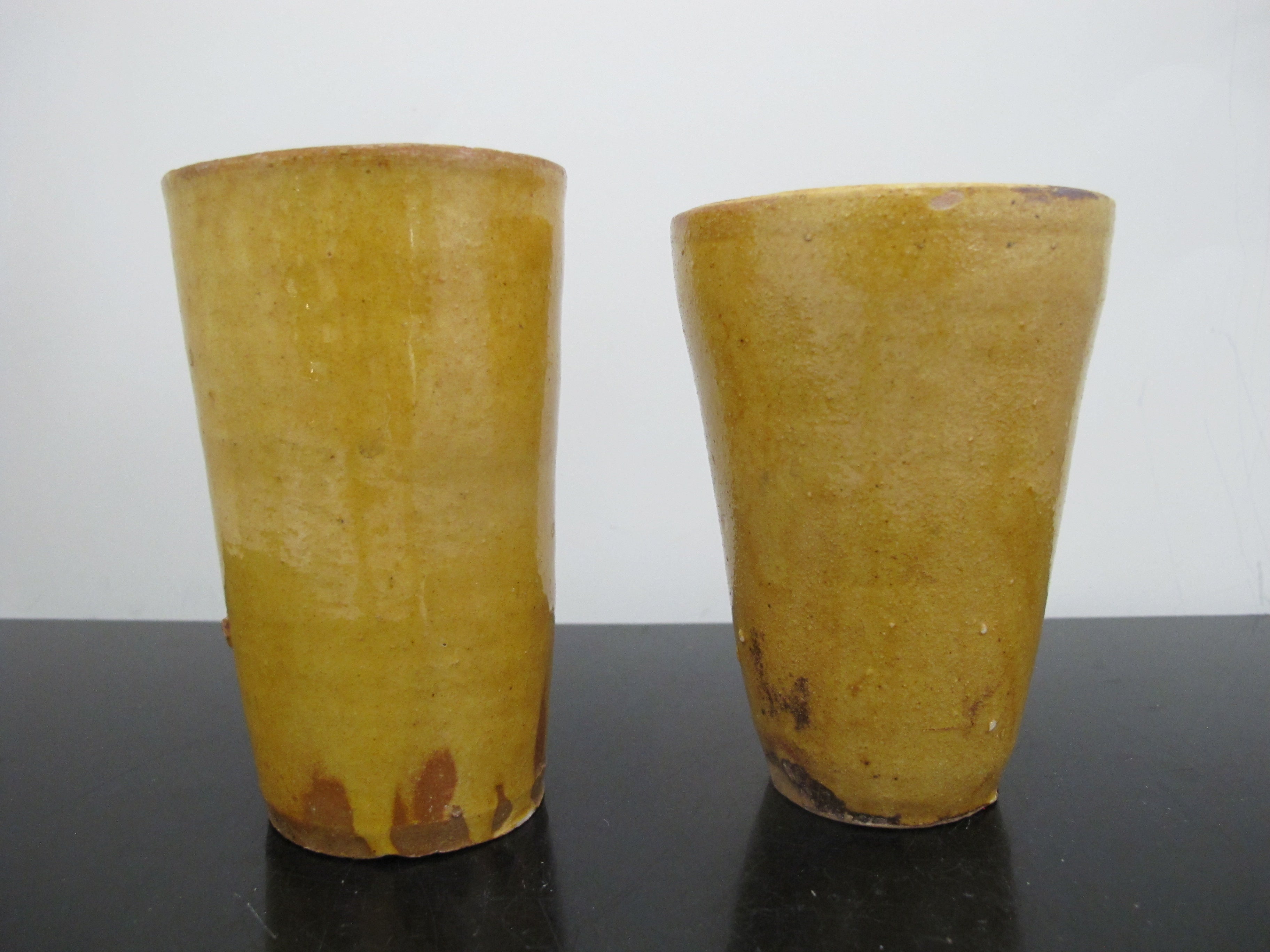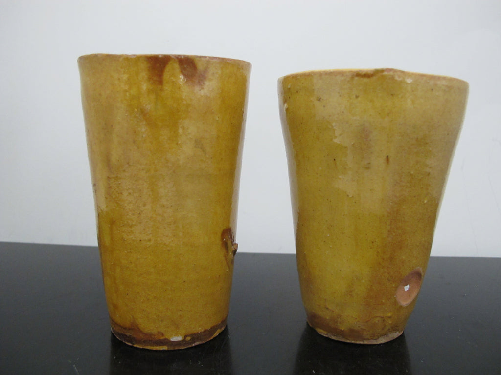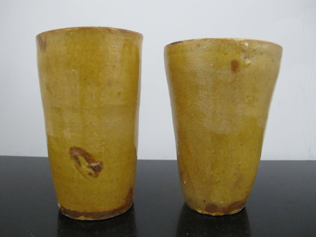 Antique 19th Century FRENCH Glazed Yellow Earthenware Pottery Cylinder CUP Pair