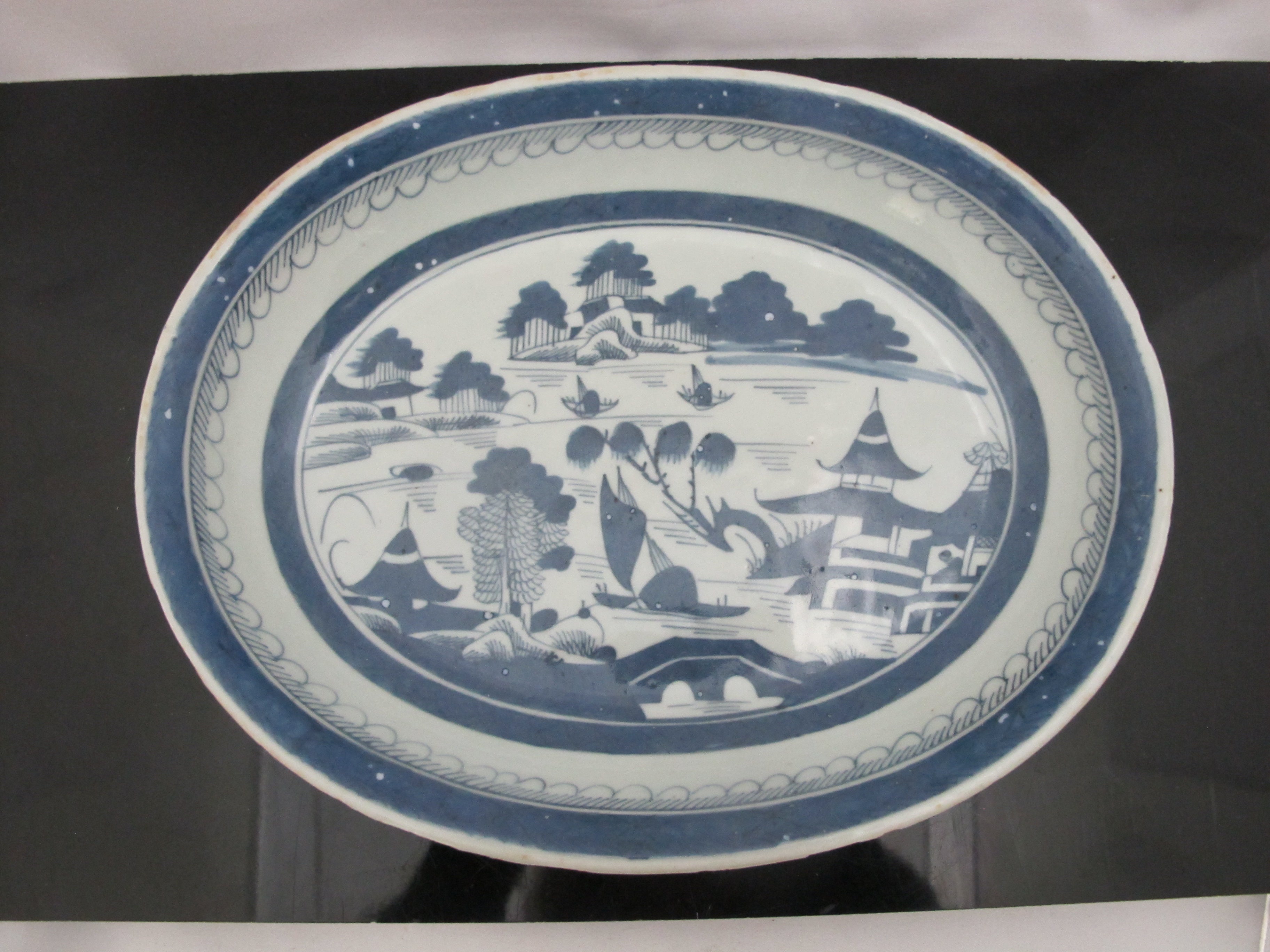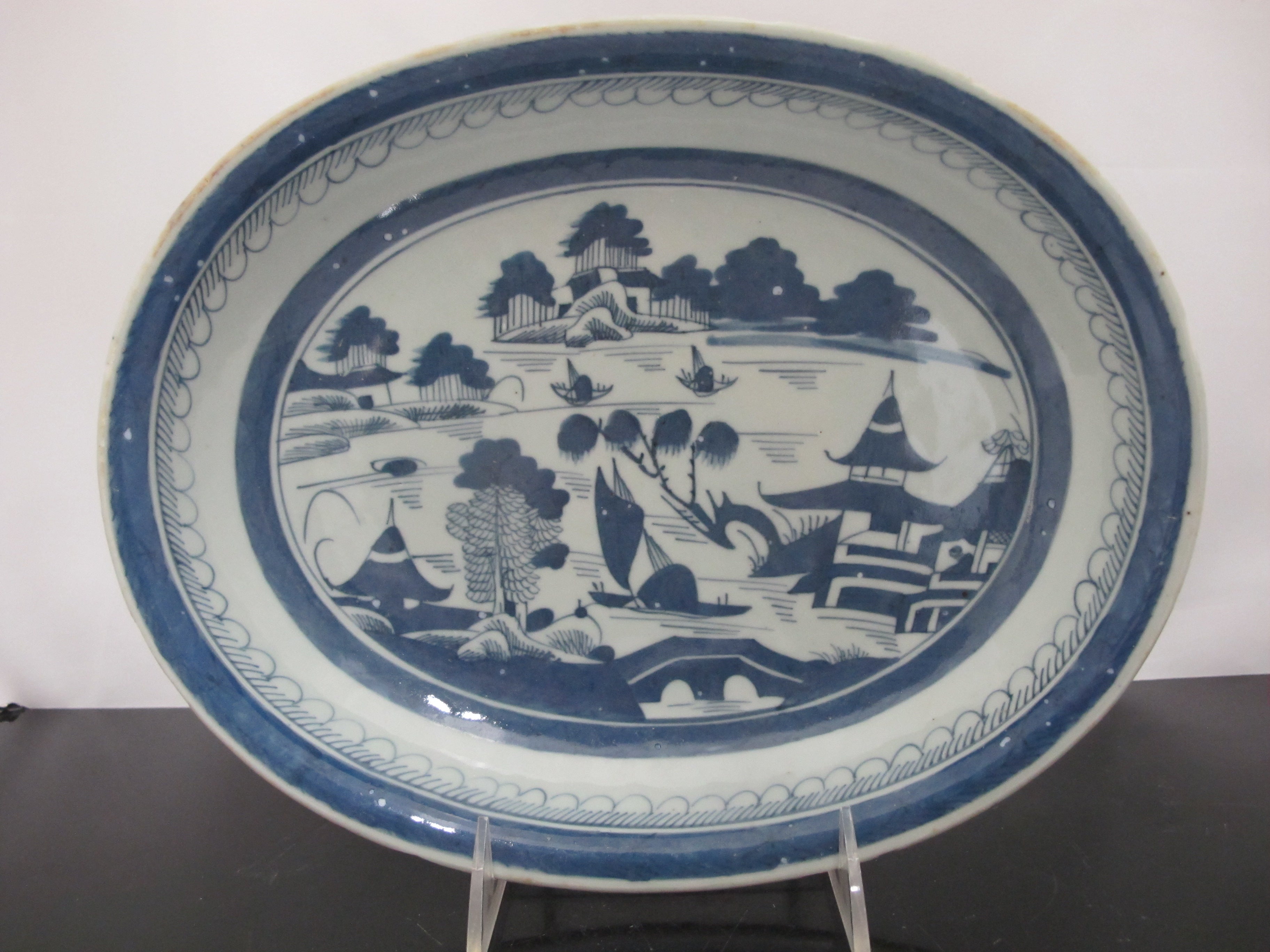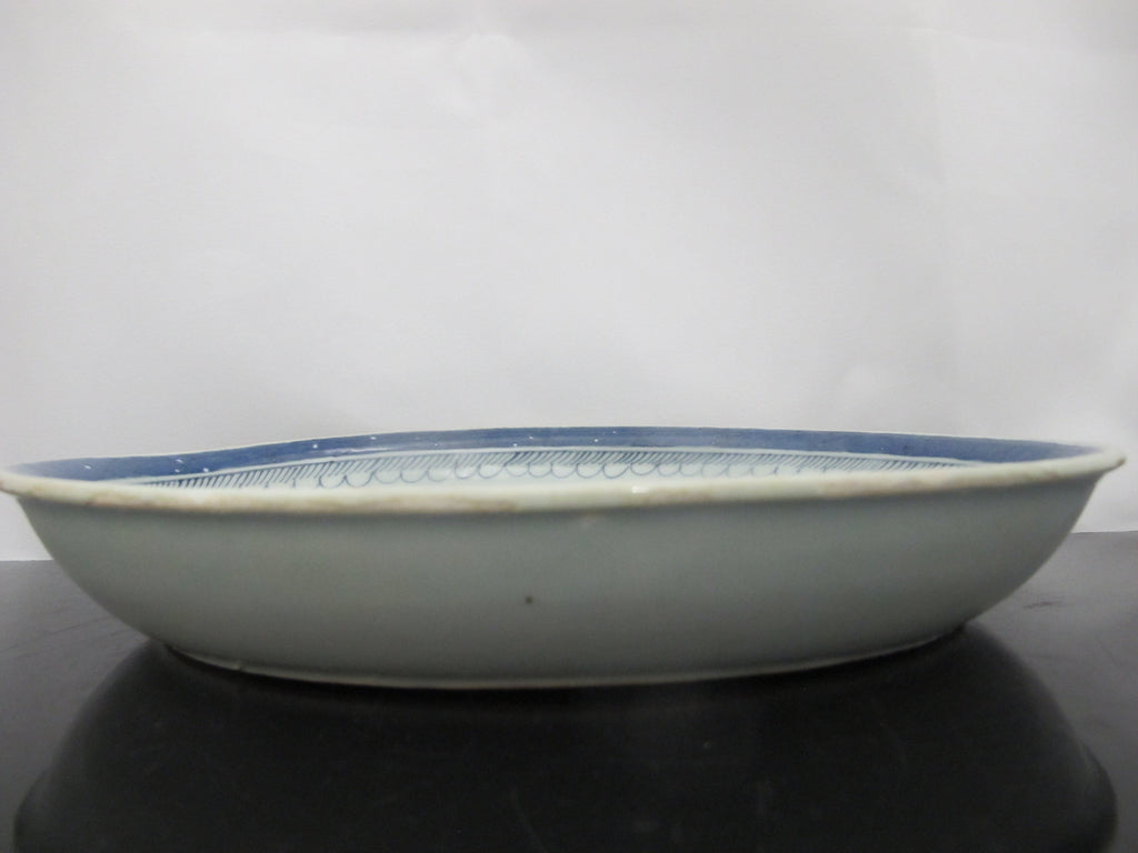 Chinese Export Canton blue serving bowl. Oval bowl showing a pavilion landscape scene in blue and white under glaze. Measures 11 1/2" x 8 3/4" x 1 3/4" tall.