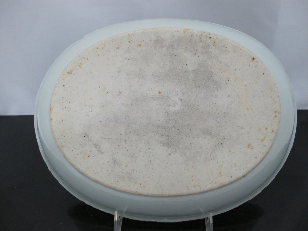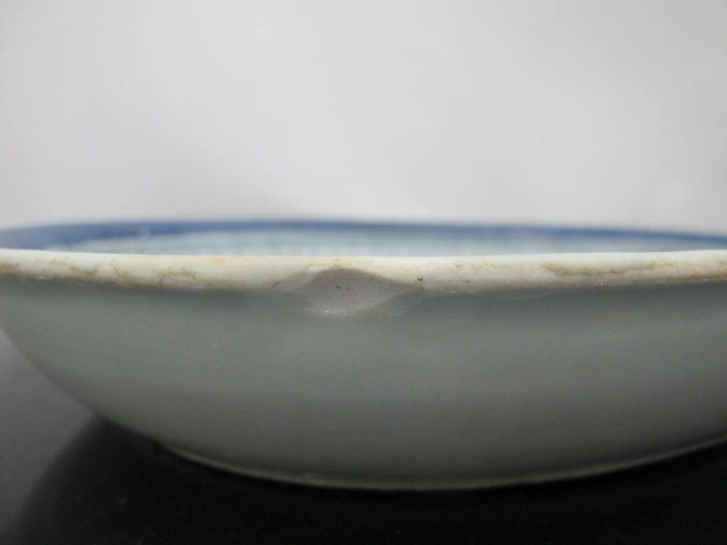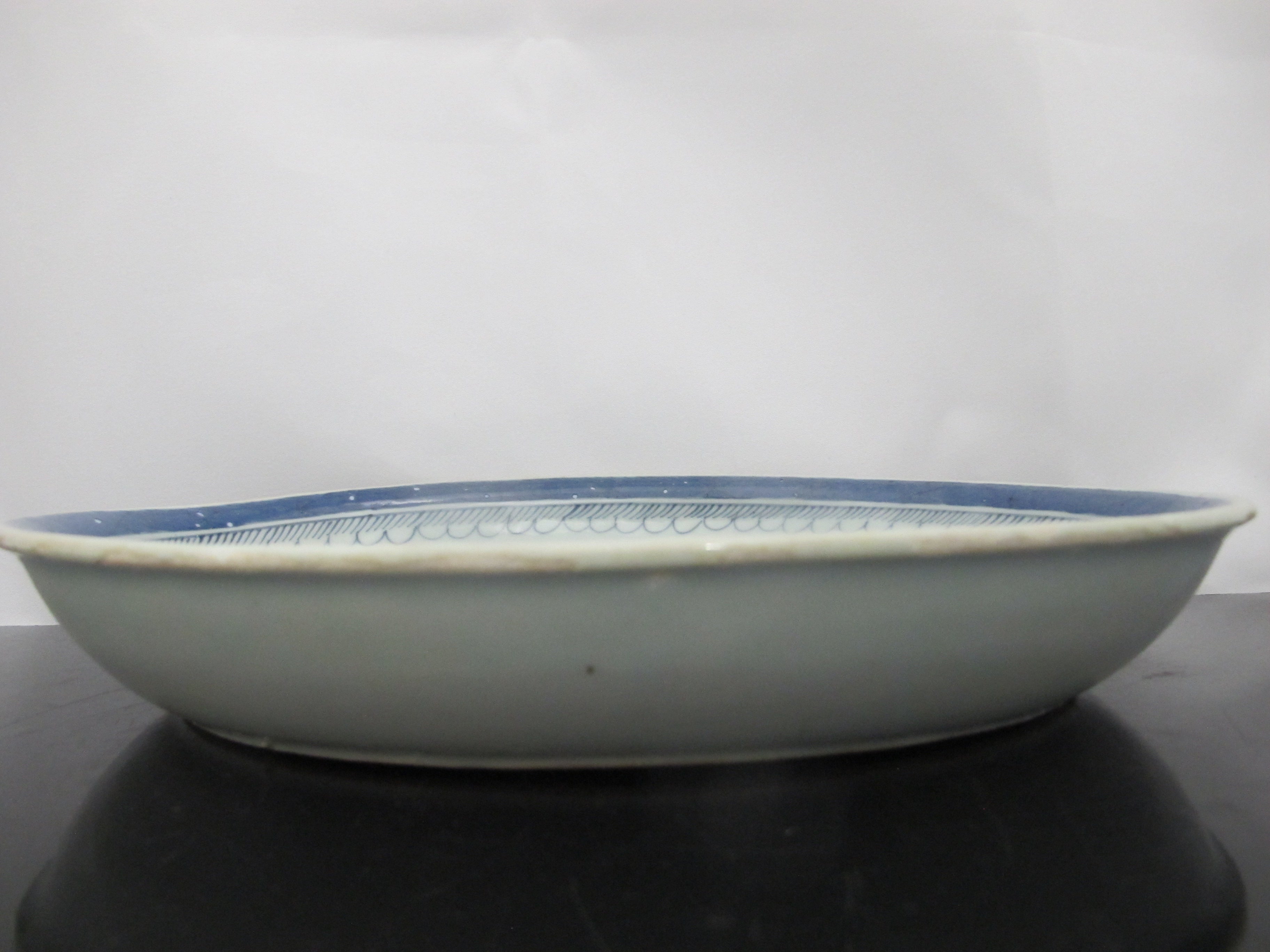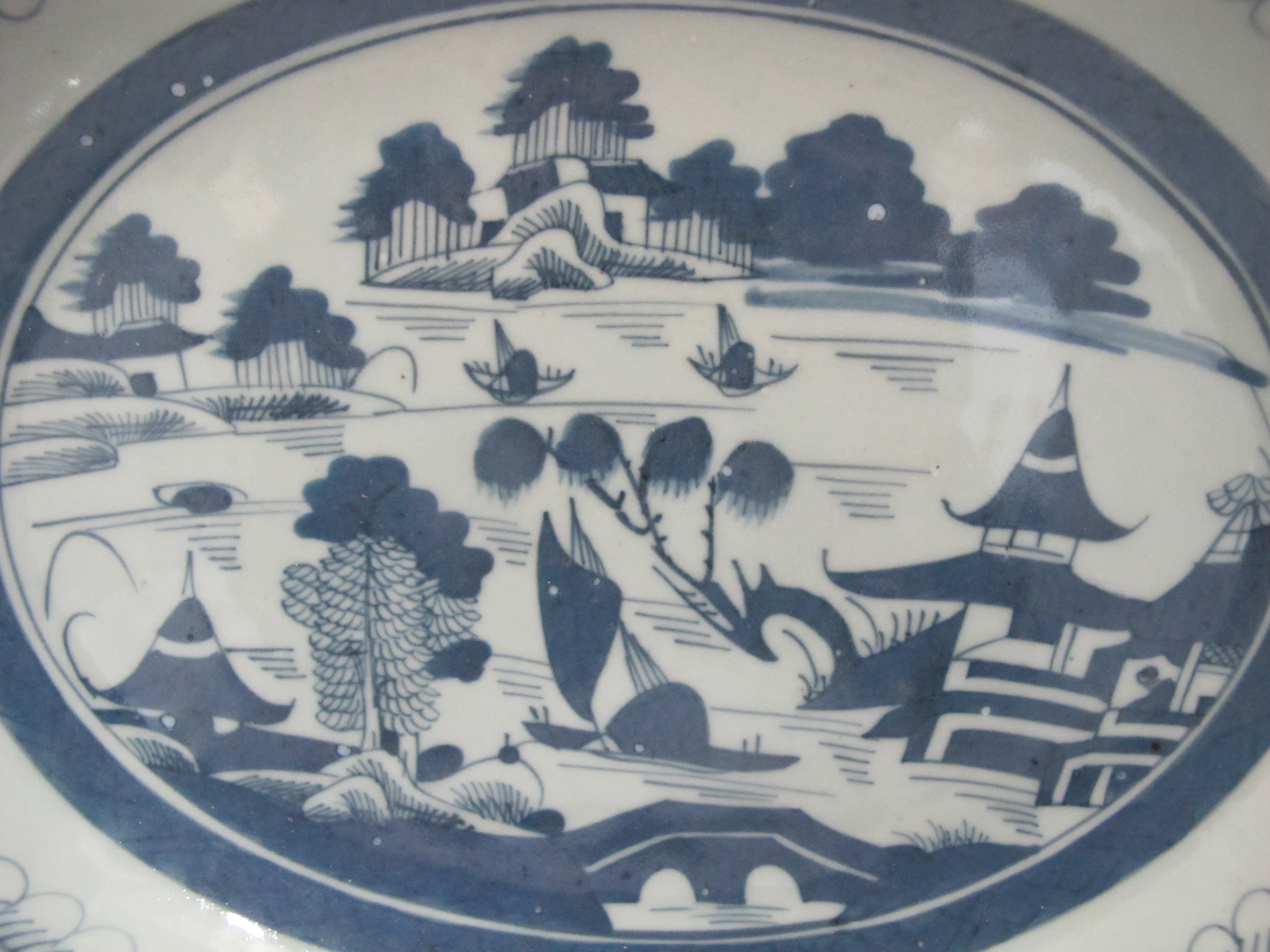 Chinese Export Canton blue serving bowl. Oval bowl showing a pavilion landscape scene in blue and white under glaze. Measures 11 1/2" x 8 3/4" x 1 3/4" tall.