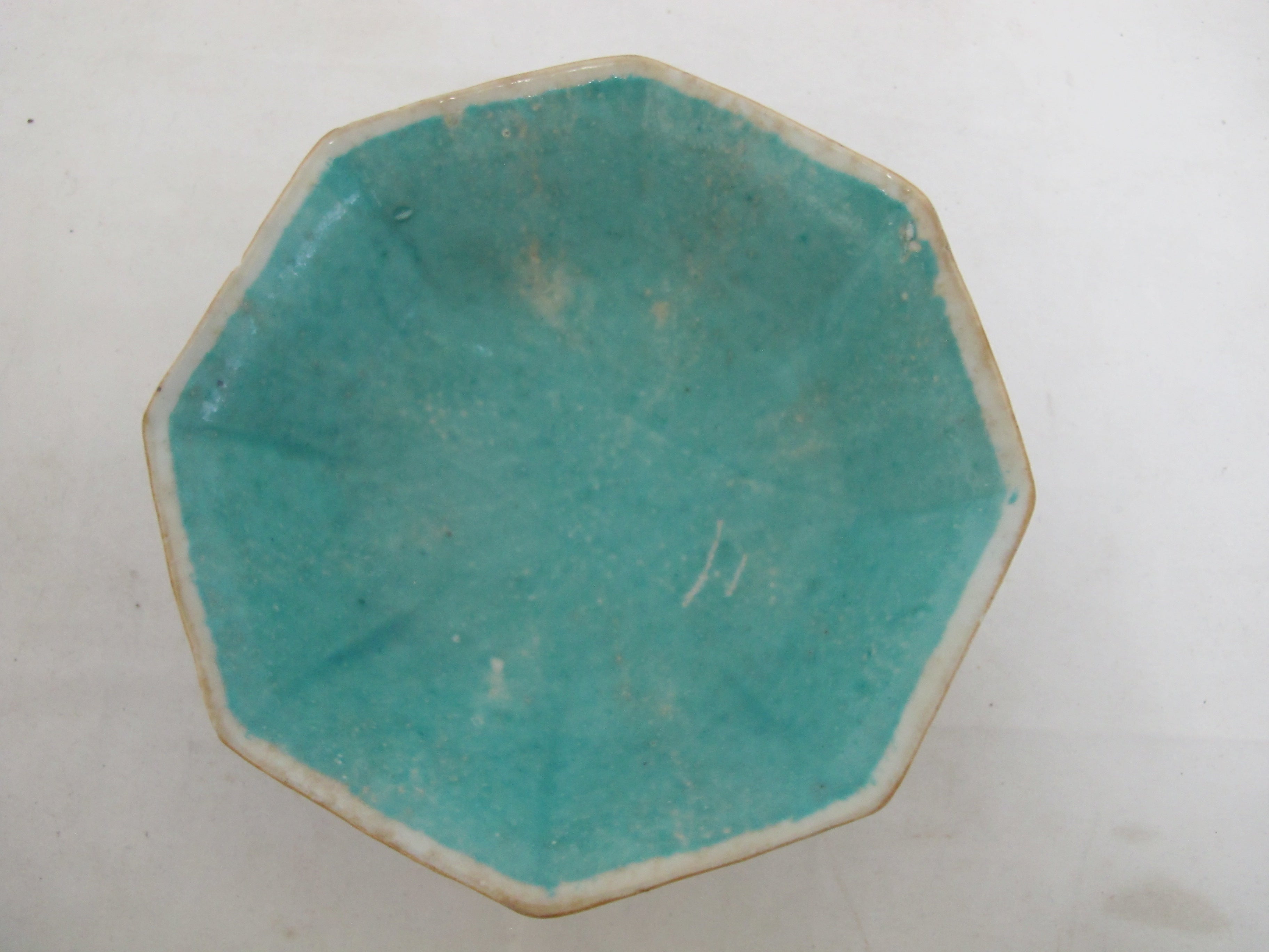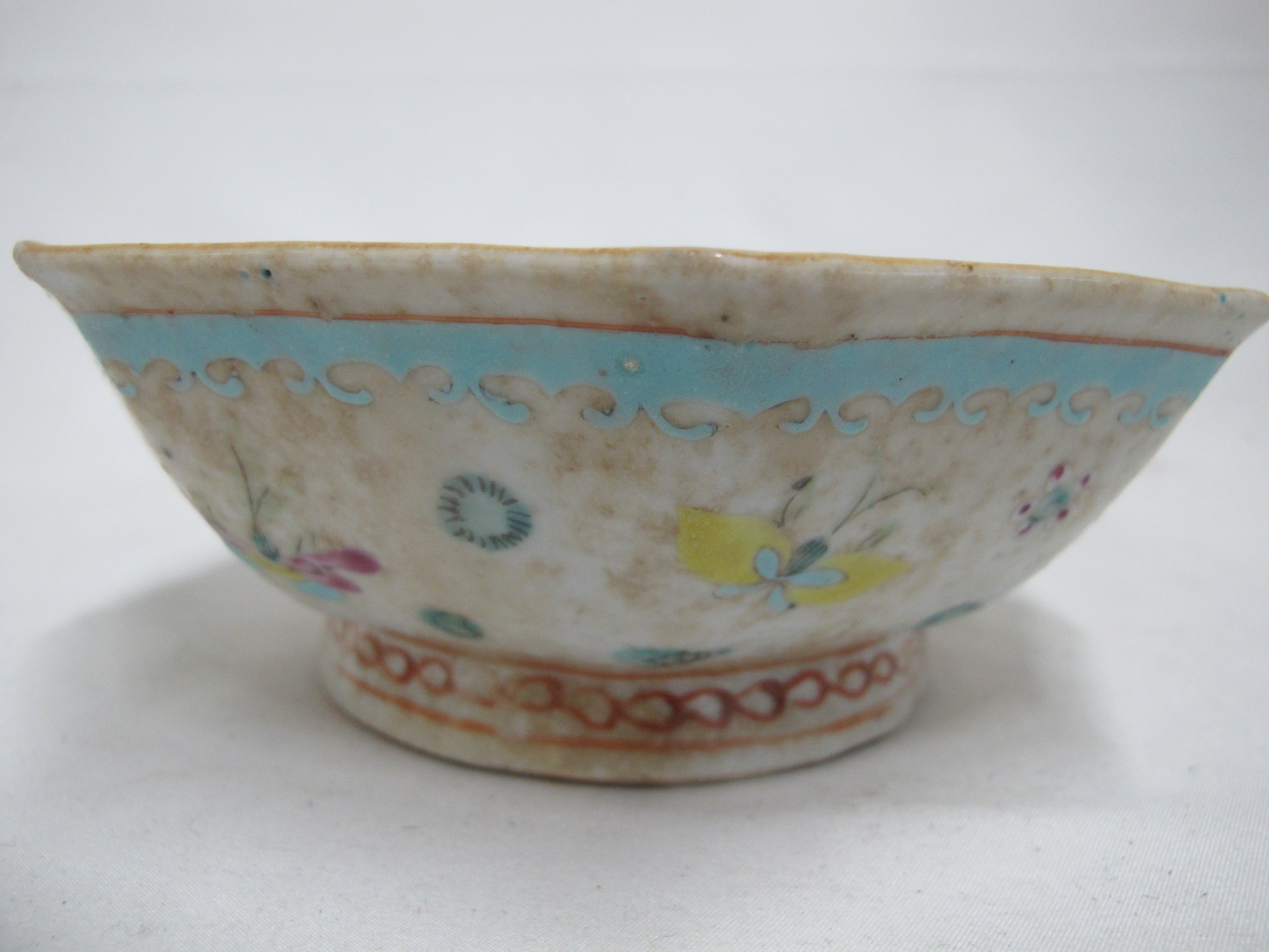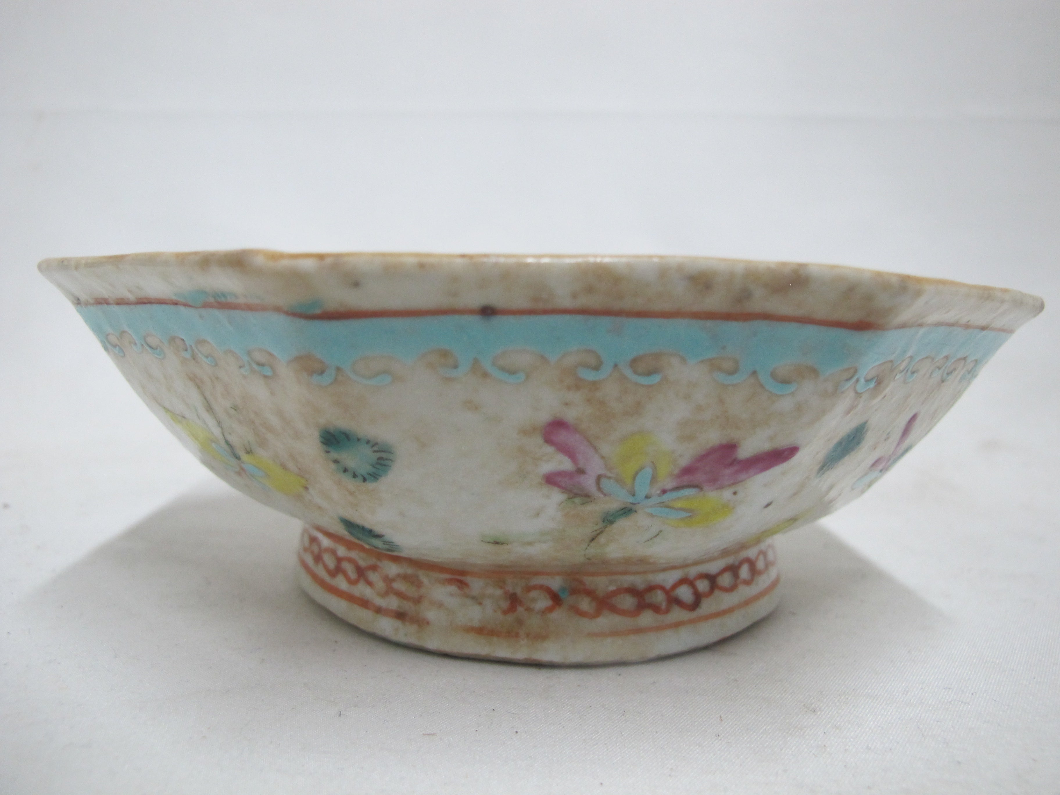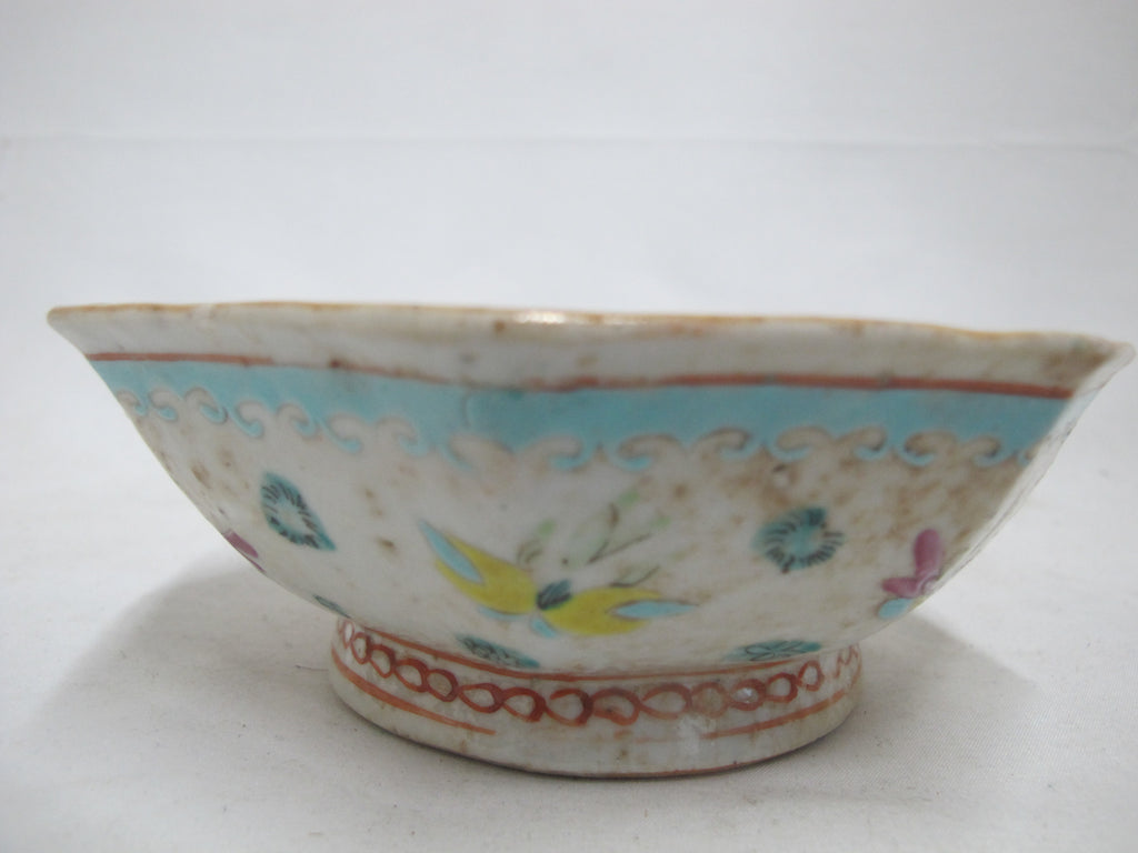Precious antique Chinese Nonya or Nyona porcelain rice bowl with octagonal rim. White backdrop showing a whimsical butterfly and geometric design. Inner bowl is a bright turquoise blue. Measures 6 1/4" wide x 2 1/4" tall. Excellent condition, showing typical wear for old age. Obvious wear and aging to glaze, no major chips, cracks, or repairs. Stamp at base.