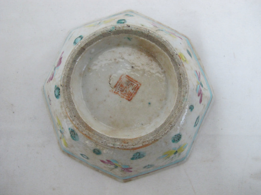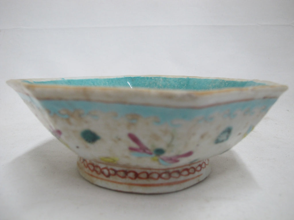 Chinese NYONYA Ware Famille Rose BUTTERFLY Motif Turquoise Center Octagonal Bowl