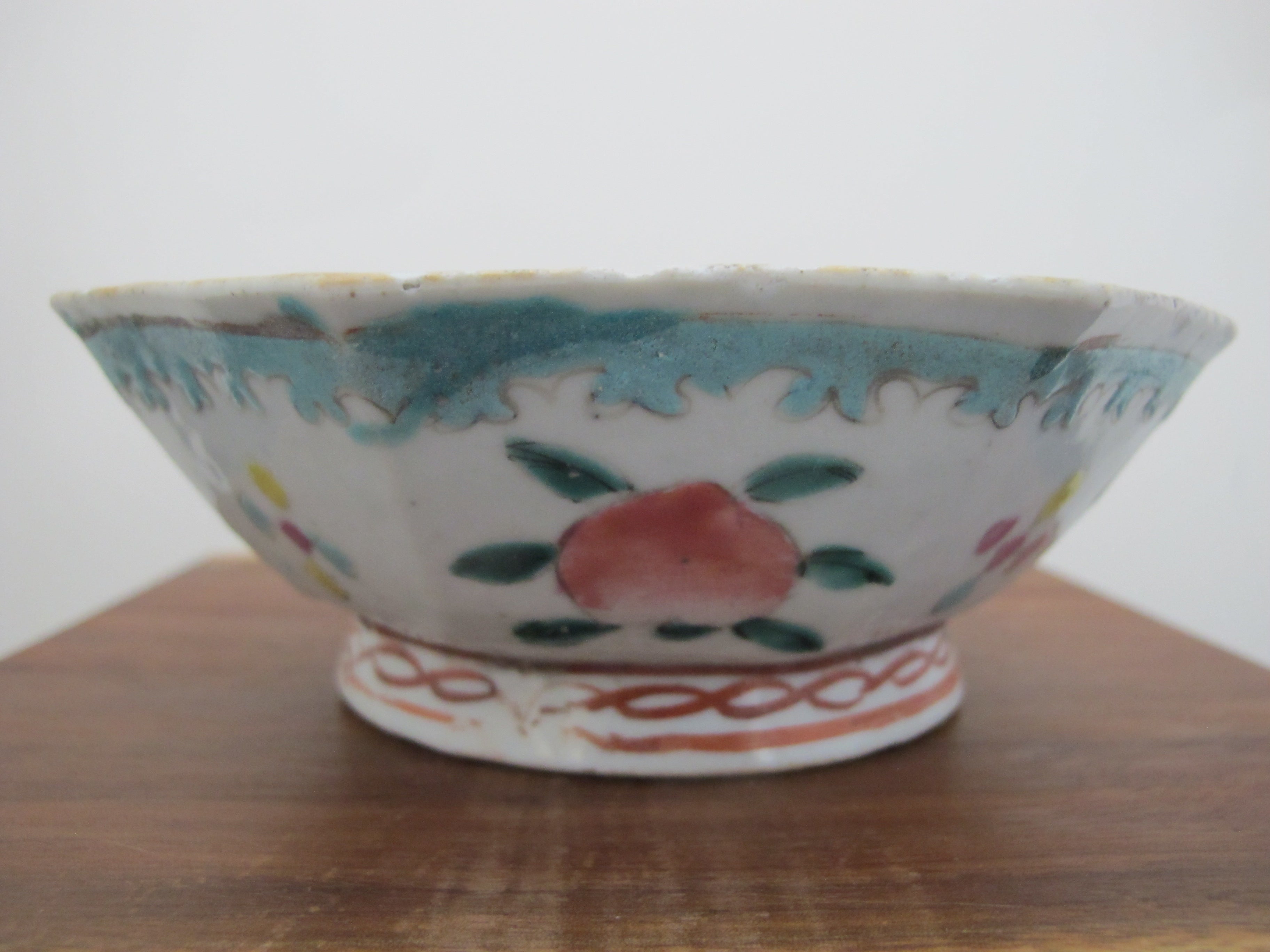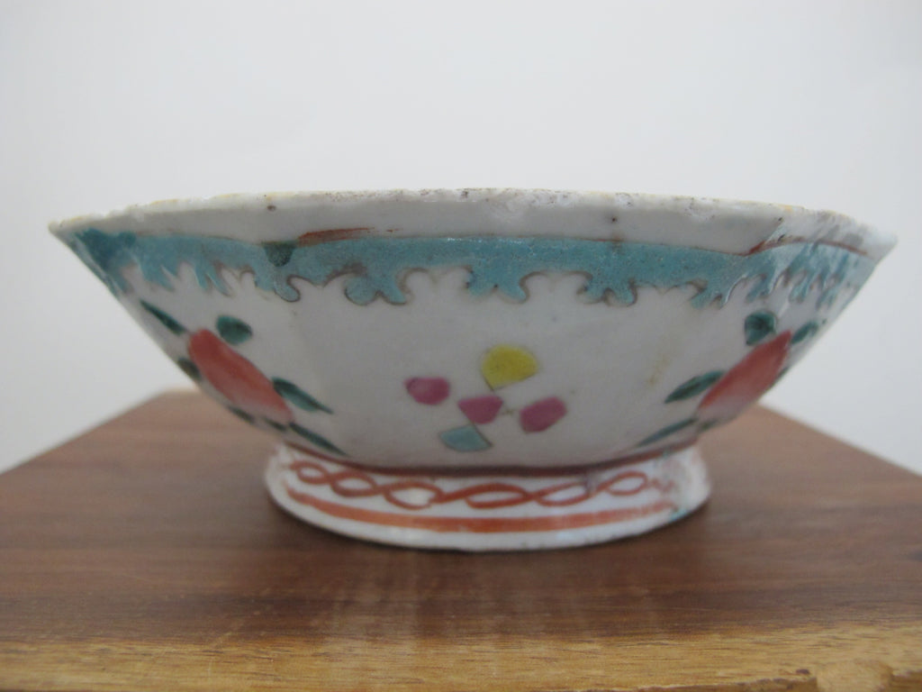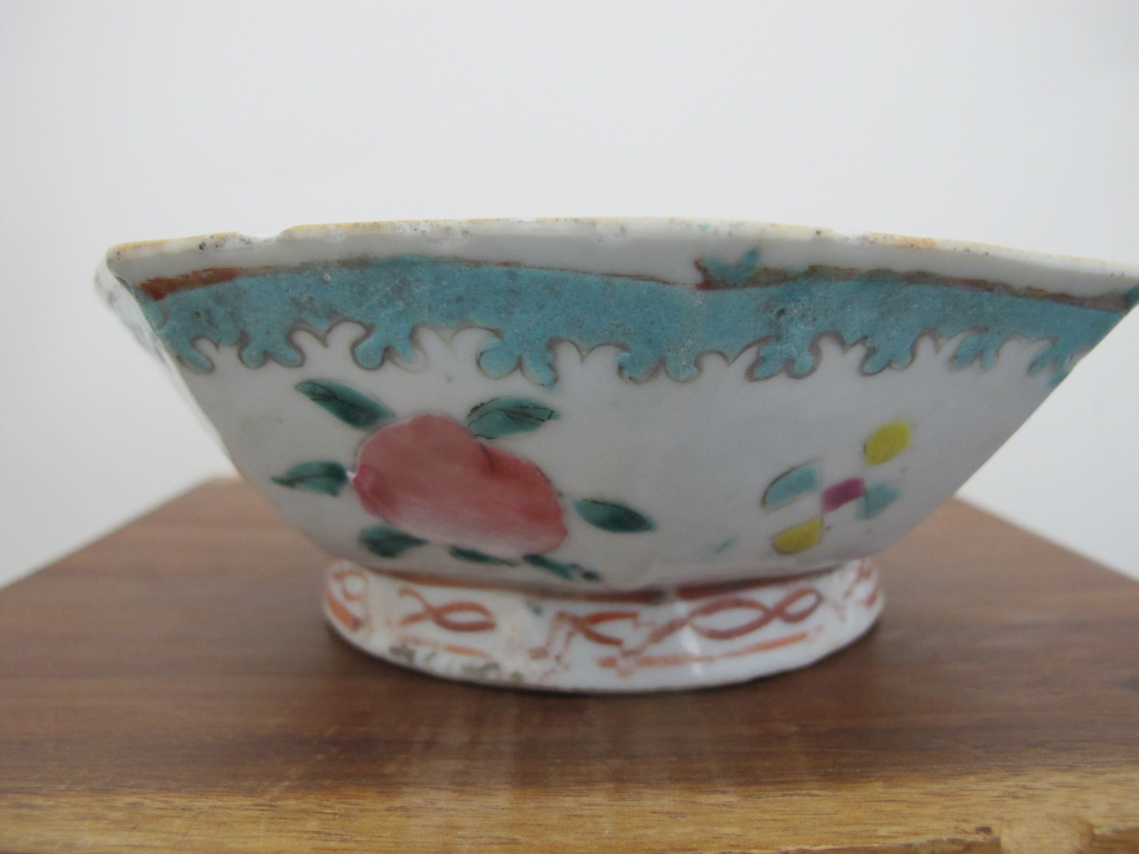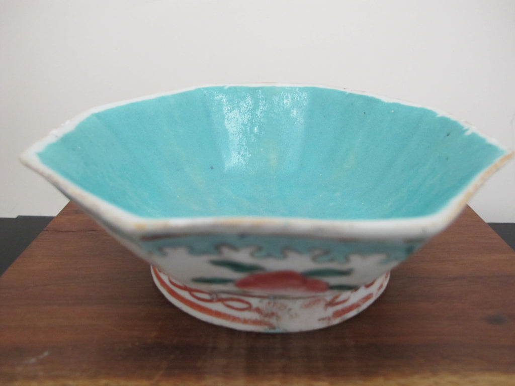 Precious antique Chinese Nonya or Nyona porcelain rice bowl with octagonal rim. White backdrop showing a whimsical peach and geometric design. Inner bowl is a bright turquoise blue. Measures 6" wide x 2" tall. Excellent condition, showing typical wear for old age. Light wear to glaze and fleabite chips at rim, no major chips, cracks, or repairs. Stamp mark inner bowl and at base.