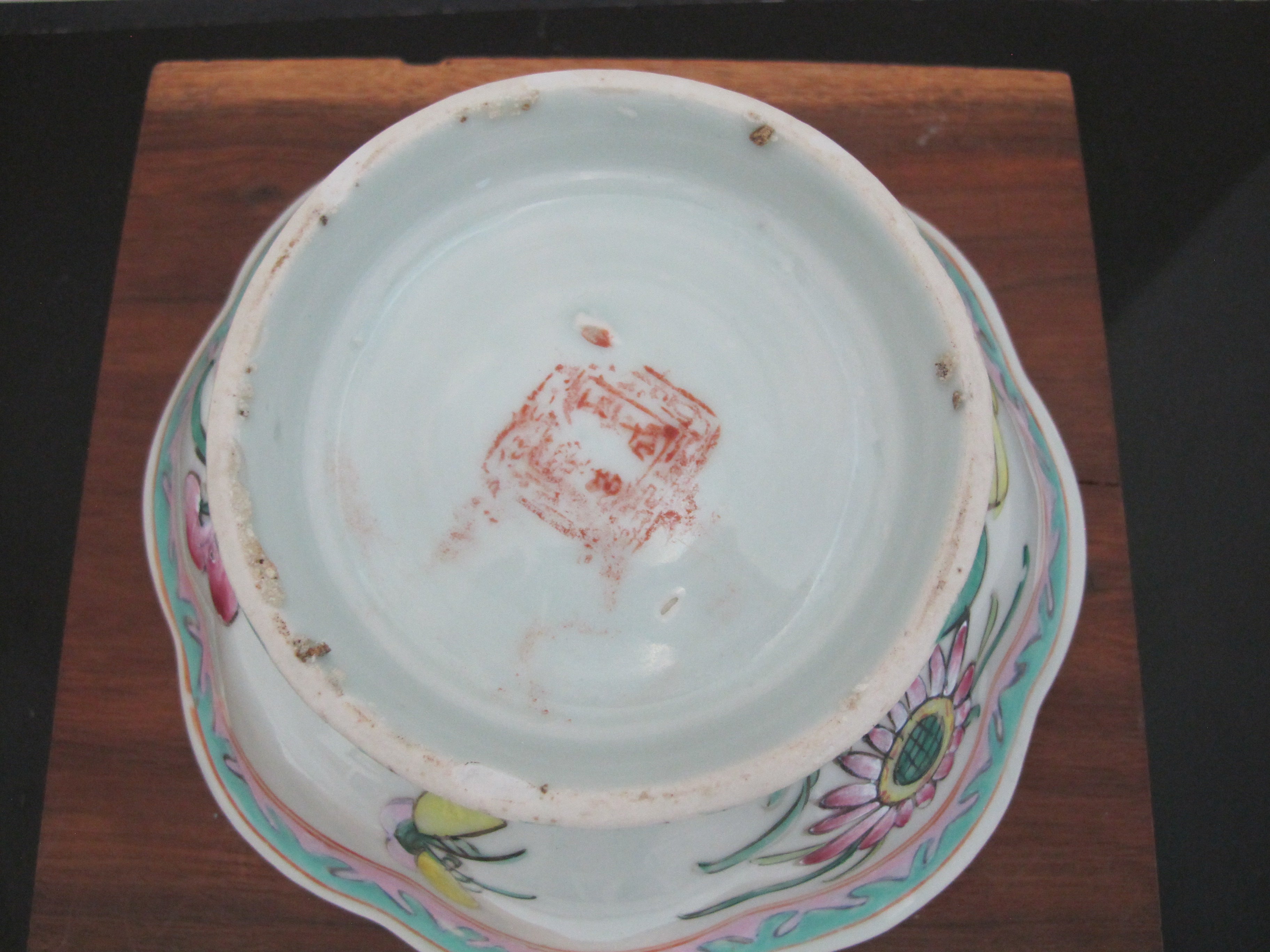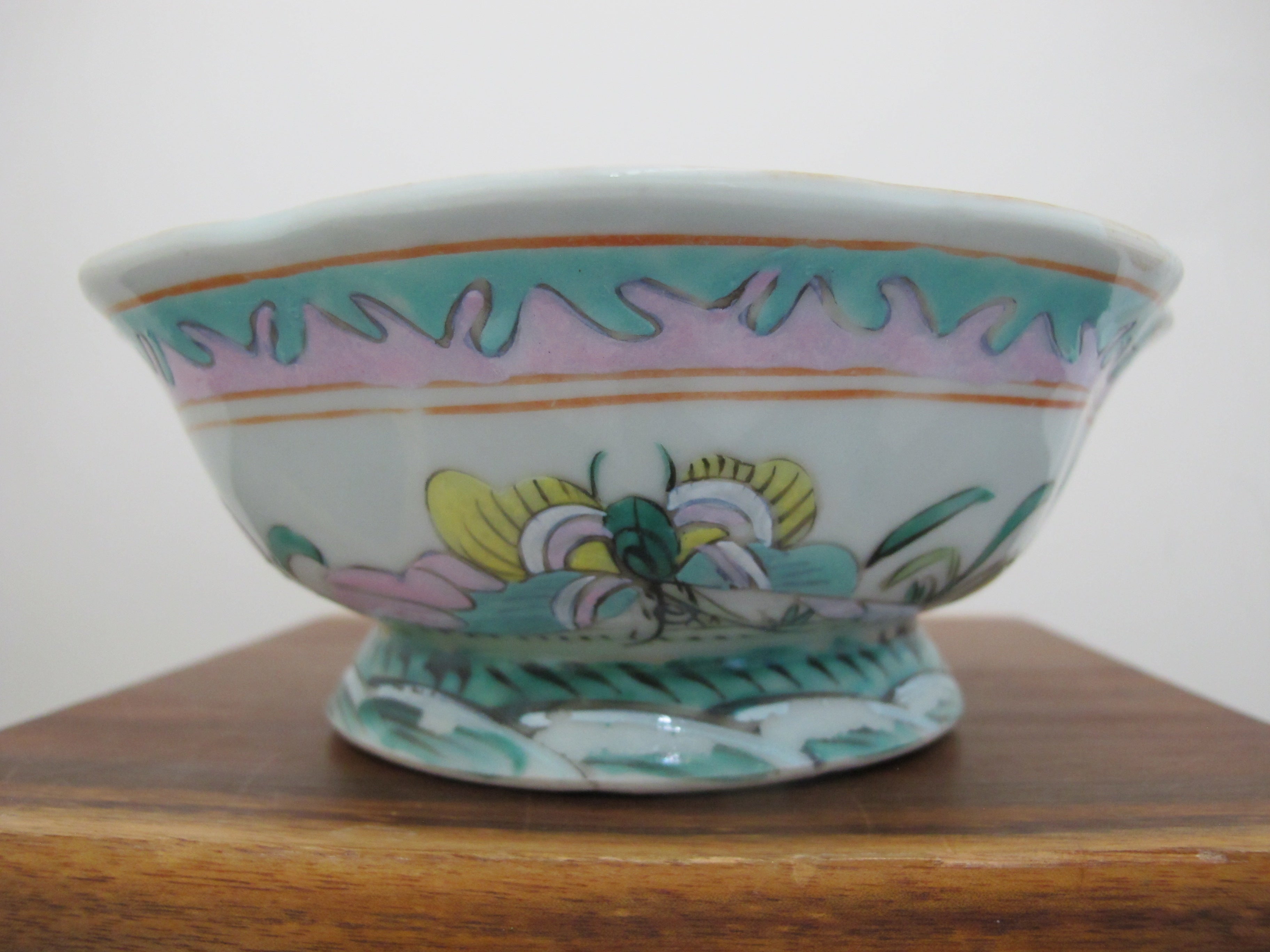 Chinese Famille Rose Nonya or Nyonya ware bowls are also known as "treasure bowls". This type of porcelain is characterized by it's pale or soft colors, often including pink. Nyonya ware specifically refers to the porcelain produced for the Peranakan Chinese communities in Southeast Asia, particularly Malaysia, Singapore, and Indonesia. These bowls often feature bright colors and floral motifs, as seen here and were used for special occasions and family meals.