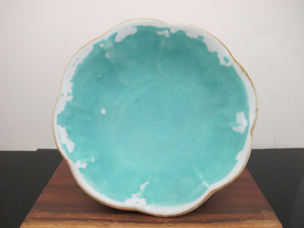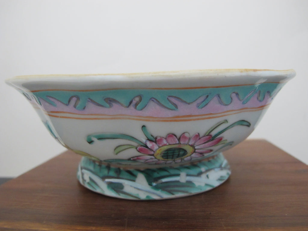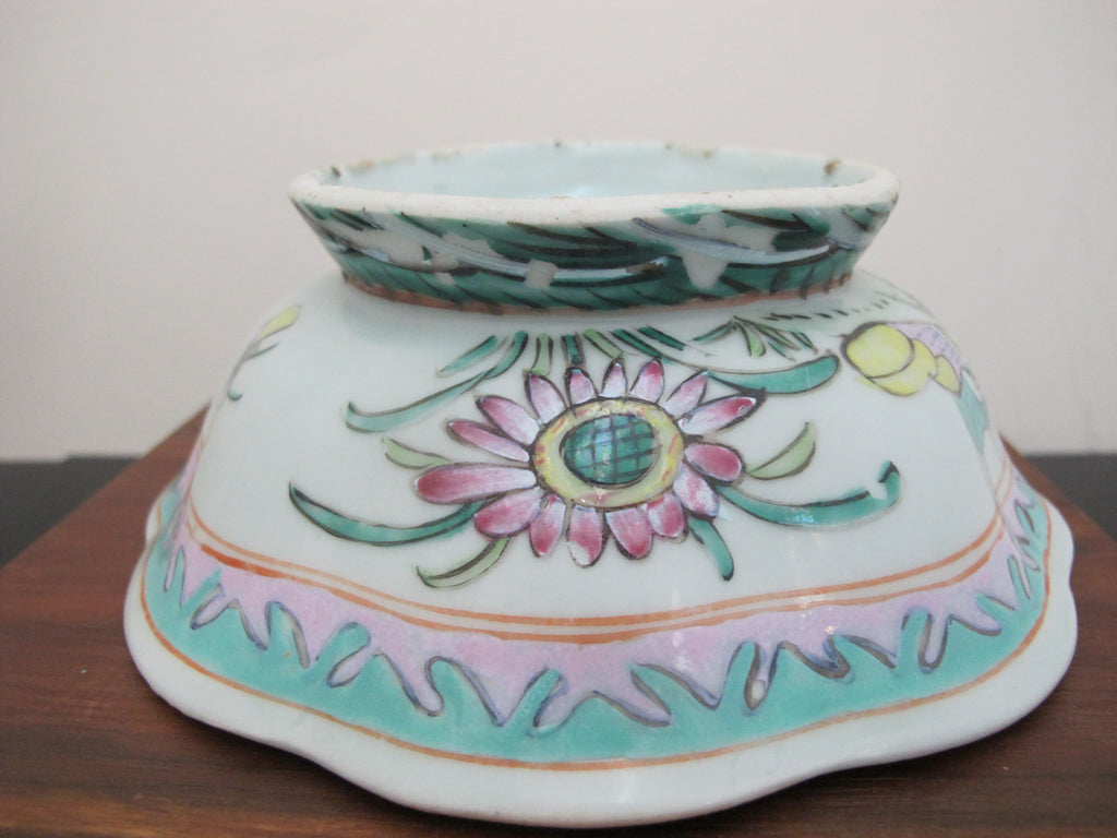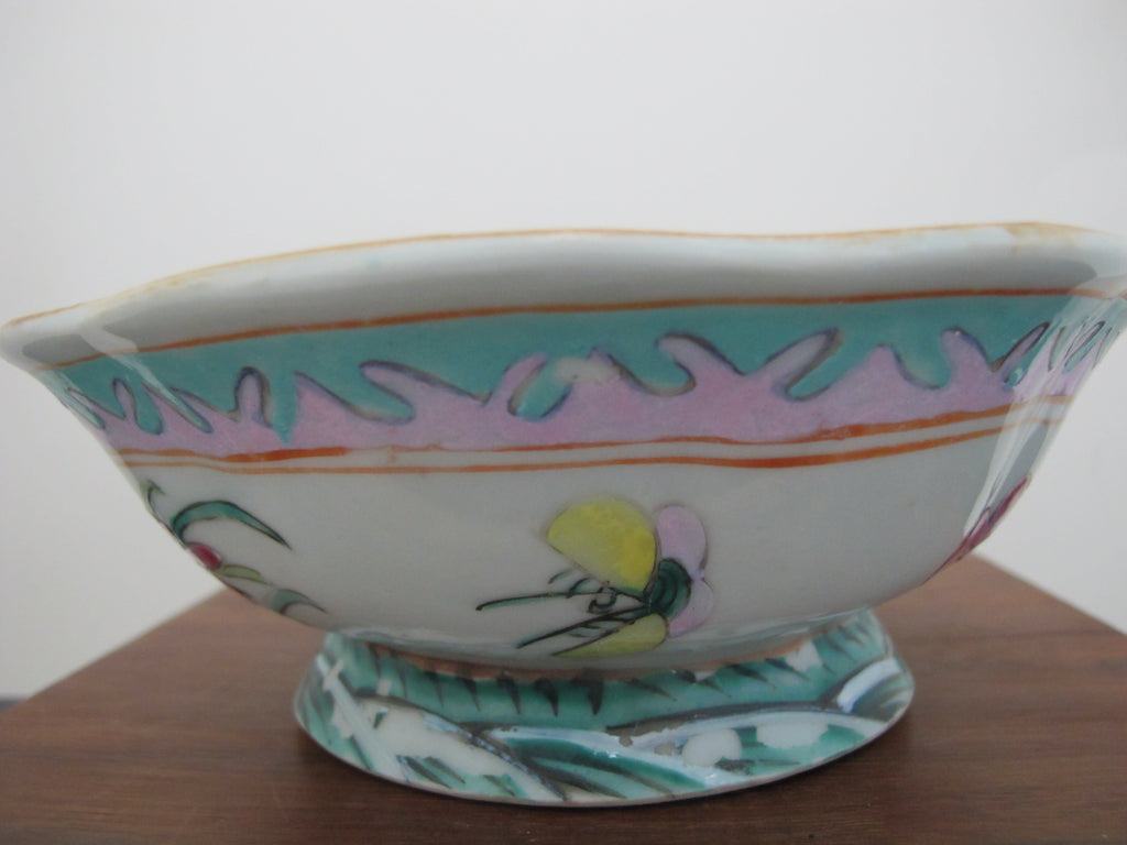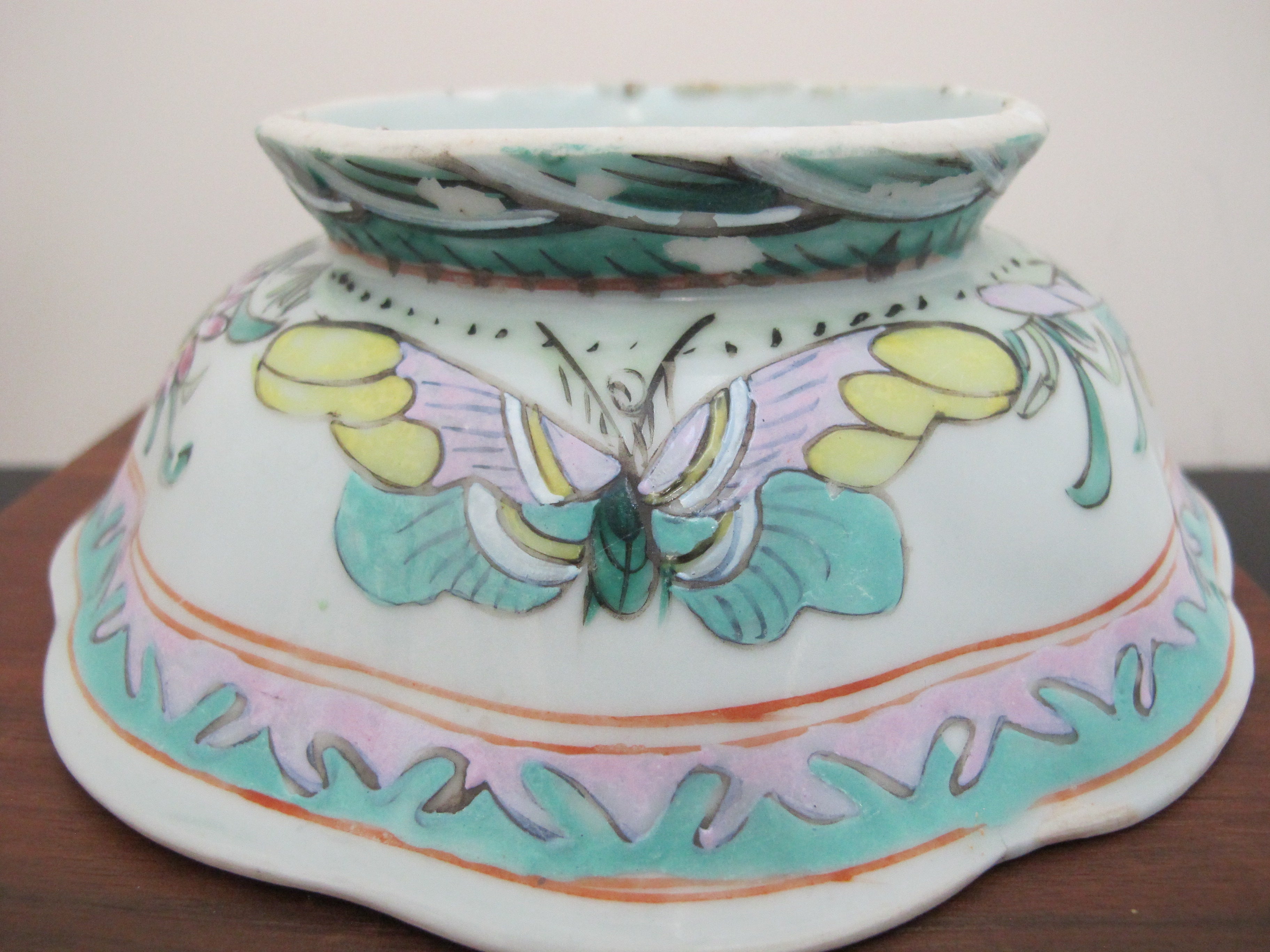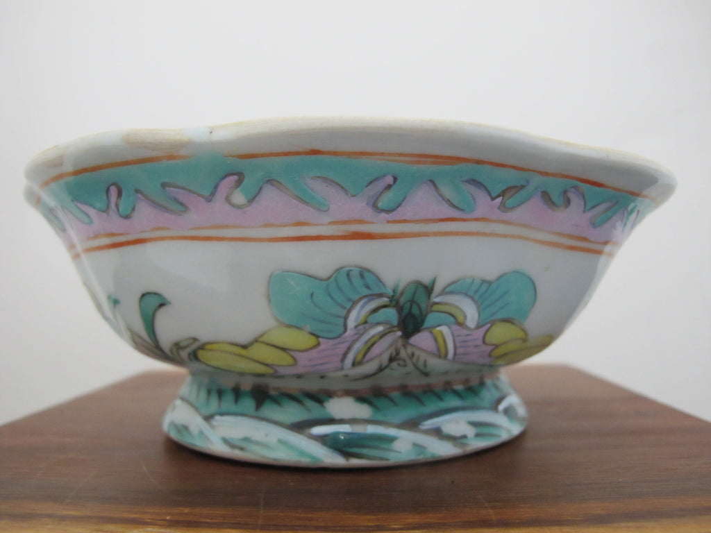 Incredibly sweet antique Chinese Nonya or Nyona porcelain rice bowl with irregular waving rim. White backdrop showing a whimsical pink, yellow, and turquoise hand painted flower and butterfly motif. Inner bowl is a bright turquoise blue. Measures 6 3/4" wide x 2 3/4" tall. Excellent condition, light wear and chips to glaze. No major chips, cracks, or repairs.
