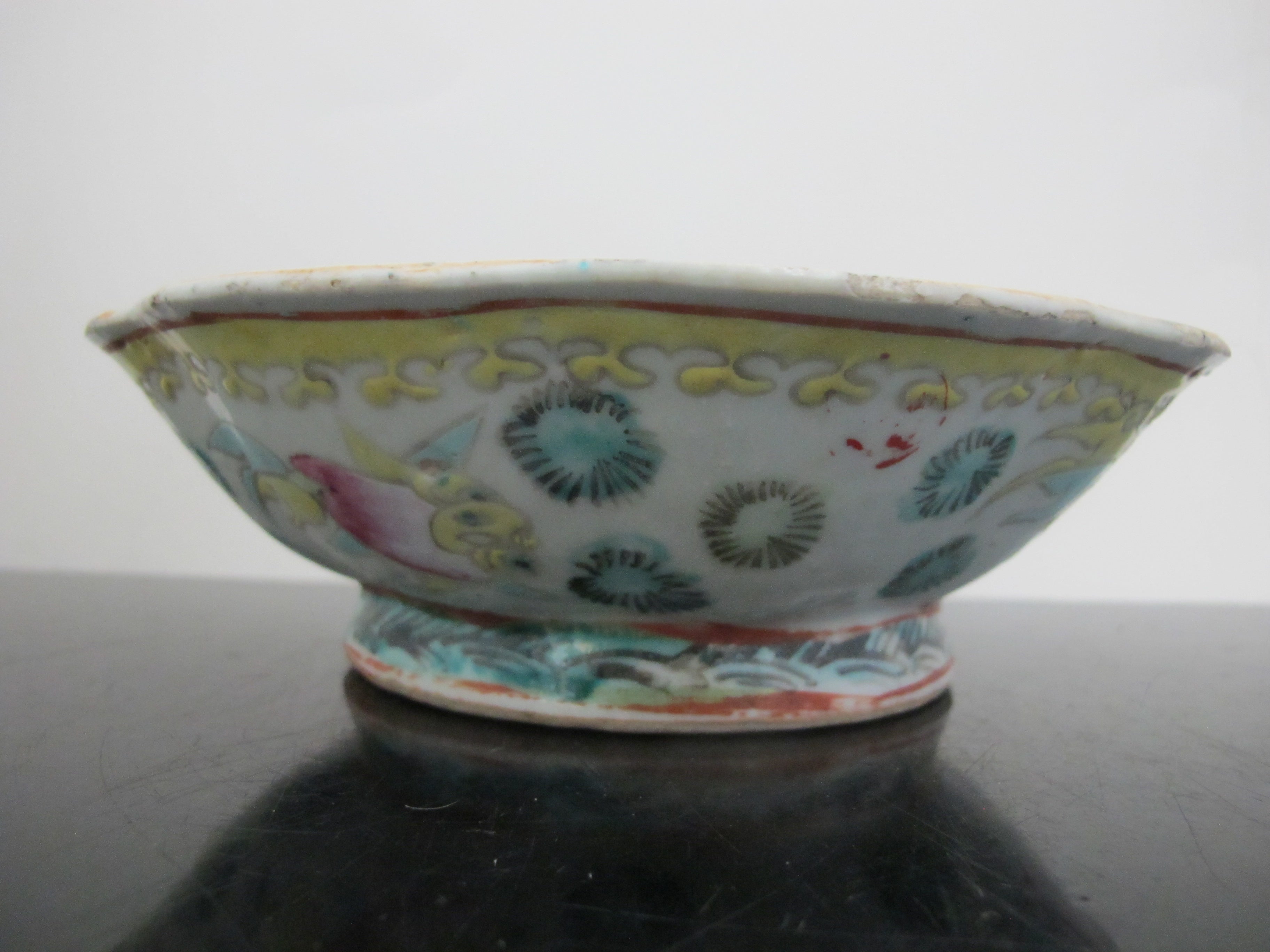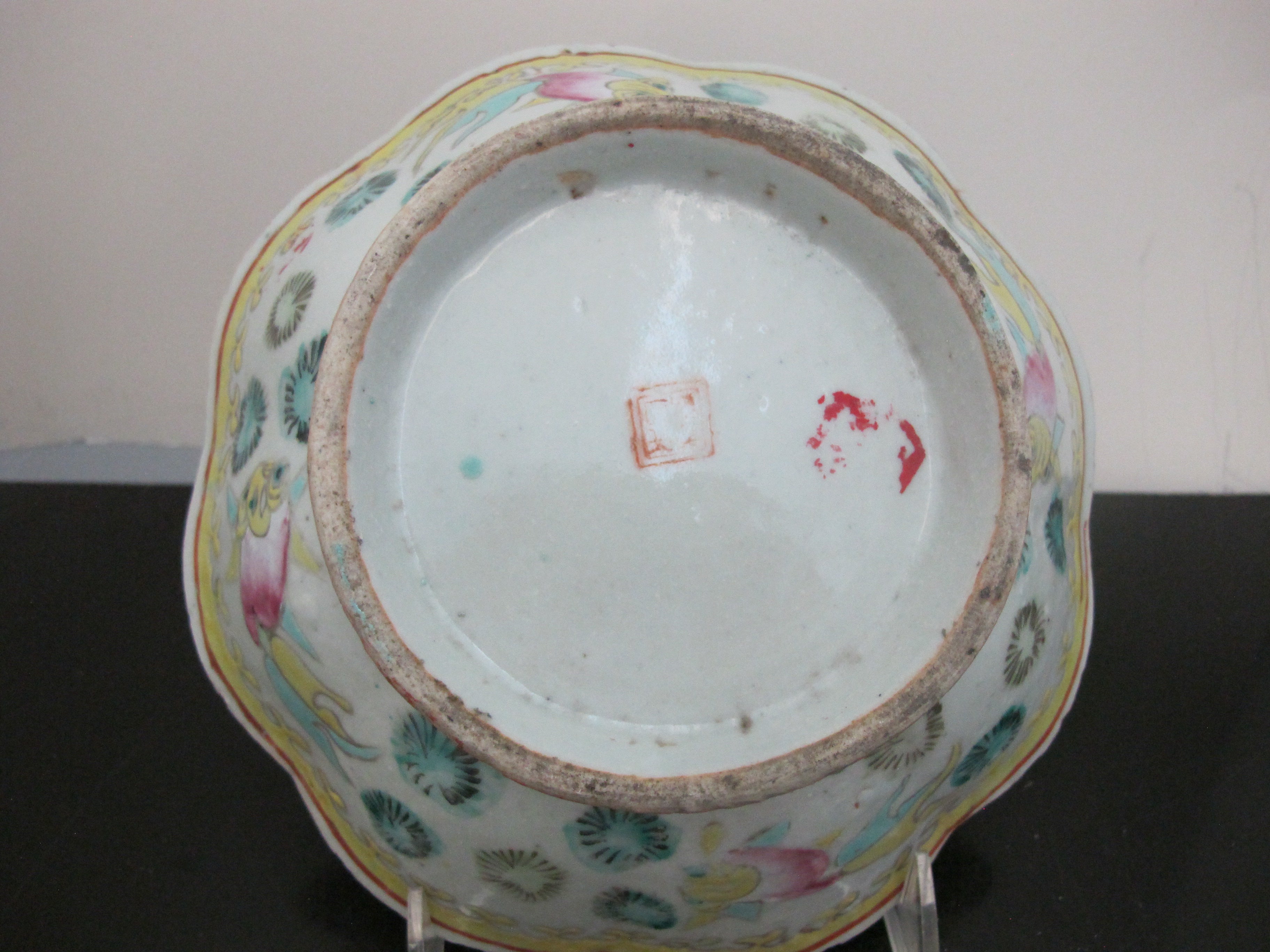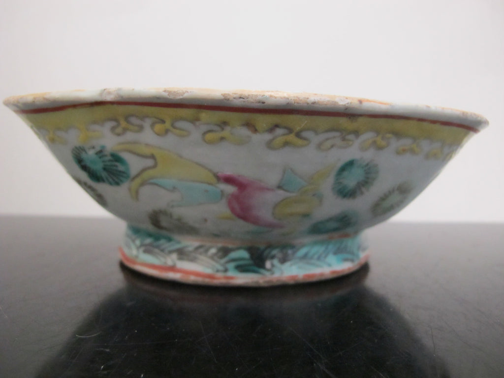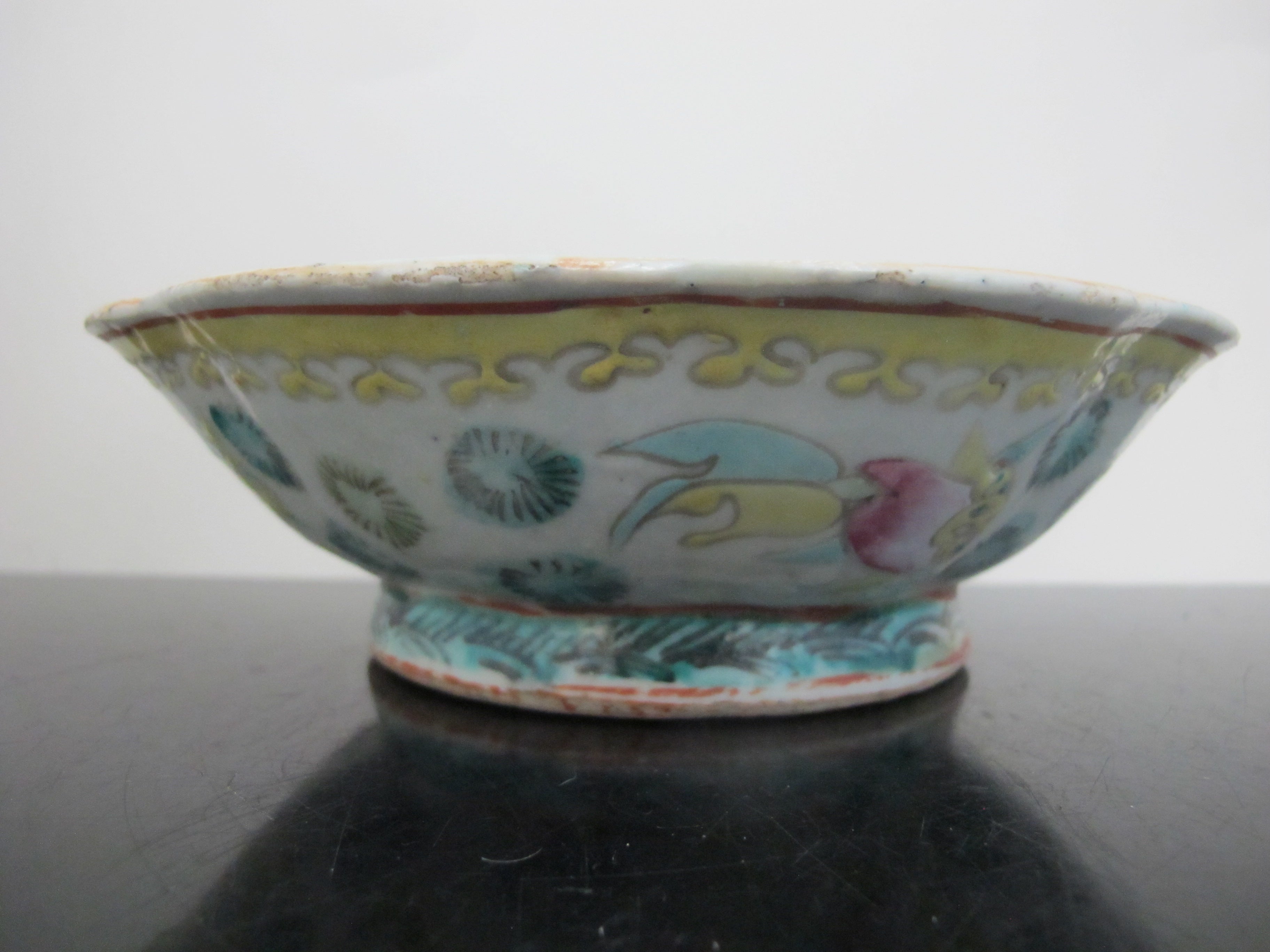 Very sweet vintage Chinese Nyonya porcelain rice bowl with lobed rim. White backdrop showing colorful enamel hand painted fish and flower motif. Inner bowl is a bright turquoise blue. Measures 7 1/2" wide x 2 1/4" tall. Excellent condition, showing typical wear for old age. Minor wear to glaze, no major chips, cracks, or repairs. Red stamp at base.