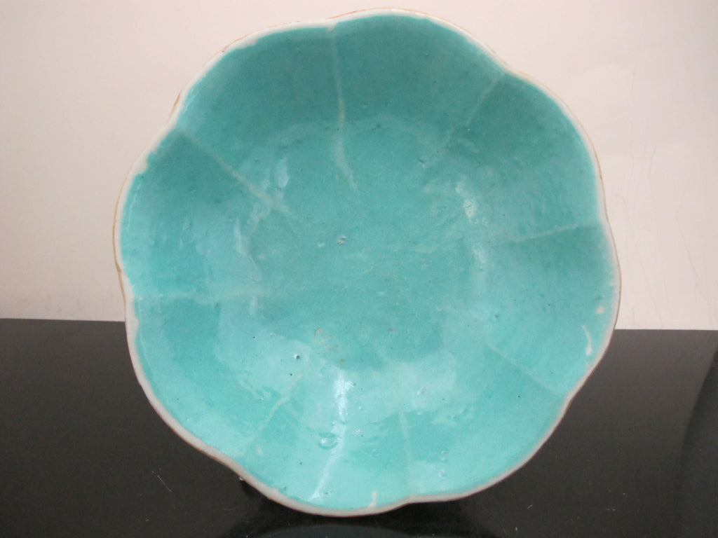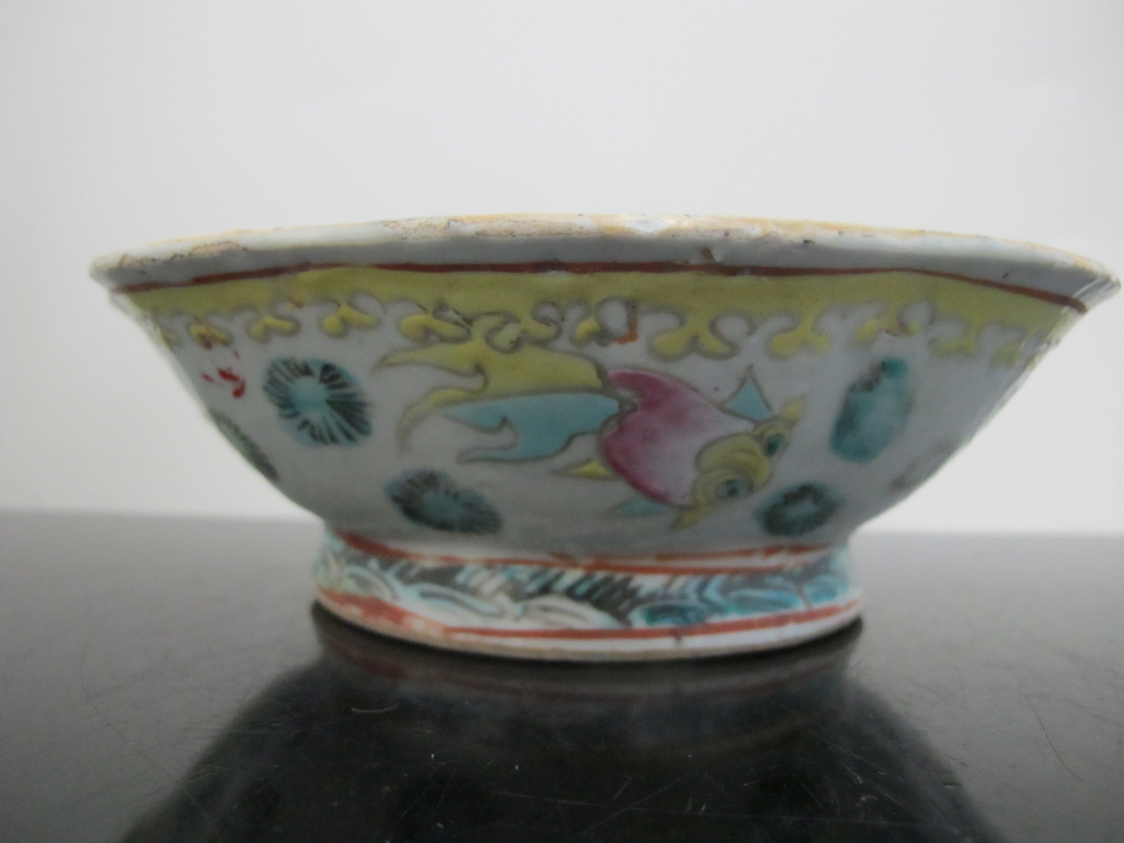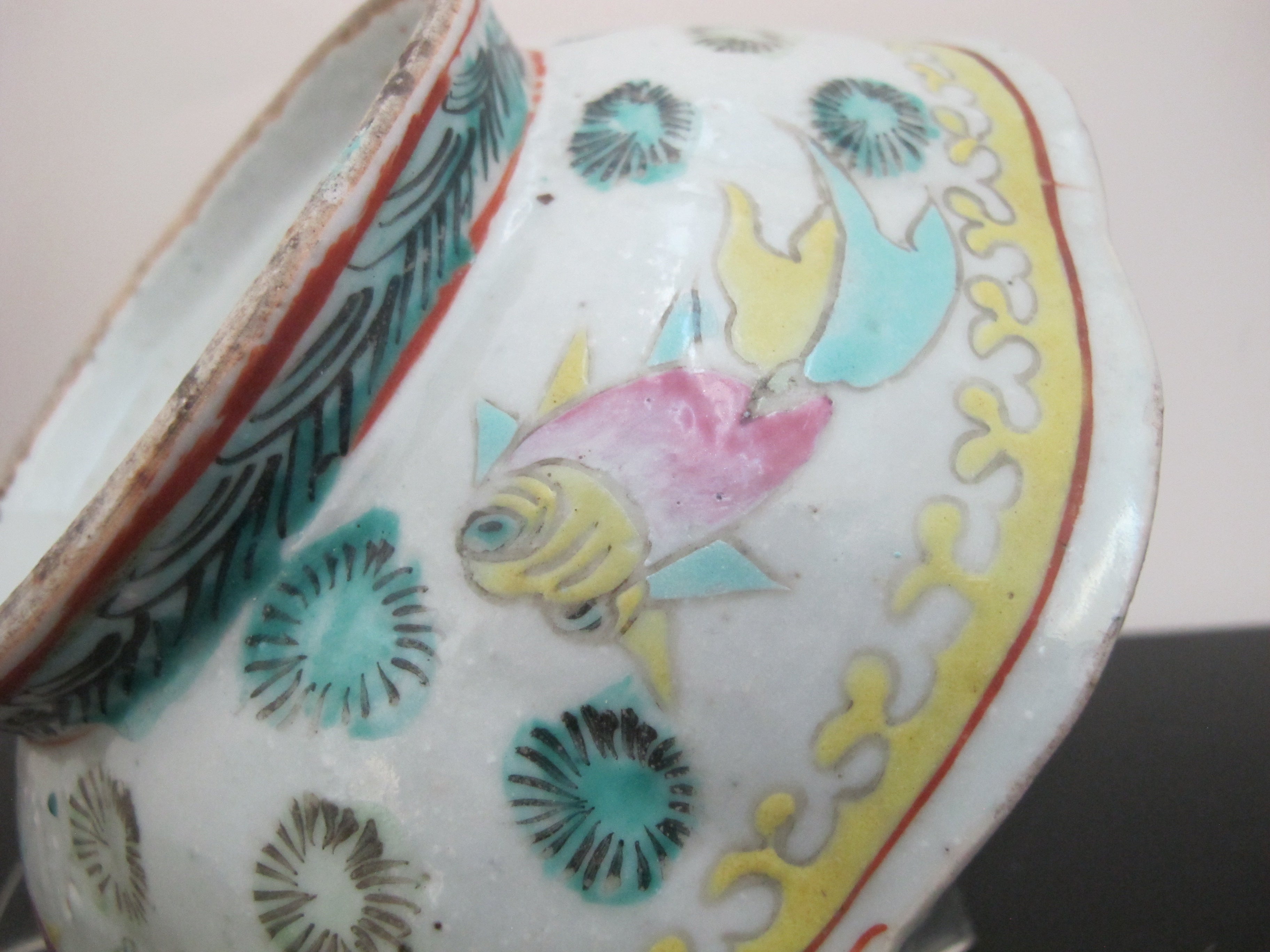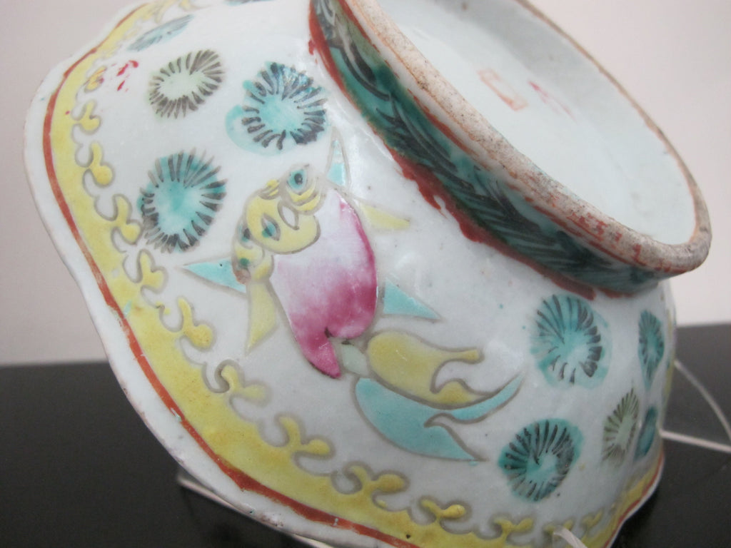 Very sweet vintage Chinese Nyonya porcelain rice bowl with lobed rim. White backdrop showing colorful enamel hand painted fish and flower motif. Inner bowl is a bright turquoise blue. Measures 7 1/2" wide x 2 1/4" tall. Excellent condition, showing typical wear for old age. Minor wear to glaze, no major chips, cracks, or repairs. Red stamp at base.