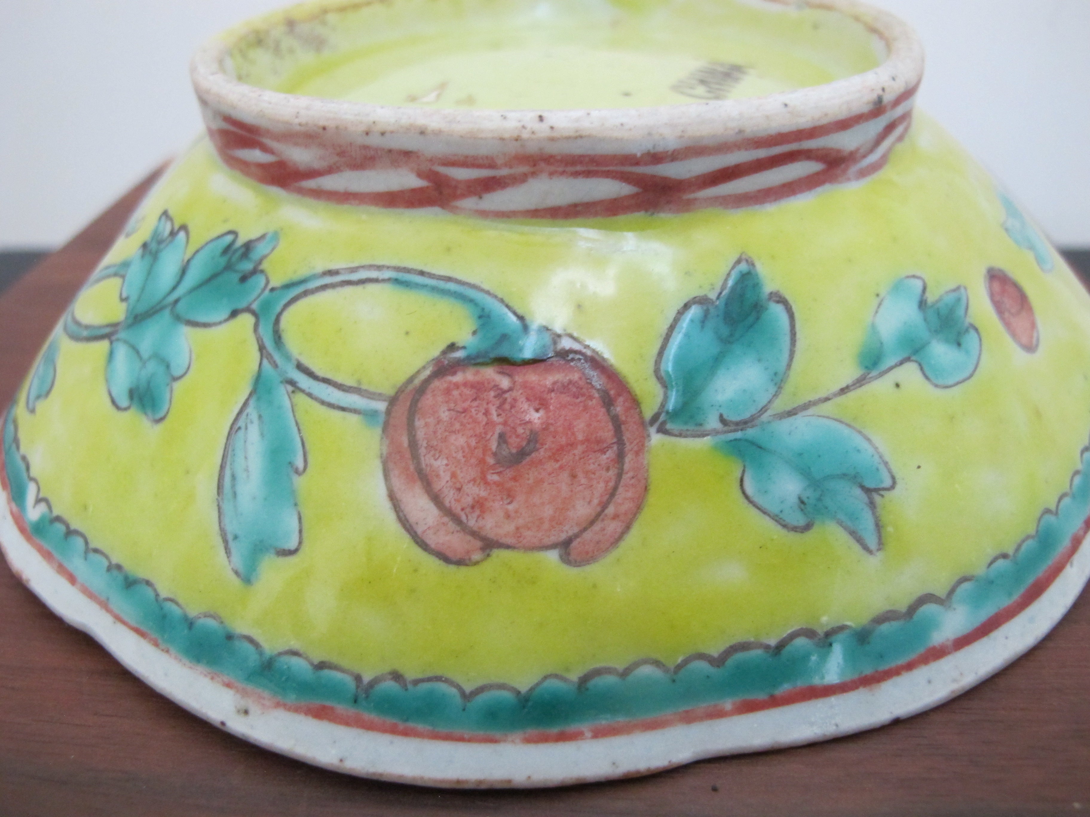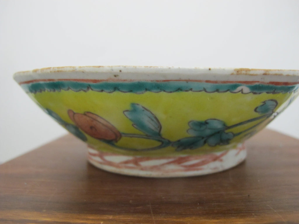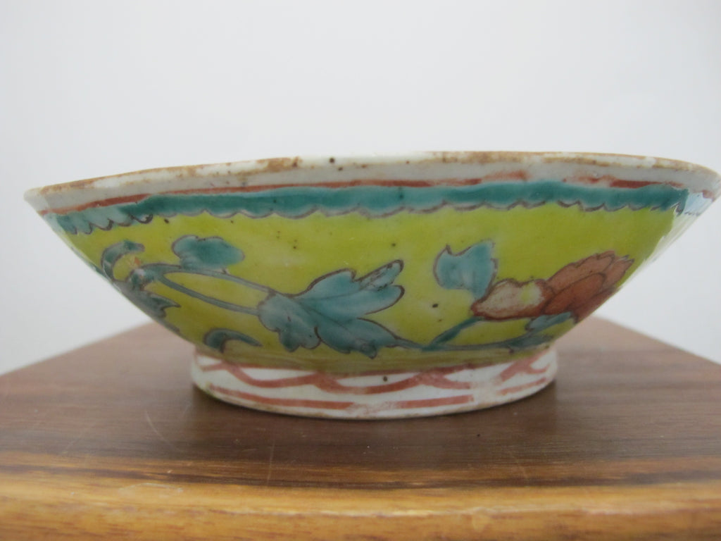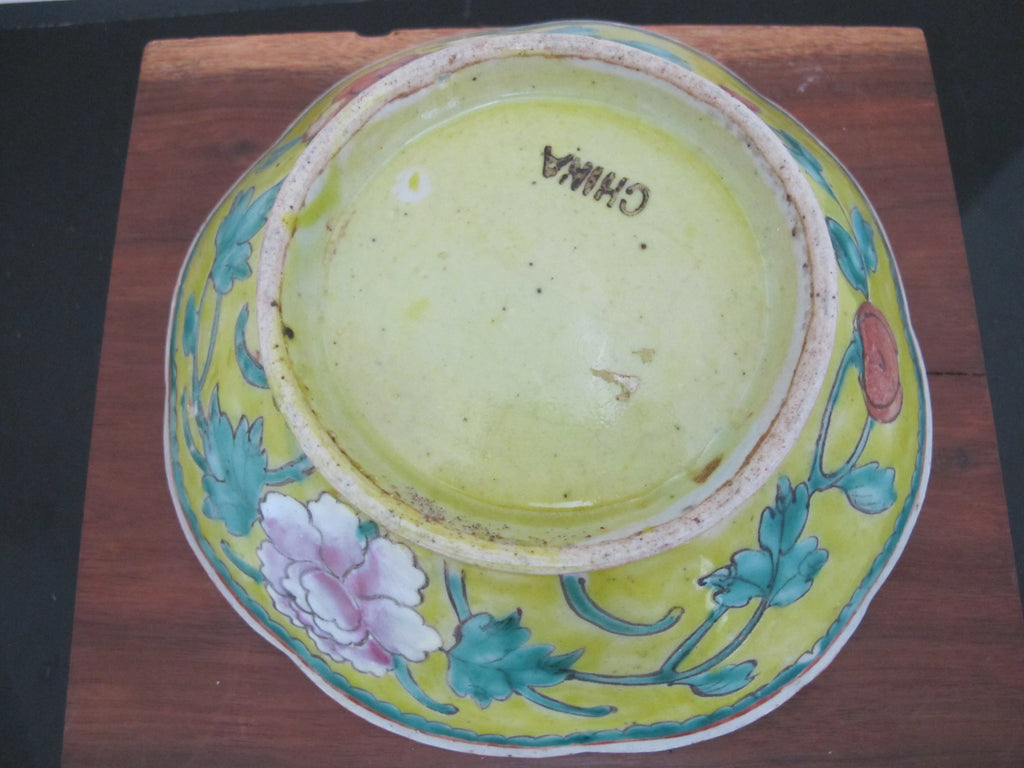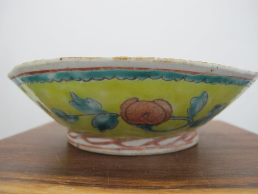 Really sweet antique Chinese porcelain bowl with wavy rim. Yellow porcelain with colorful hand painted peach, floral, and leaf design. Measures 6 3/4" wide x 2" tall. Excellent condition, light wear to glaze. no major chips, cracks, or repairs.