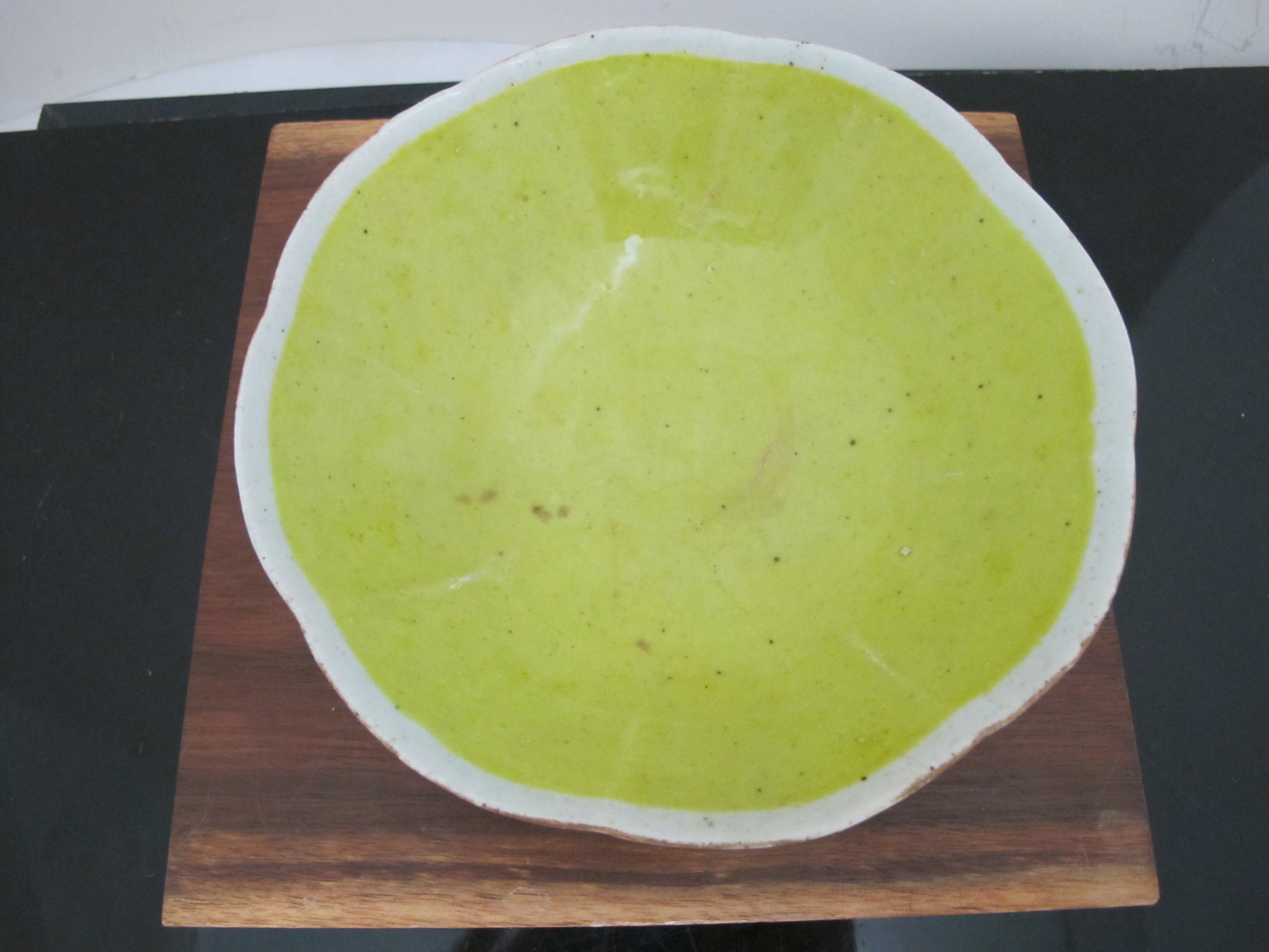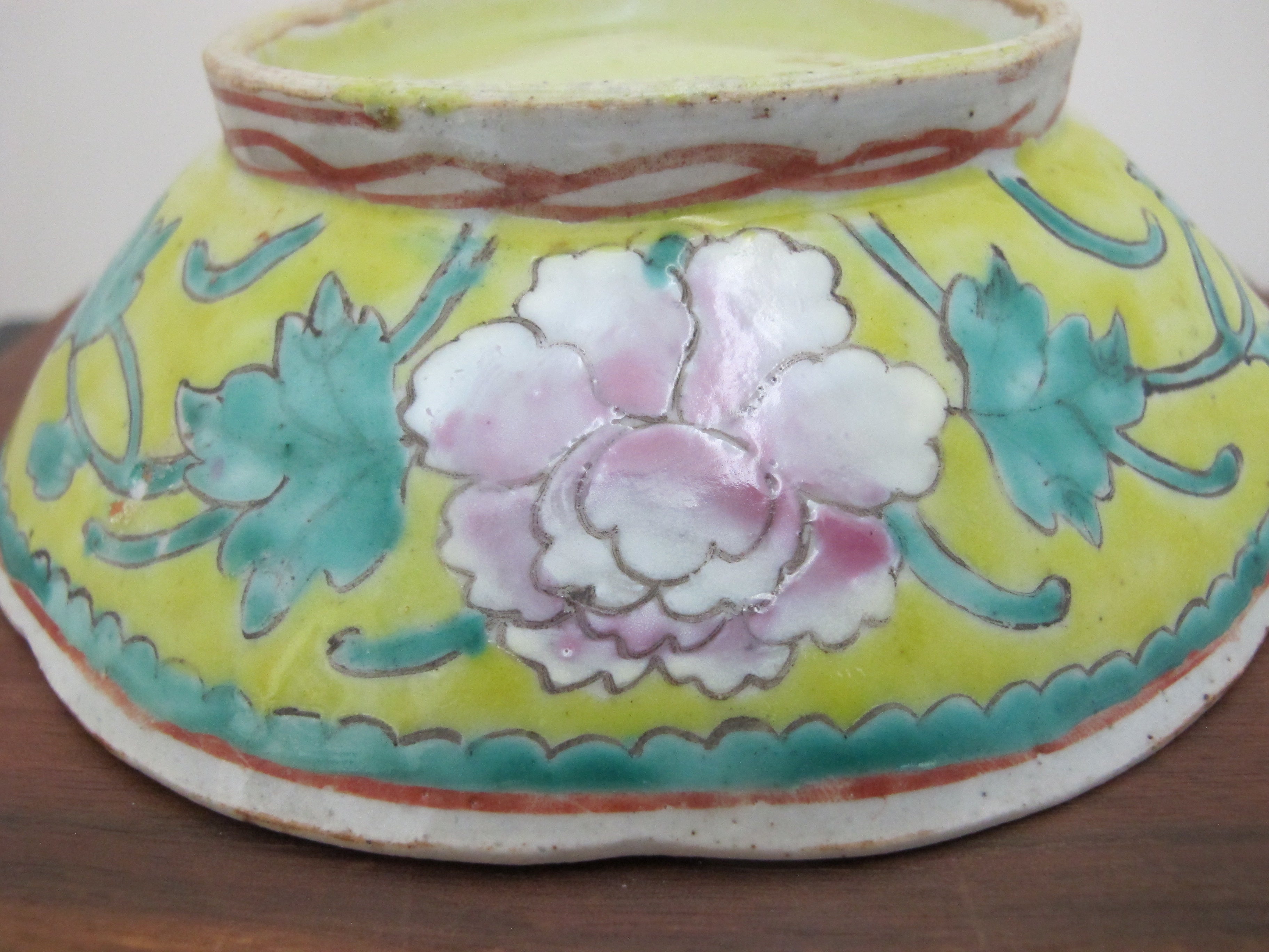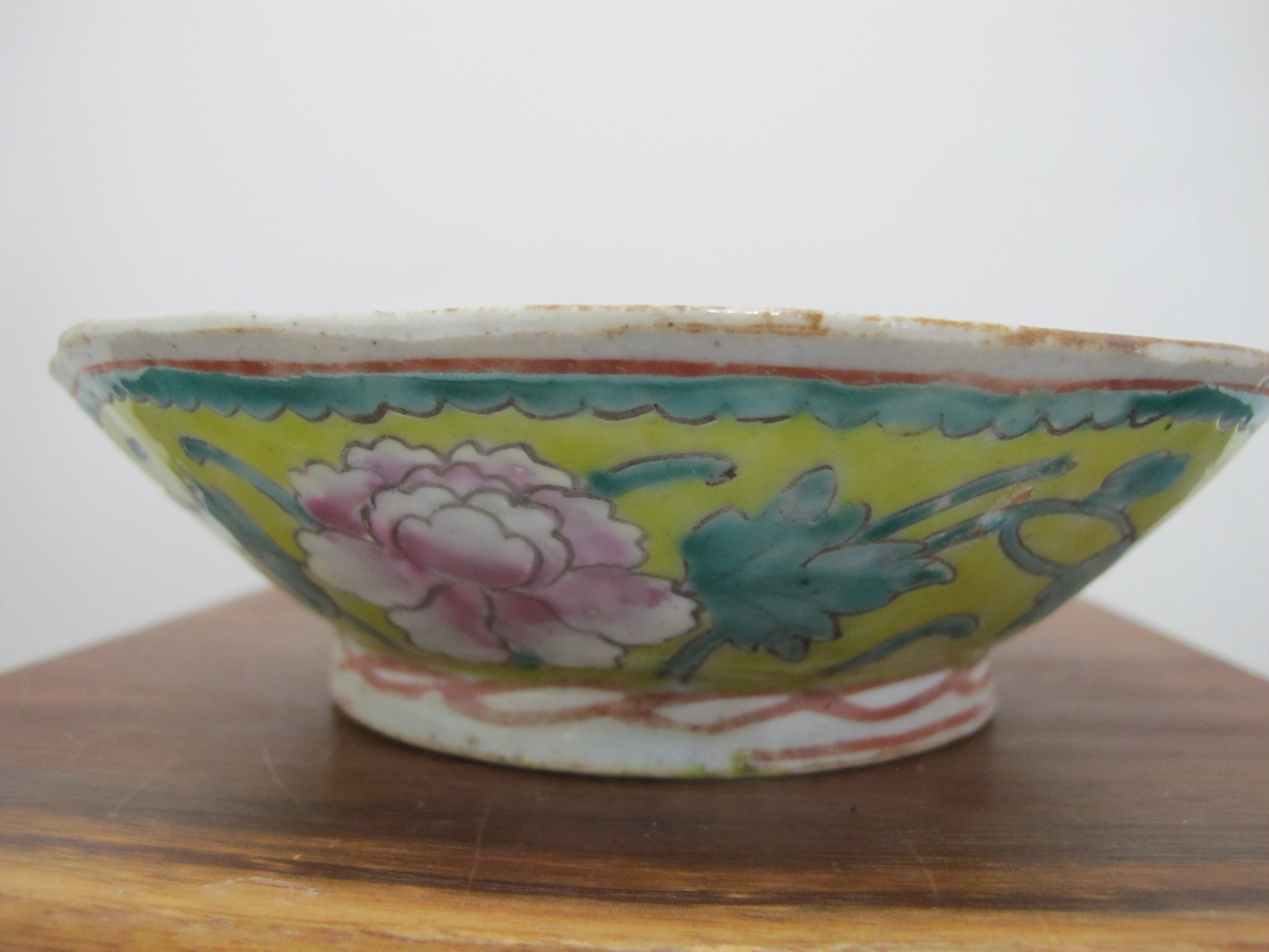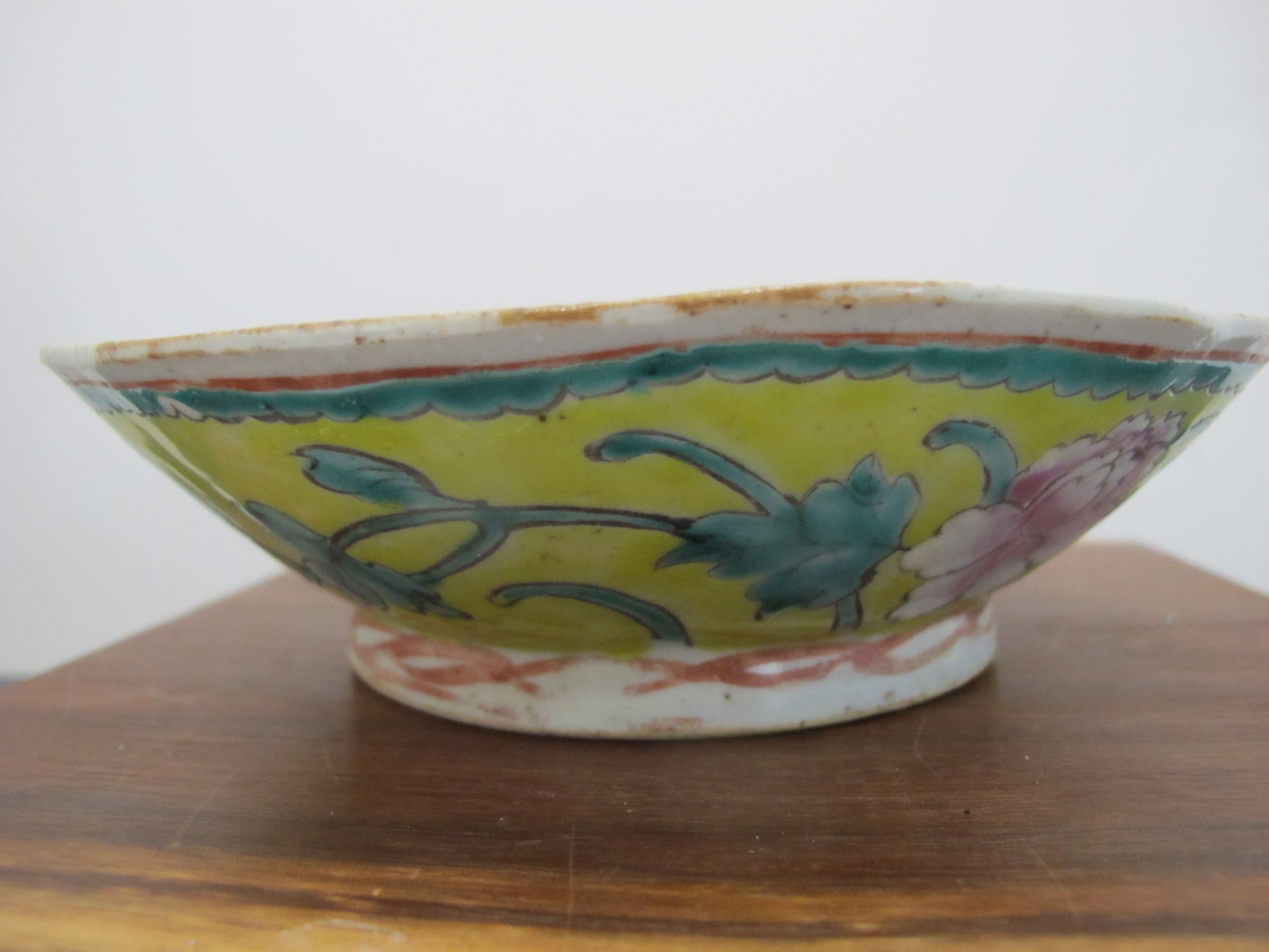 Really sweet antique Chinese porcelain bowl with wavy rim. Yellow porcelain with colorful hand painted peach, floral, and leaf design. Measures 6 3/4" wide x 2" tall. Excellent condition, light wear to glaze. no major chips, cracks, or repairs.