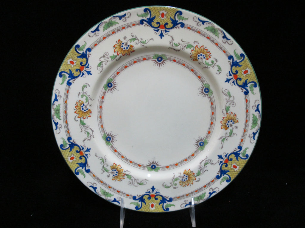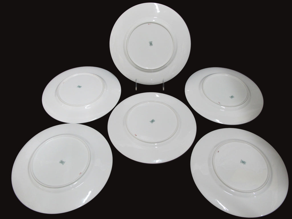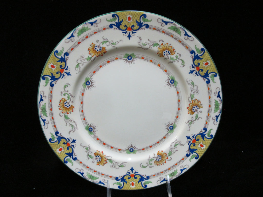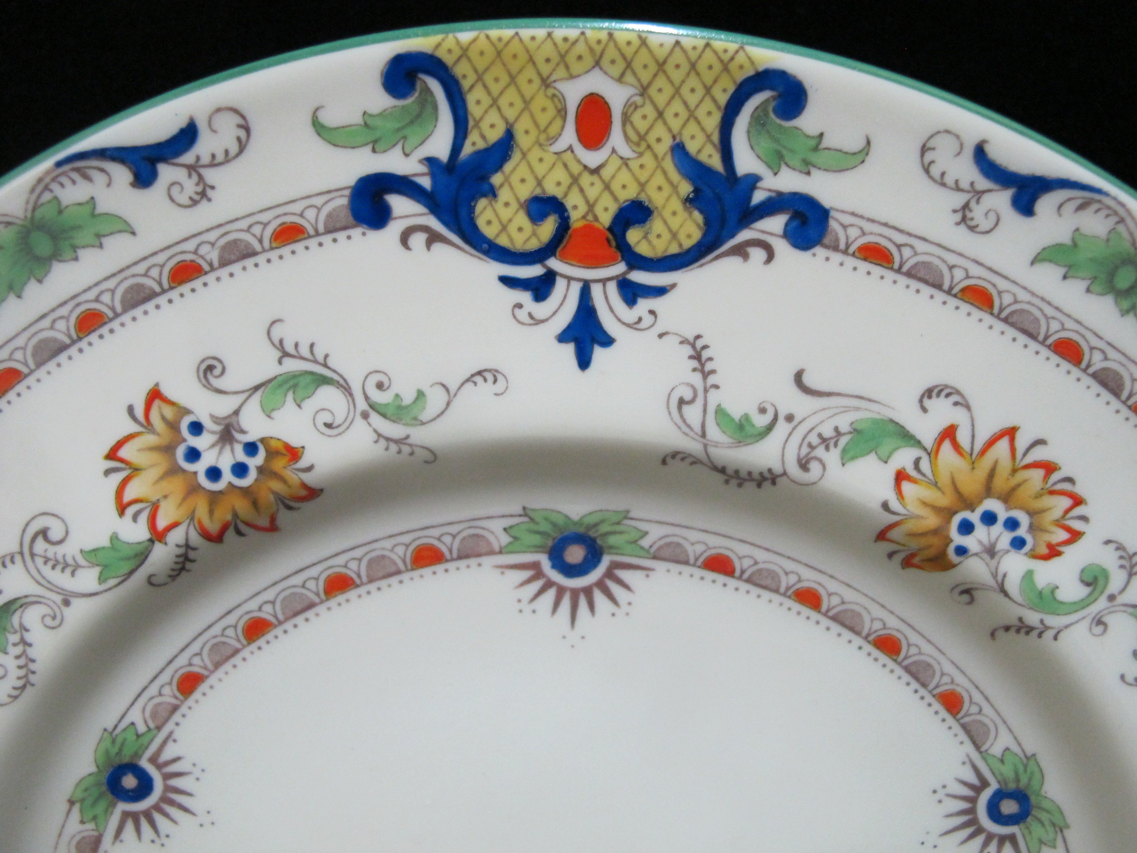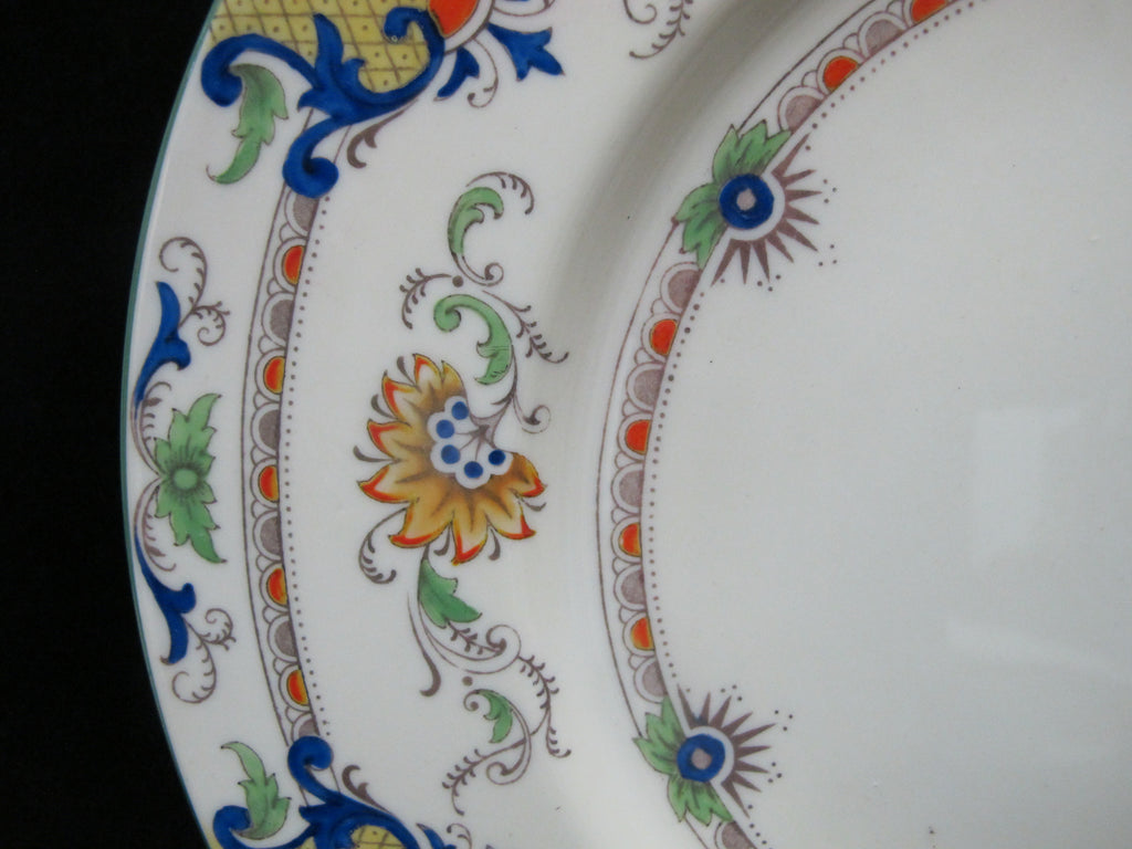 Bright and colorful Coalport England AD 1750 dinner plate set of 6., dating from mid to late 19th century. Beautiful bold multi-color scrolling flower motif. All are in excellent condition, no chips, cracks, or repairs. Very light loss of paint.