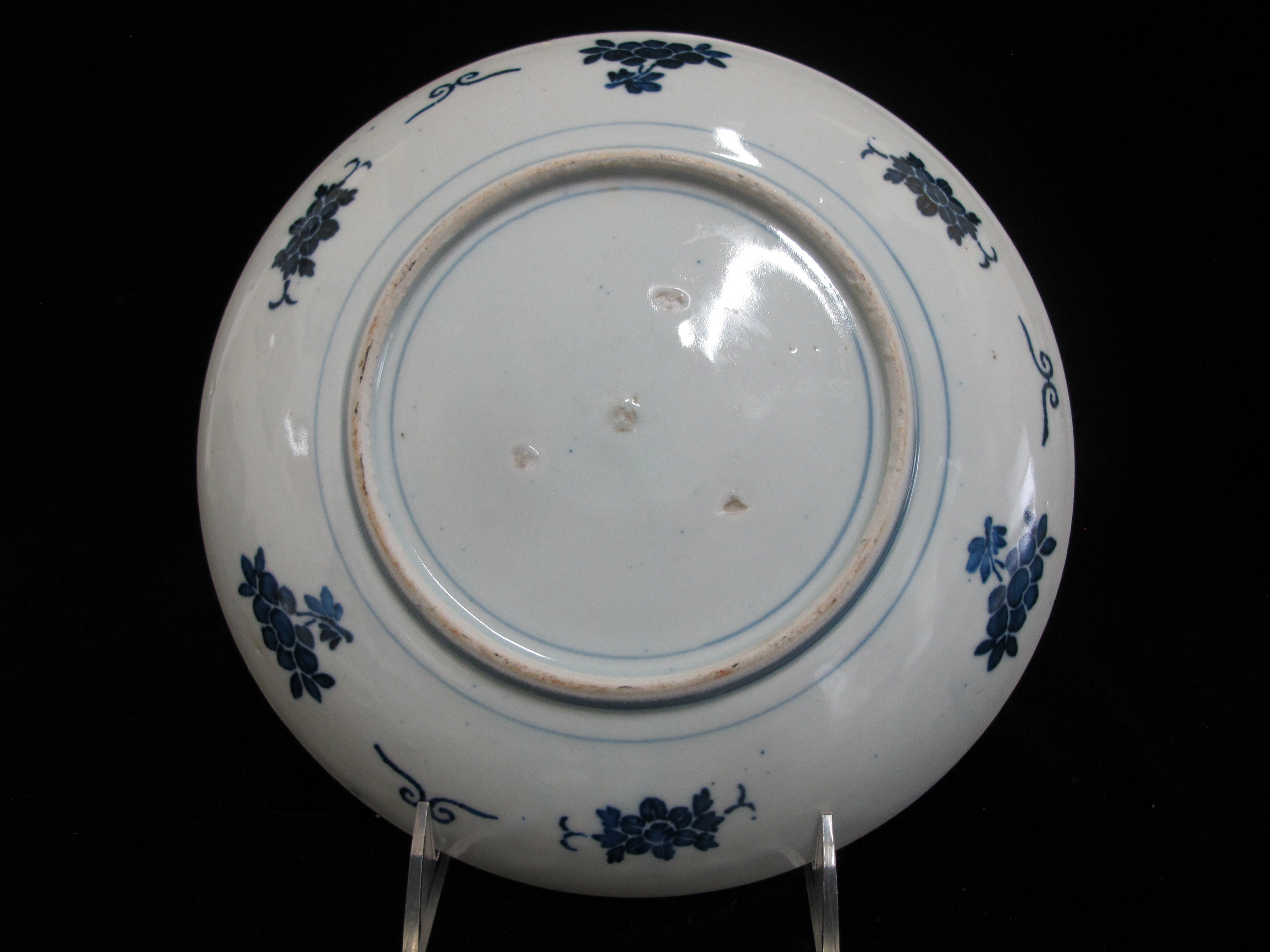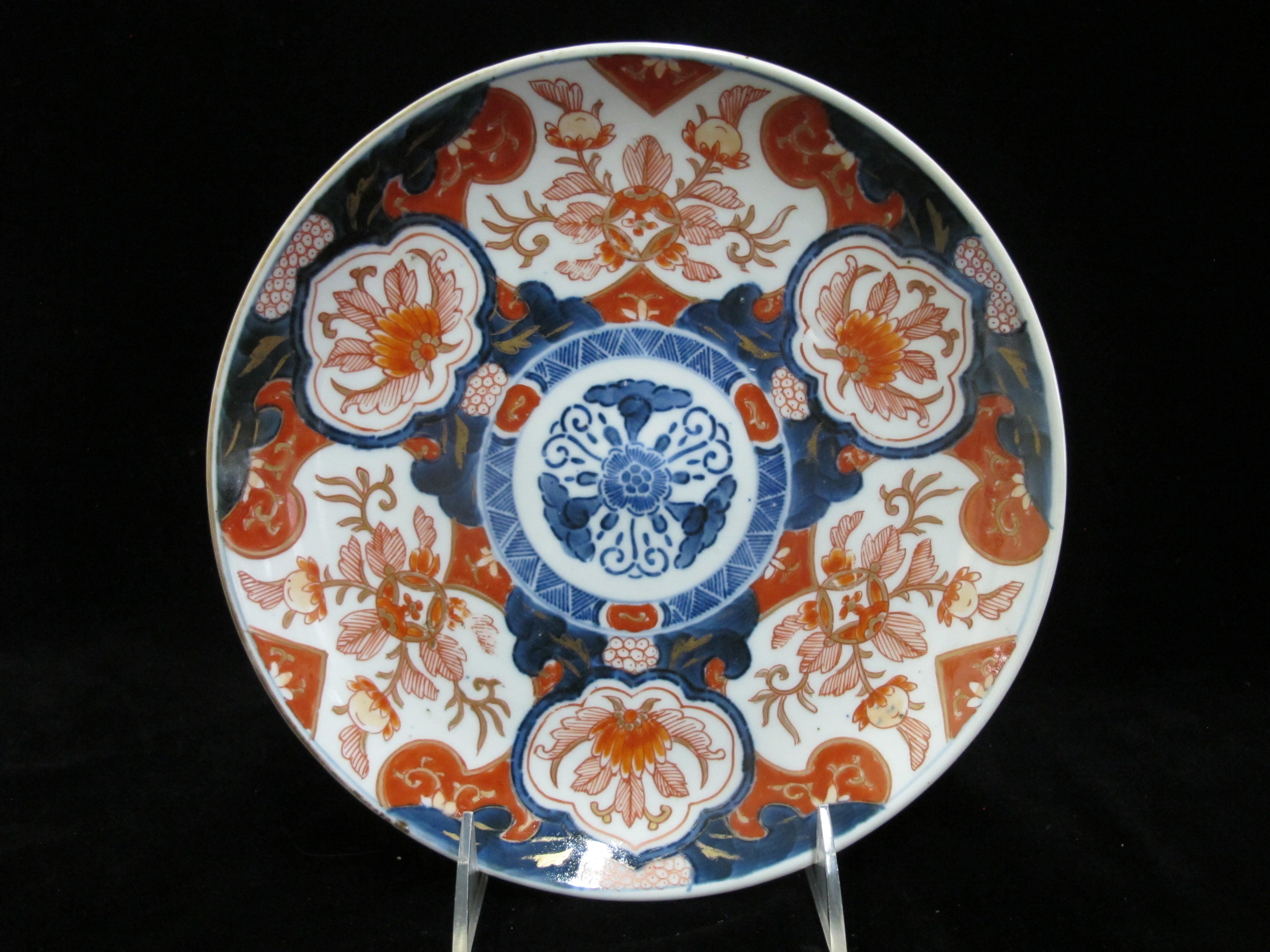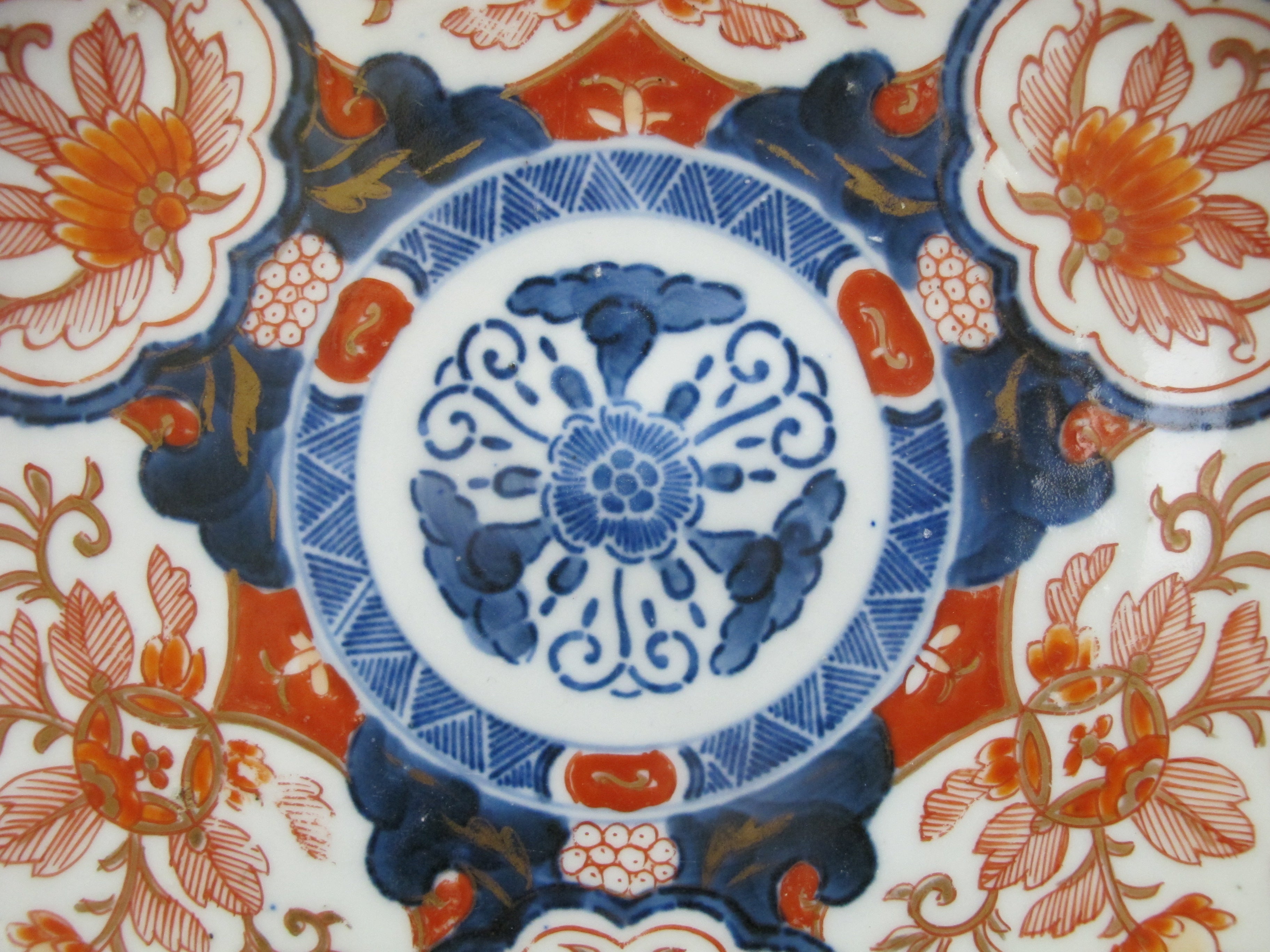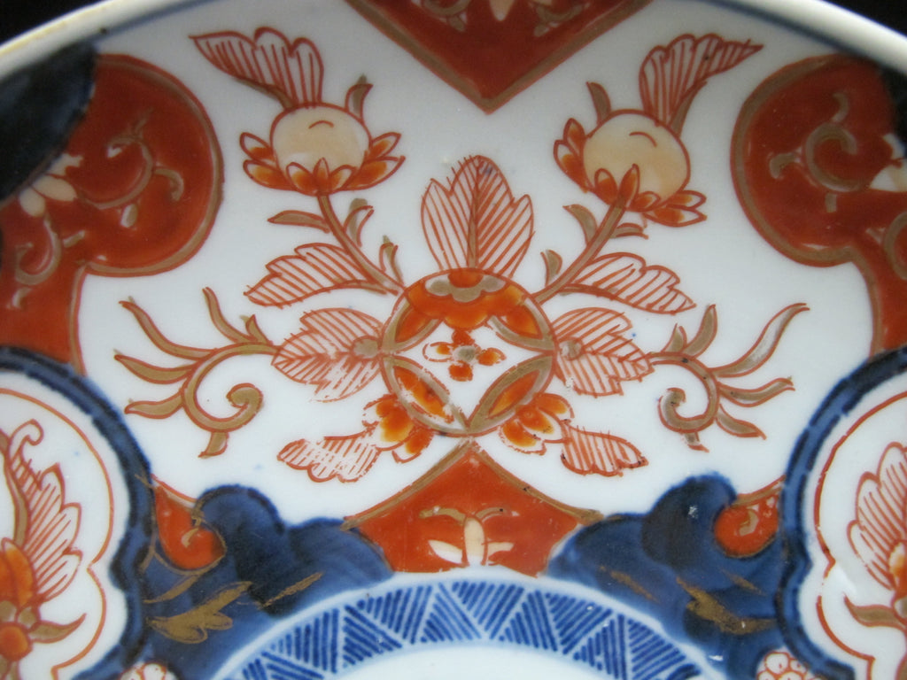 Japanese Imari porcelain plate brightly hand painted in blue, red, and gold showing a flower design. Measures 9". Excellent condition, light loss of paint, no chips, cracks, or repairs.