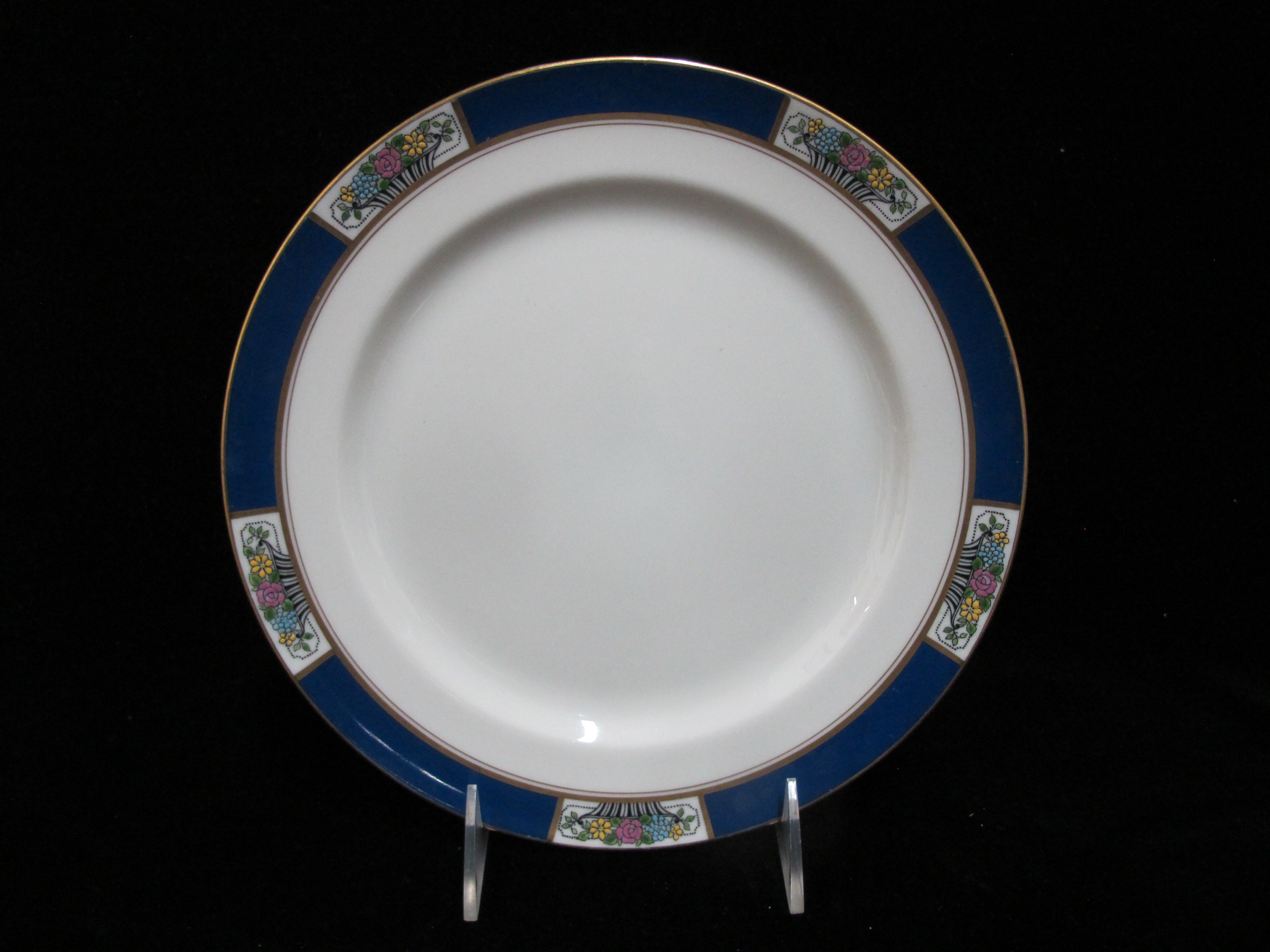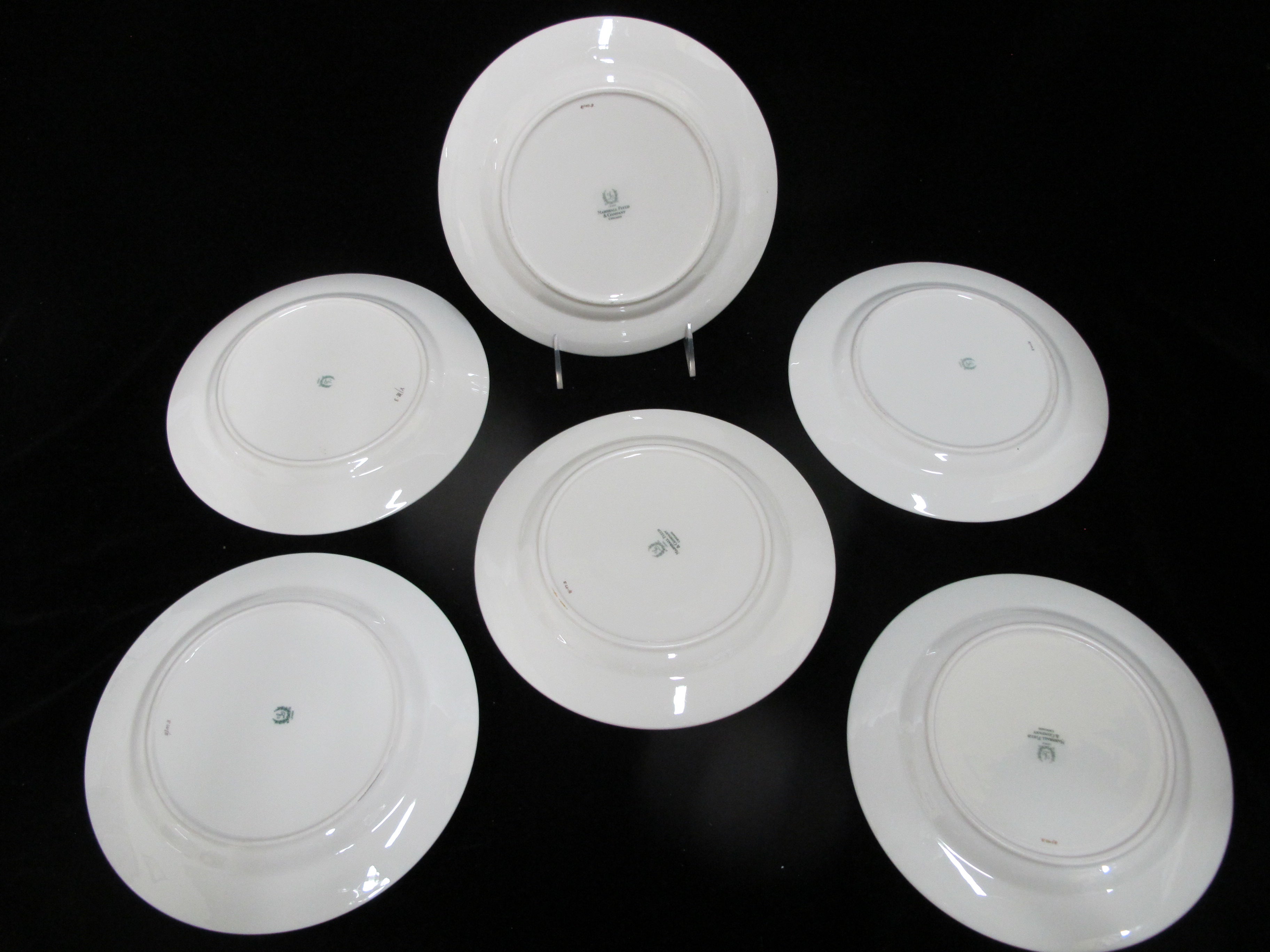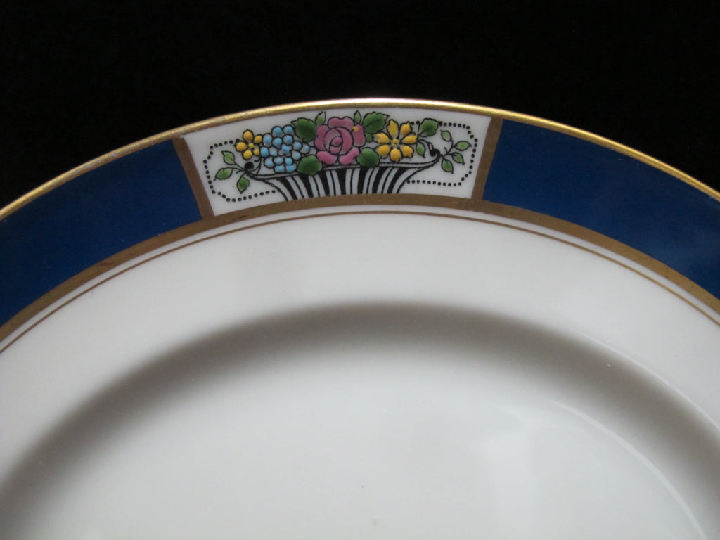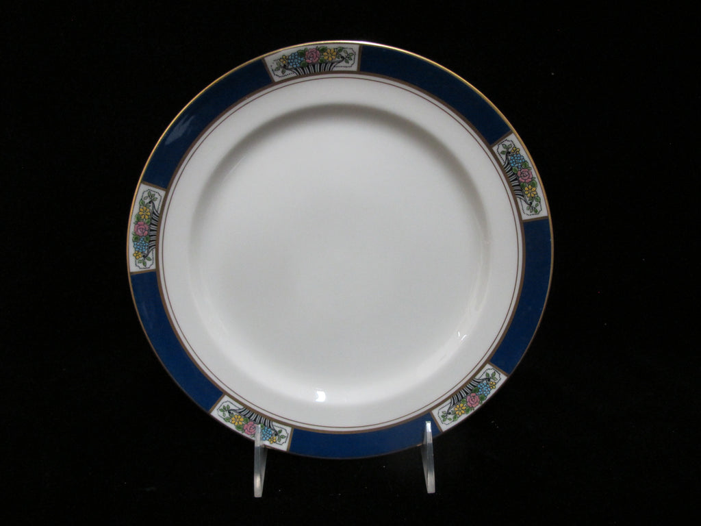 Set of 6 Lenox fine china luncheon plates in Meadowbrook pattern. Blue and gilt border with pastel flowers in a basket. Each measures 9". Excellent condition, no chips, cracks, or repairs. Show minor surface scratching.