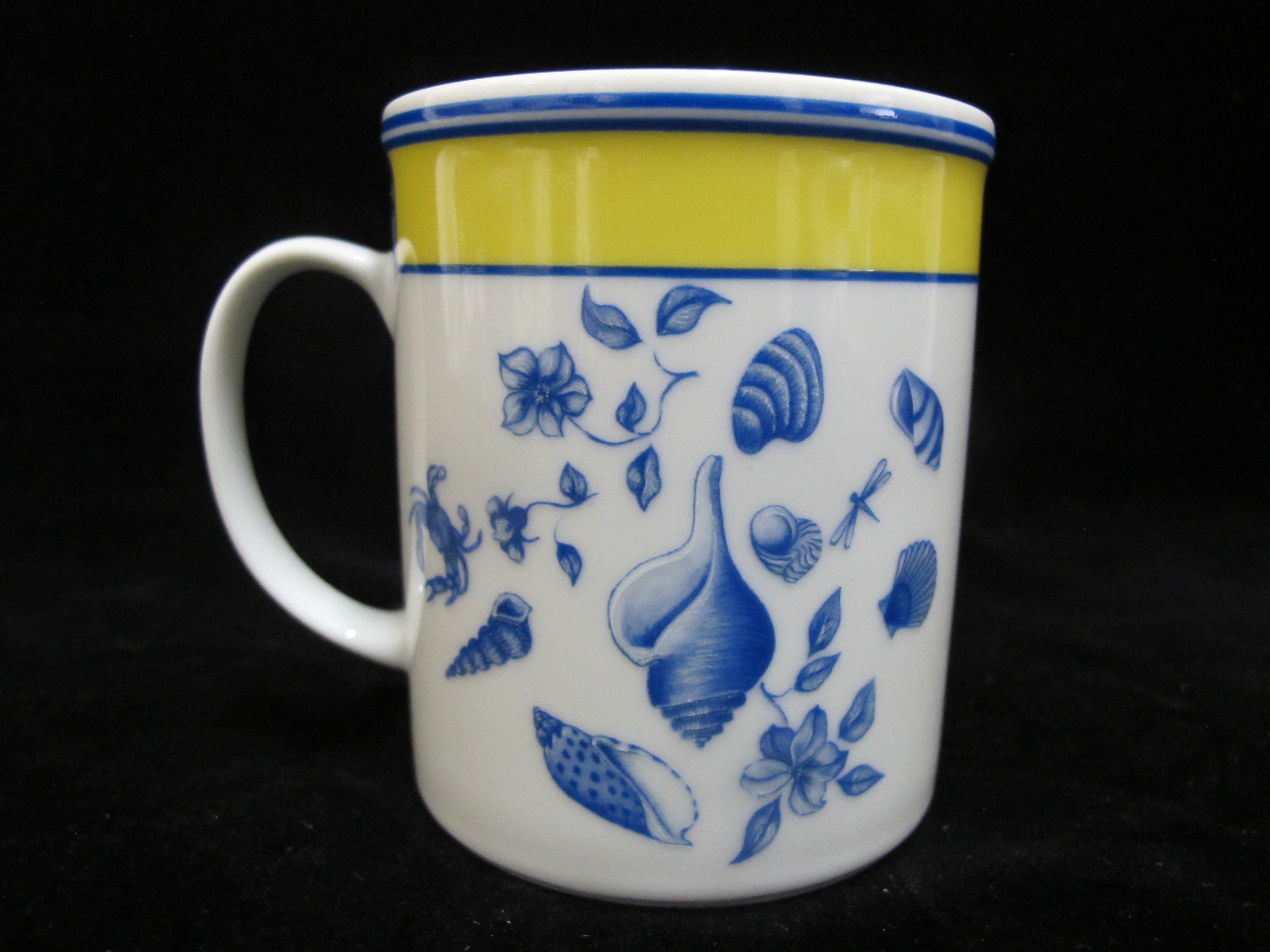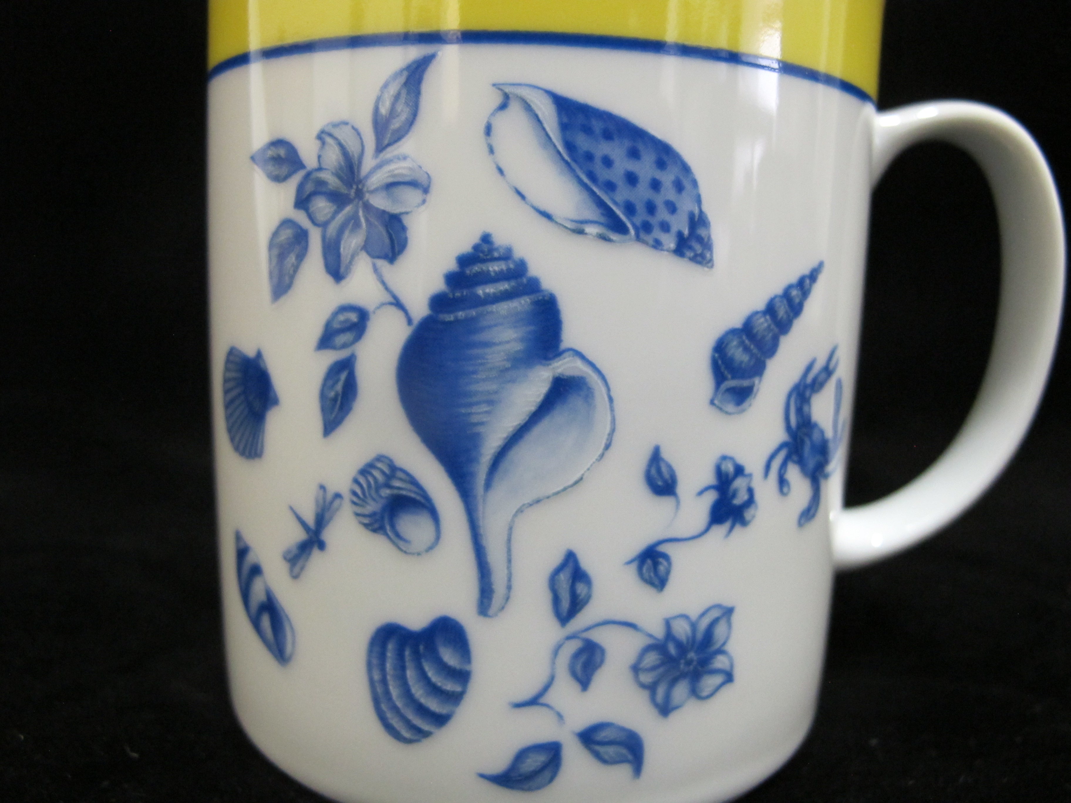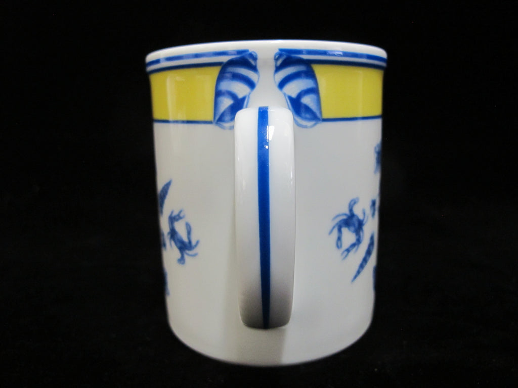 Lynn Chase Costa Azzurra 1988 pattern coffee cup. Ceramic in white with blue whimsical seashell, floral, and crab design with yellow and blue highlighted border. Perfect cup for your morning wake up at the beach house. Excellent condition, no chips, cracks, or repairs. Multiple available.