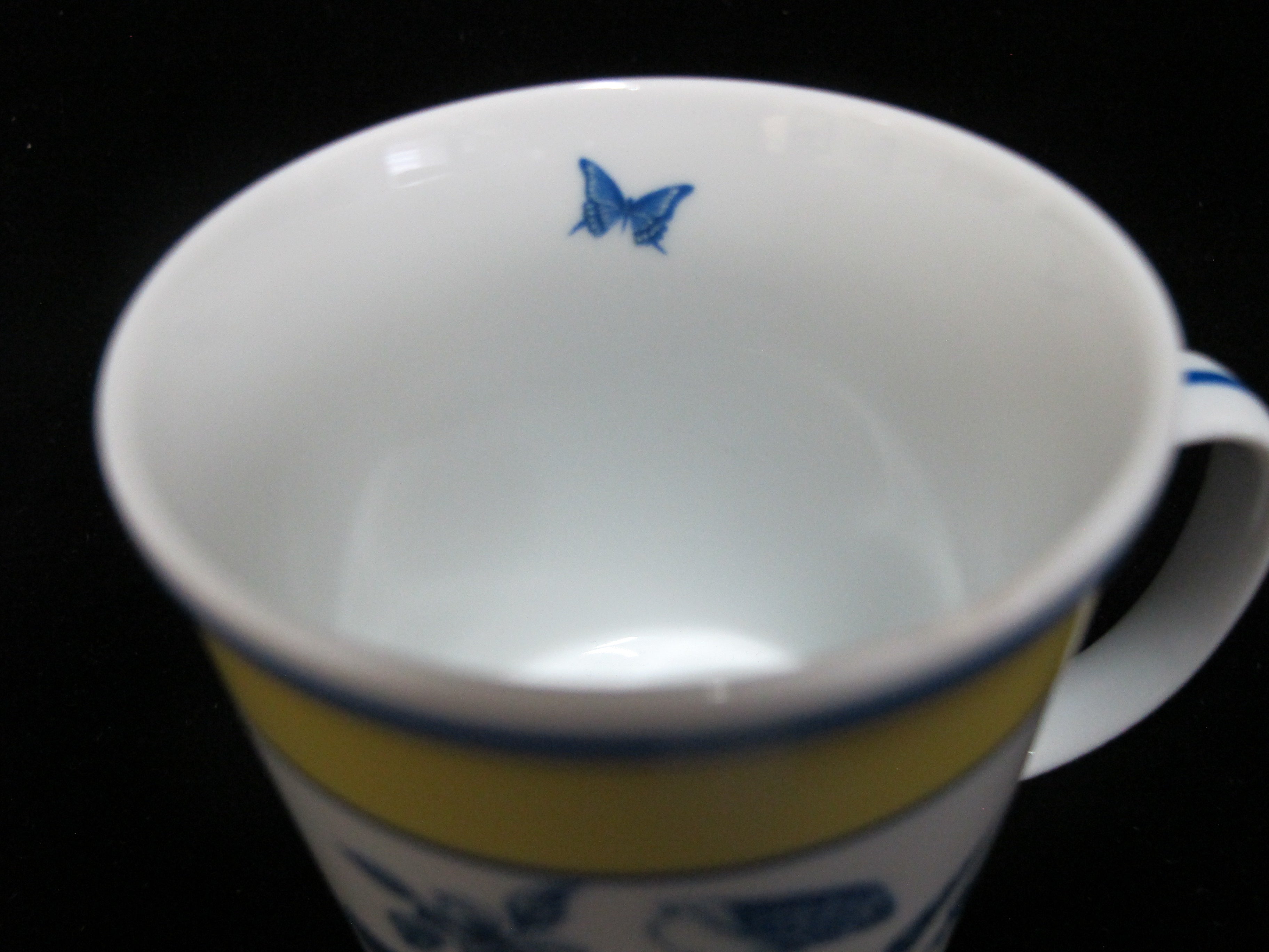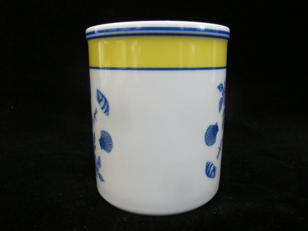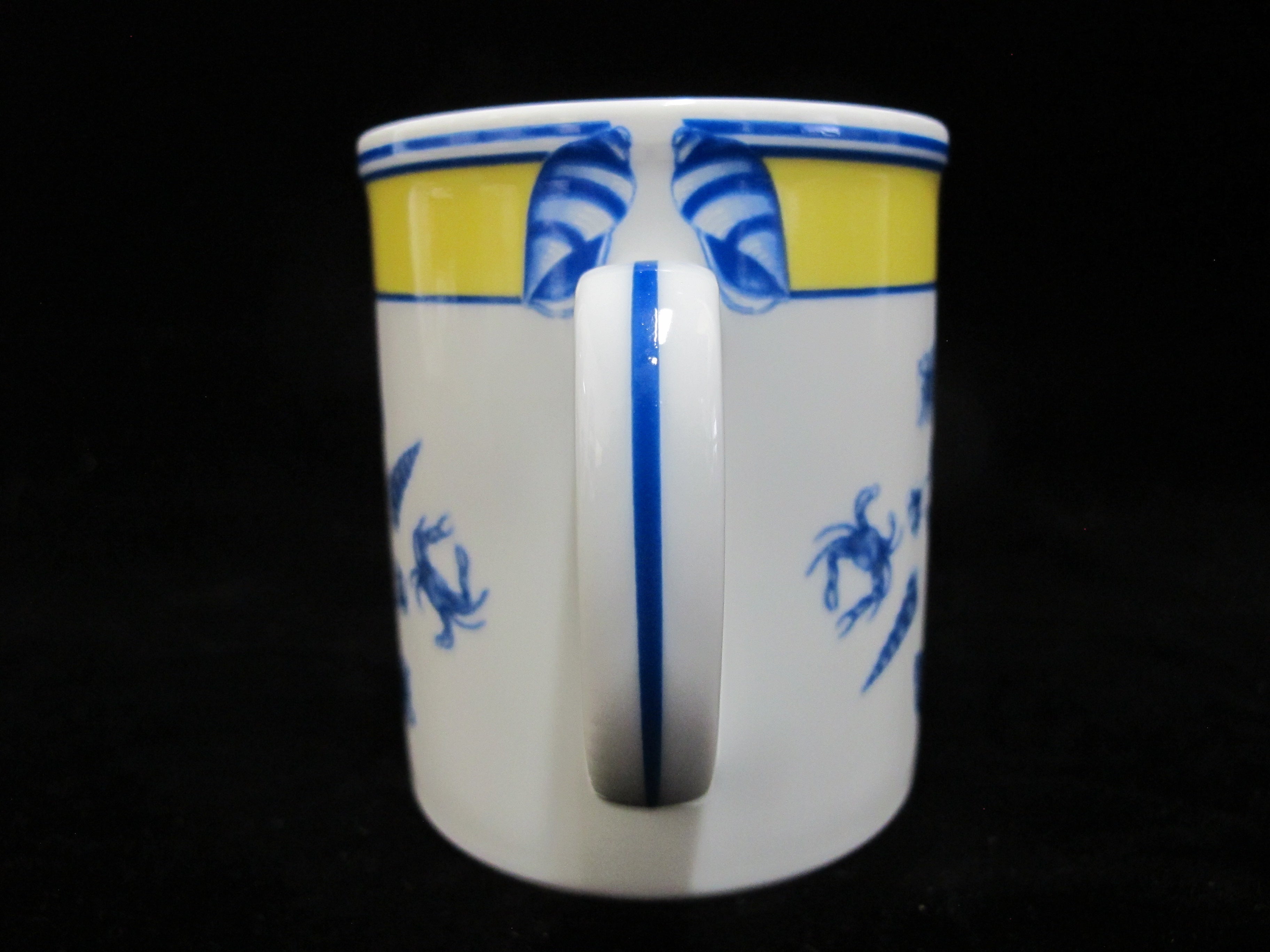 Lynn Chase Costa Azzurra 1988 pattern coffee cup. Ceramic in white with blue whimsical seashell, floral, and crab design with yellow and blue highlighted border. Perfect cup for your morning wake up at the beach house. Excellent condition, no chips, cracks, or repairs. Multiple available.