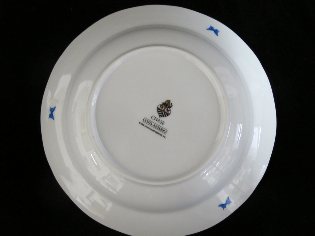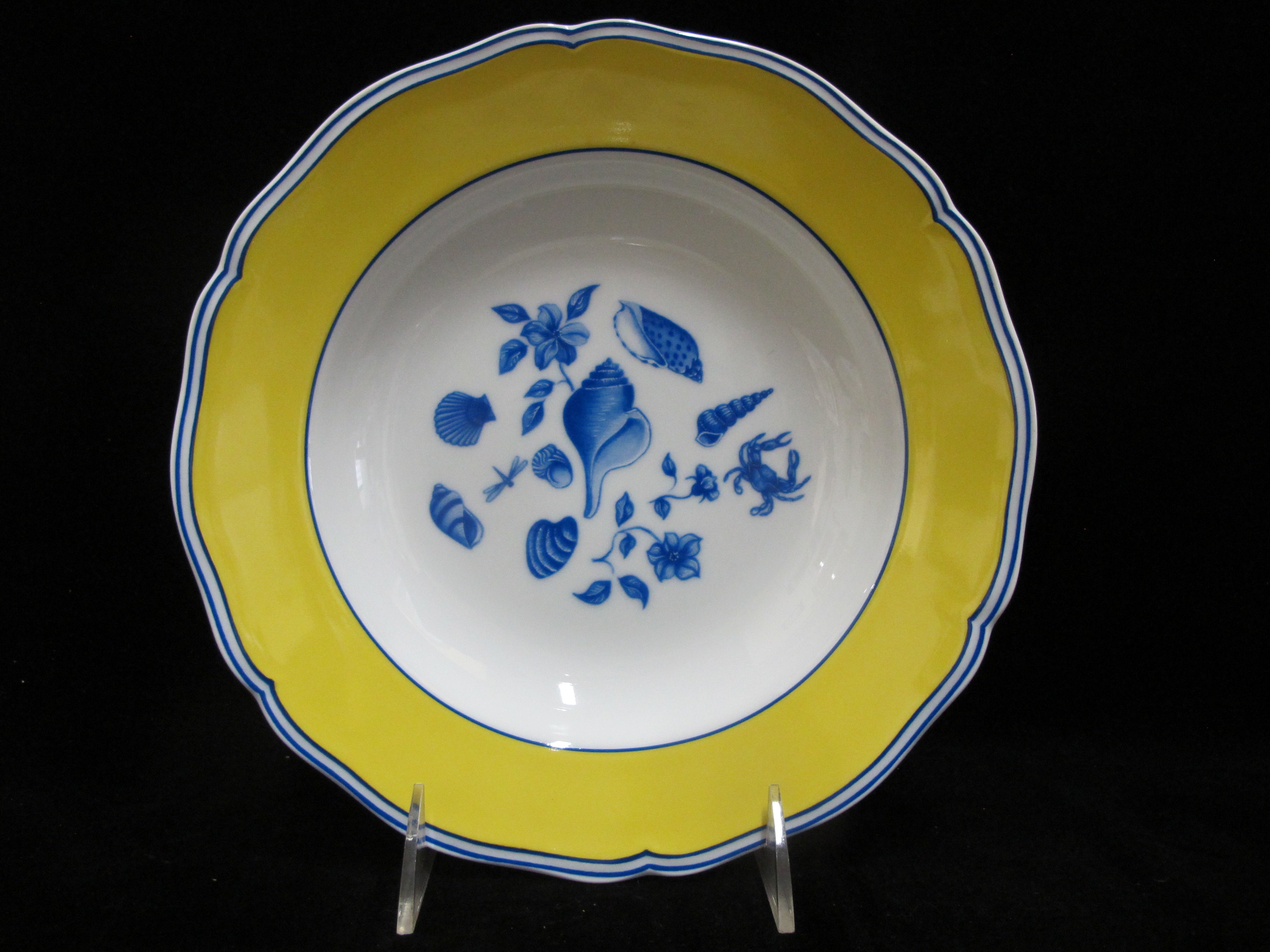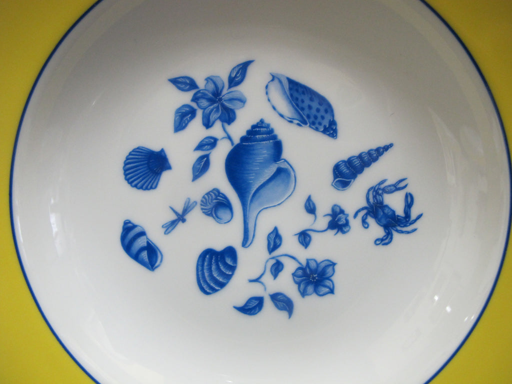 Lynn Chase Costa Azzurra 1988 pattern rimmed soup bowl. Ceramic in white with blue whimsical seashell, floral, and crab design with yellow and blue highlighted border. Perfect for a hot bowl of chowder at the beach house. Excellent condition, no chips, cracks, or repairs. Multiple available.