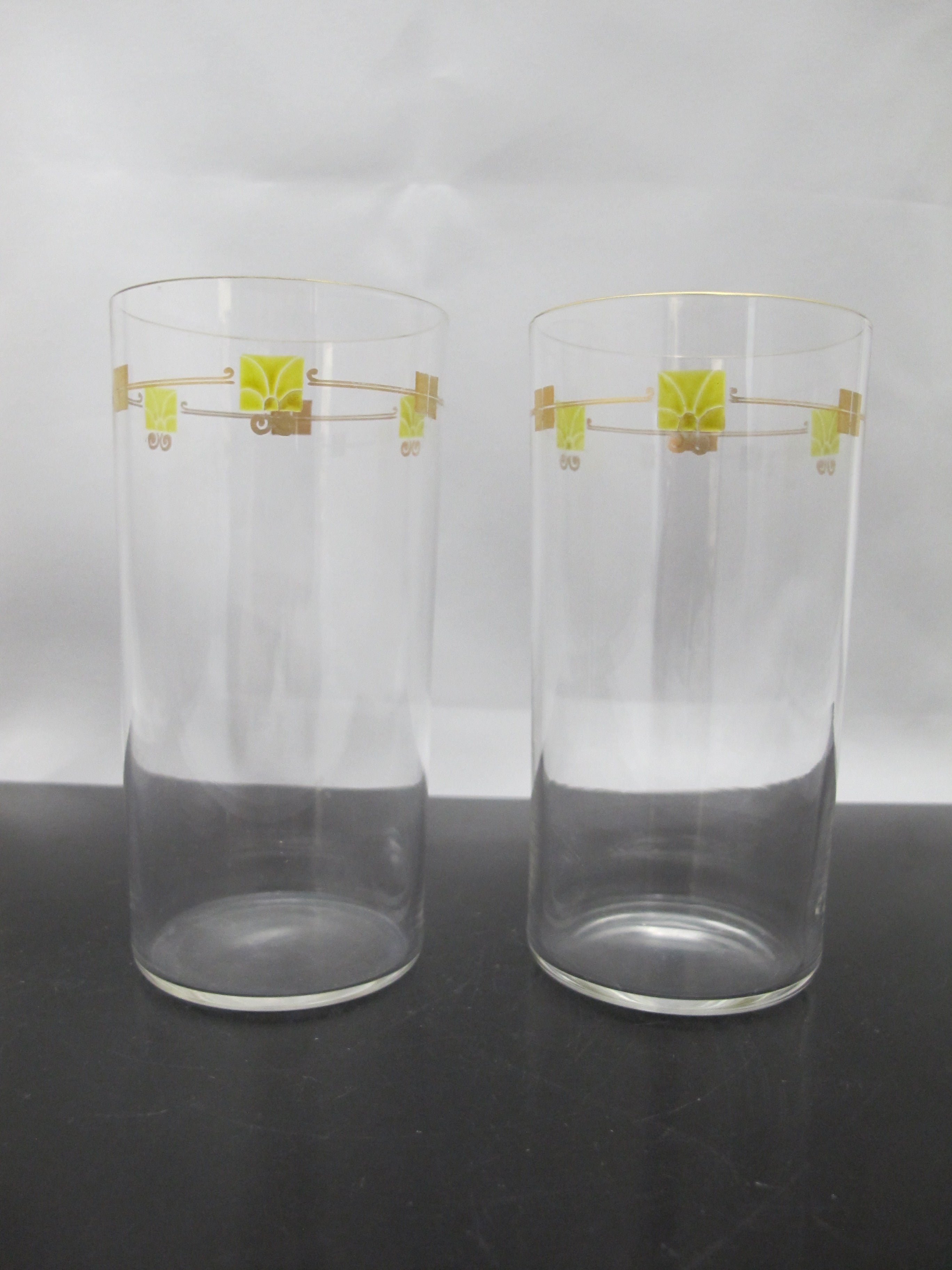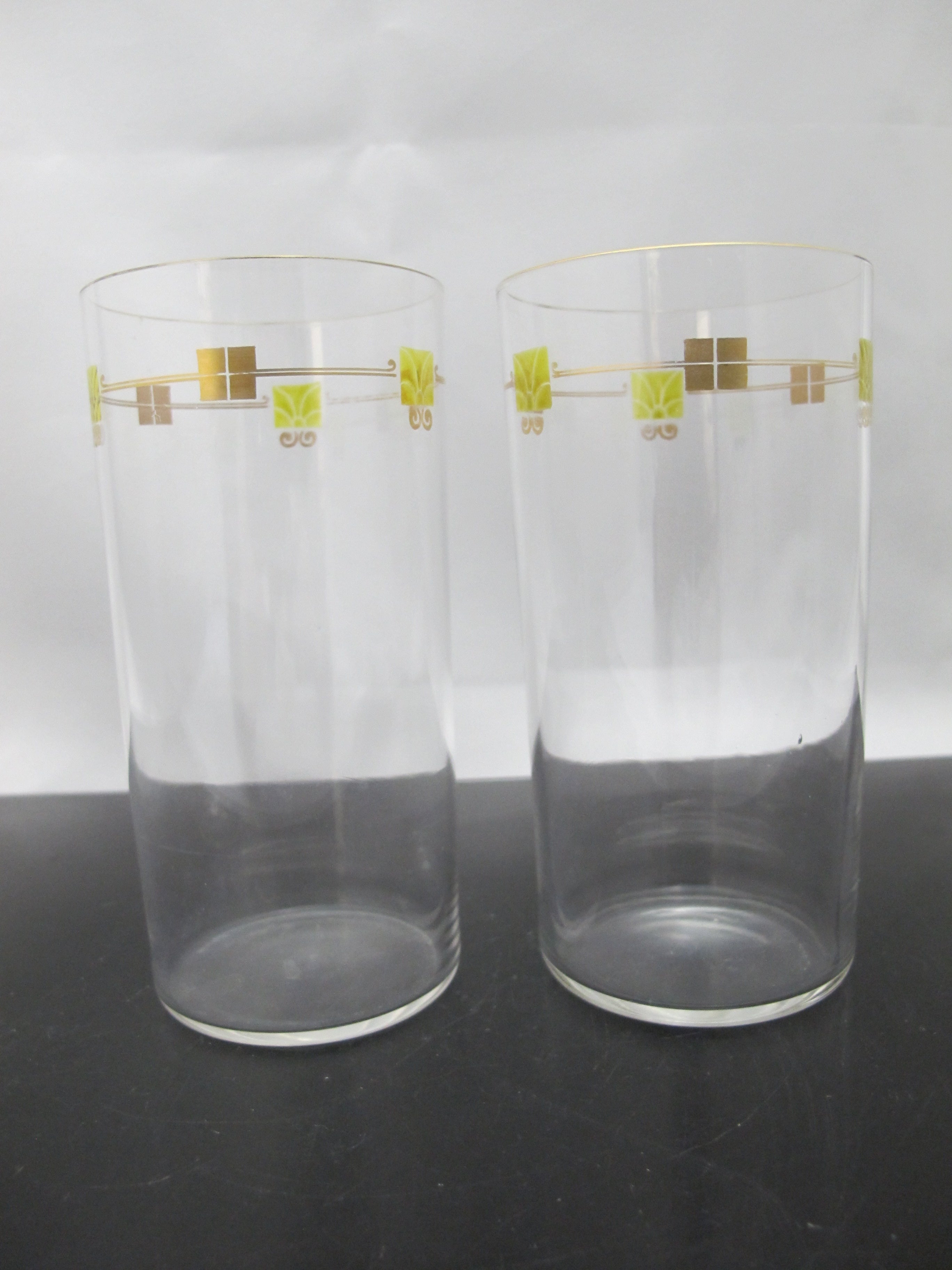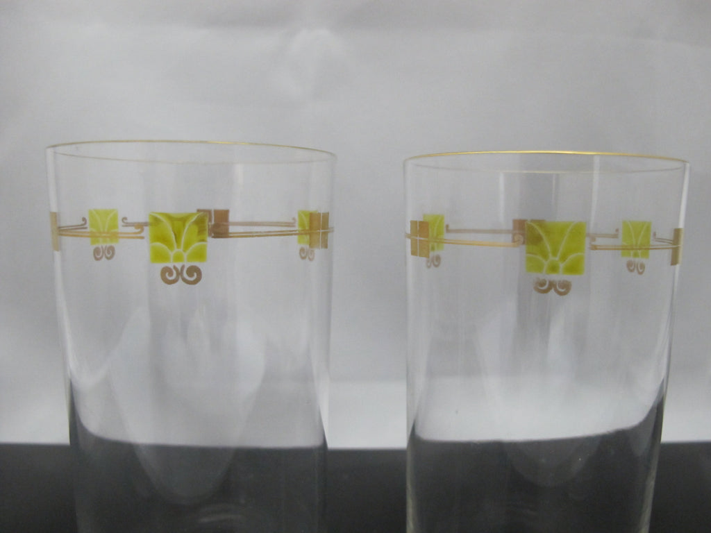 MCM Mid Century Modern Gold & Green Enamel Crystal WATER Tumbler Glass Pair