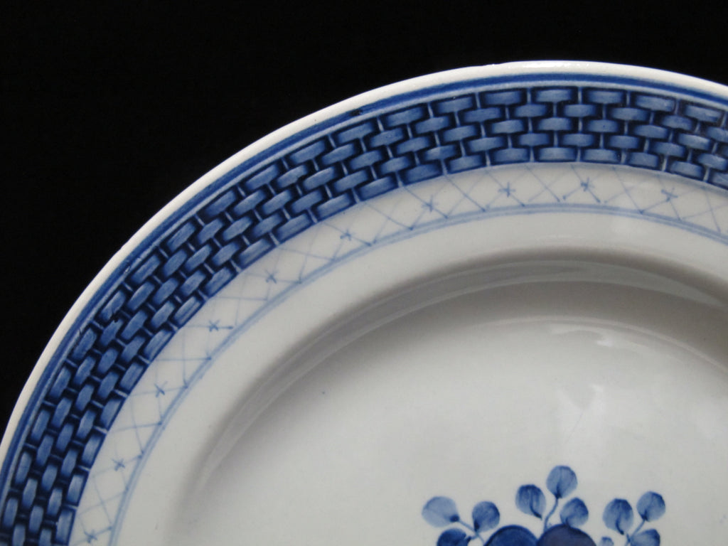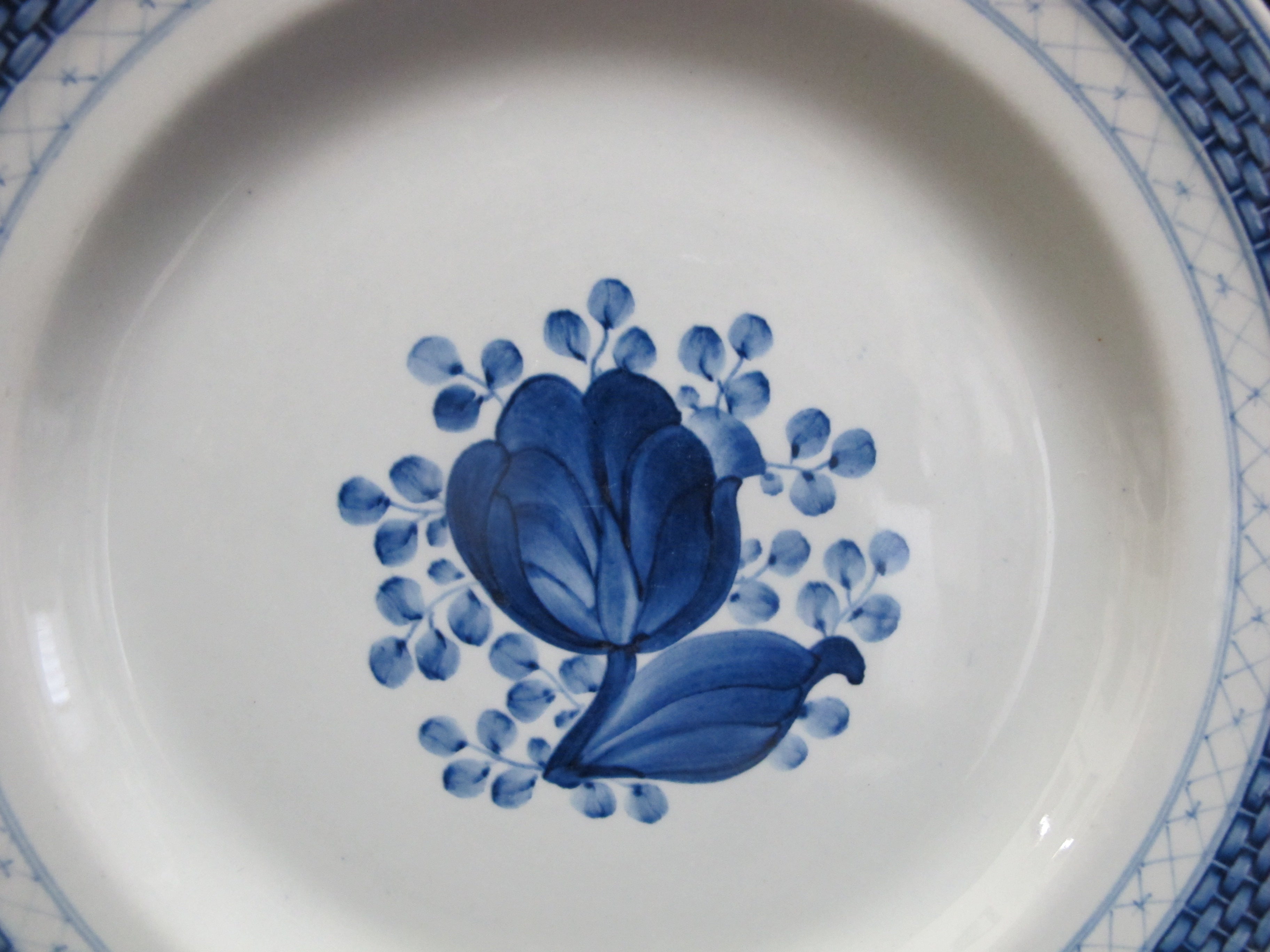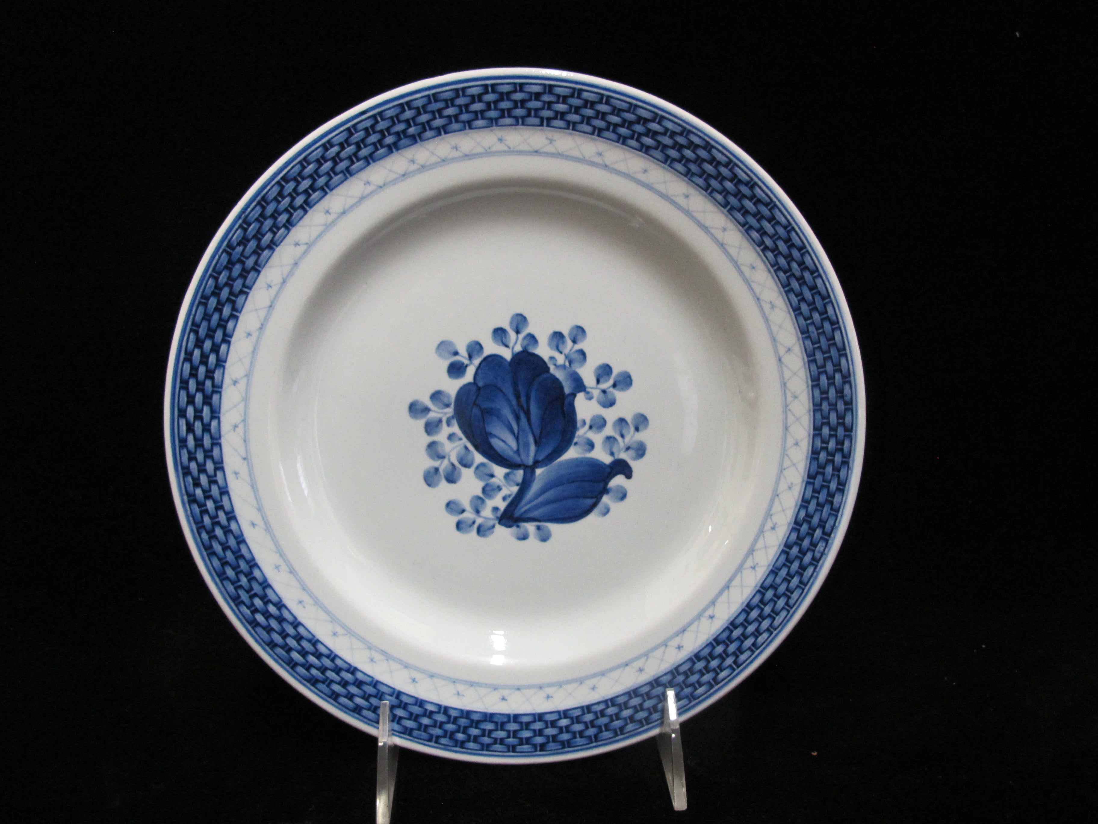 Royal Copenhagen, Denmark, Aluminia Faience Tranquebar blue pattern luncheon plate set of 3. Cobalt blue flower framed by basket weave design.