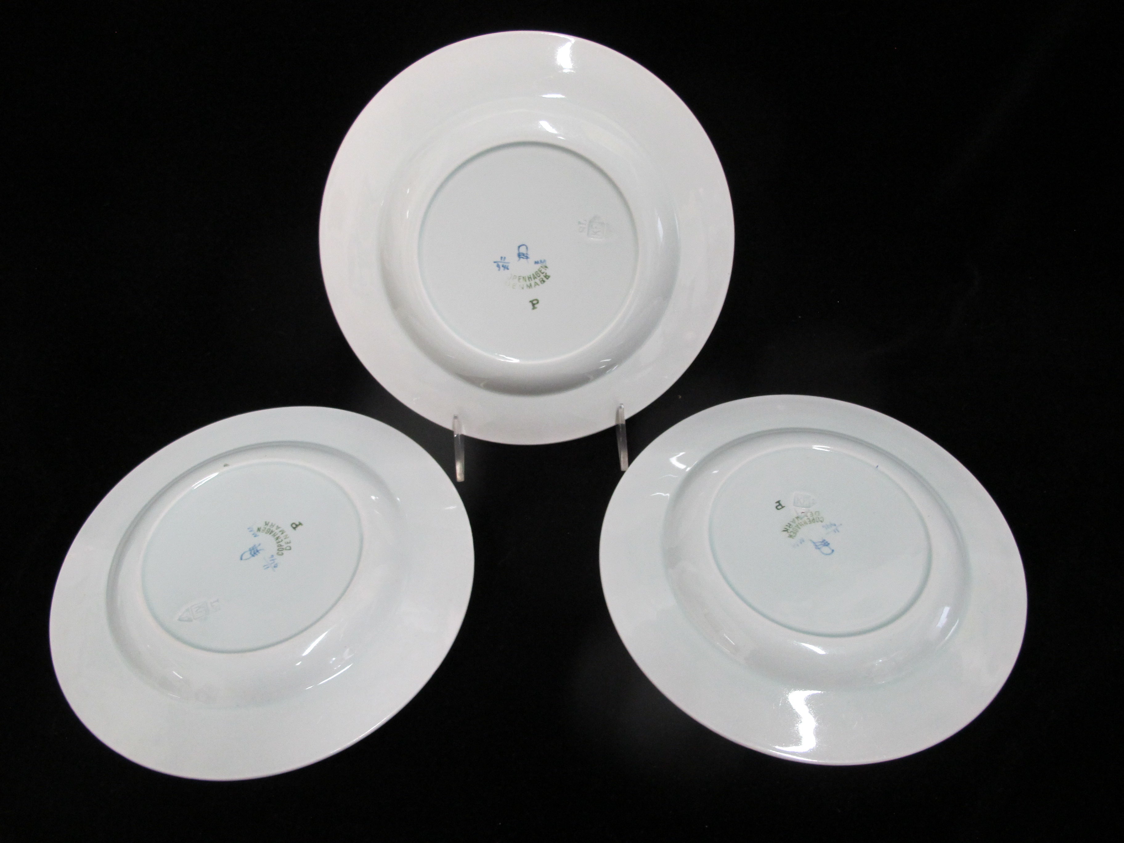 One plate has some very minor flea bits in the glaze at the rim, as photographed. All others are in excellent condition, no chips, cracks, or repairs. Minor surface scratching.