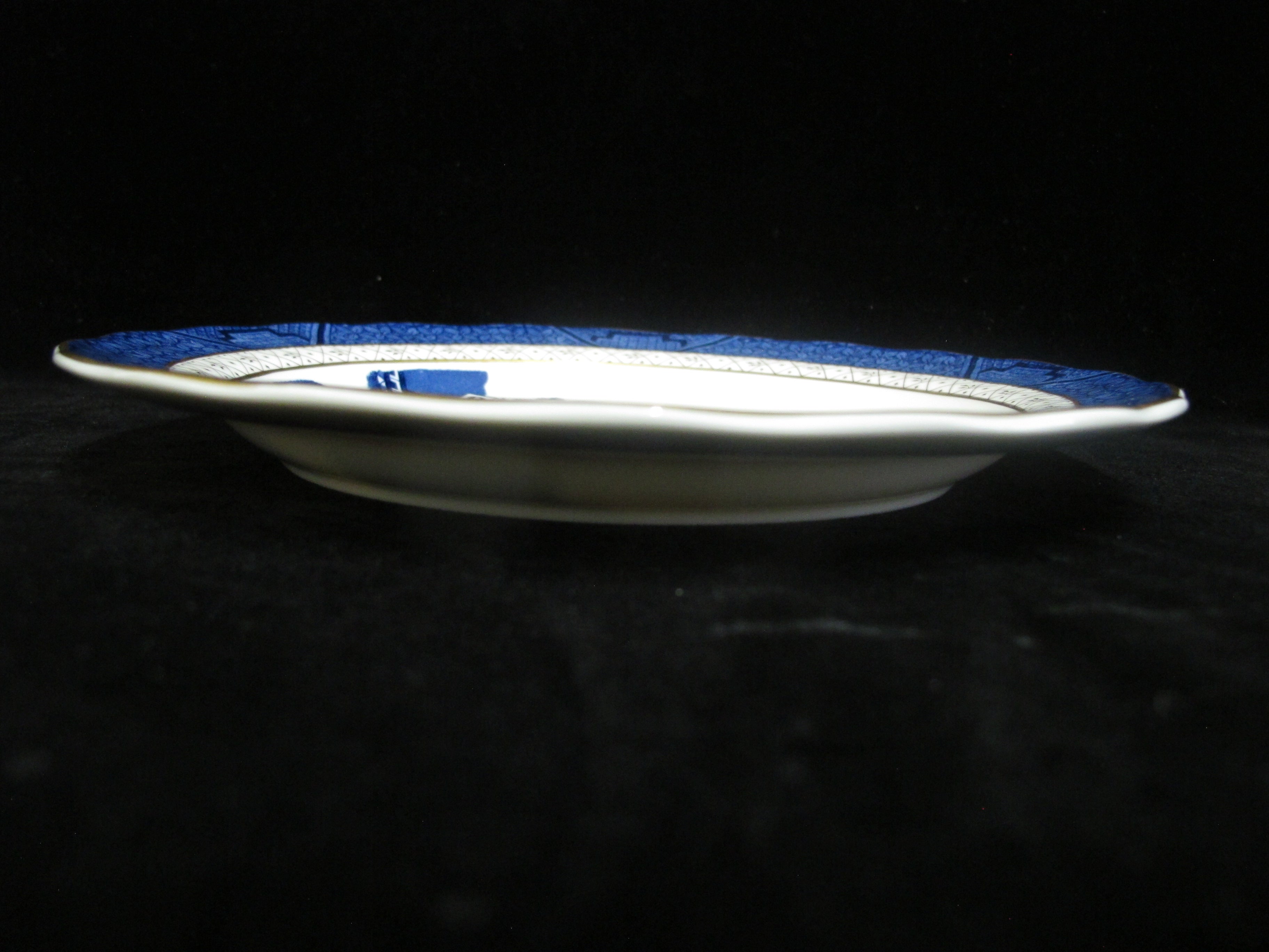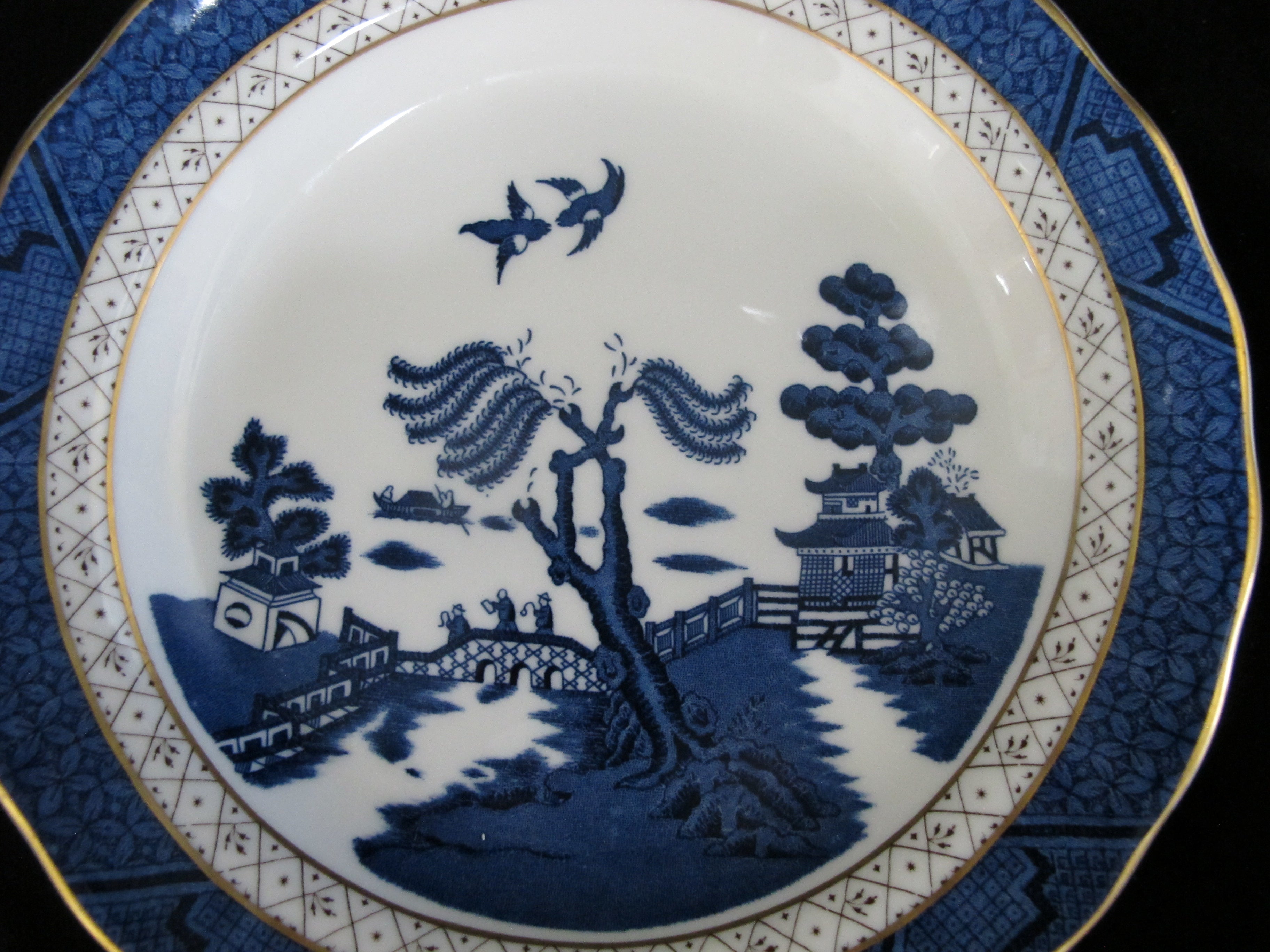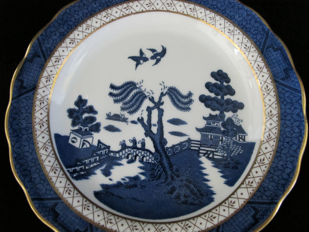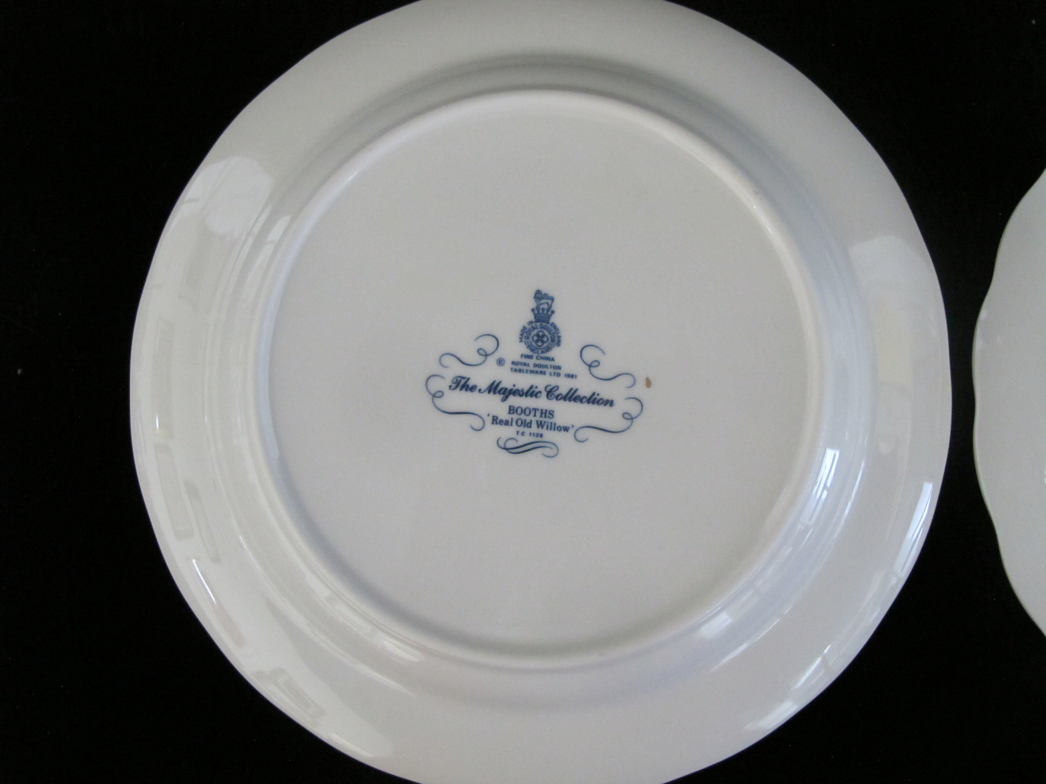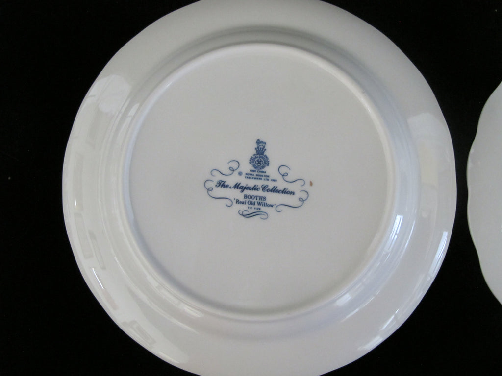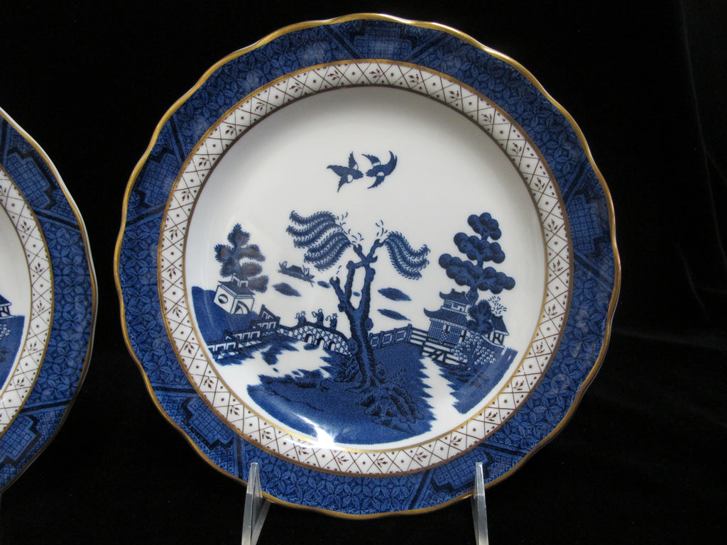 Elegant set of 2 Royal Doulton fine China Booths 'Real Old Willow' salad plates from the Majestic collection. Ornate blue village and landscape design with gold accents. Made in England.  Each plate measures 8 1/2" x  1" tall. Both are in excellent condition, no chips, cracks, or repairs. Multiple sets available.