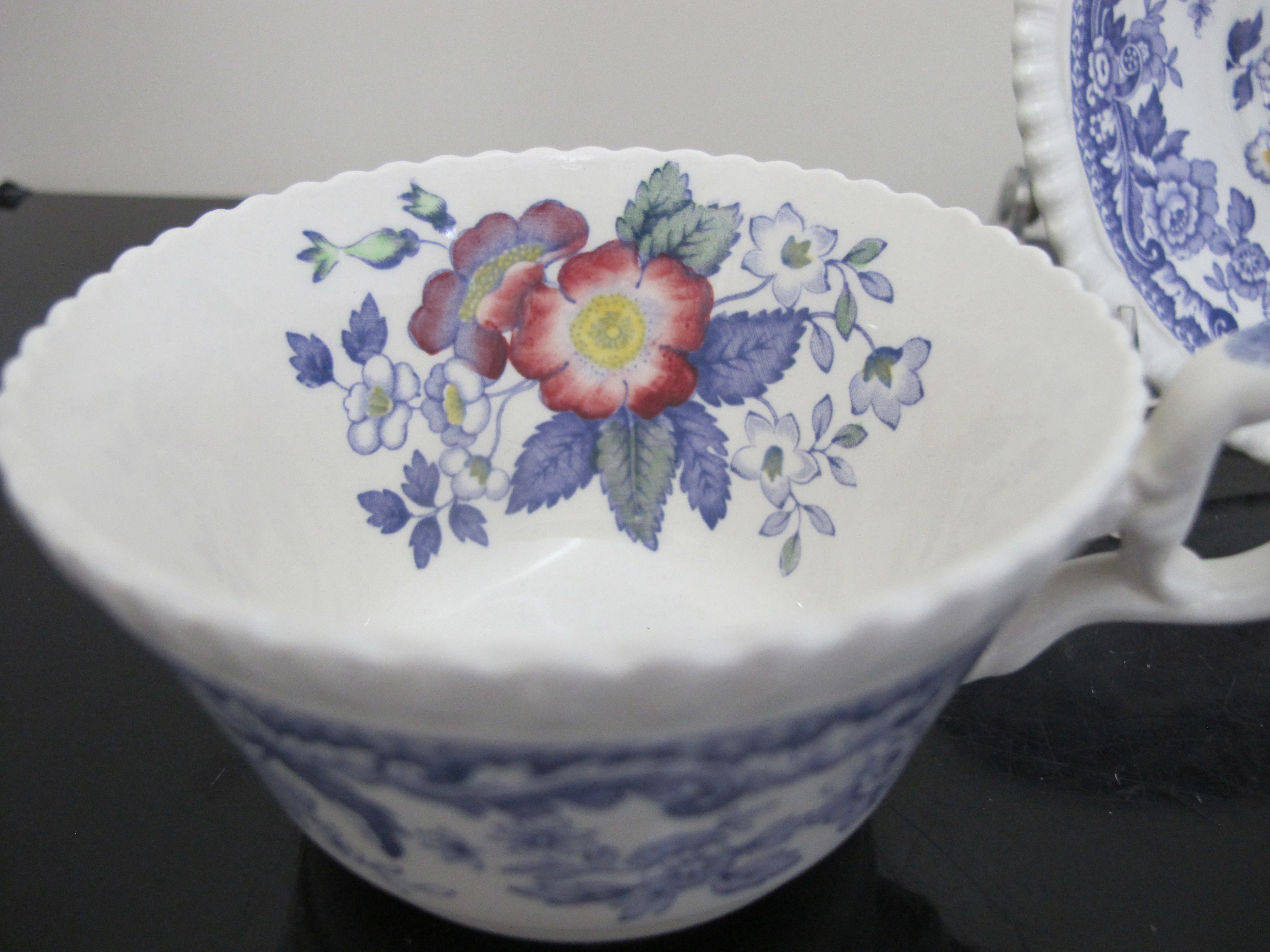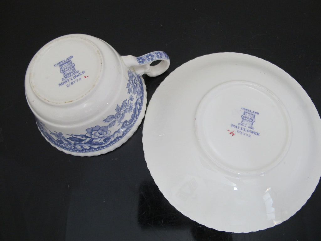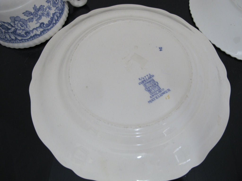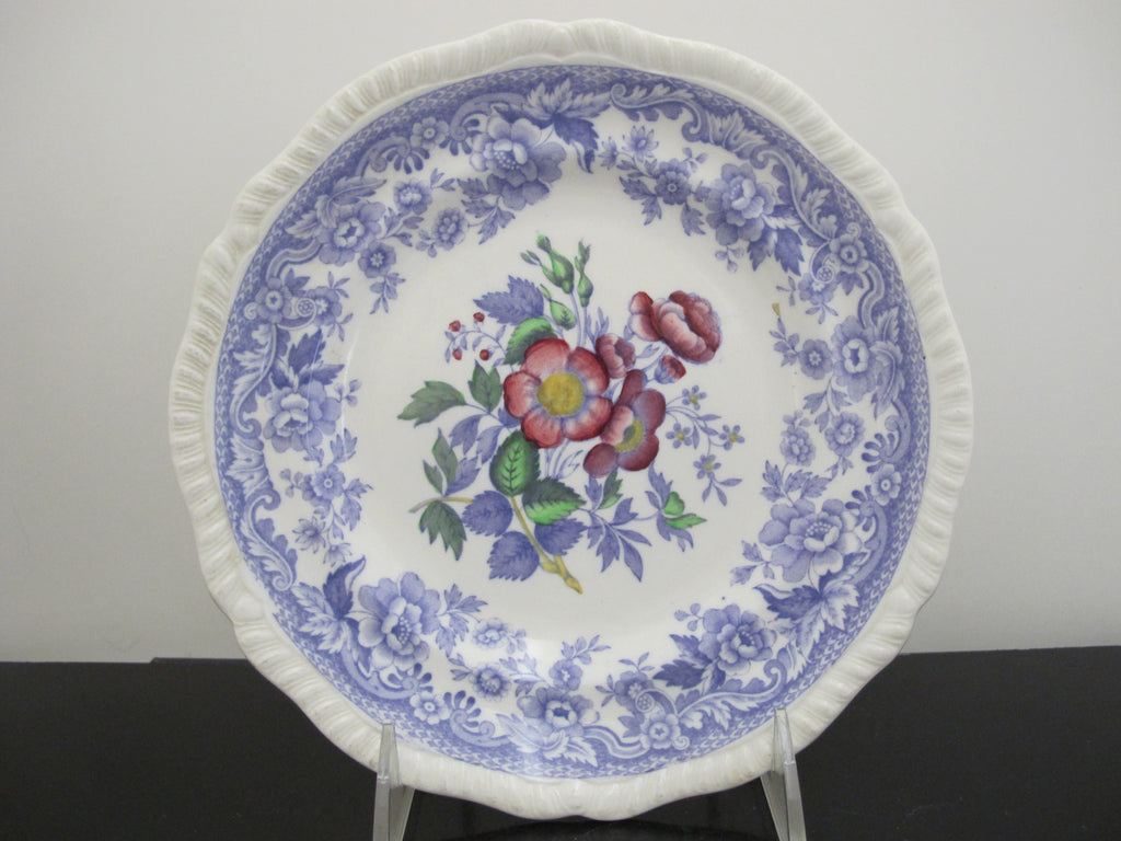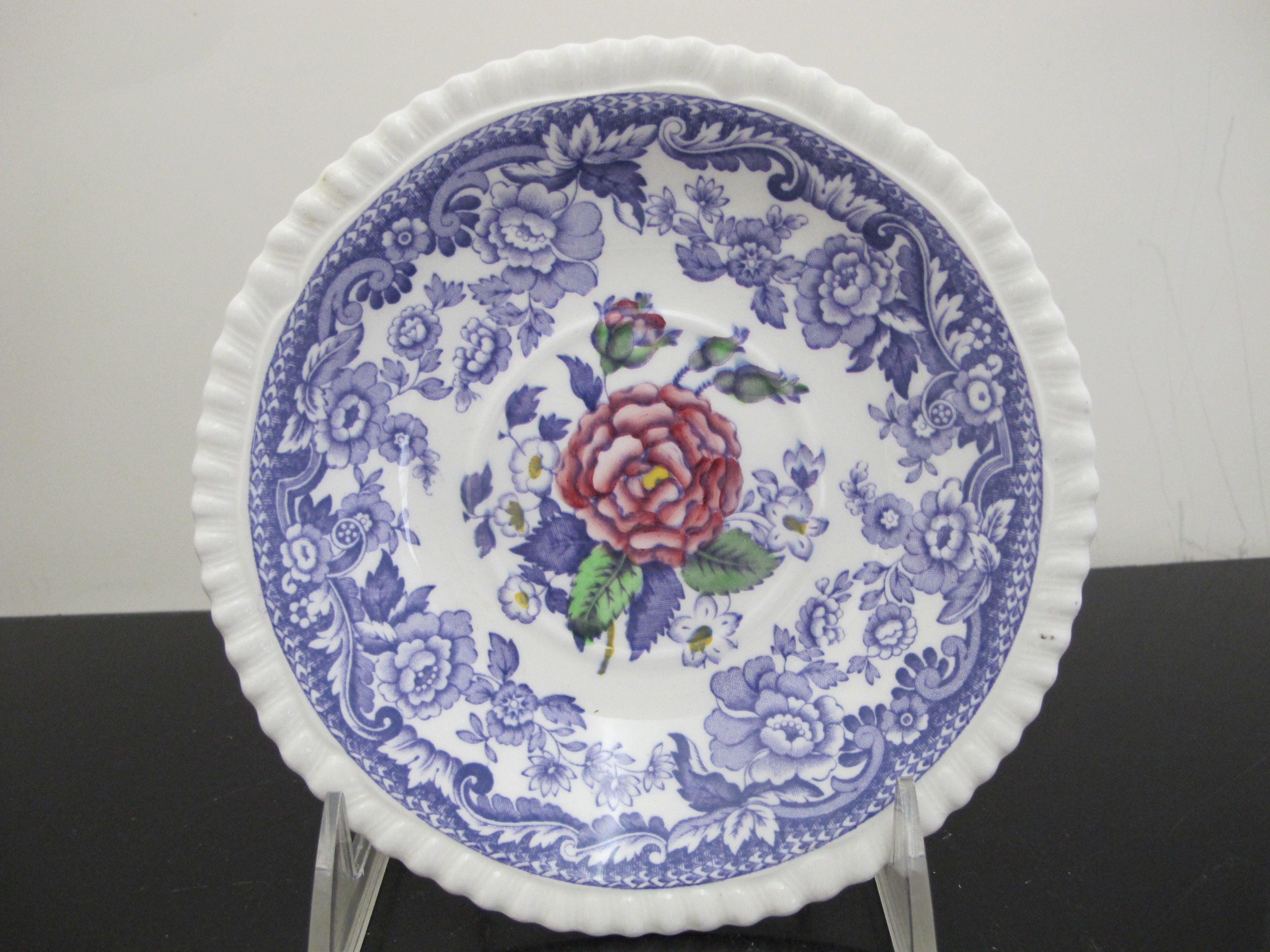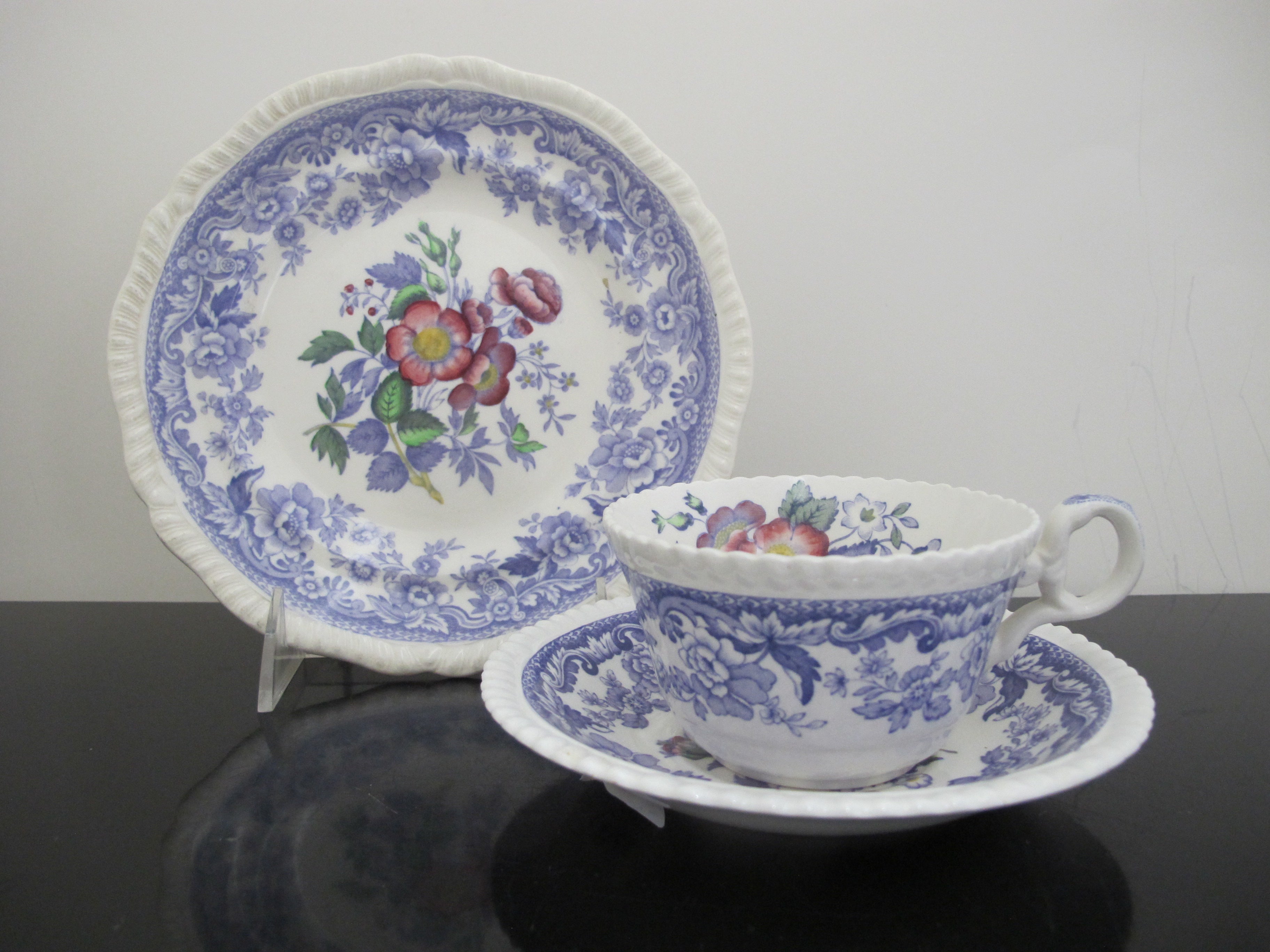 Spode Copeland luncheon set in lavender rose Mayflower pattern with Gadroon edging. Includes 7 3/4" plate, 6" saucer, and tea cup. Each is hallmarked at base. No chips, cracks, or repairs.
