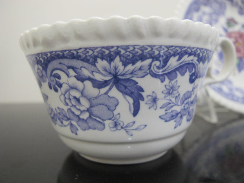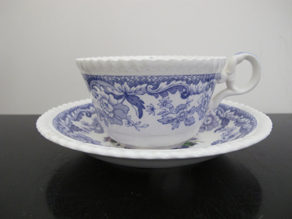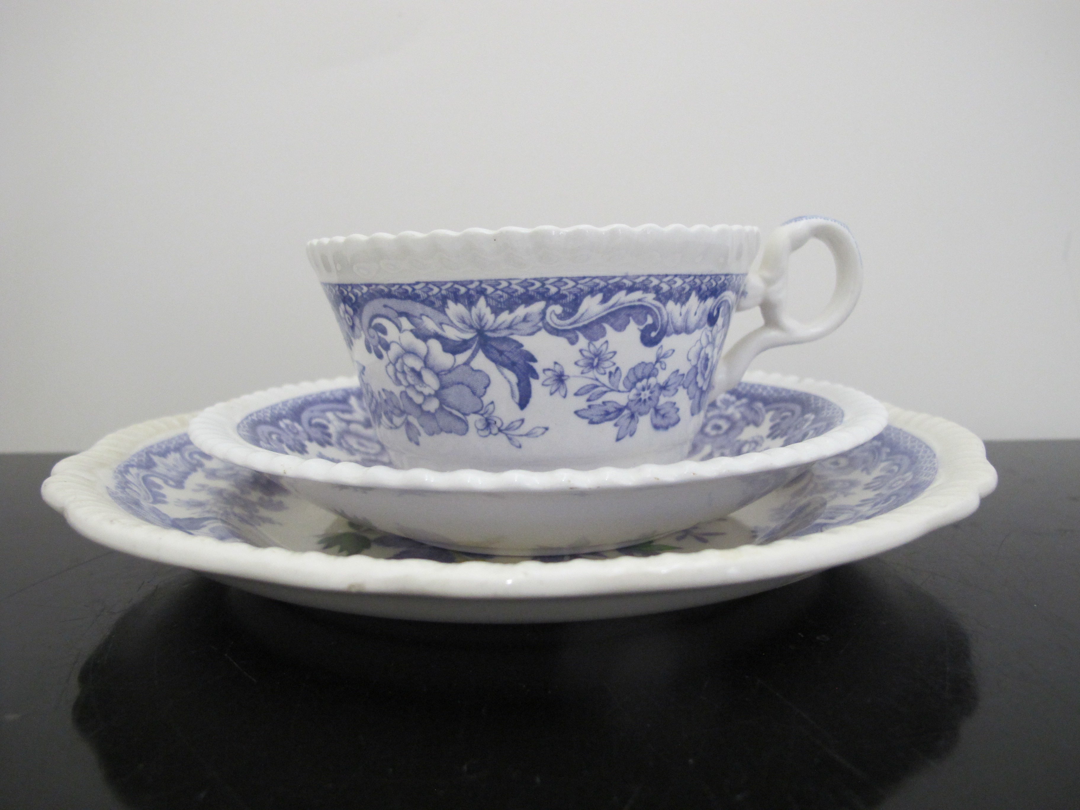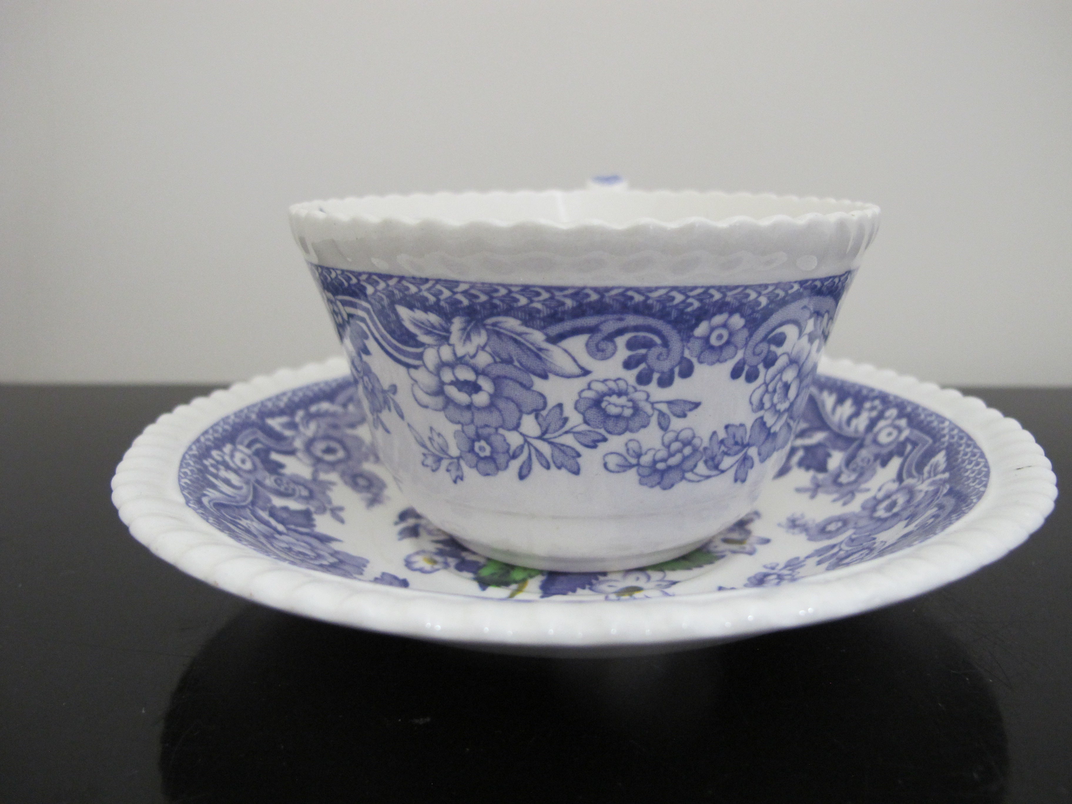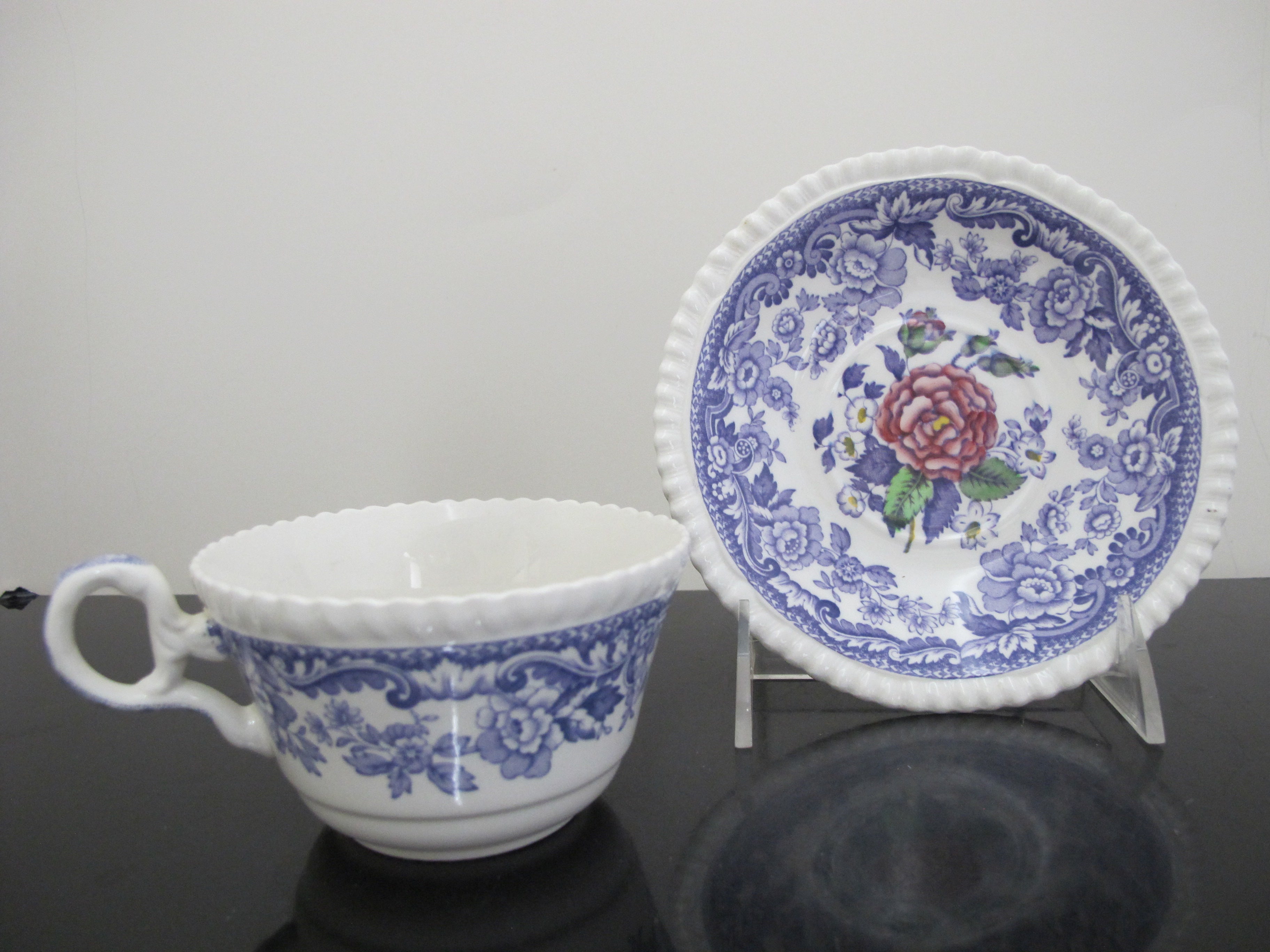 Spode Copeland luncheon set in lavender rose Mayflower pattern with Gadroon edging. Includes 7 3/4" plate, 6" saucer, and tea cup. Each is hallmarked at base. No chips, cracks, or repairs.