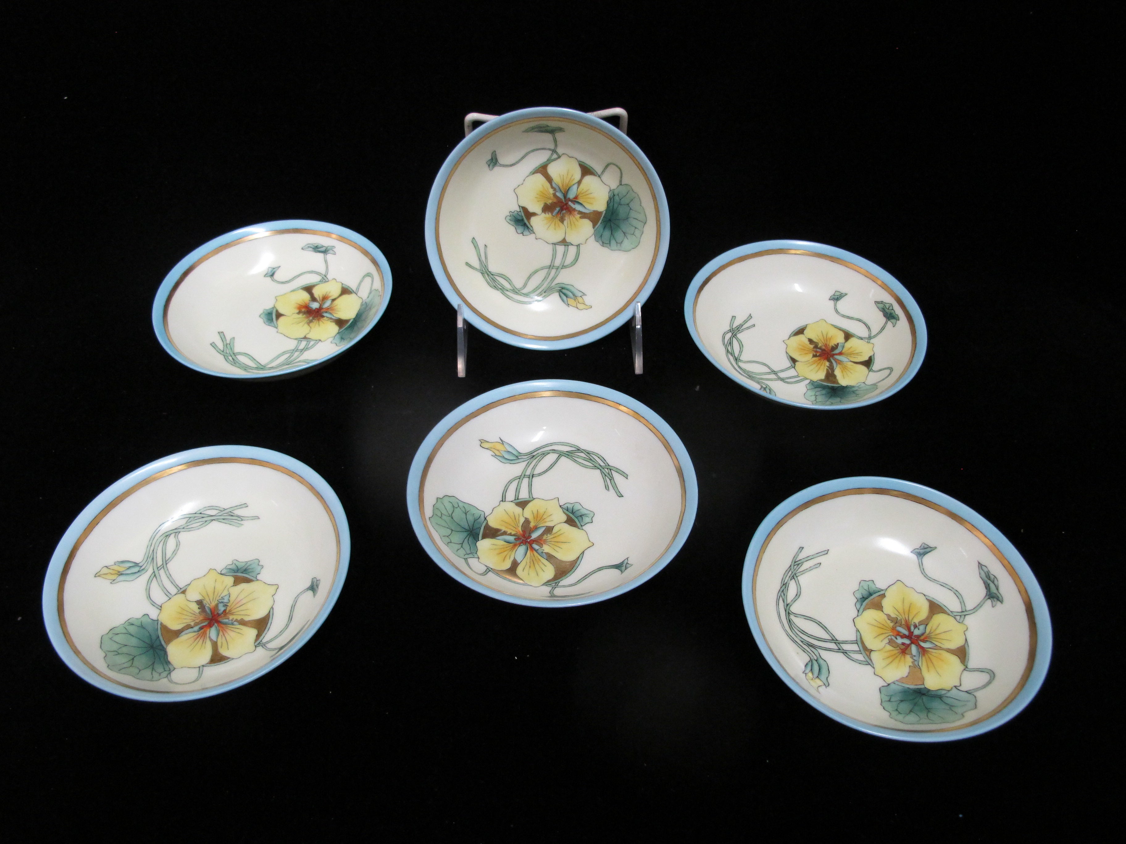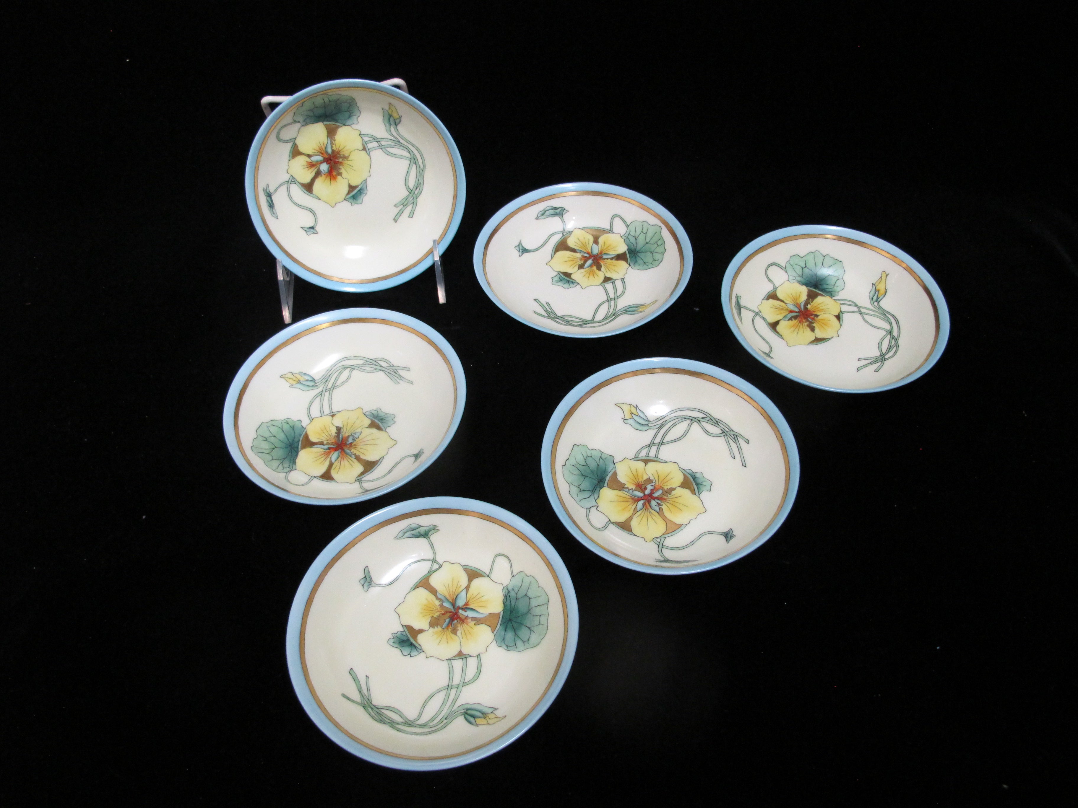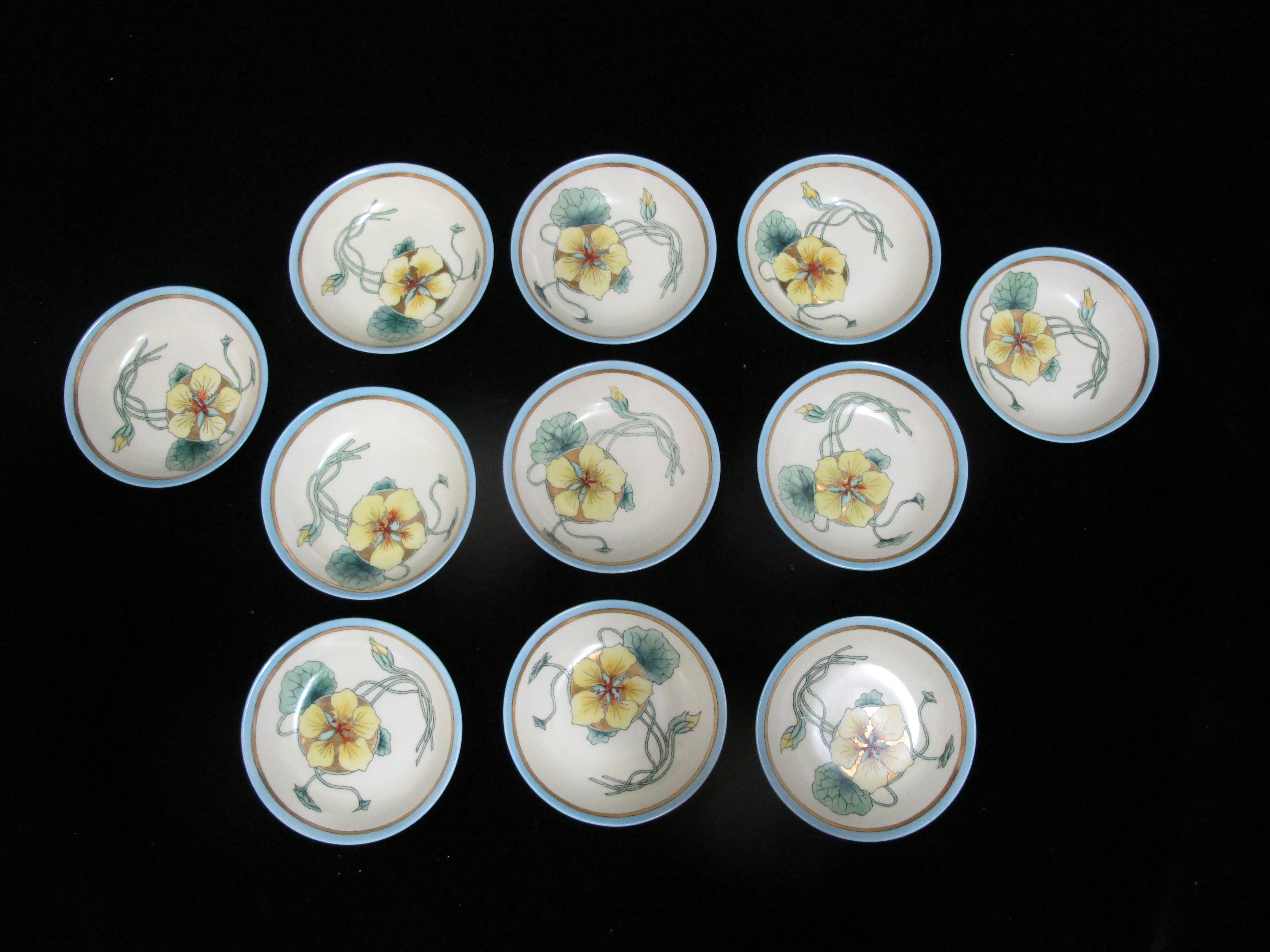 Pretty as can be T&V Limoges France porcelain bowl set of 11. Small bowls or saucers, each measures 5" wide x 1" tall. White with hand painted scrolling Art Nouveau style yellow floral print with green leaves and gilt accents. All are in excellent condition, no chips, cracks, or repairs.