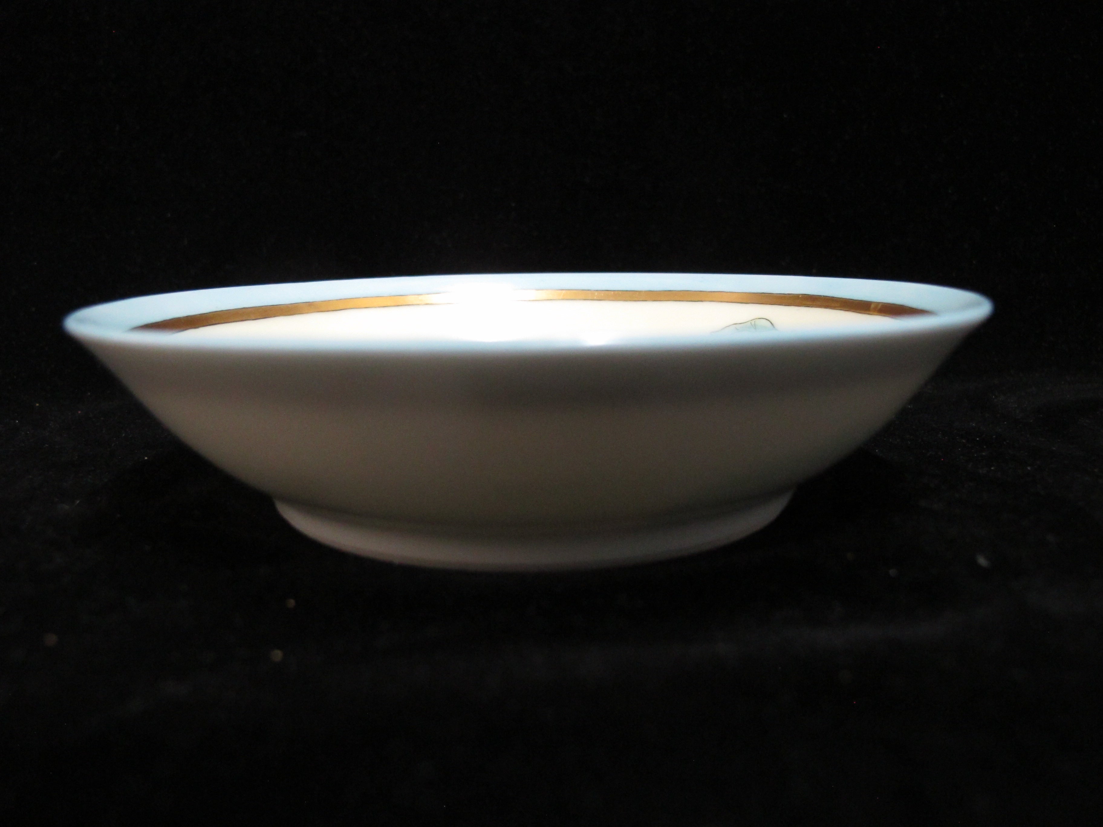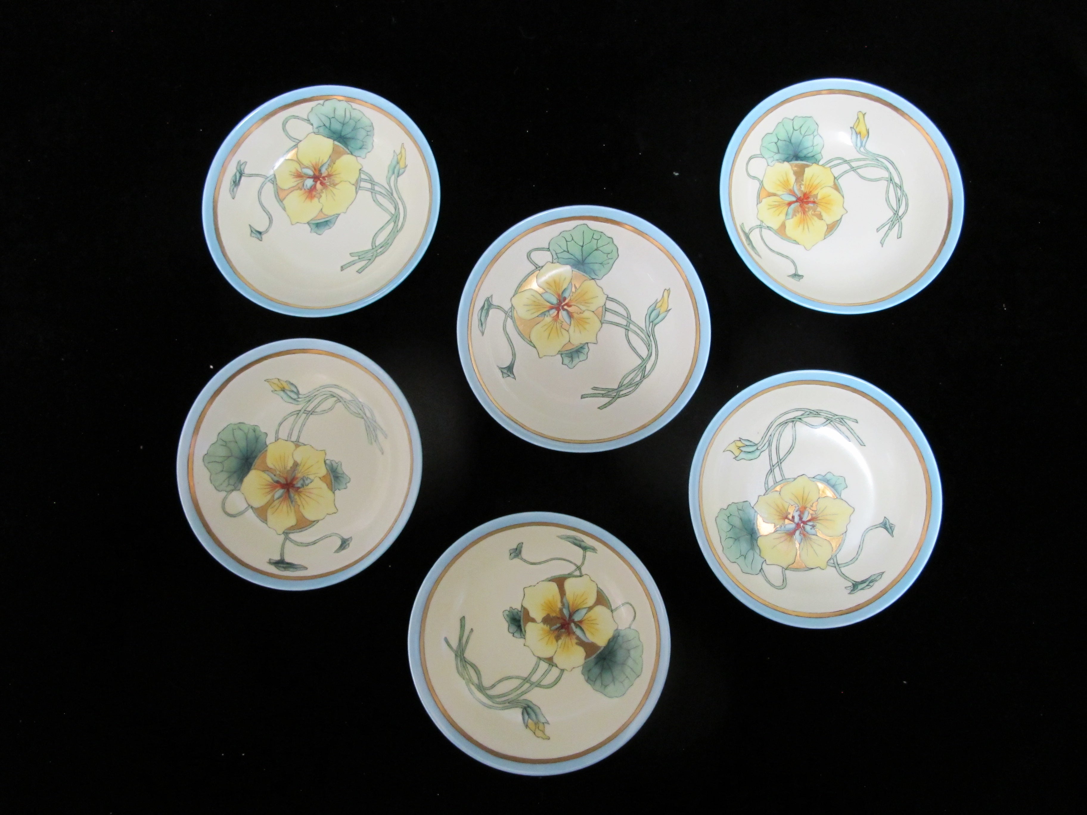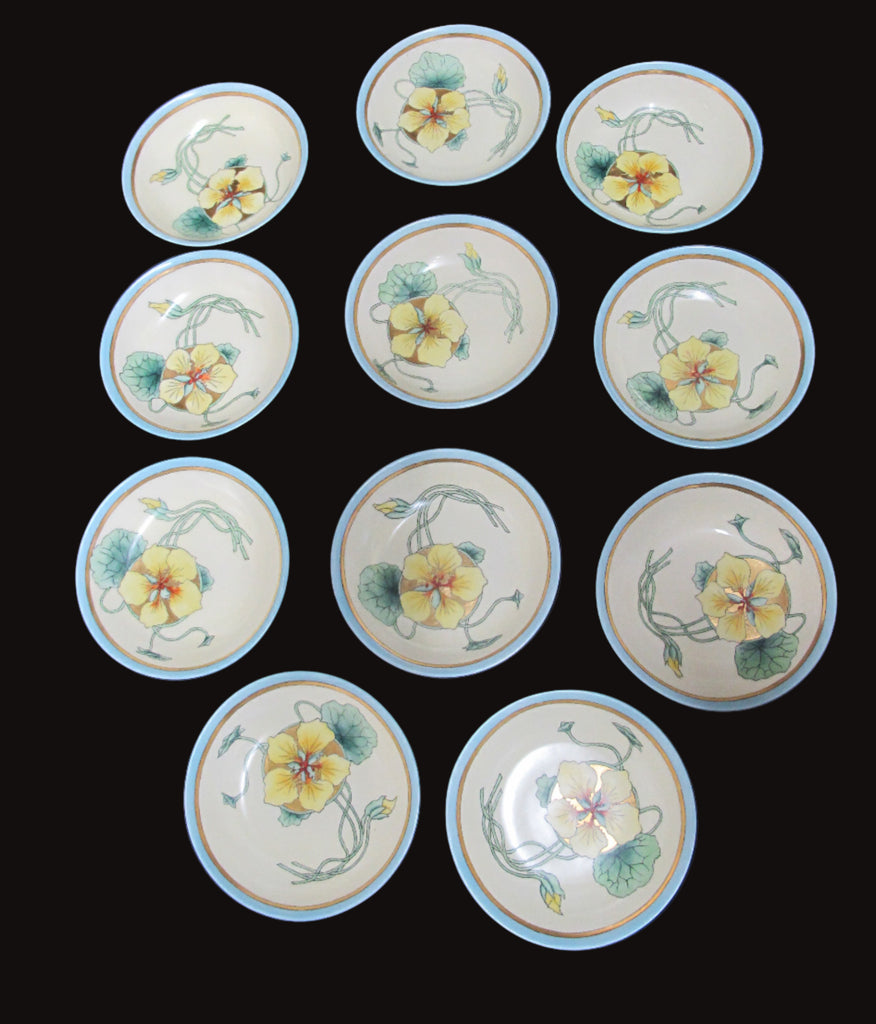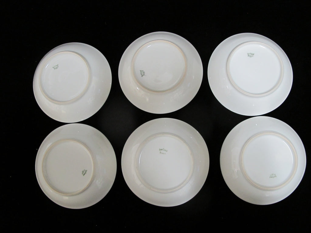 Pretty as can be T&V Limoges France porcelain bowl set of 11. Small bowls or saucers, each measures 5" wide x 1" tall. White with hand painted scrolling Art Nouveau style yellow floral print with green leaves and gilt accents. All are in excellent condition, no chips, cracks, or repairs.