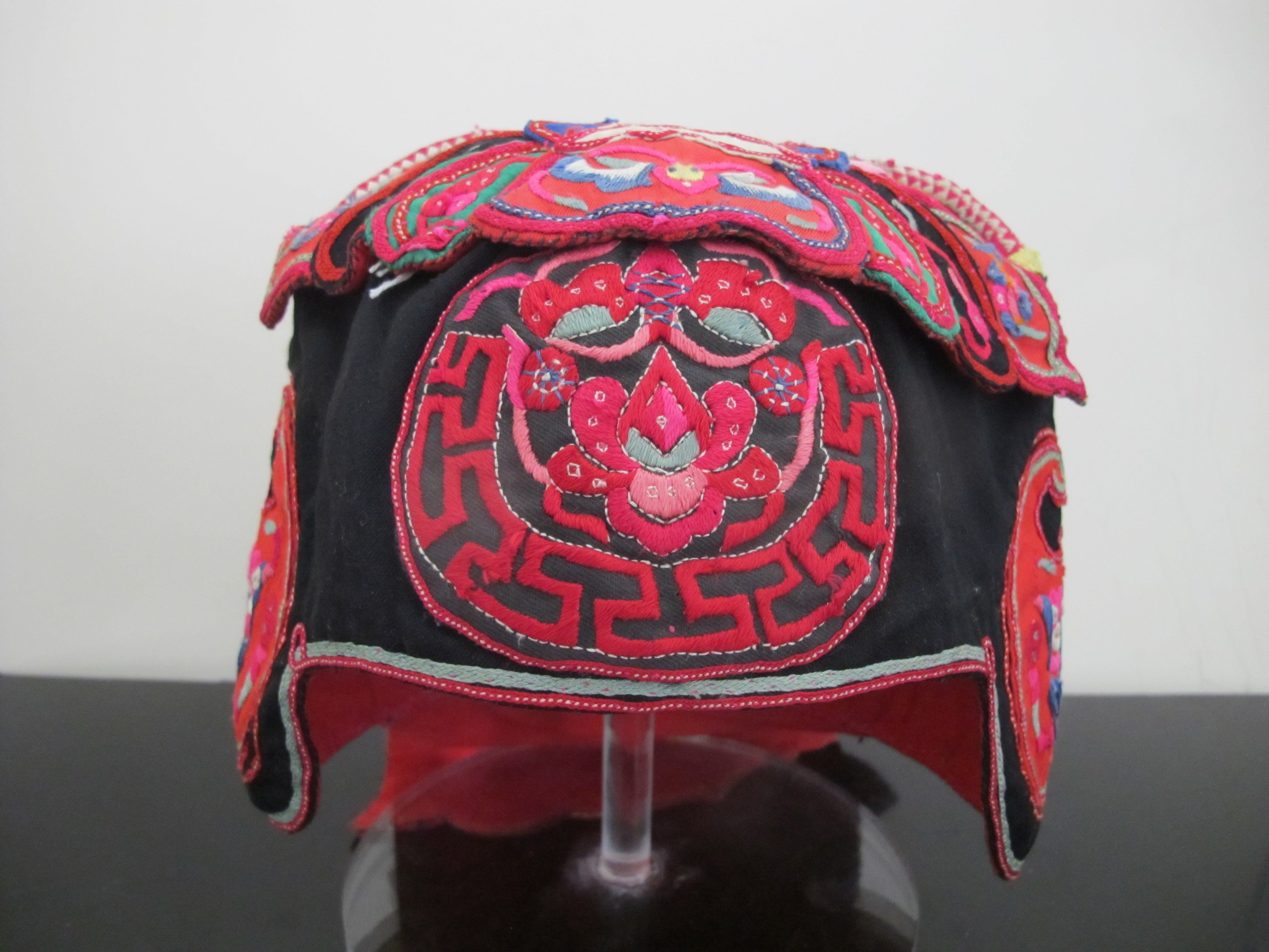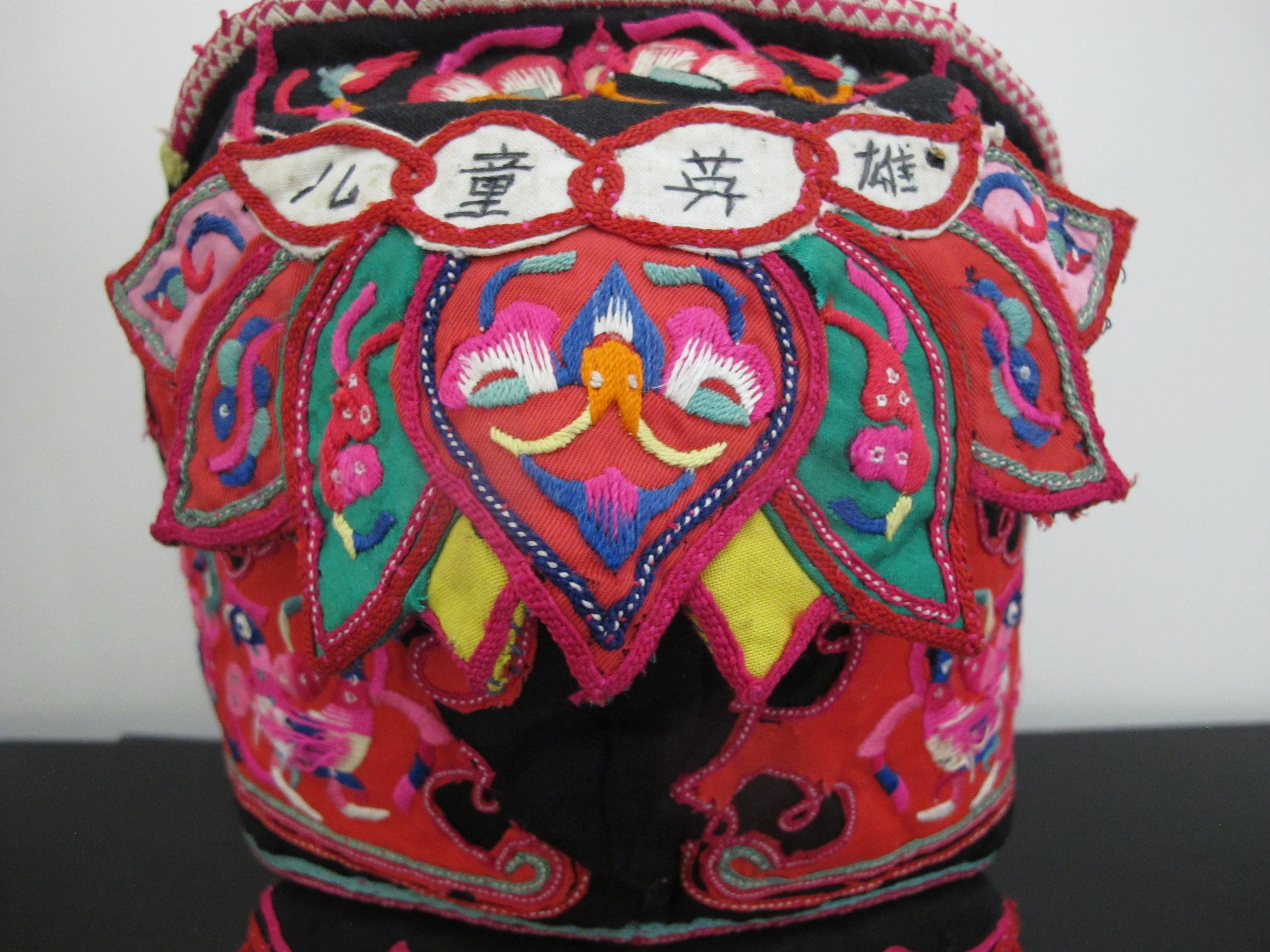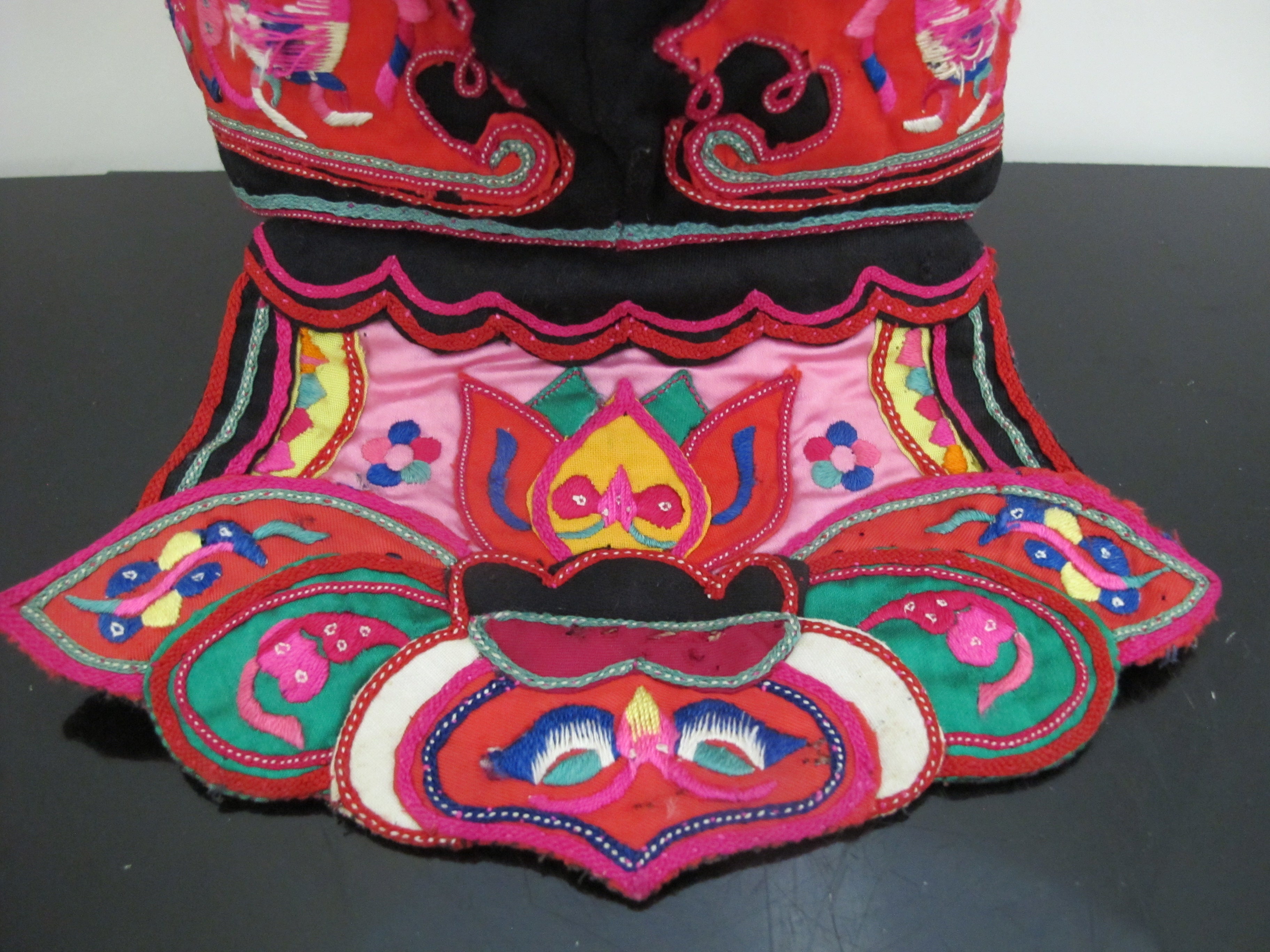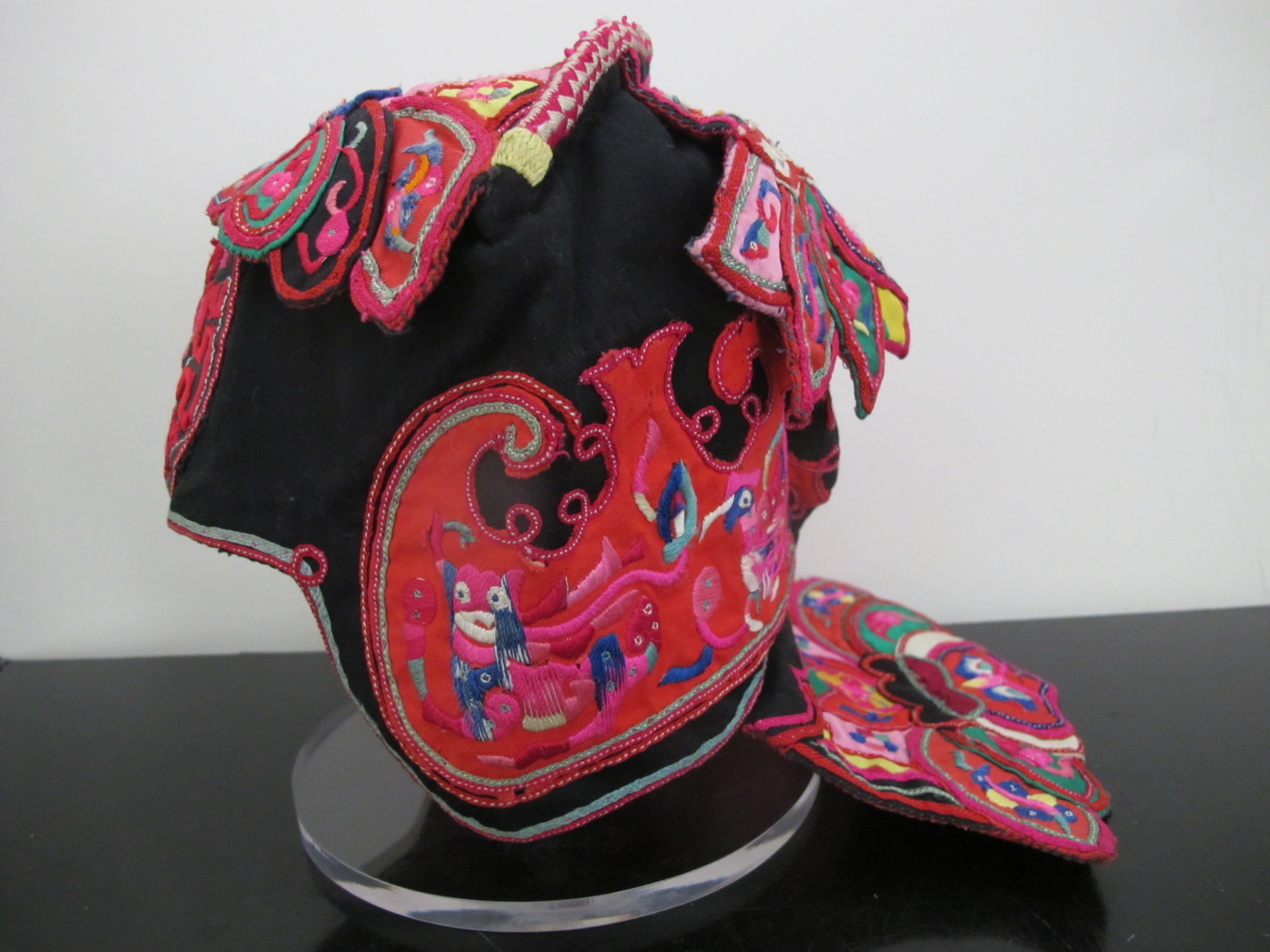 Chinese children's festival hat, likely from the late 19th or early 20th century. These hats were traditionally worn by children, particularly boys, to protect them from evil spirits and bring good fortune. Made of silk and features ornate embroidery and appliqués, in bright colors showing butterflies, birds, dragonflies, and flowers. These hats were often worn during special occasions such as Lunar New Year celebrations and festivals.