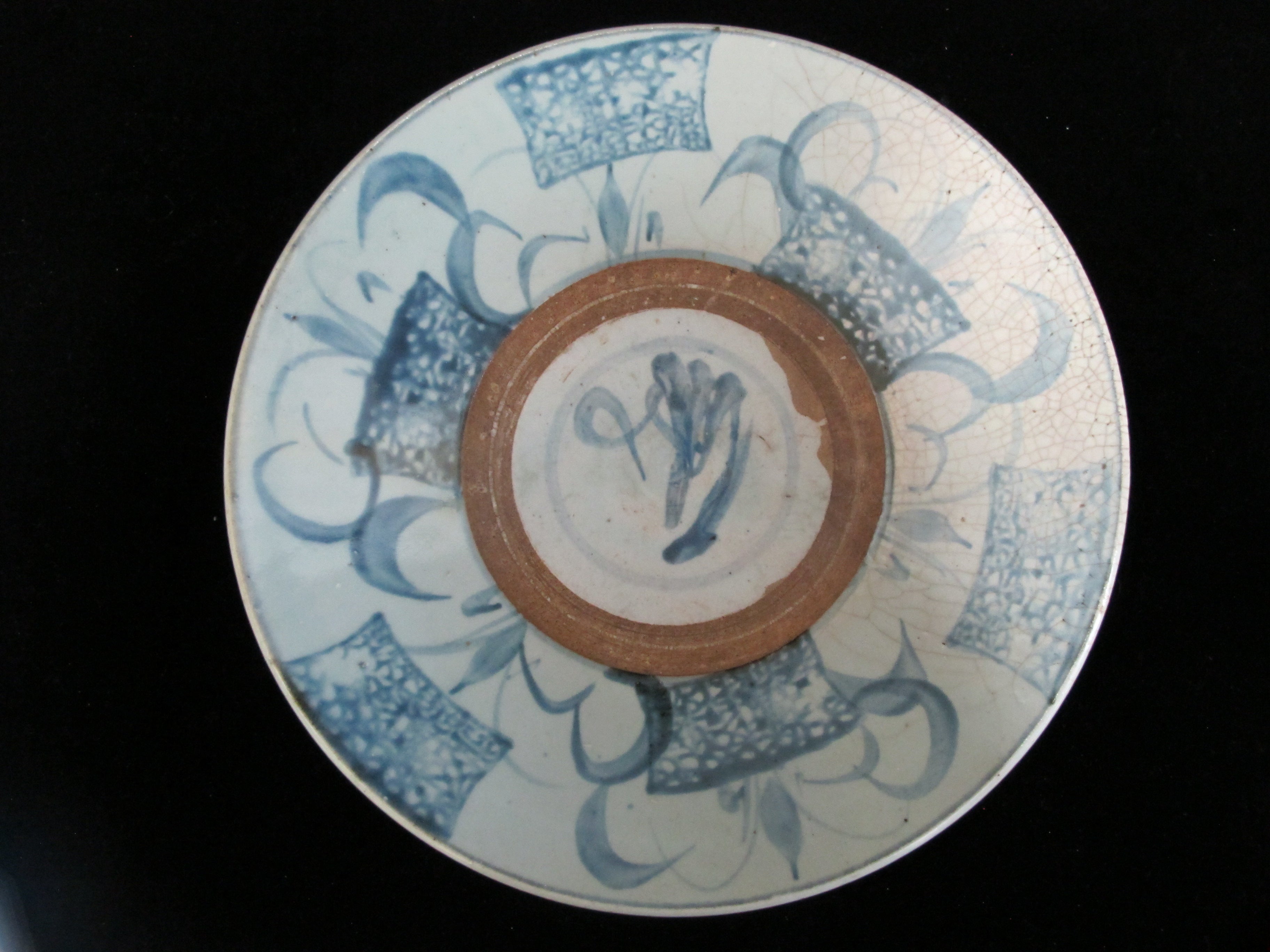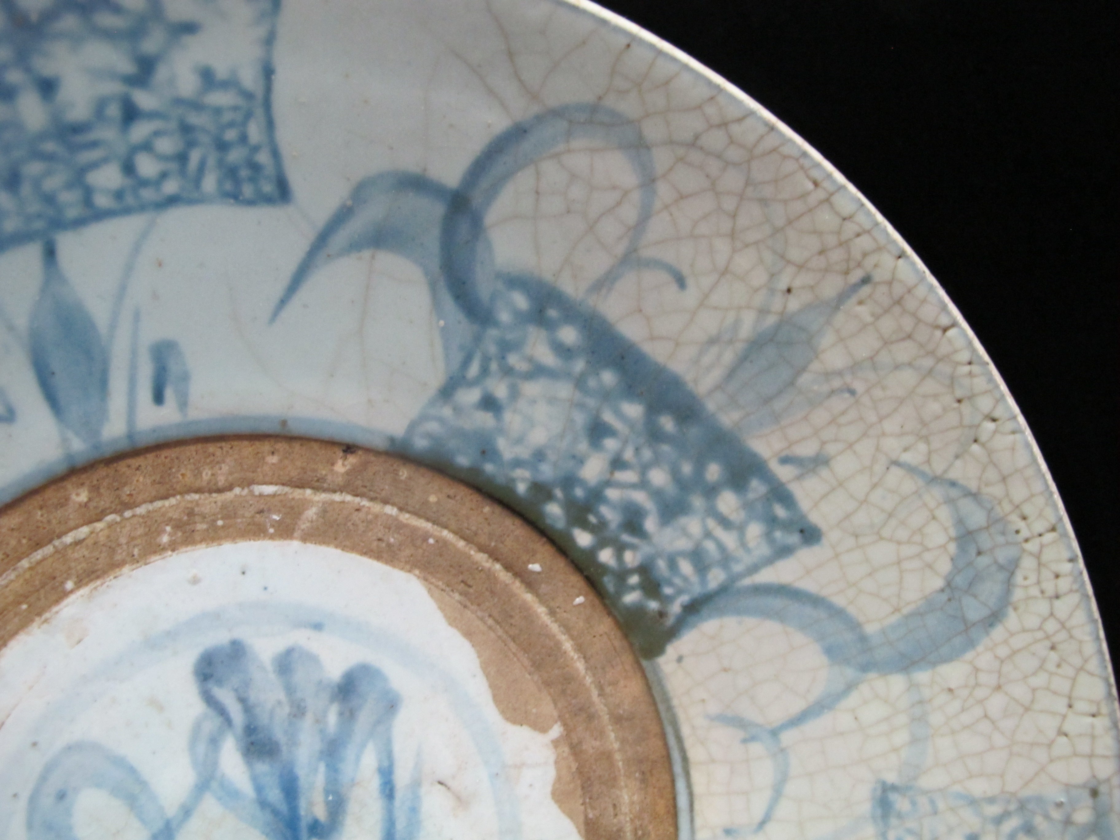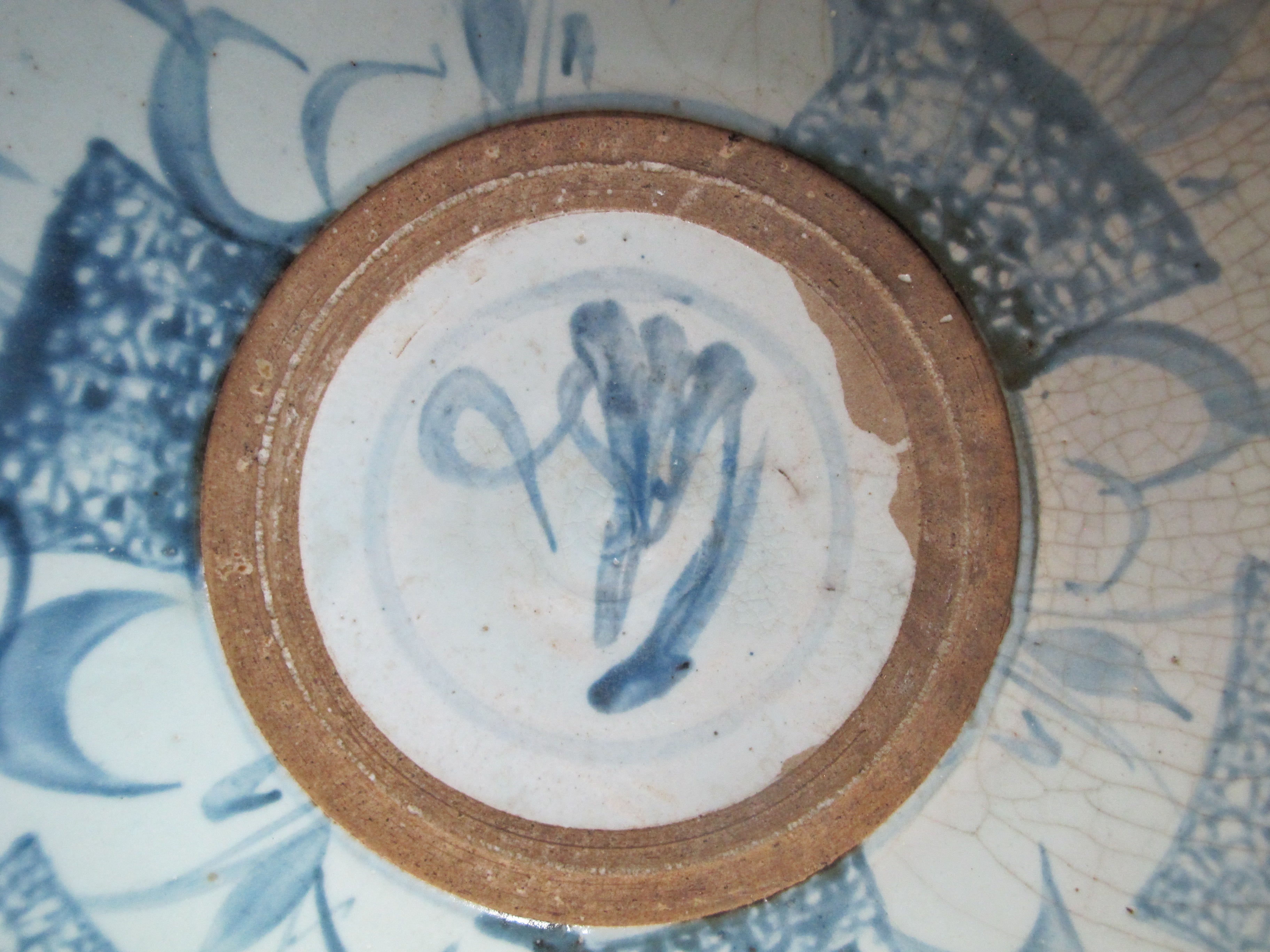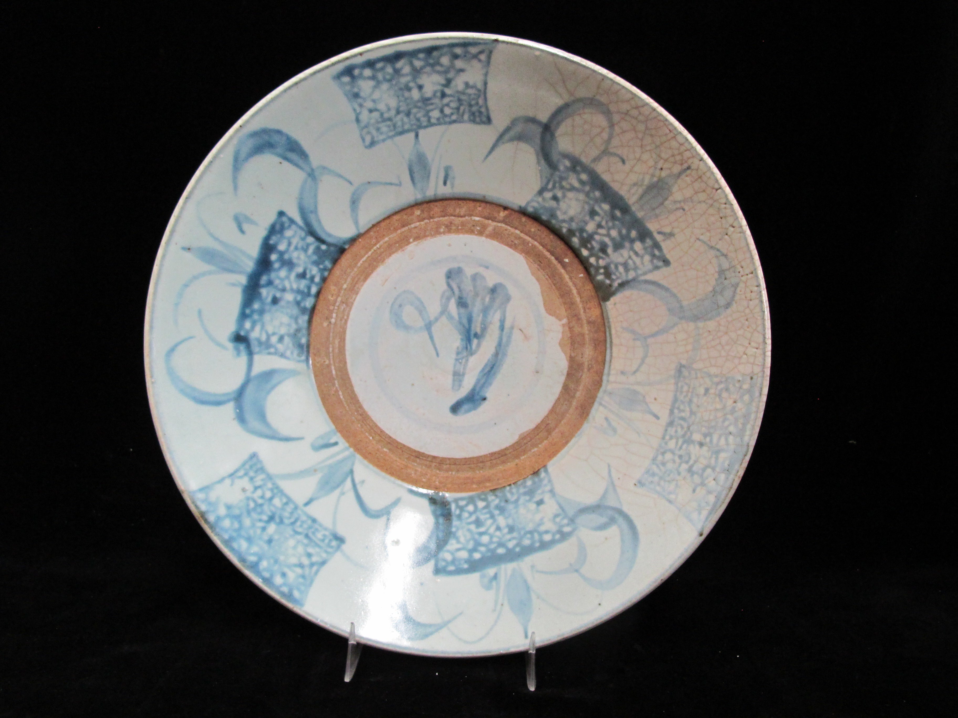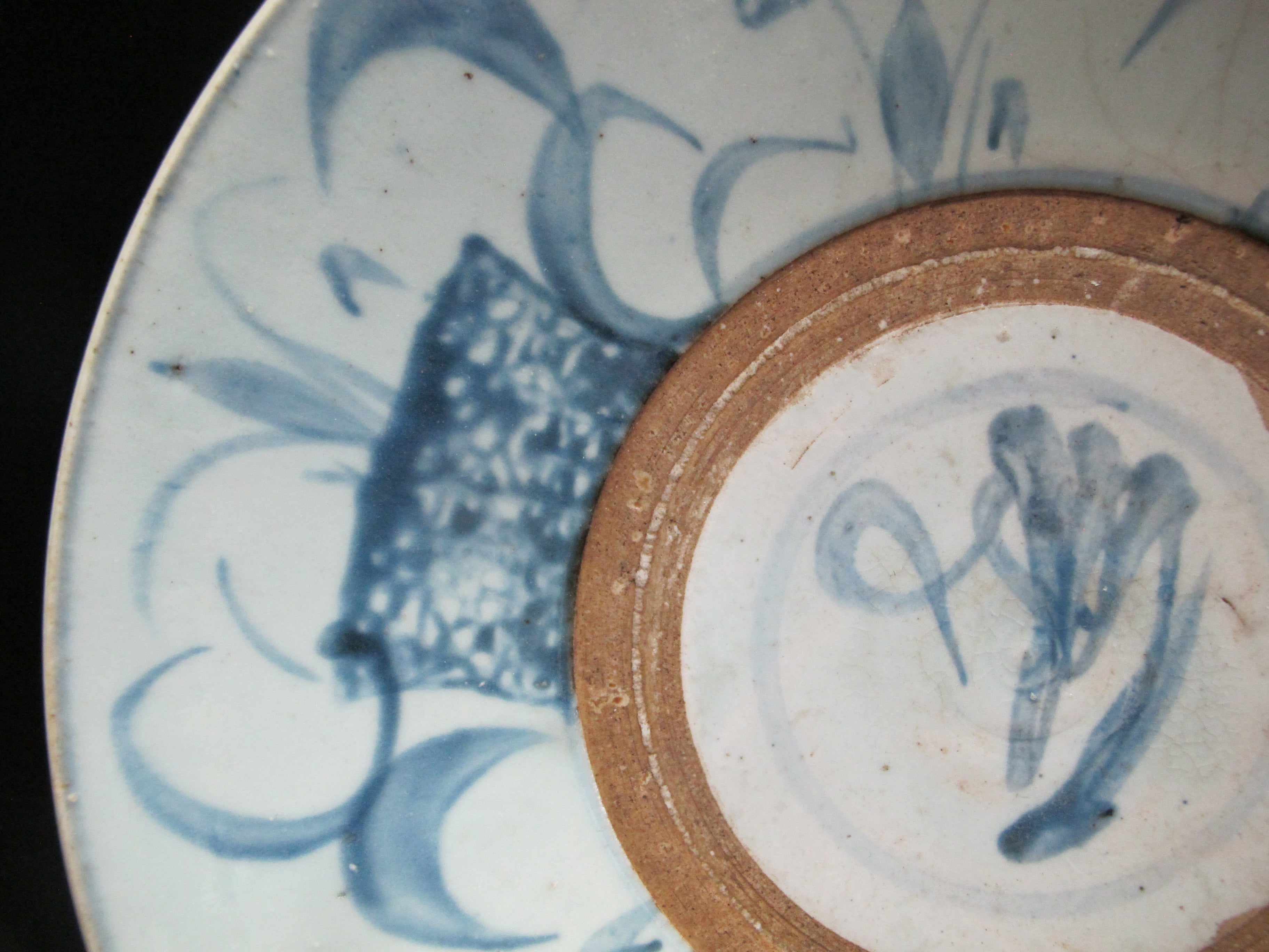 Chinese Swatow ware plate or shallow bowl. Swatow ware, also known as Zhangzhou ware, is a type of Chinese export porcelain primarily produced in the Zhangzhou region of Fujian province. It is characterized by its somewhat coarse and rustic appearance, like this one featuring underglaze blue decoration with natural pottery showing through.