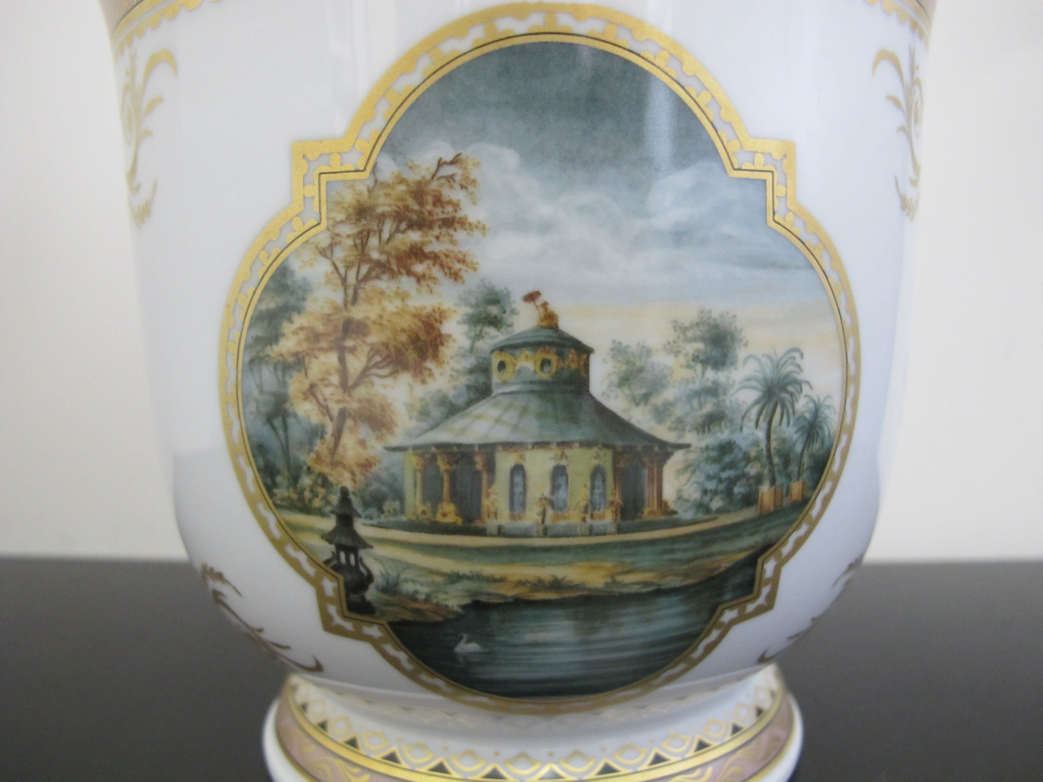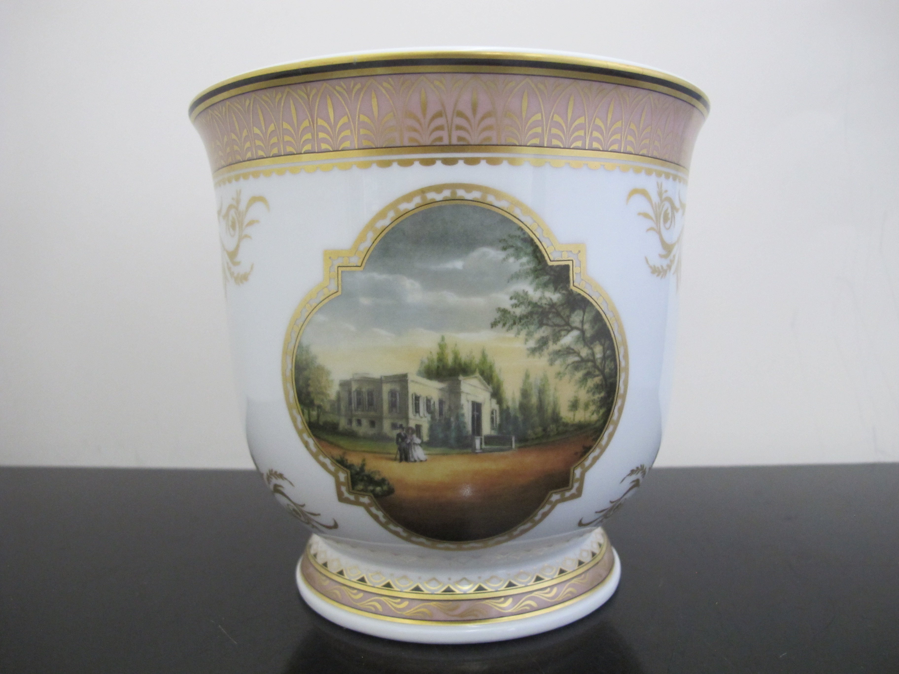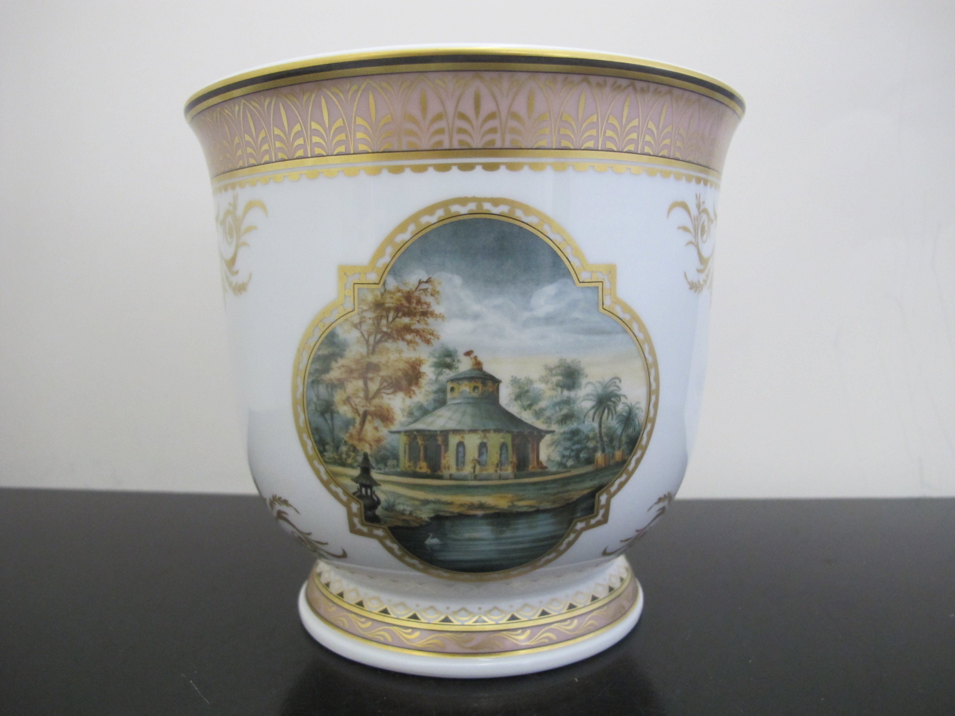 Lovely vintage Kaiser Germany cache pot, Belvedere designed by K Nossek. White porcelain with a different hand painted architectural and landscape scene on each side accented by gilt detail. Measures 5 1/2" tall x 5". Excellent condition, no chips, cracks, or repairs. Mild staining at interior base.