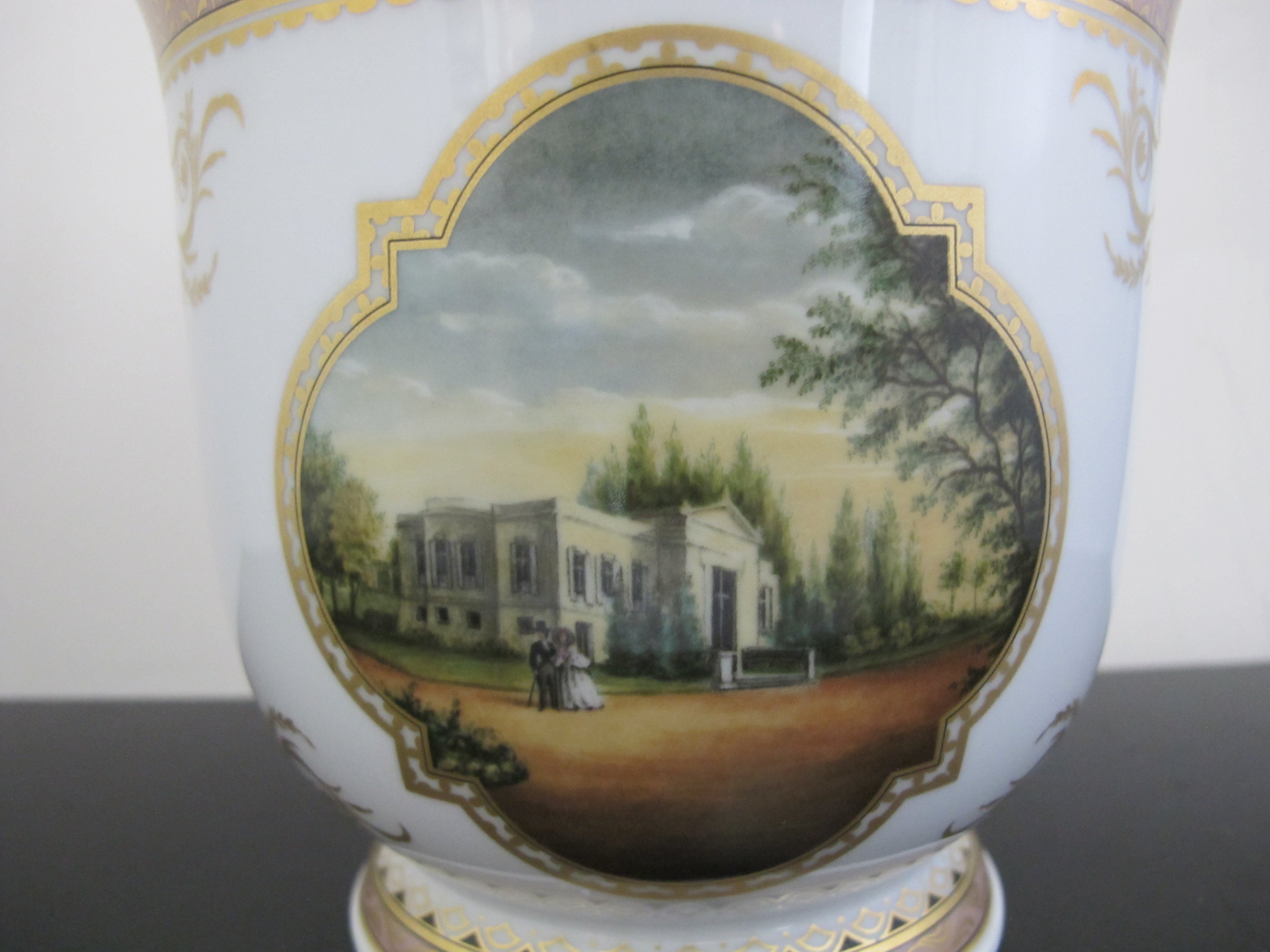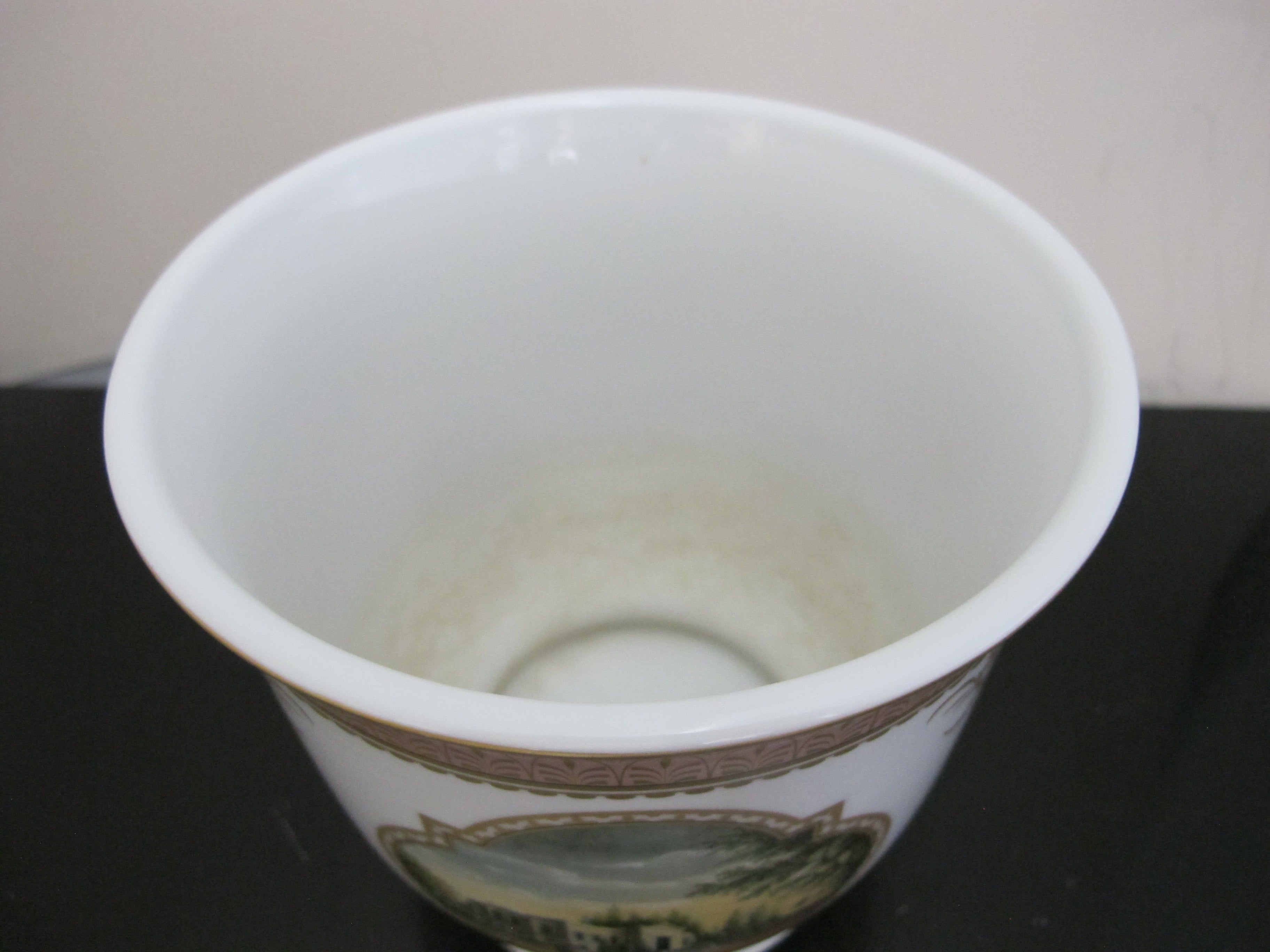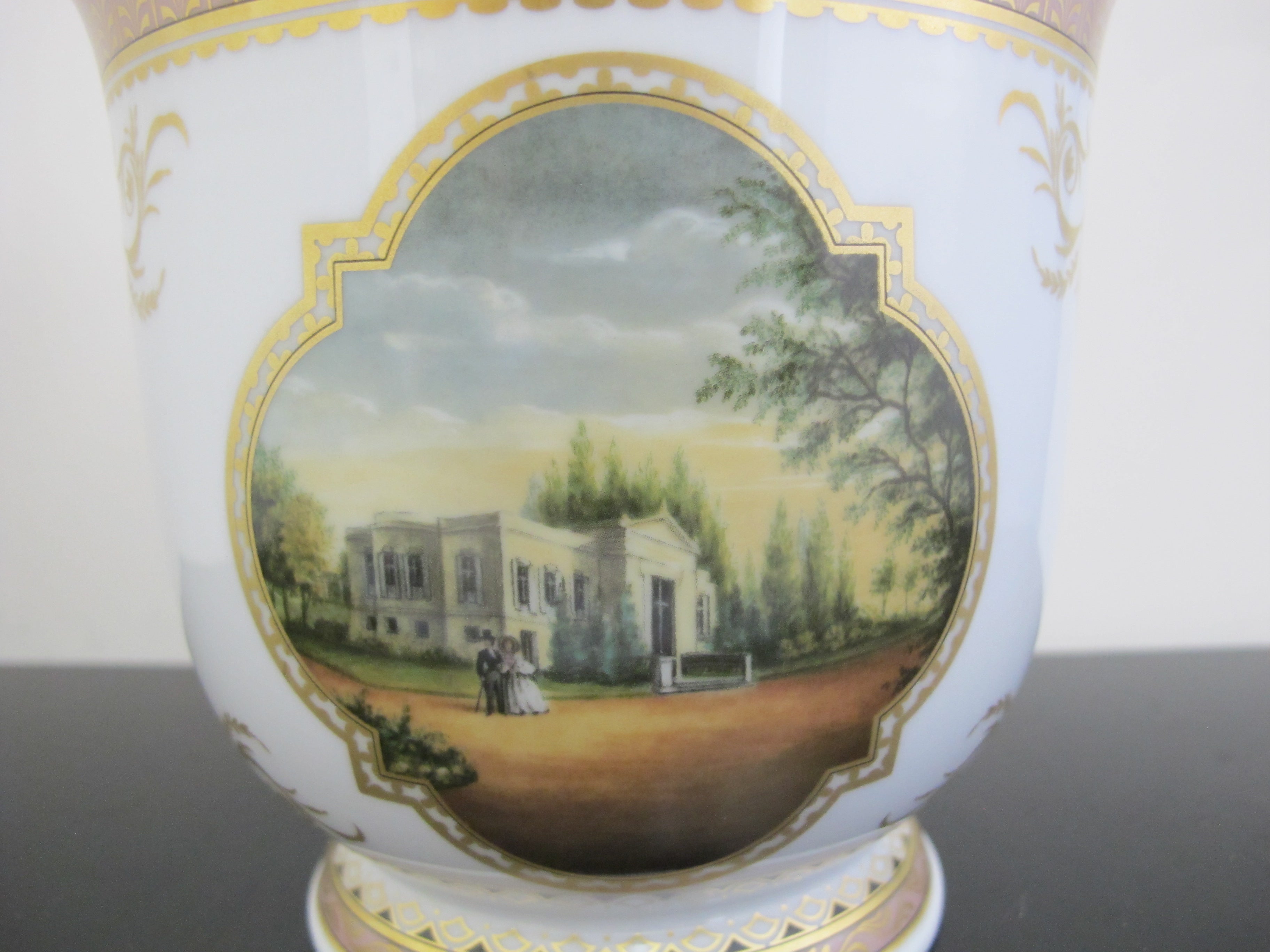 Lovely vintage Kaiser Germany cache pot, Belvedere designed by K Nossek. White porcelain with a different hand painted architectural and landscape scene on each side accented by gilt detail. Measures 5 1/2" tall x 5". Excellent condition, no chips, cracks, or repairs. Mild staining at interior base.