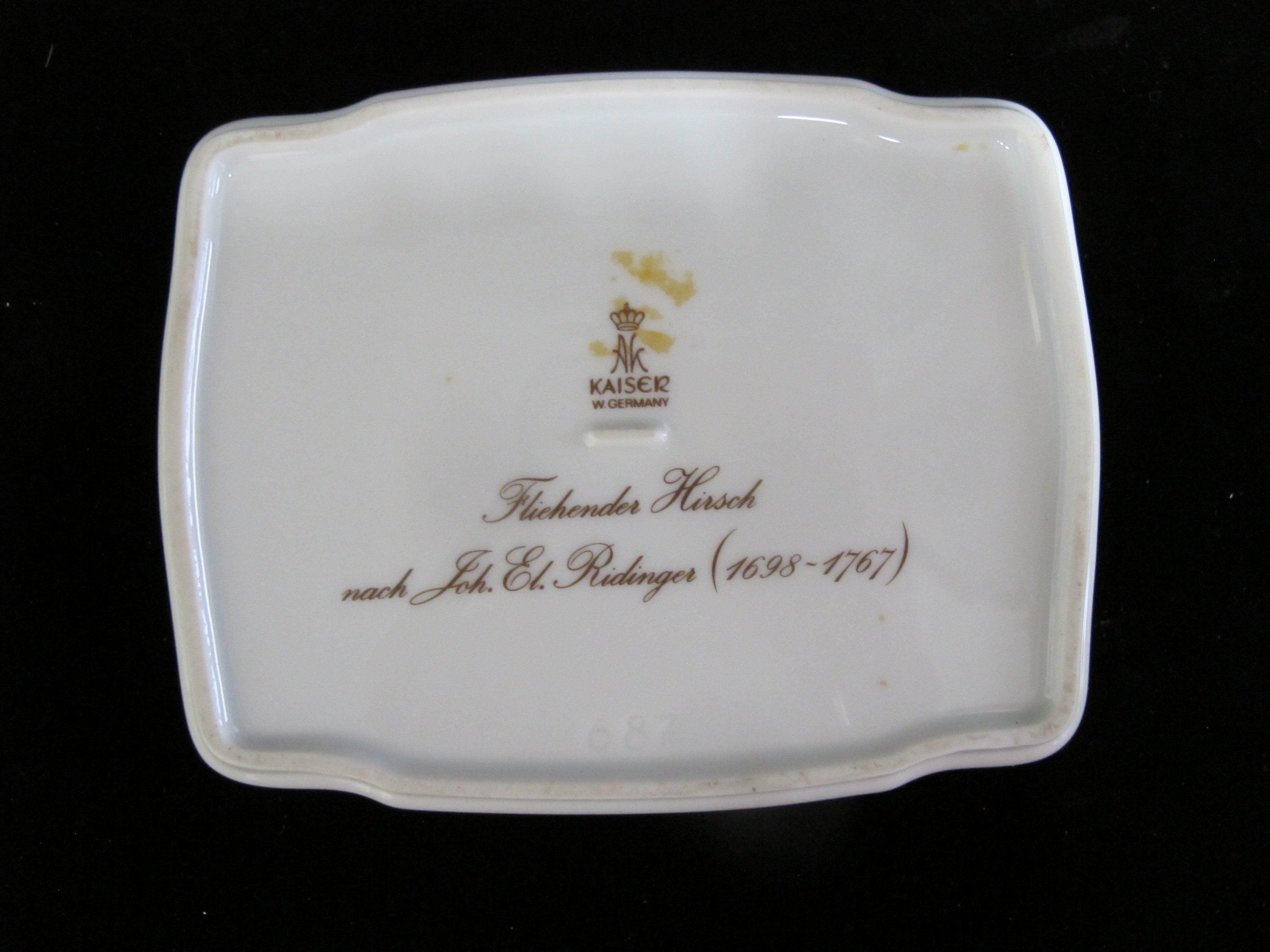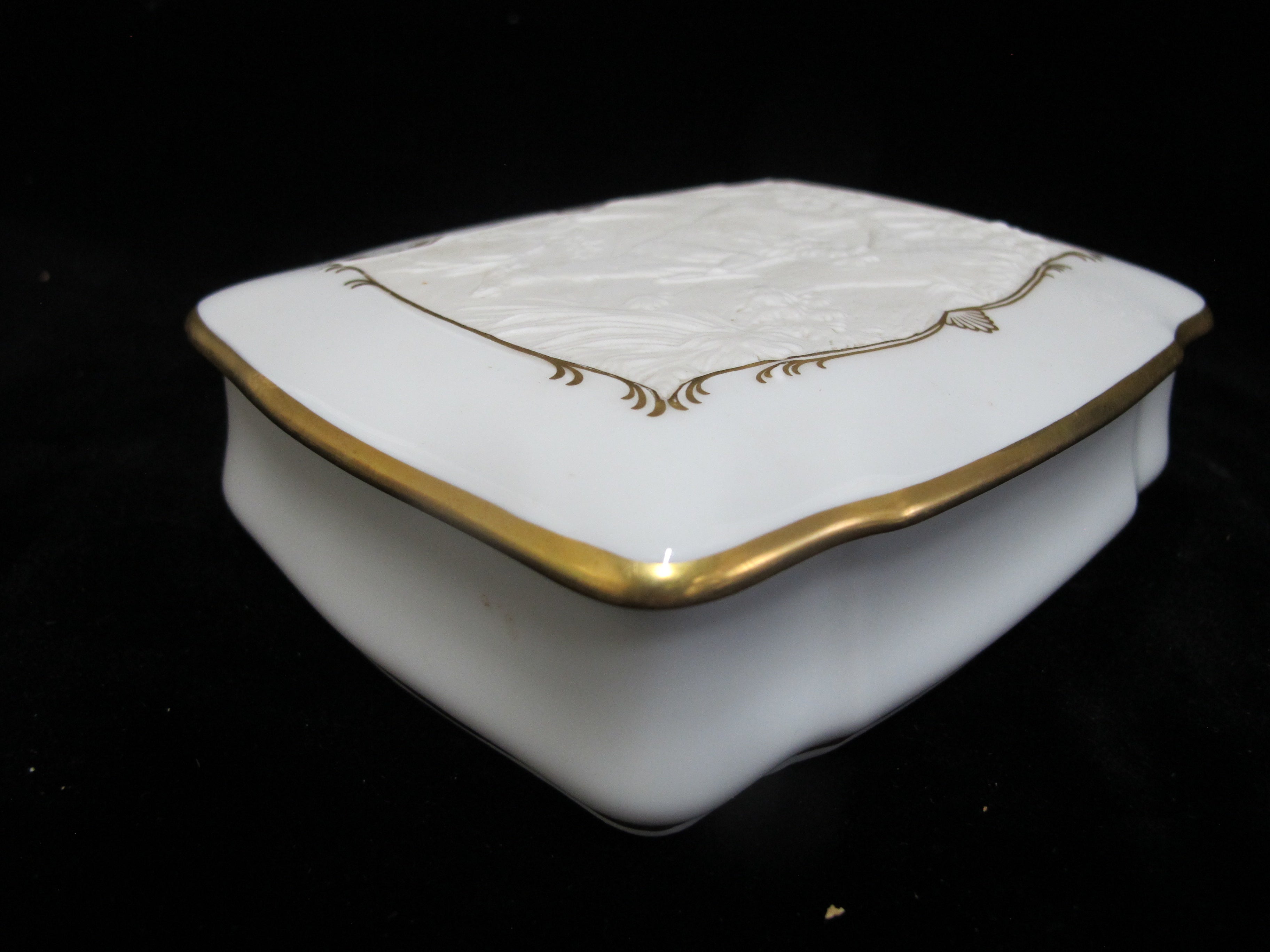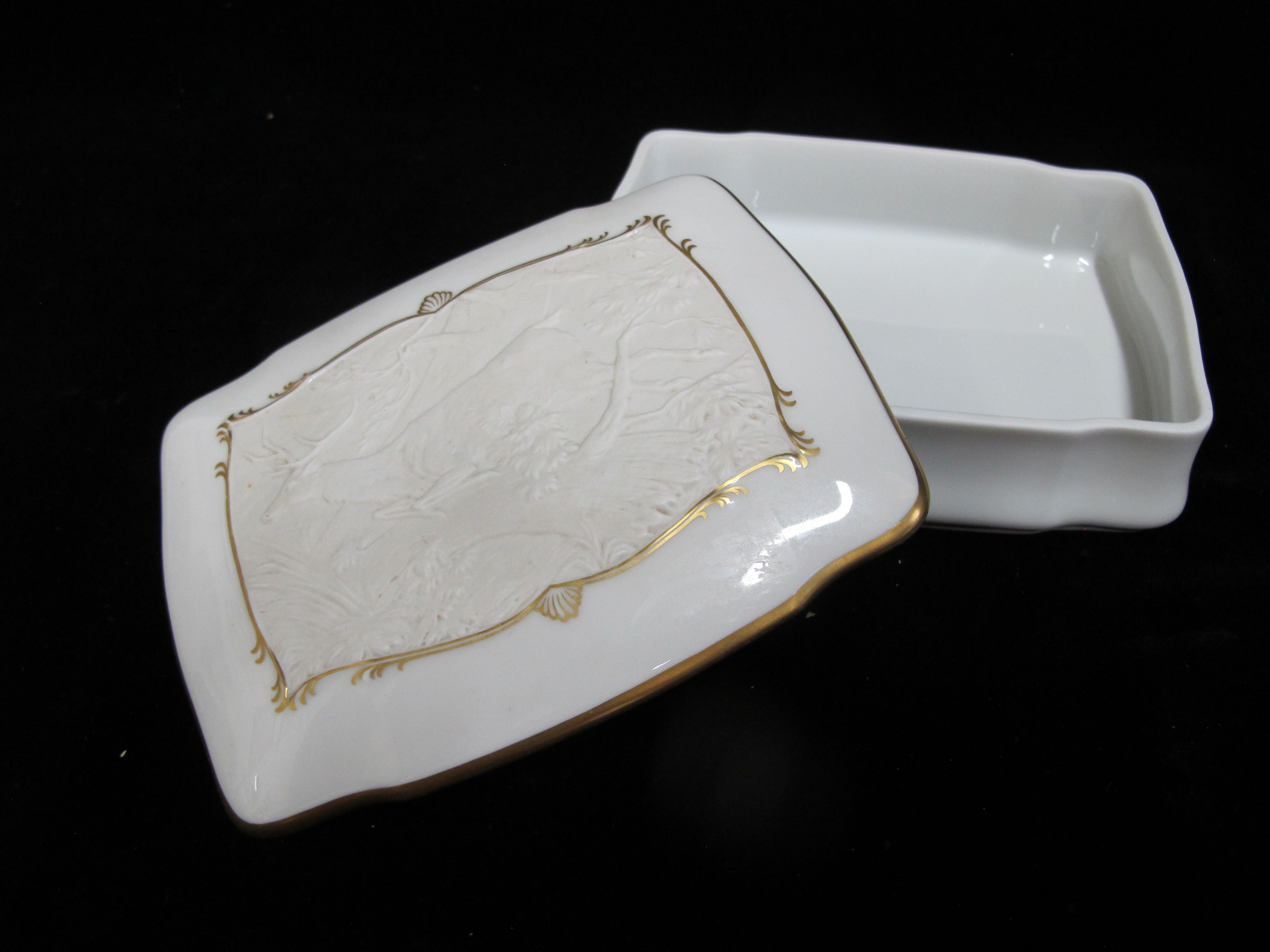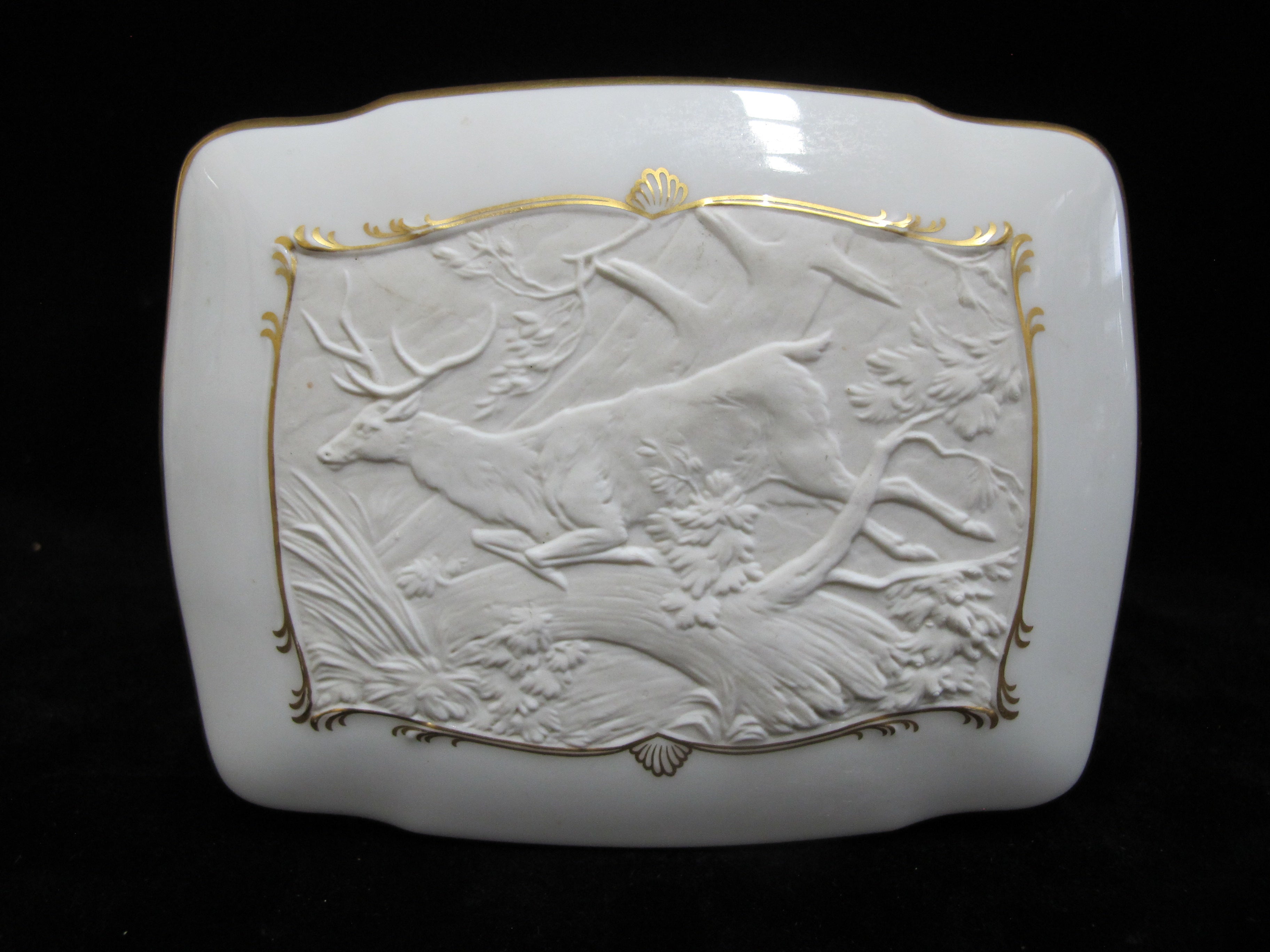 Elegant Kaiser Germany, Fliehender Hirsch and Johan Elias Ridinger trinket box in white bisque porcelain. Bas relief on lid shows a deer running in the woods, outlined in elaborate gilt rim. Measures 5 3/4" x 4 3/4" x 1 1/2" tall. Excellent condition, no chips, cracks, or repairs. Hallmarks at base.