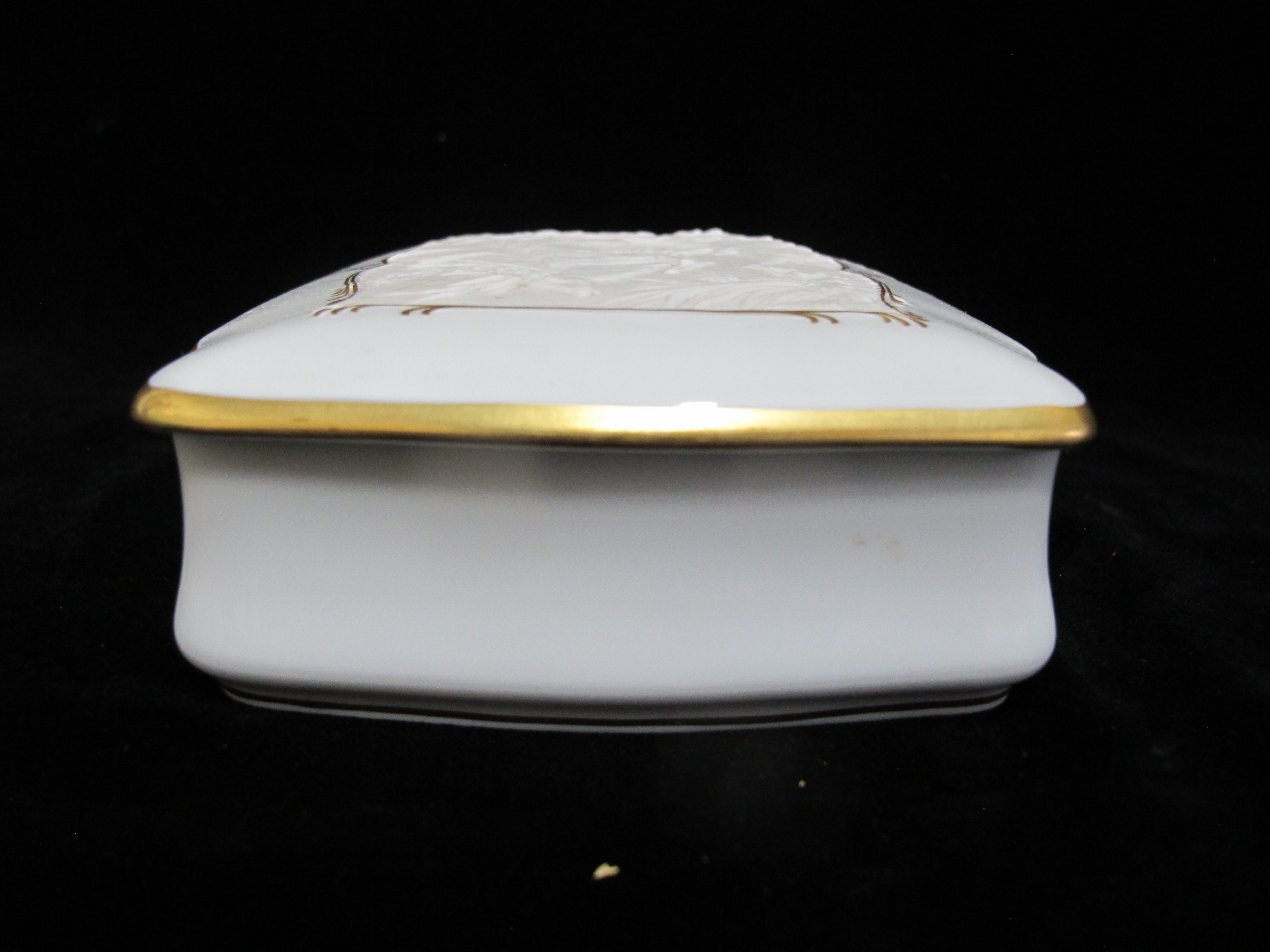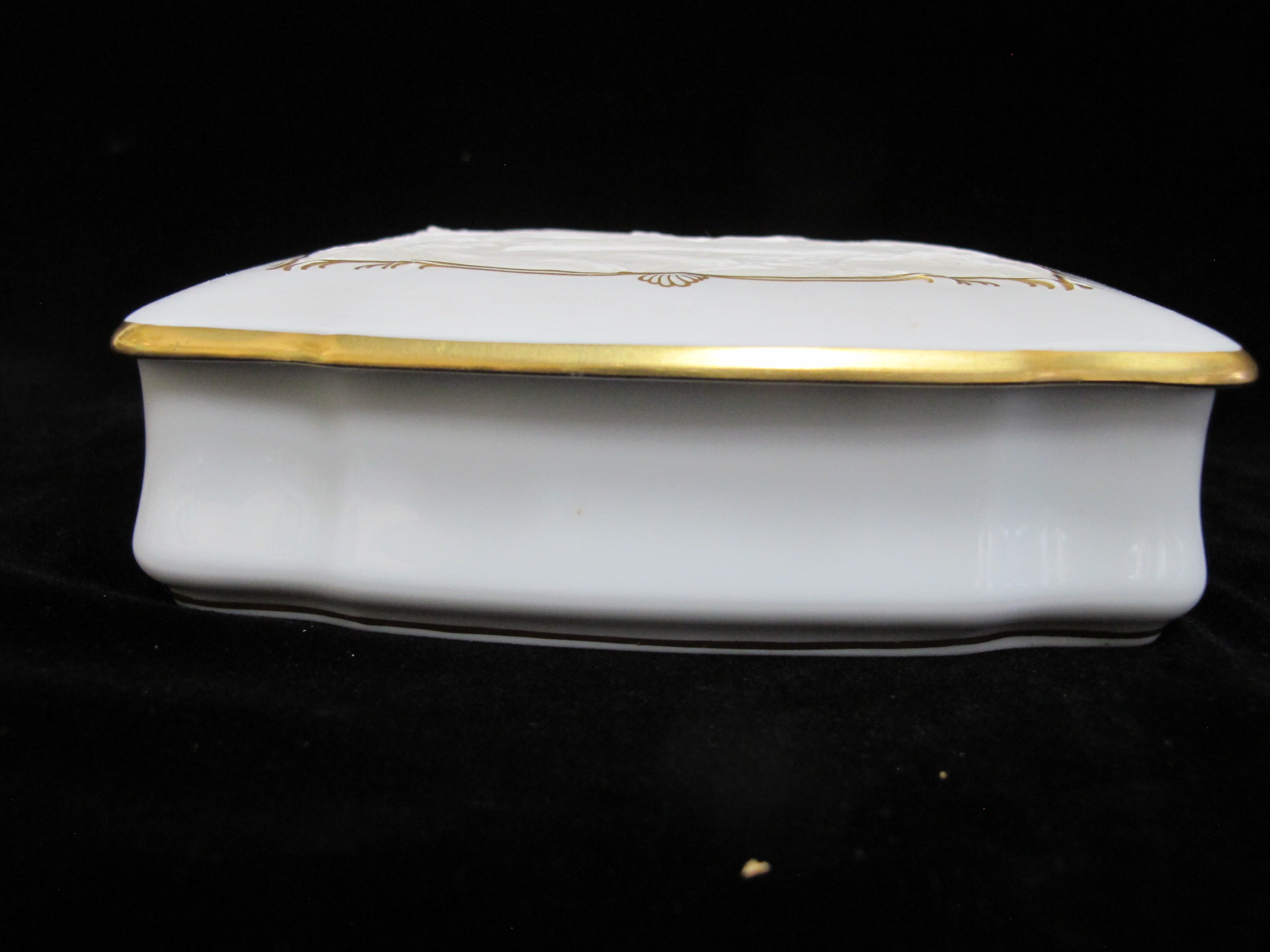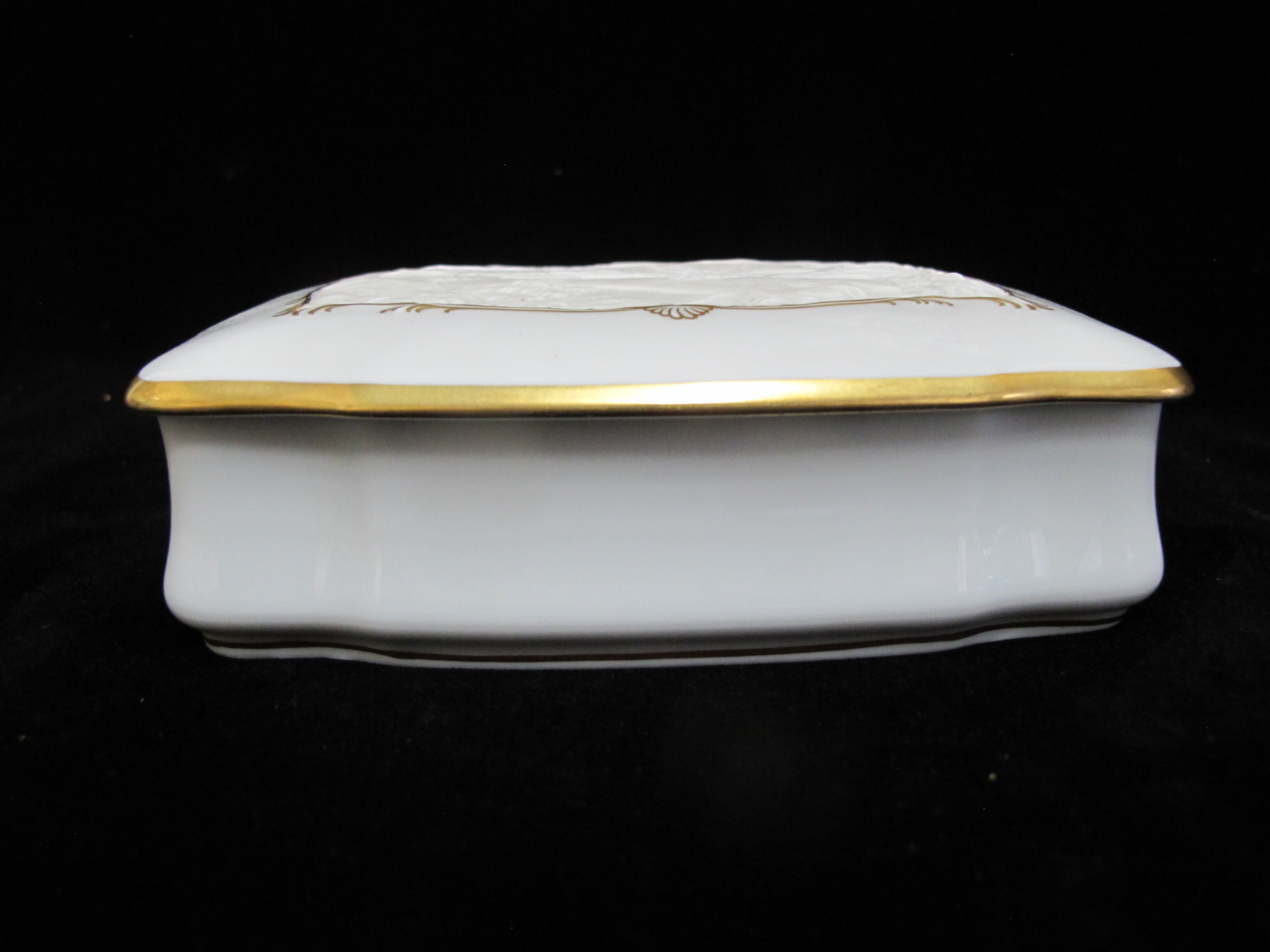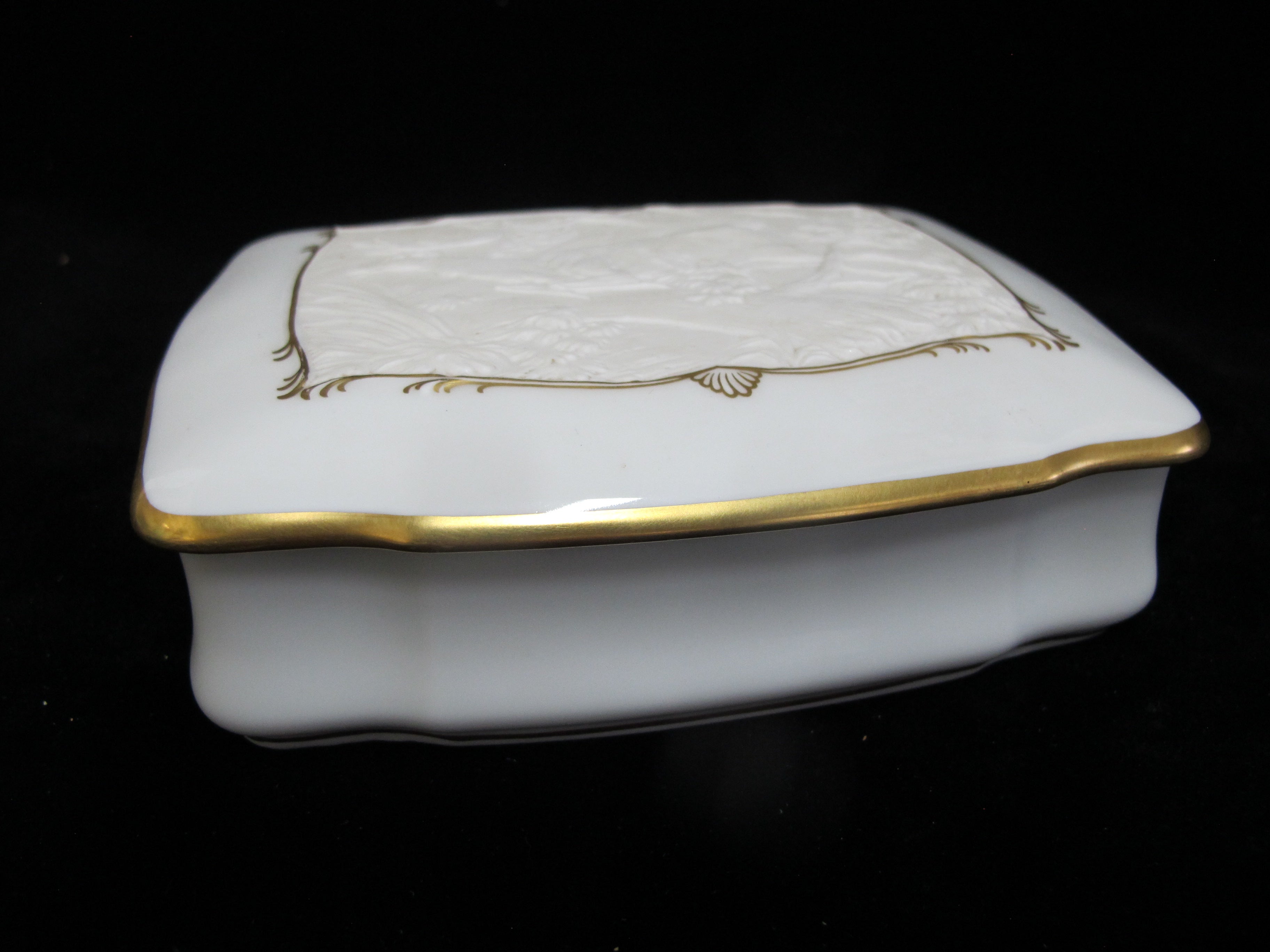 Elegant Kaiser Germany, Fliehender Hirsch and Johan Elias Ridinger trinket box in white bisque porcelain. Bas relief on lid shows a deer running in the woods, outlined in elaborate gilt rim. Measures 5 3/4" x 4 3/4" x 1 1/2" tall. Excellent condition, no chips, cracks, or repairs. Hallmarks at base.